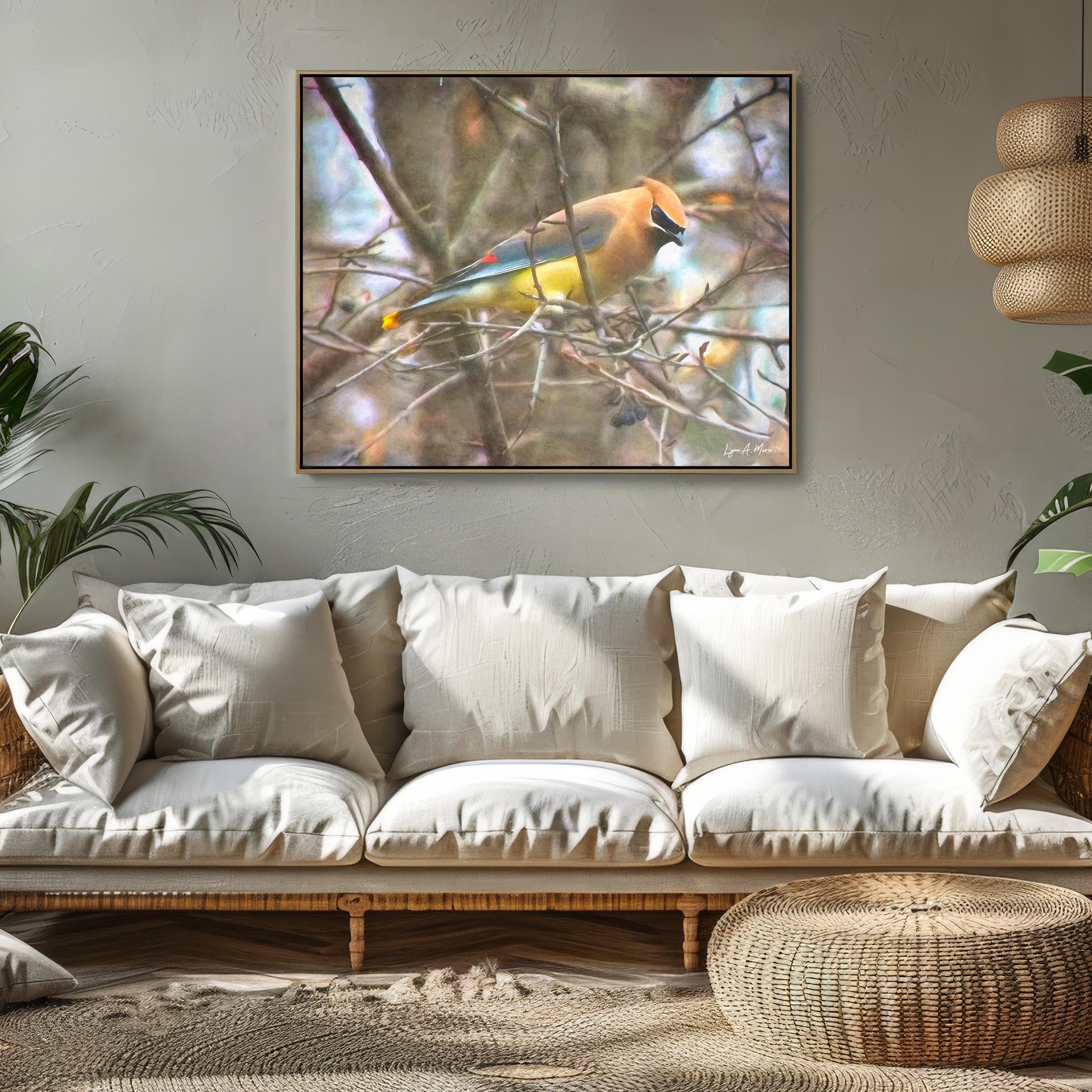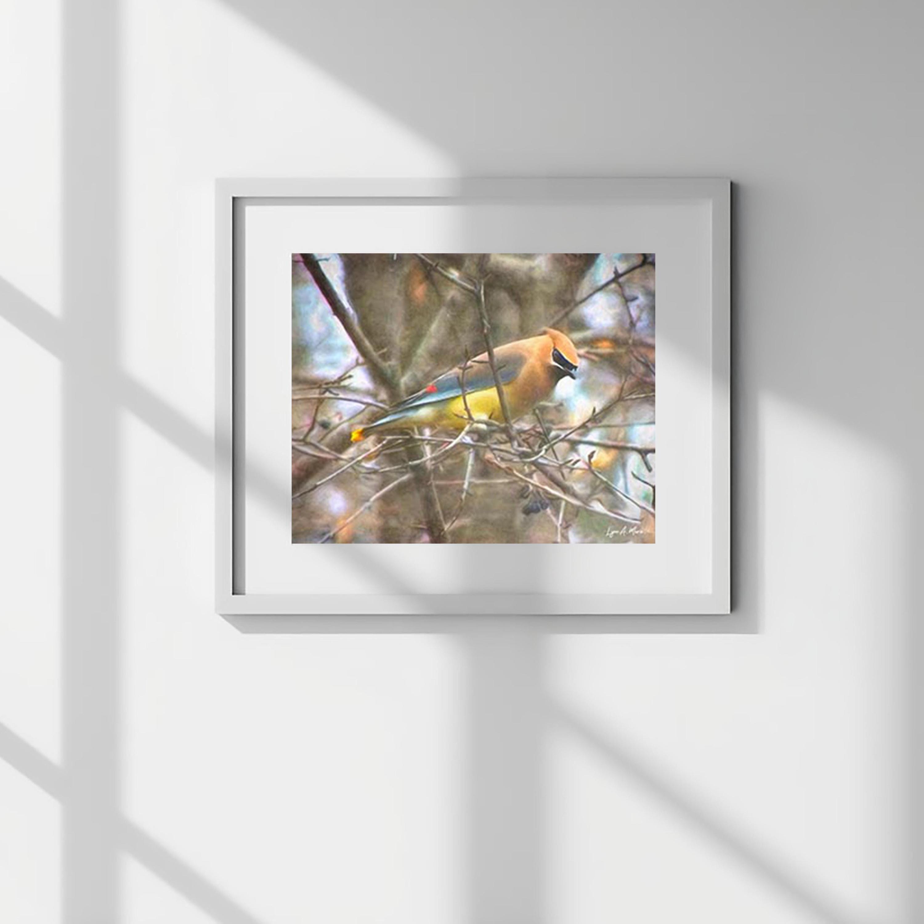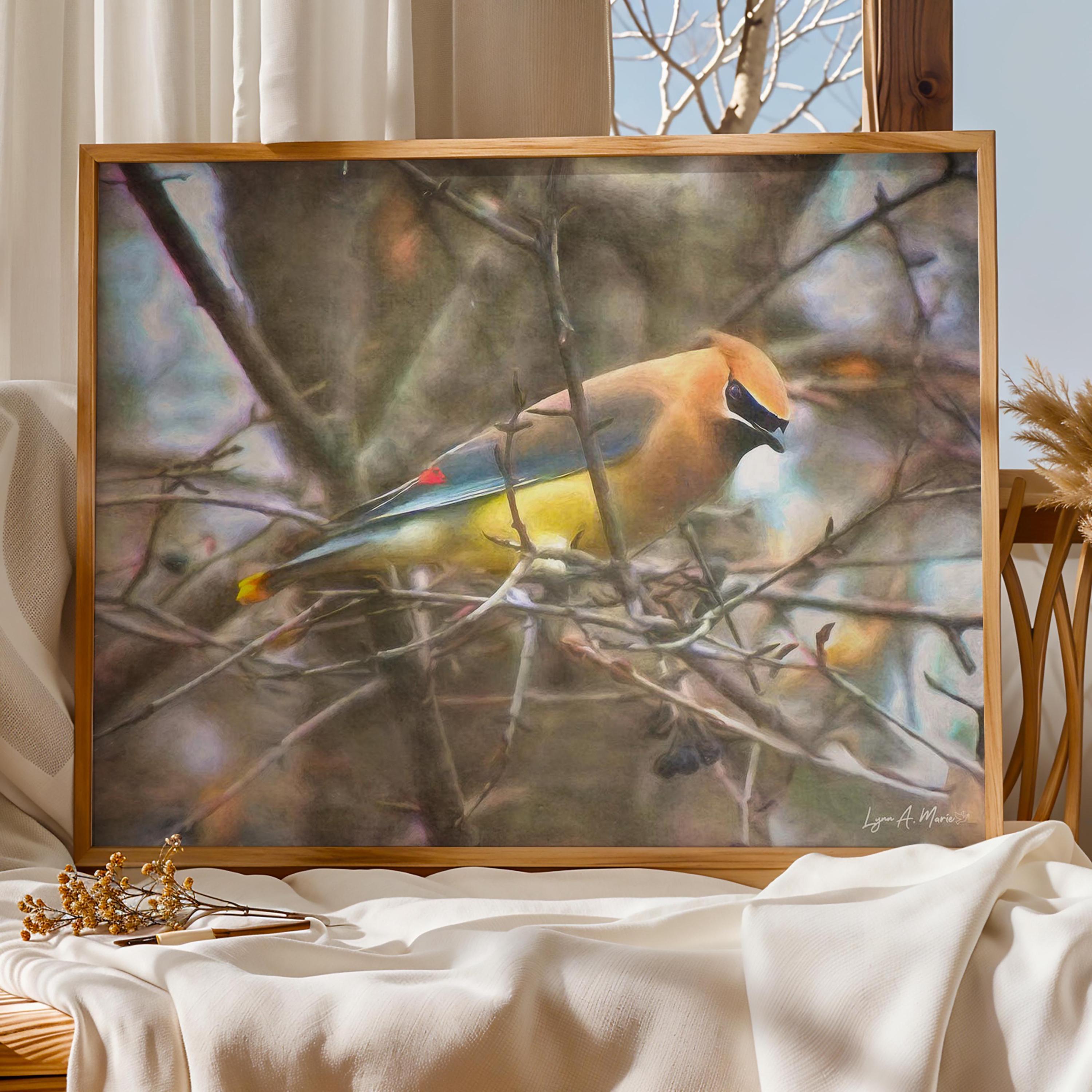 I created this cedar waxwing artwork to celebrate the quiet beauty of nature and wildlife that bird lovers and birdwatchers look for in the trees. Its soft woodland tones and boho feel make it a unique fine art gift idea, especially for anyone who loves the delicate charm of cedar waxwings. This wall decor will brighten and room including a office, bedroom or living room.