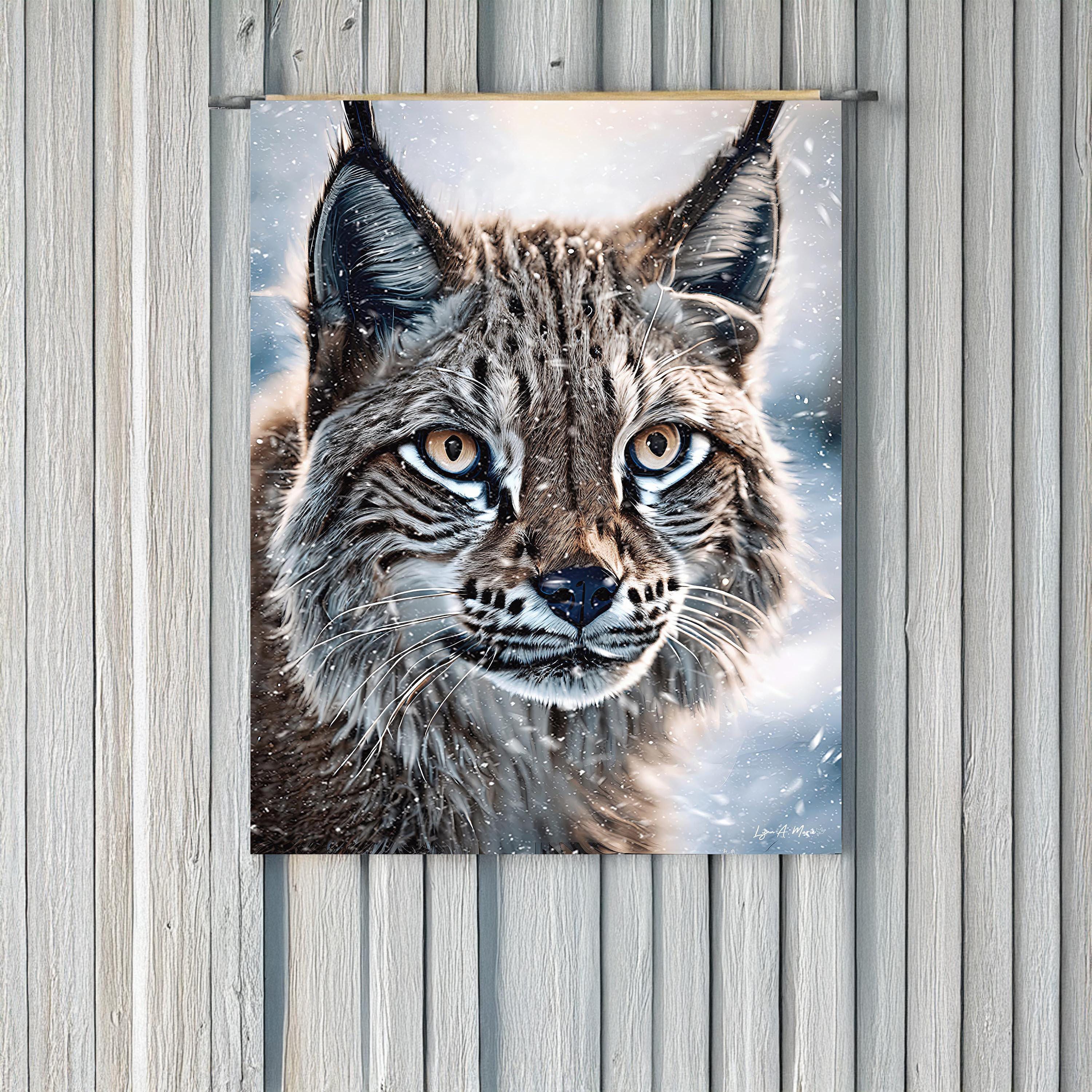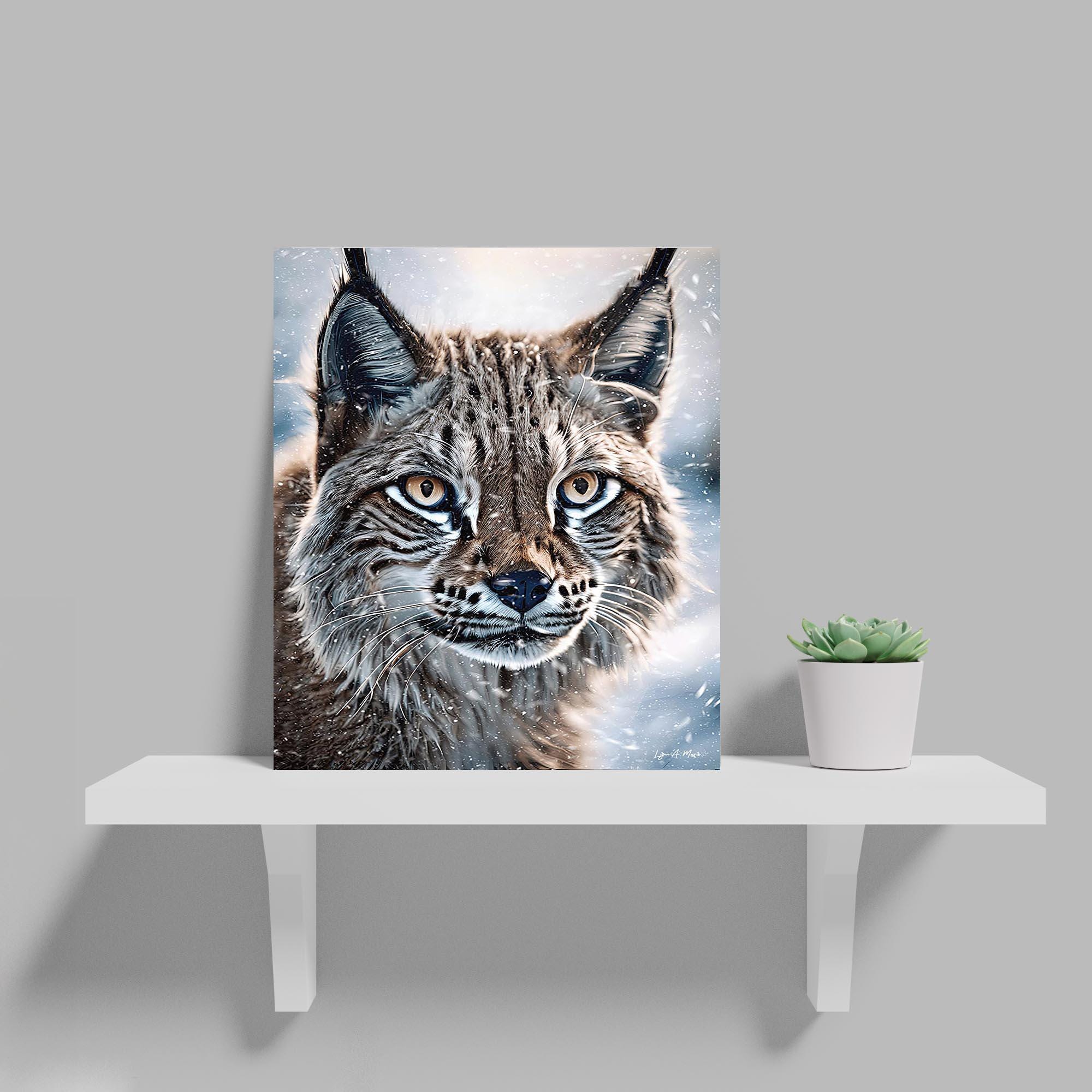 I created this piece to share the calm, wild beauty of a lynx in a snowy winter inspired scene, those big cat eyes, the snow, that quiet strength. I wanted to create art that feels like your looking out a cabin window into true bobcat nature wilderness. It works for any lynx animal lover gift, and a natural fit for cabin wildlife art, modern rustic decor, or any space that loves winter wildlife and a cozy snow cabin aesthetic.