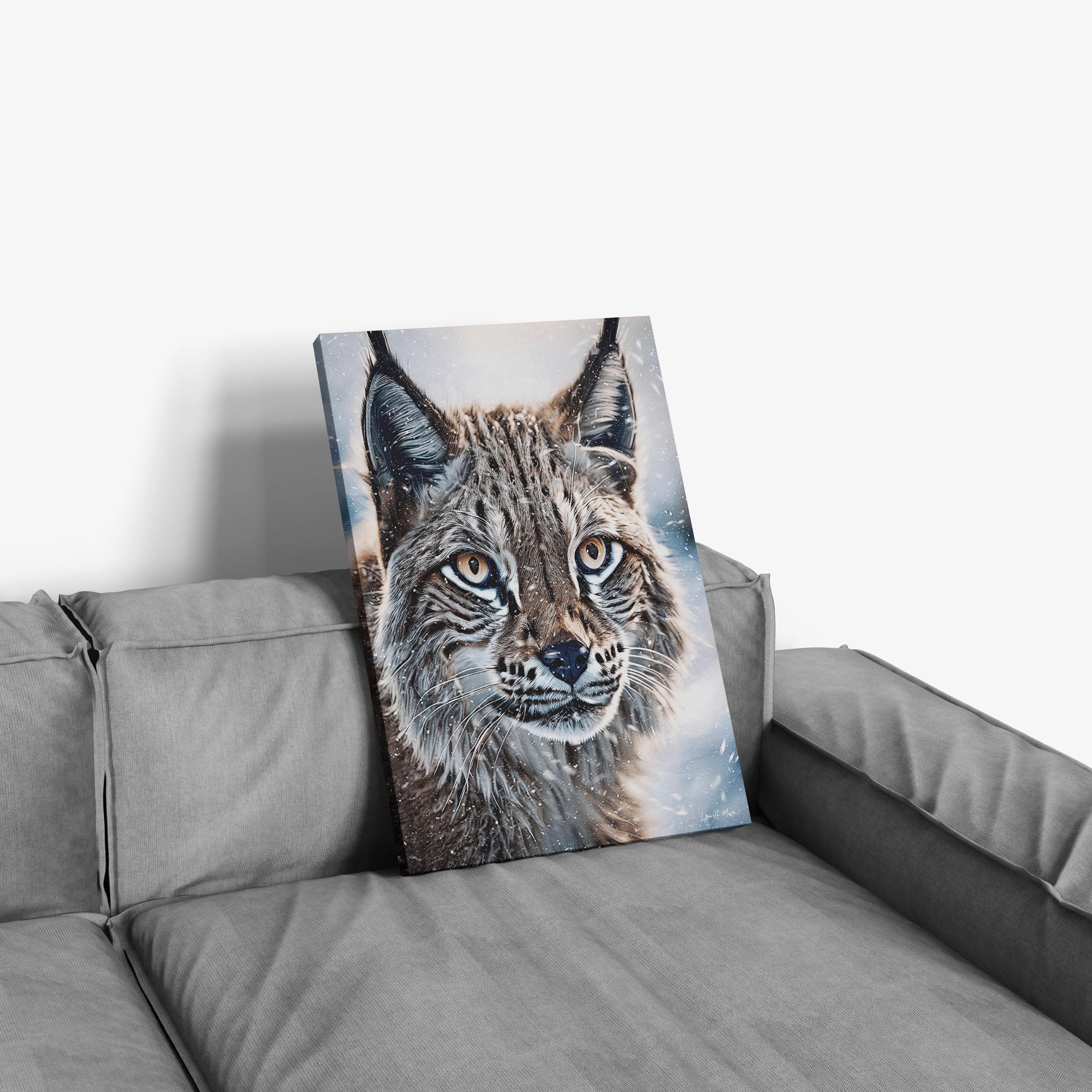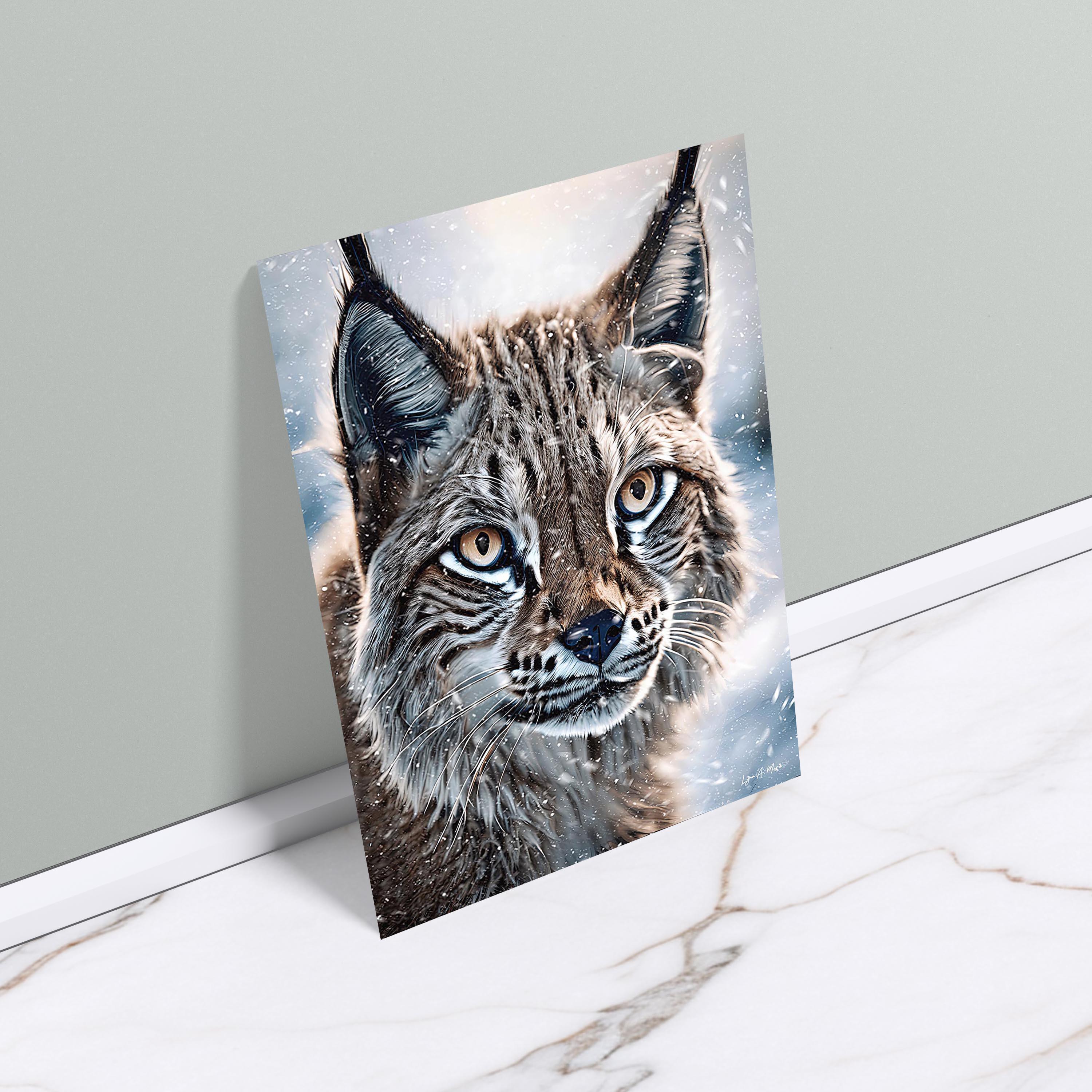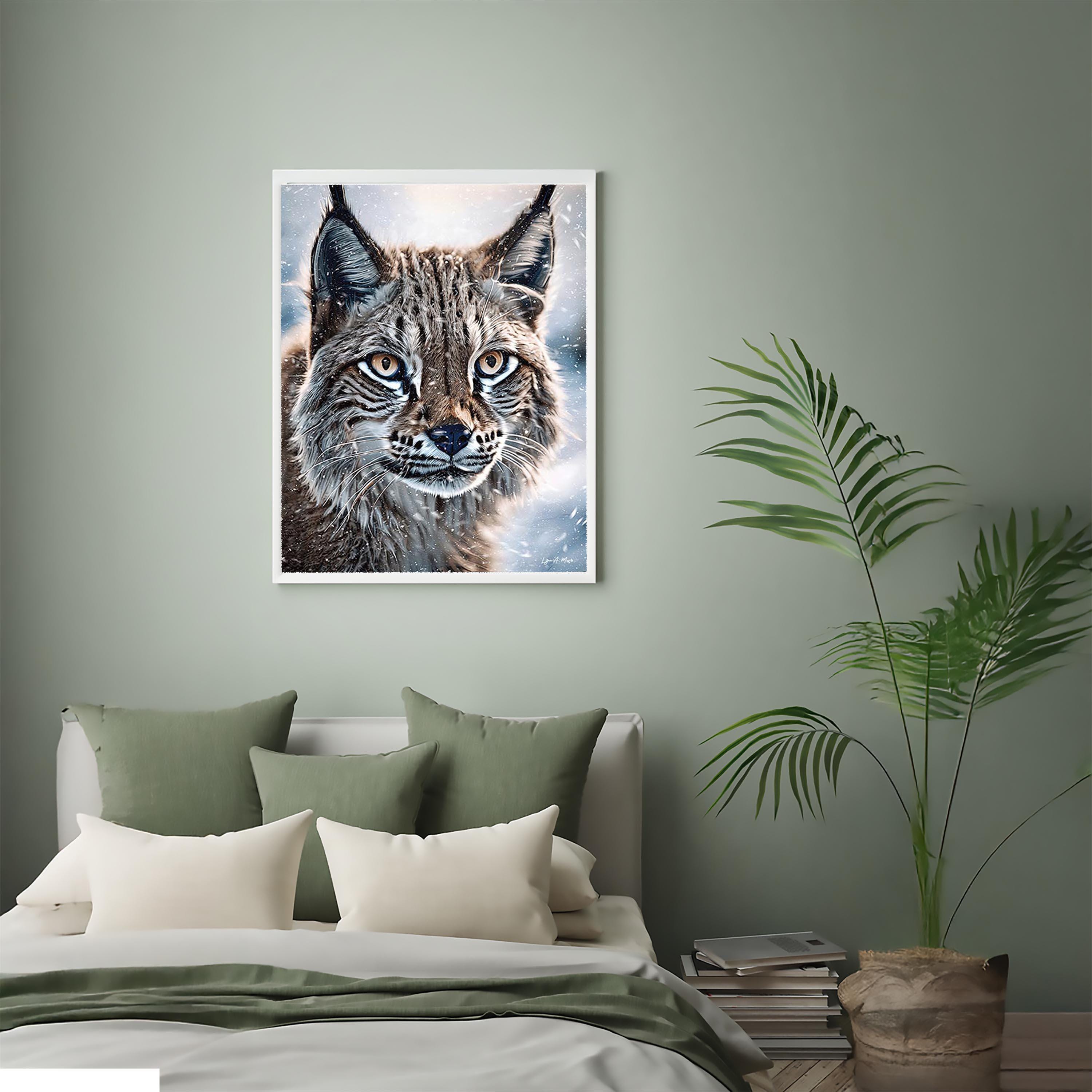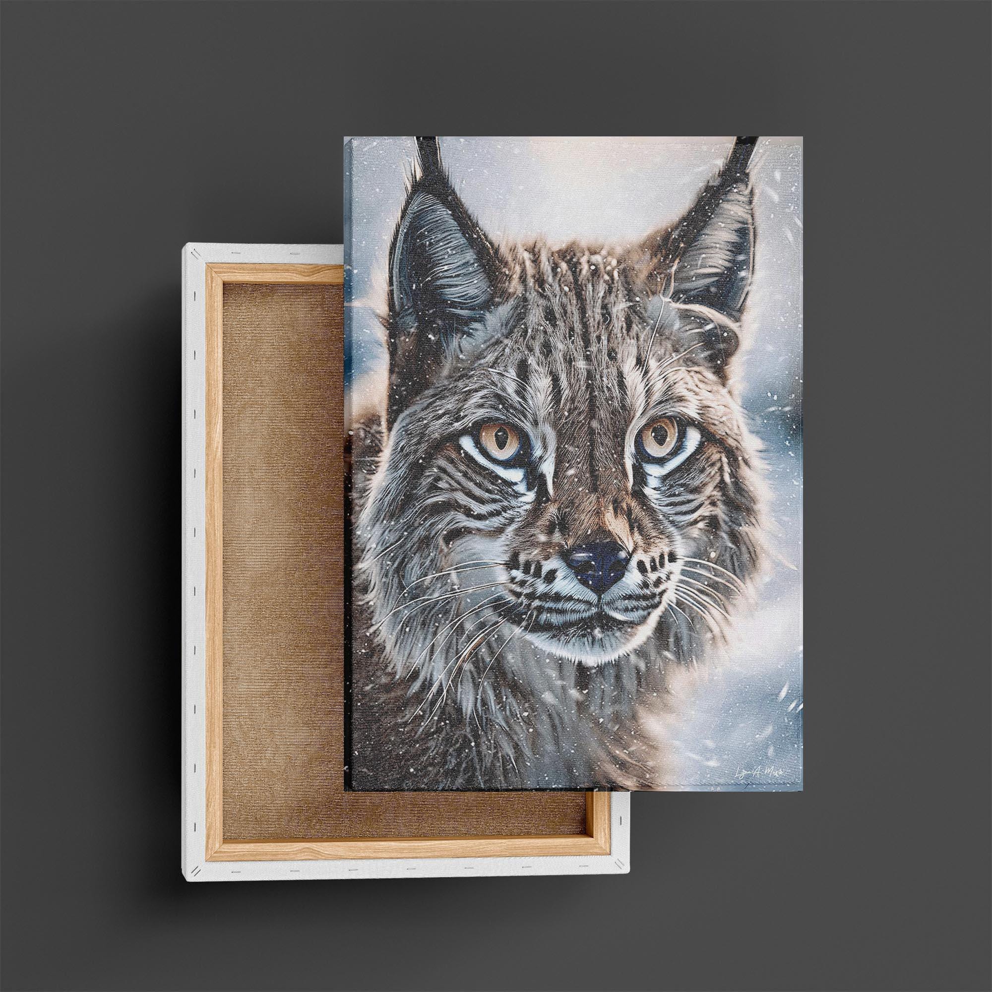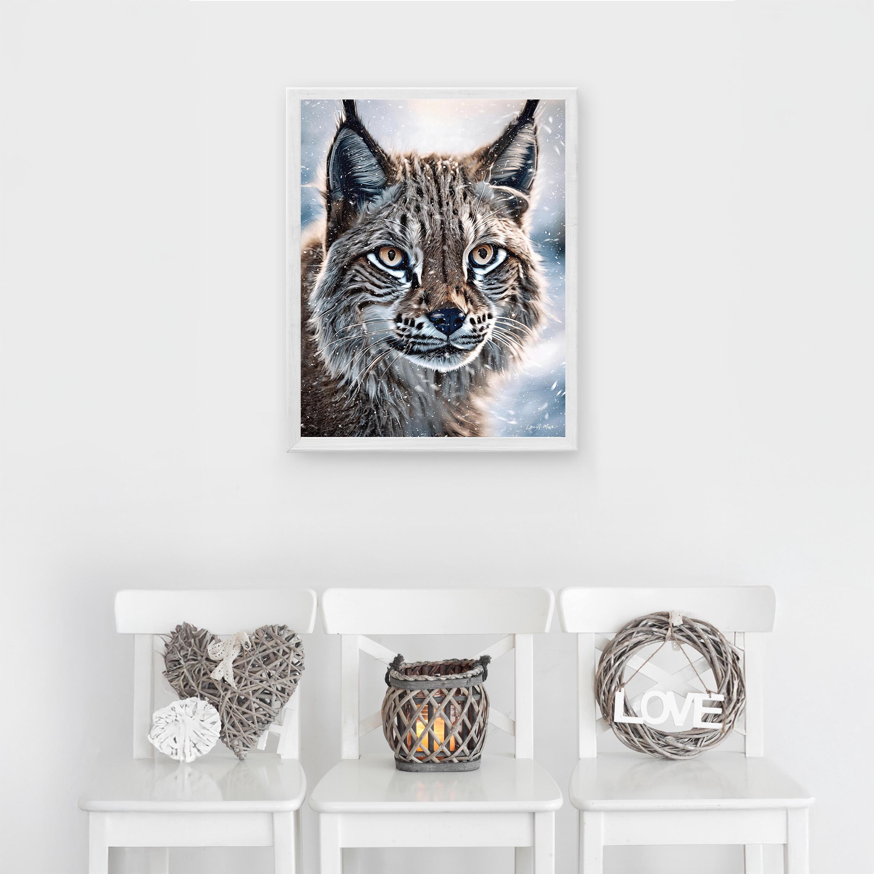 I created this piece to share the calm, wild beauty of a lynx in a snowy winter inspired scene, those big cat eyes, the snow, that quiet strength. I wanted to create art that feels like your looking out a cabin window into true bobcat nature wilderness. It works for any lynx animal lover gift, and a natural fit for cabin wildlife art, modern rustic wall decor, or any space that loves winter wildlife and a cozy snow cabin aesthetic.