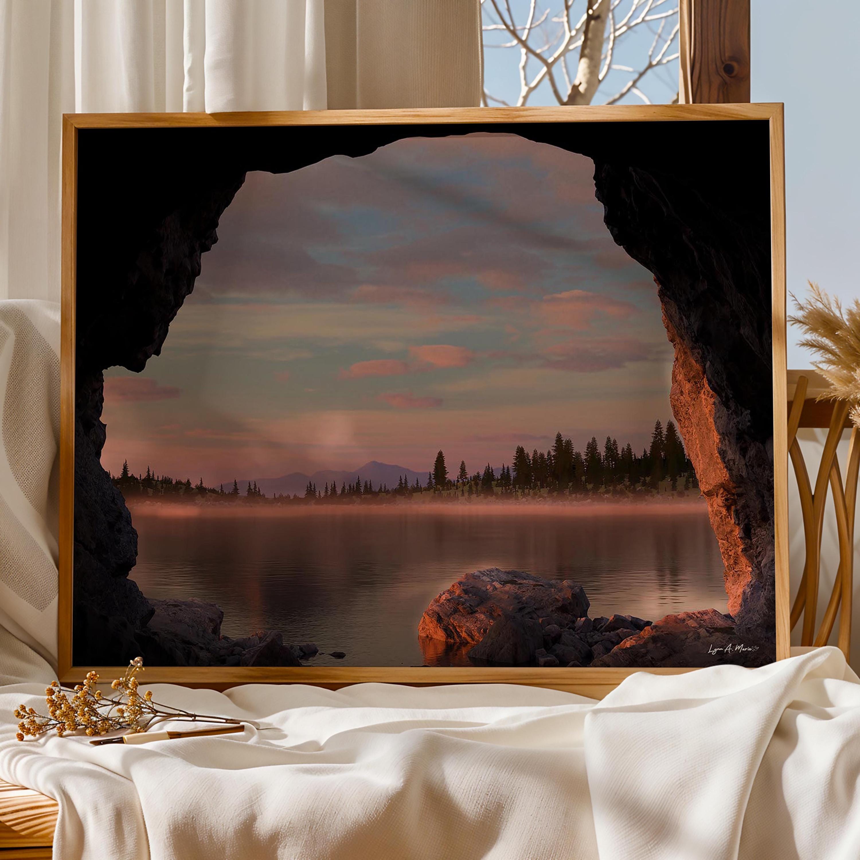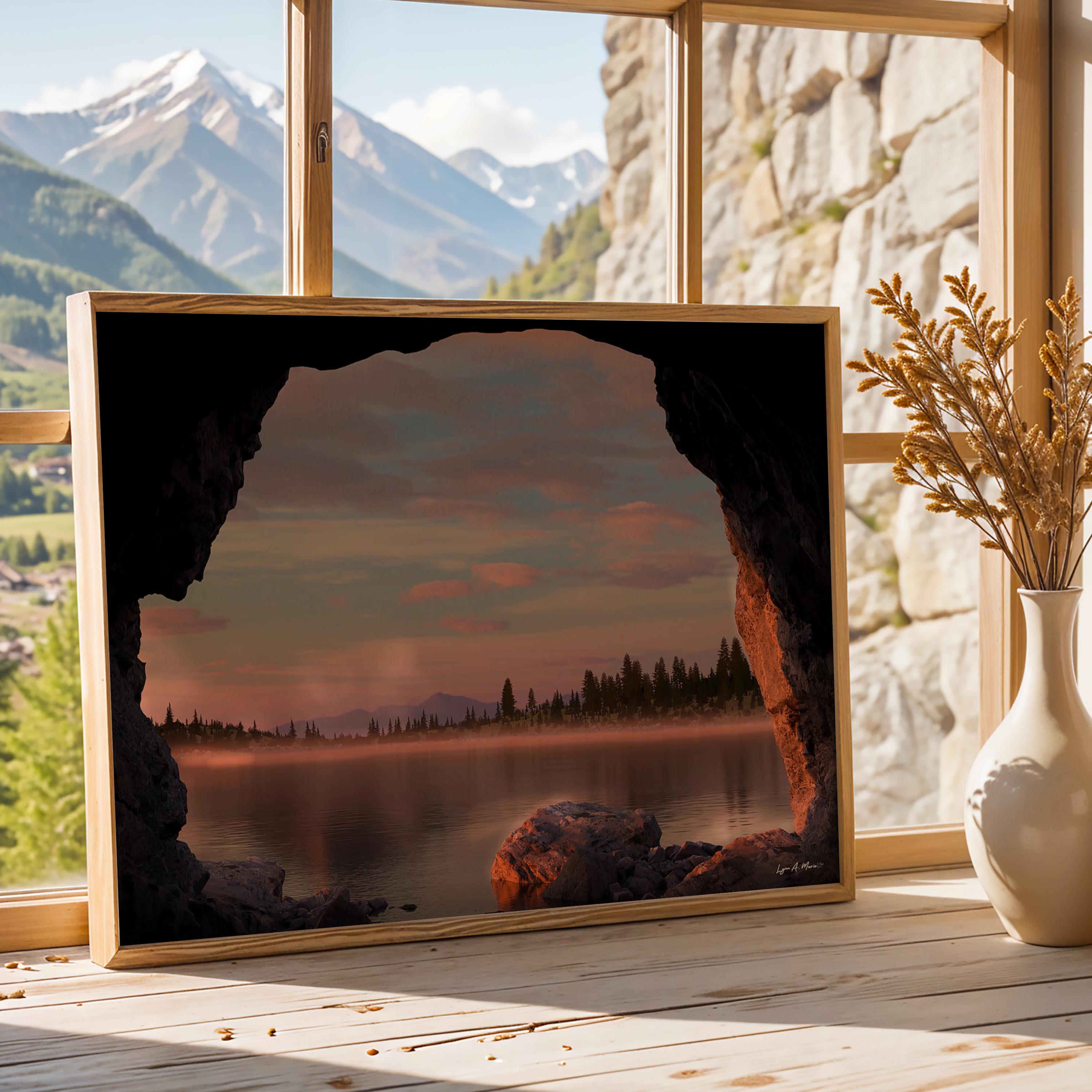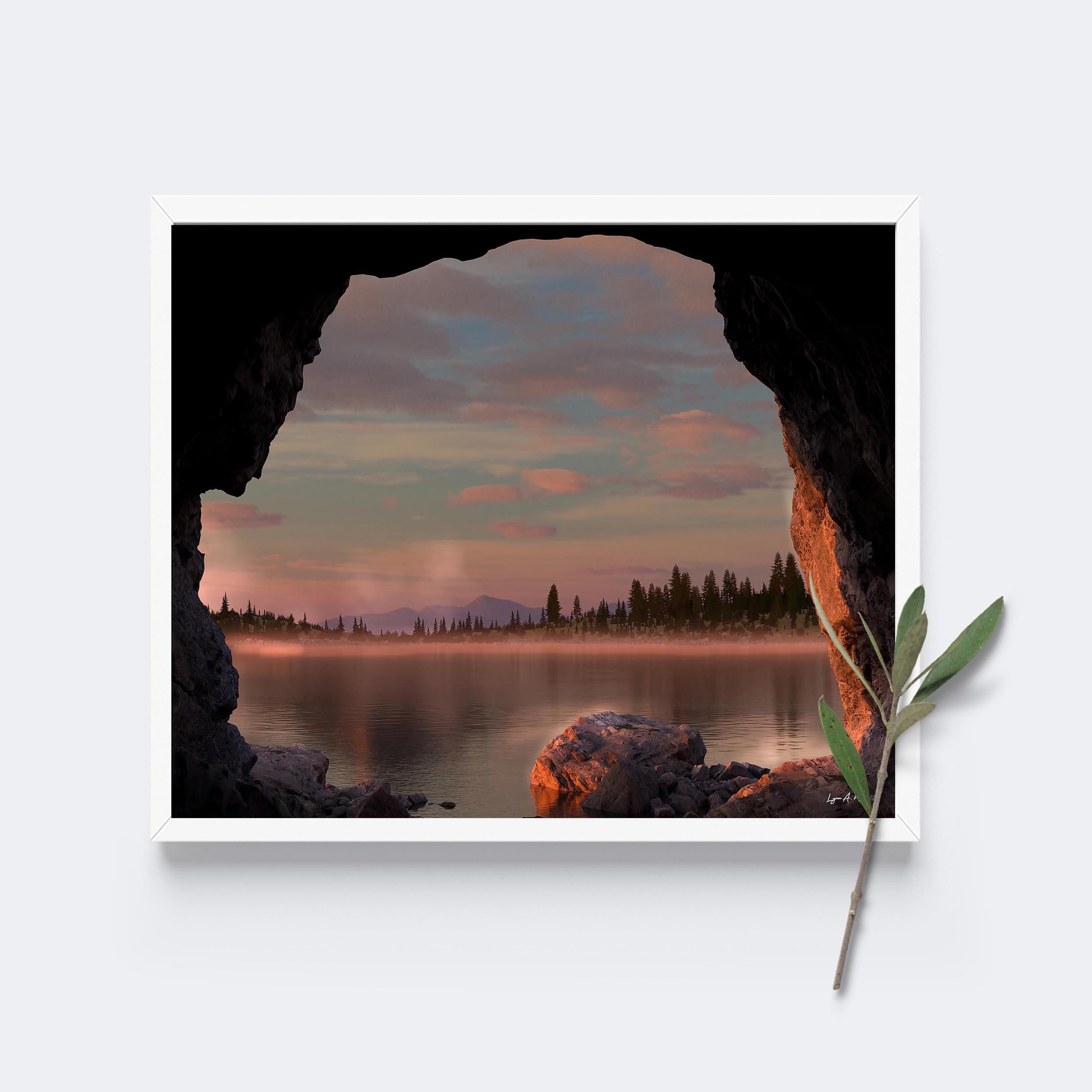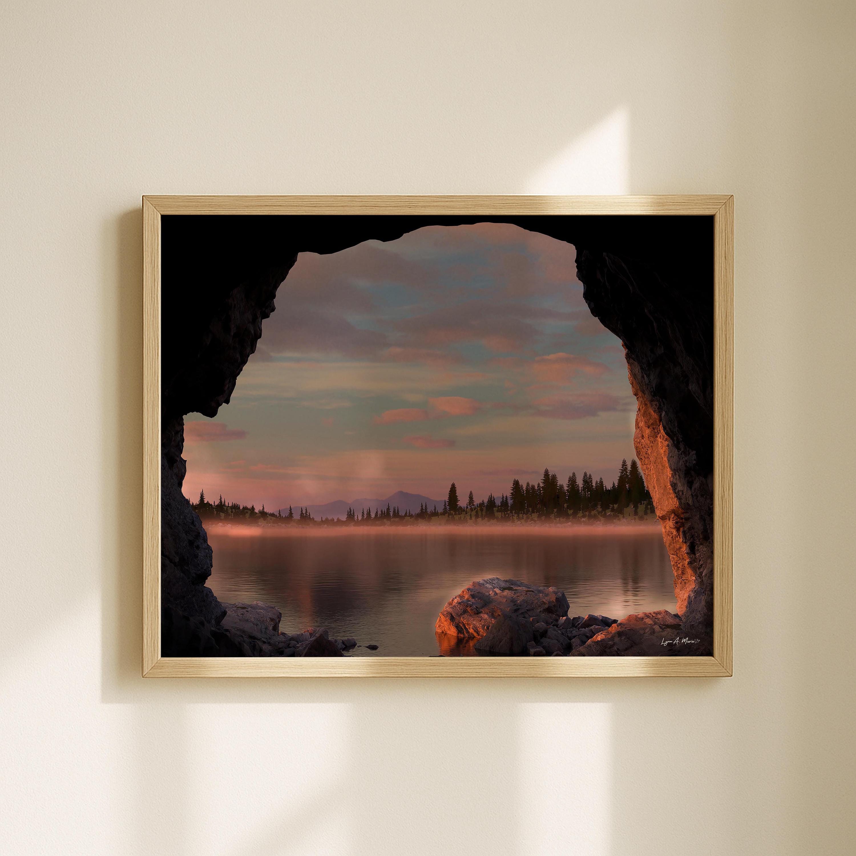 I created this artwork because scenes like this, quiet water, soft sunset glow, and the view from inside a rocky cave landscape, have always felt grounding to me. I wanted to capture that calm moment, looking out from the cave opening, and turn it into a signed art print that someone could enjoy every day in their home. The warm twilight sky, light mist, and still lake create a simple, peaceful atmosphere that works beautifully as living room wall art, rustic lake wall art, or cozy lodge decor. This digitally created, (not AI generated) cave scene offers a comforting nature escape, a realistic view that feels like stepping out to the water at sunrise or evening, even when you're indoors.
