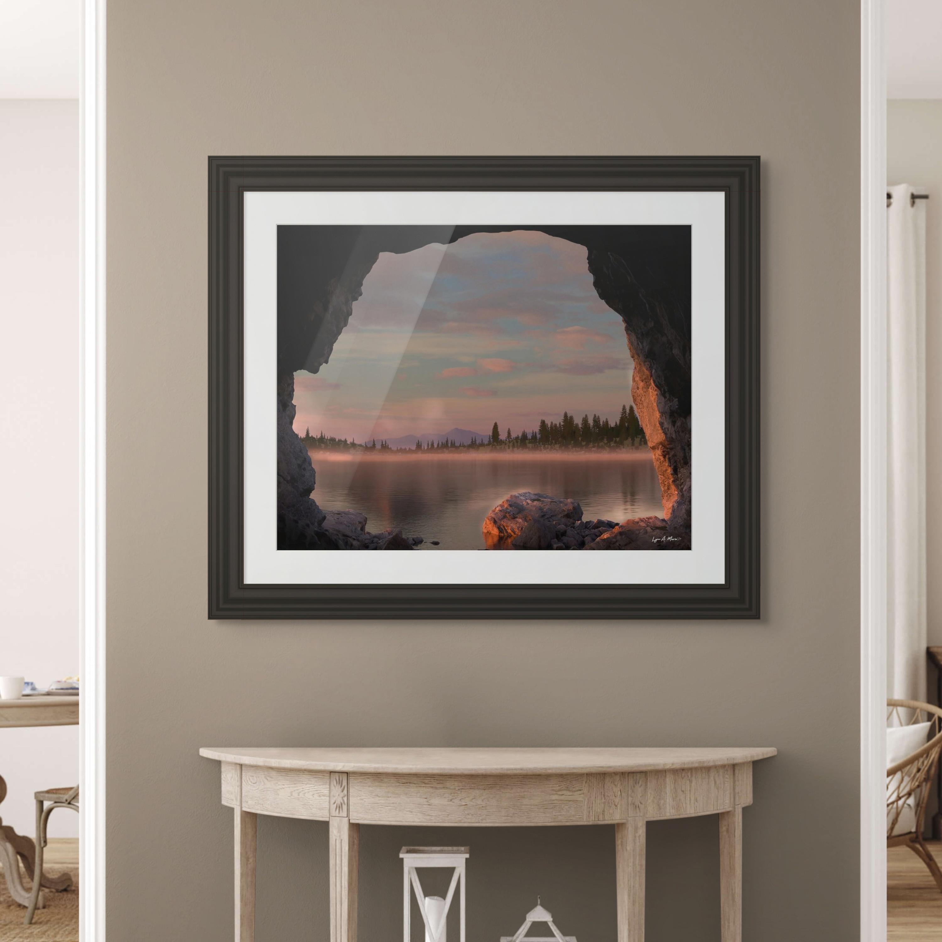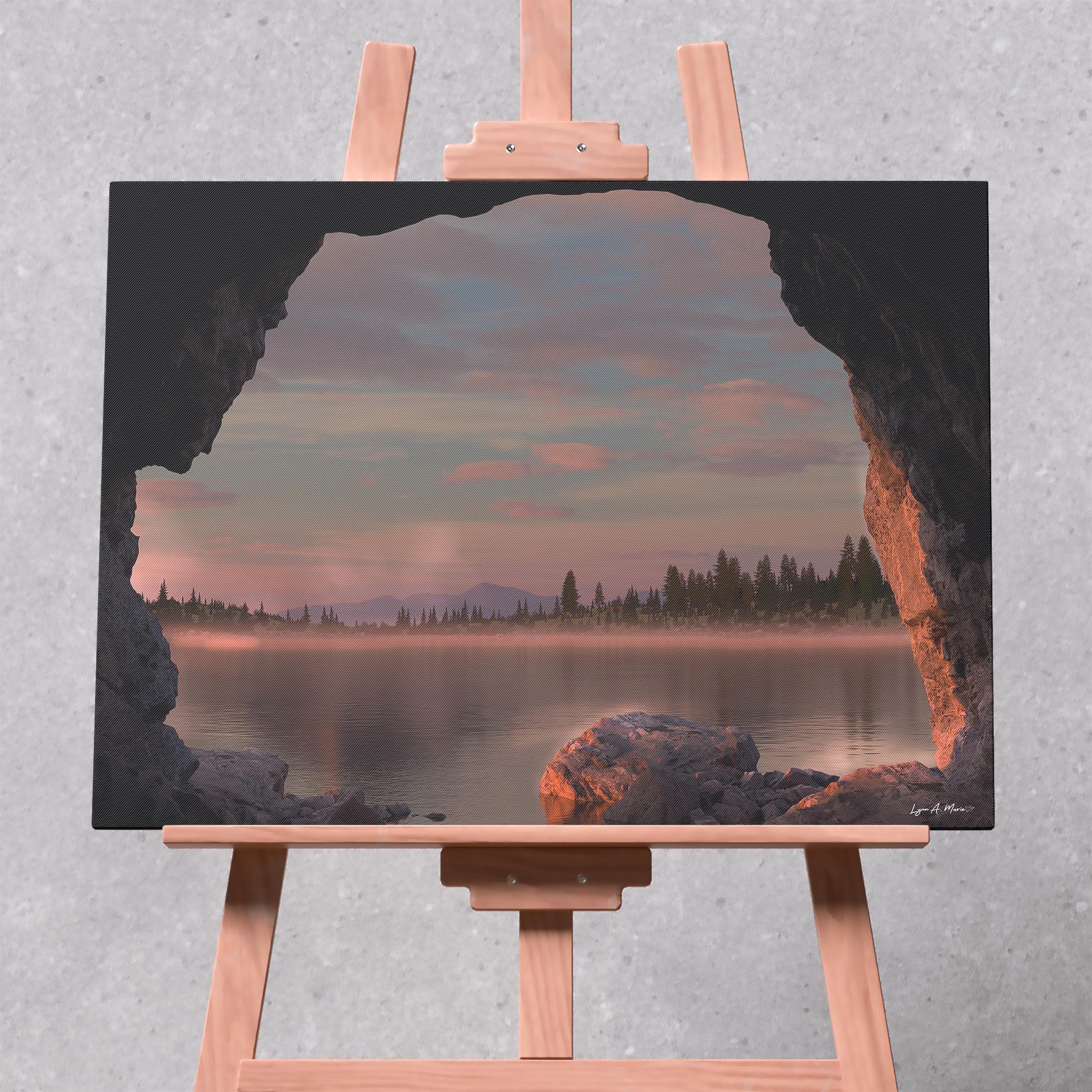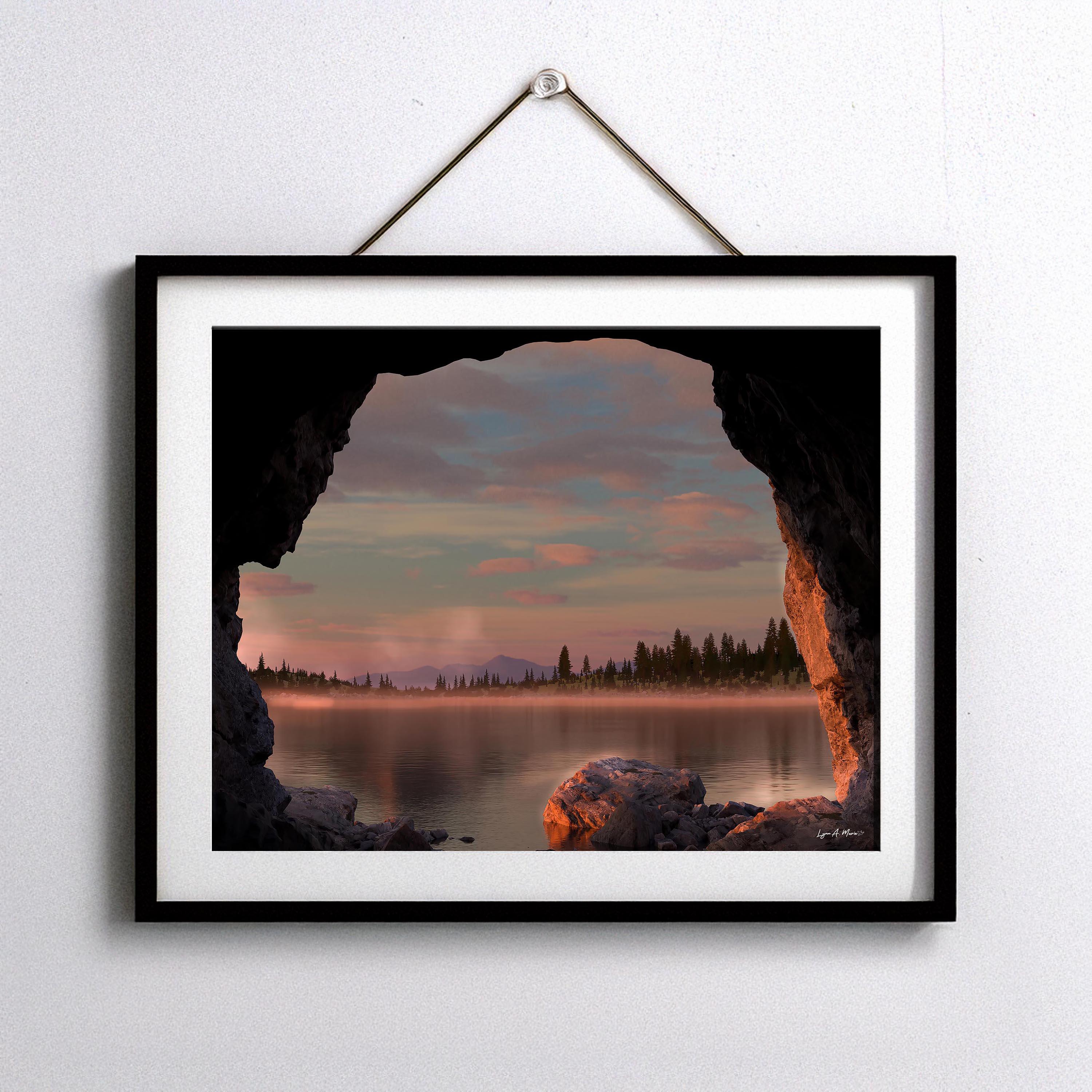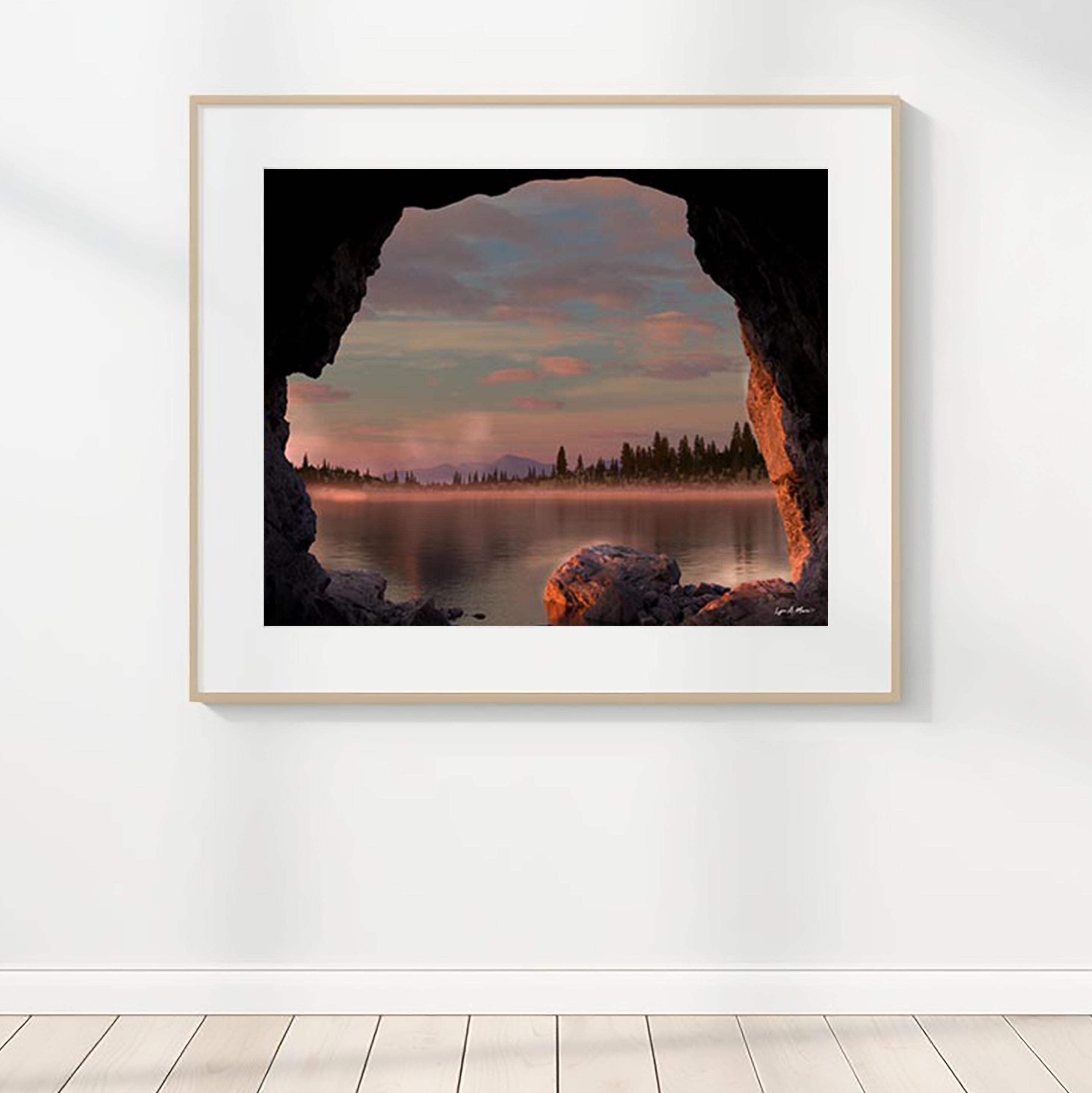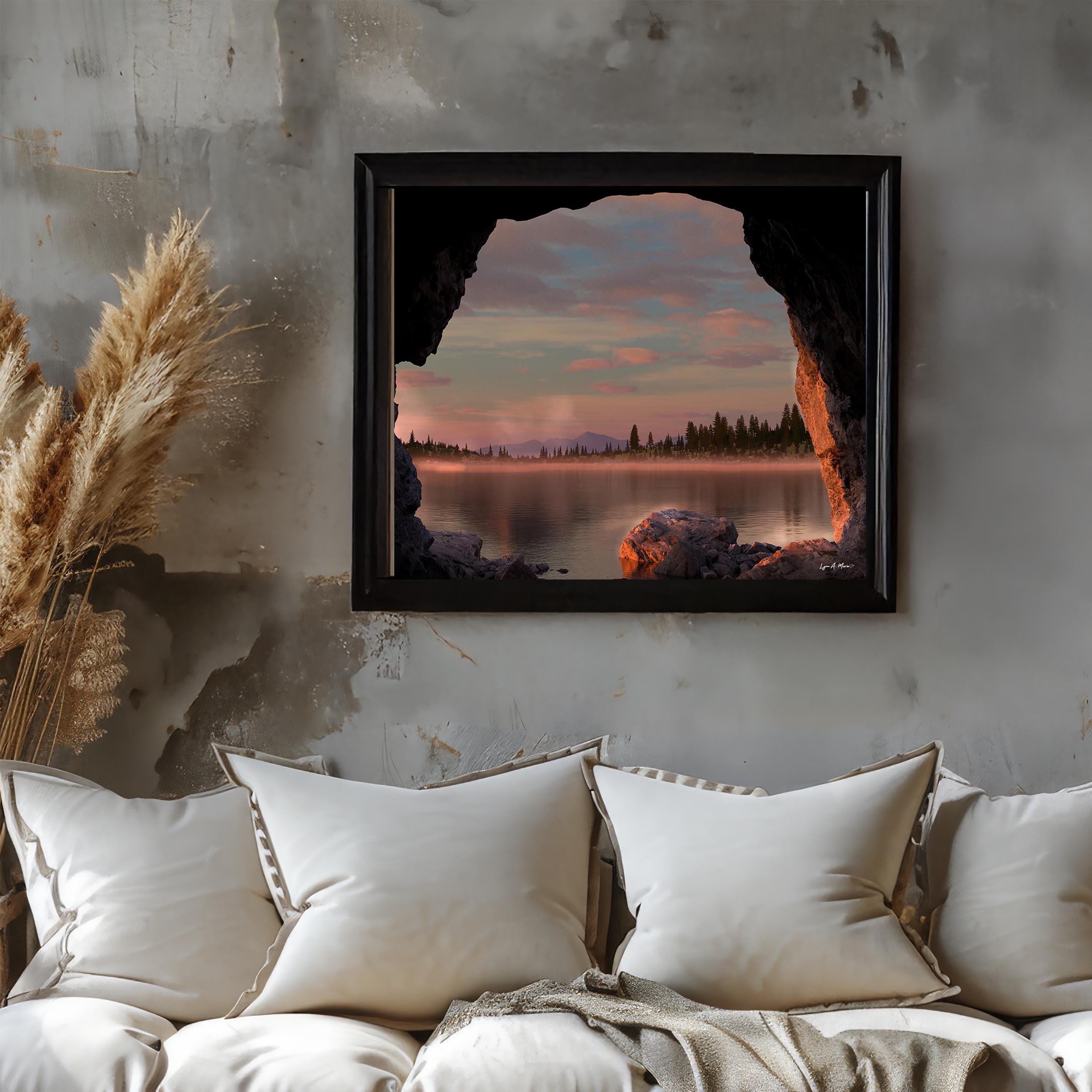 I created this artwork because scenes like this, quiet water, soft sunset glow, and the view from inside a rocky cave landscape, have always felt grounding to me. I wanted to capture that calm moment, looking out from the cave opening, and turn it into a signed art print that someone could enjoy every day in their home. The warm twilight sky, light mist, and still lake create a simple, peaceful atmosphere that works beautifully as living room wall art, rustic lake wall art, or cozy lodge decor. This digitally created, (not AI generated) cave scene offers a comforting nature escape, a realistic view that feels like stepping out to the water at sunrise or evening, even when you're indoors.