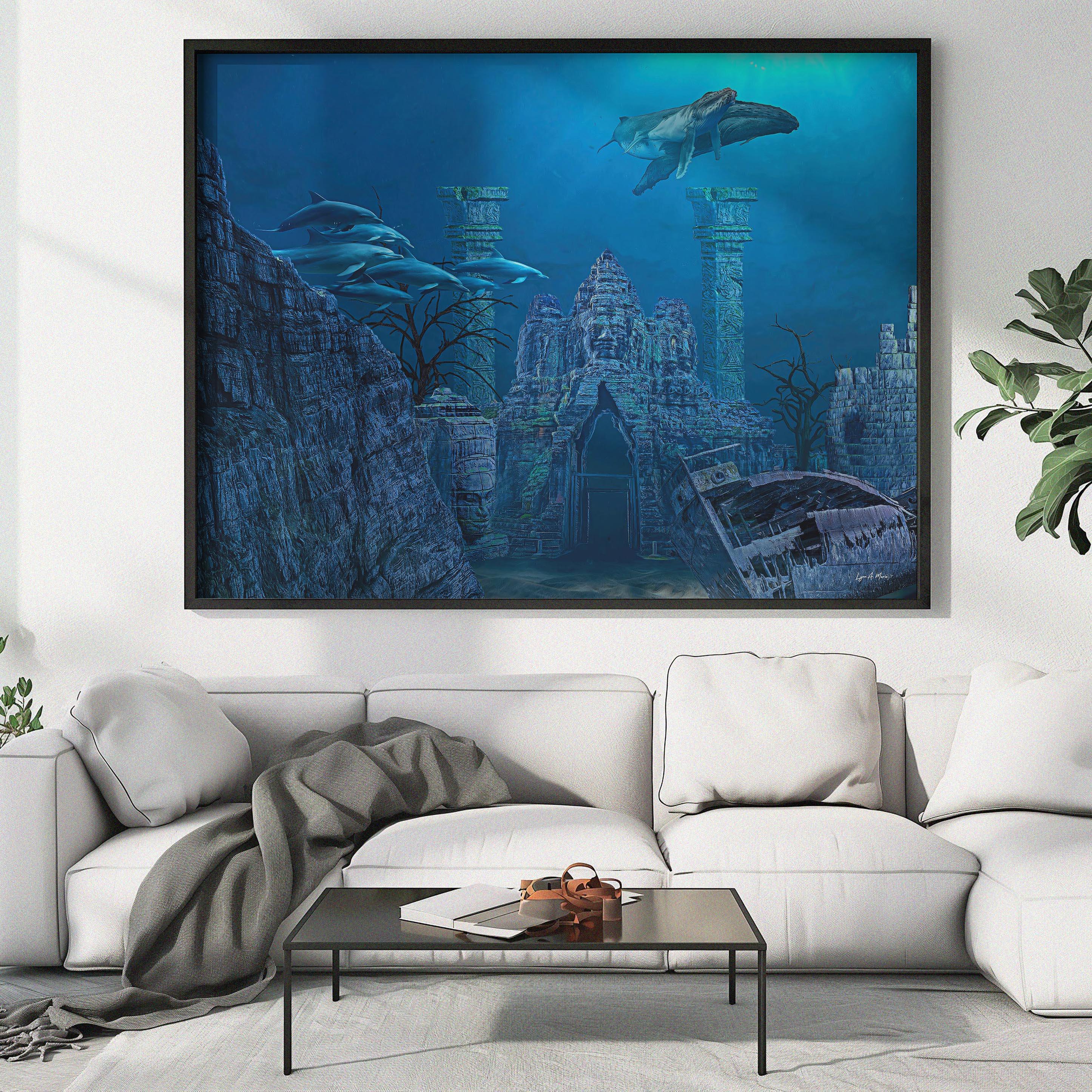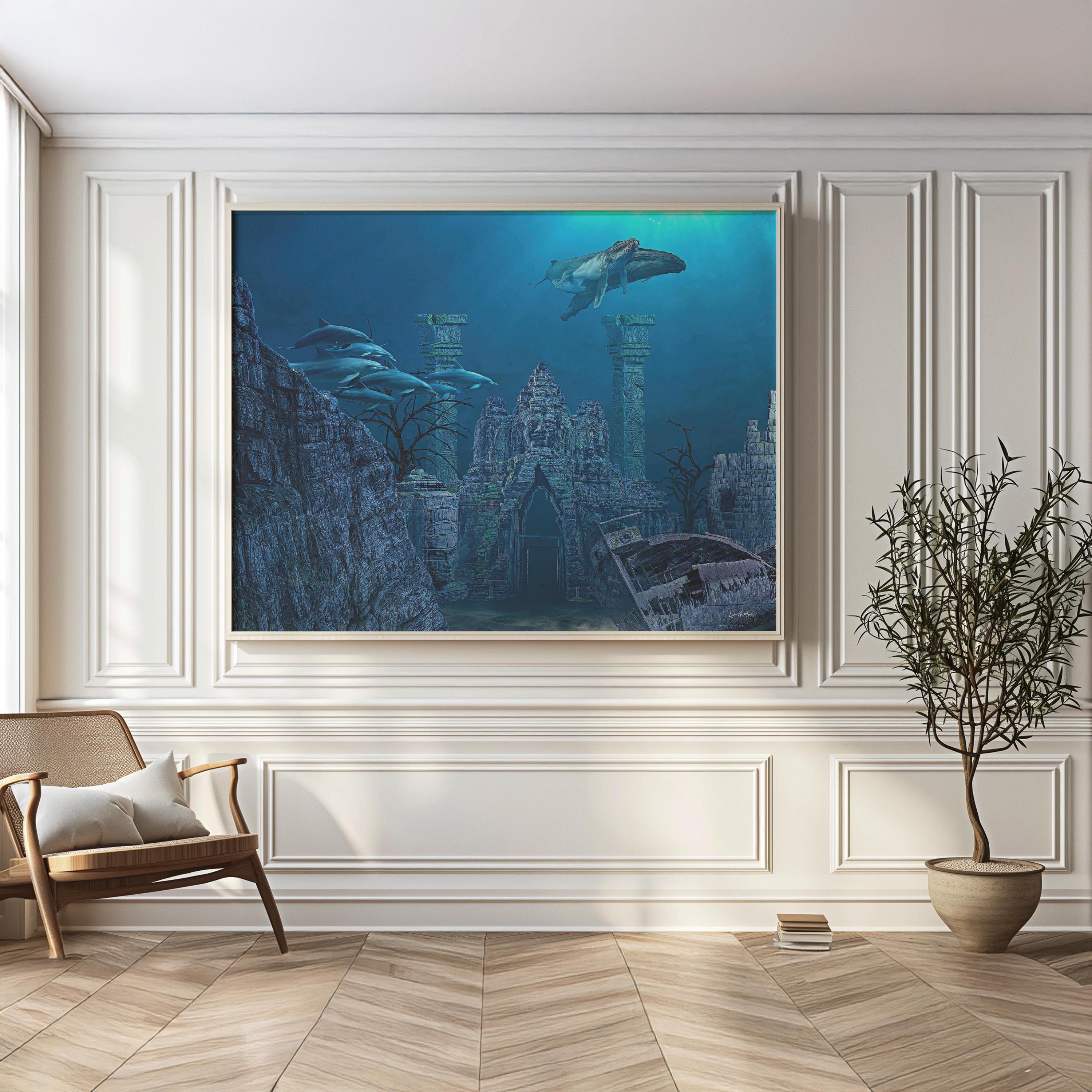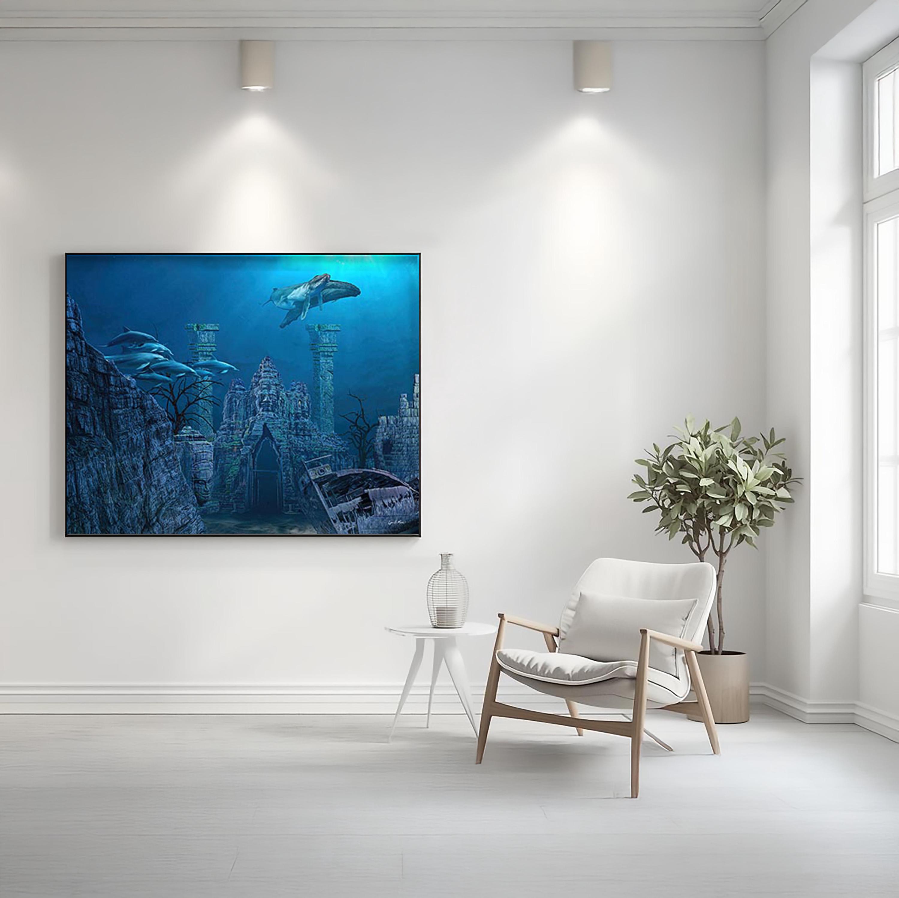 I created this signed piece as a dreamscape for sea lovers, a calm, fantasy ocean world filled with sealife and ancient ruins. The underwater marine landscape invites you to pause and imagine what’s hidden beneath the waves. Designed for decor that feels transportive, it brings a quiet coastal mood into any livingroom. Perfect for anyone who finds peace in the sea.
