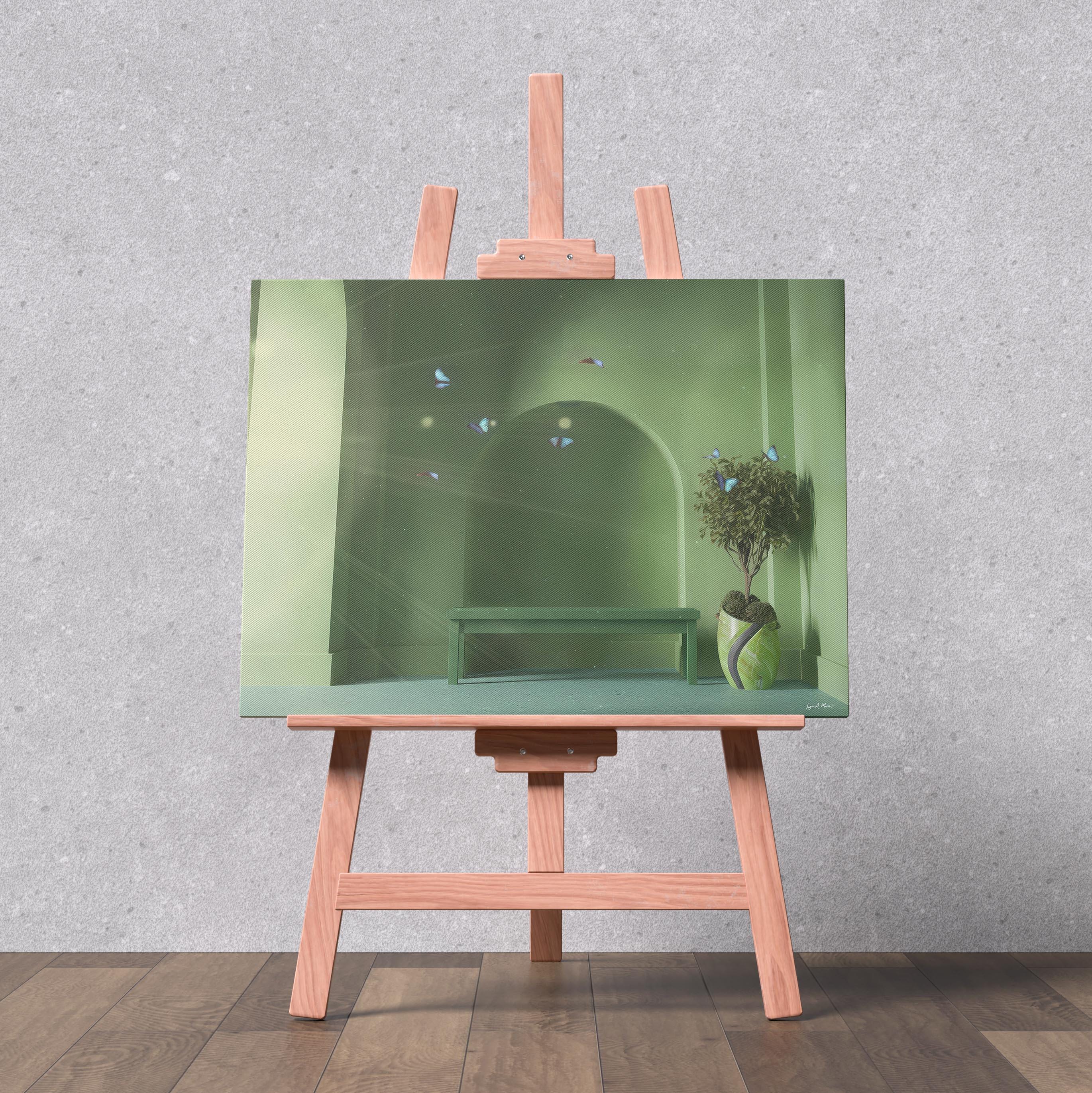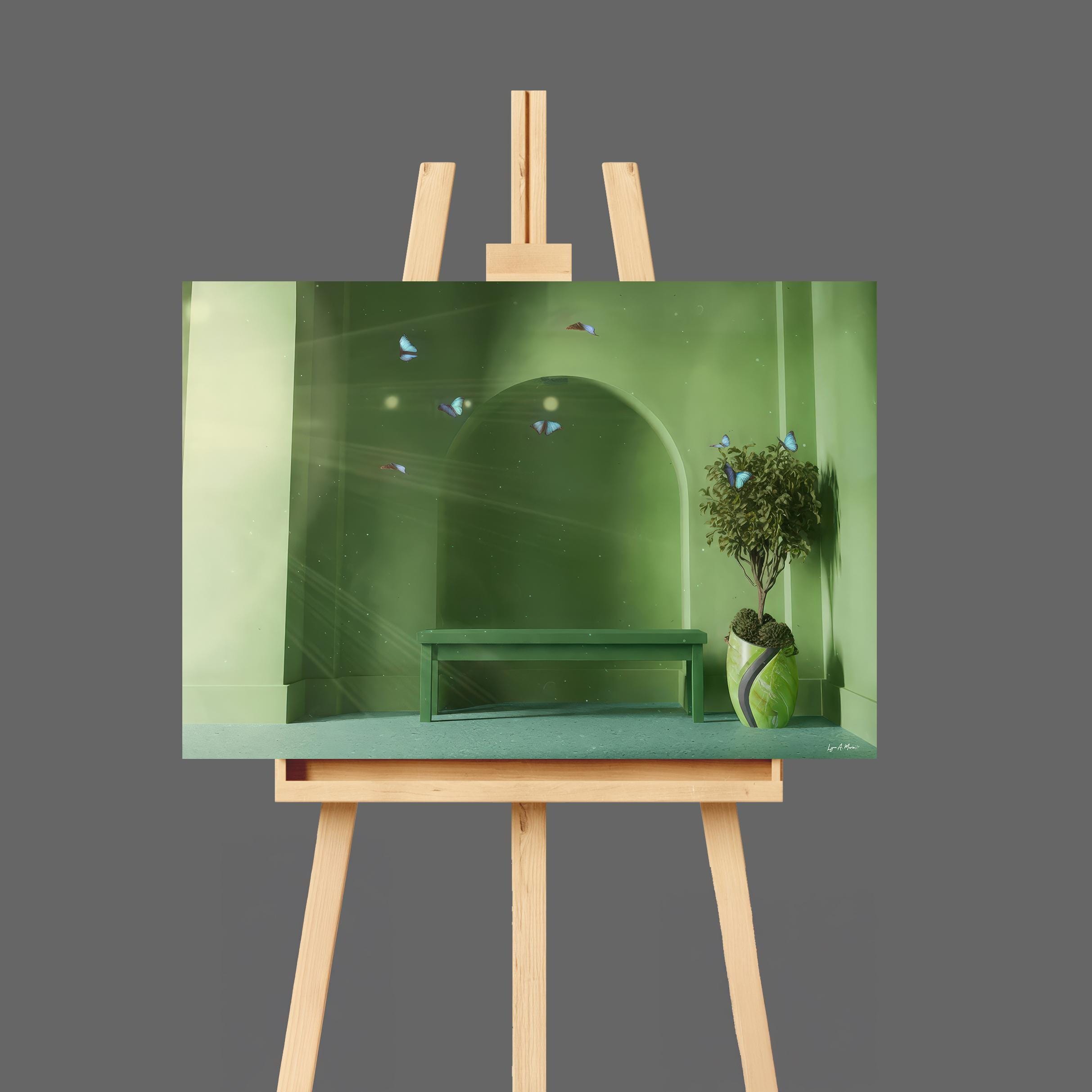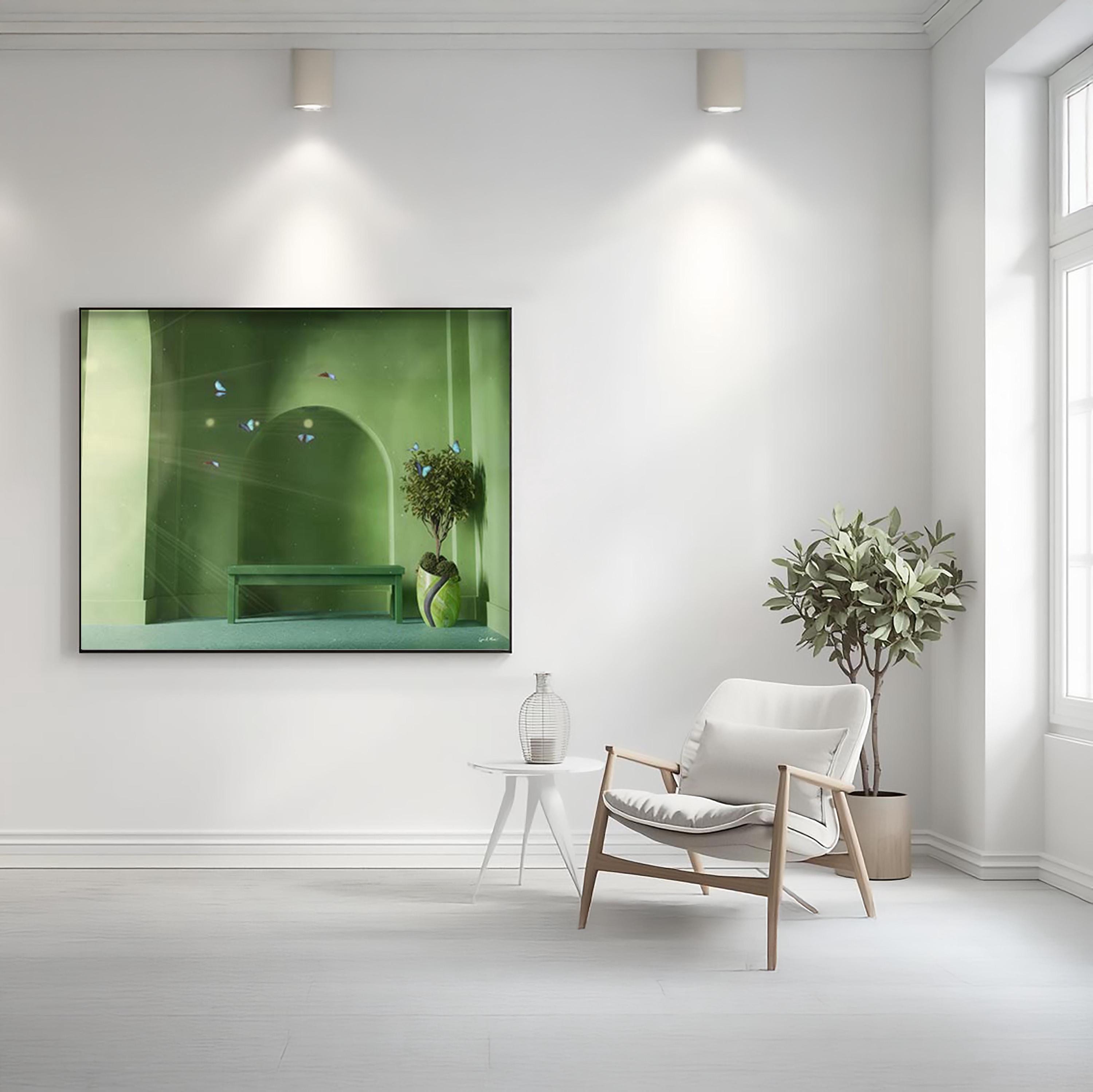 This artwork features a calm, refined portrait-style composition with soft green tones and subtle motion, inspired by a journalistic sense of balance and storytelling. Designed to feel quiet yet thoughtful, it brings a polished, professional atmosphere to an office, hotel, or lobby setting.