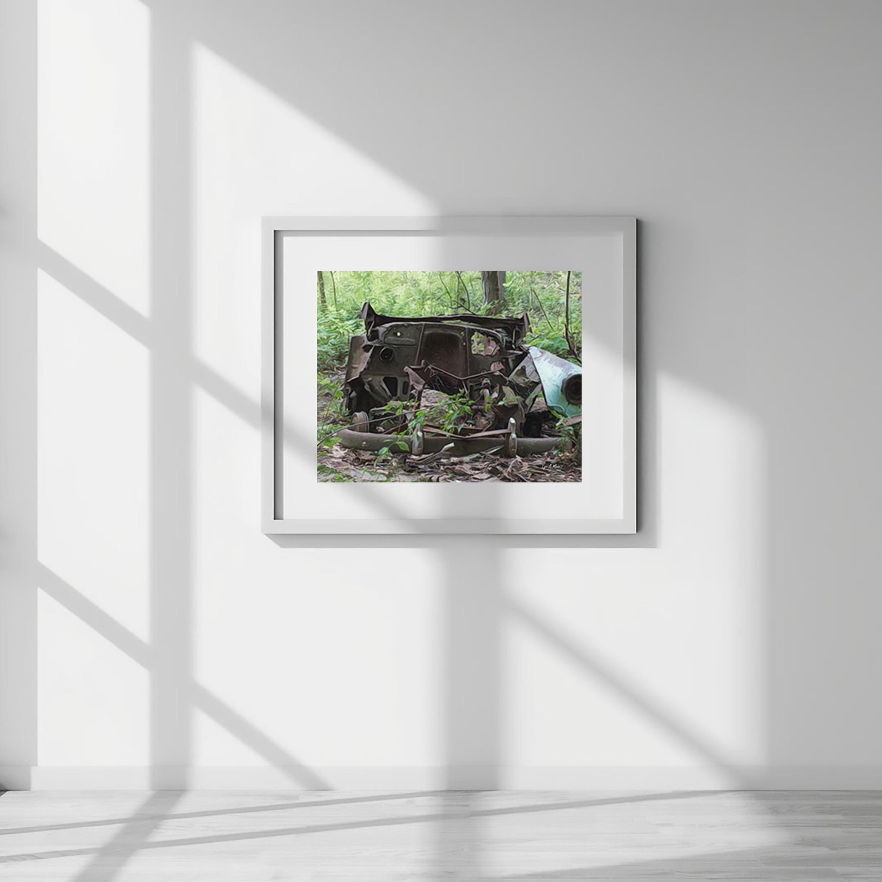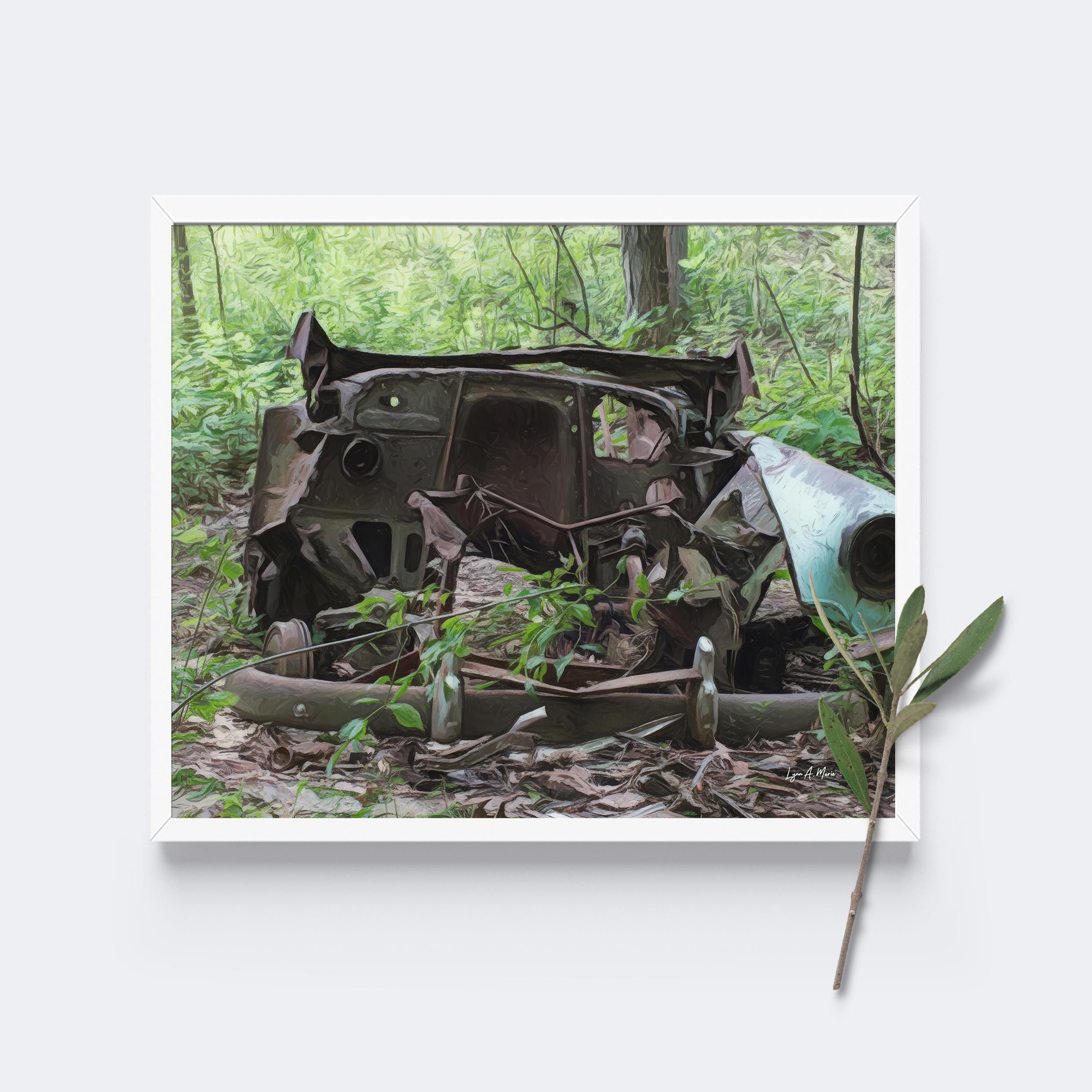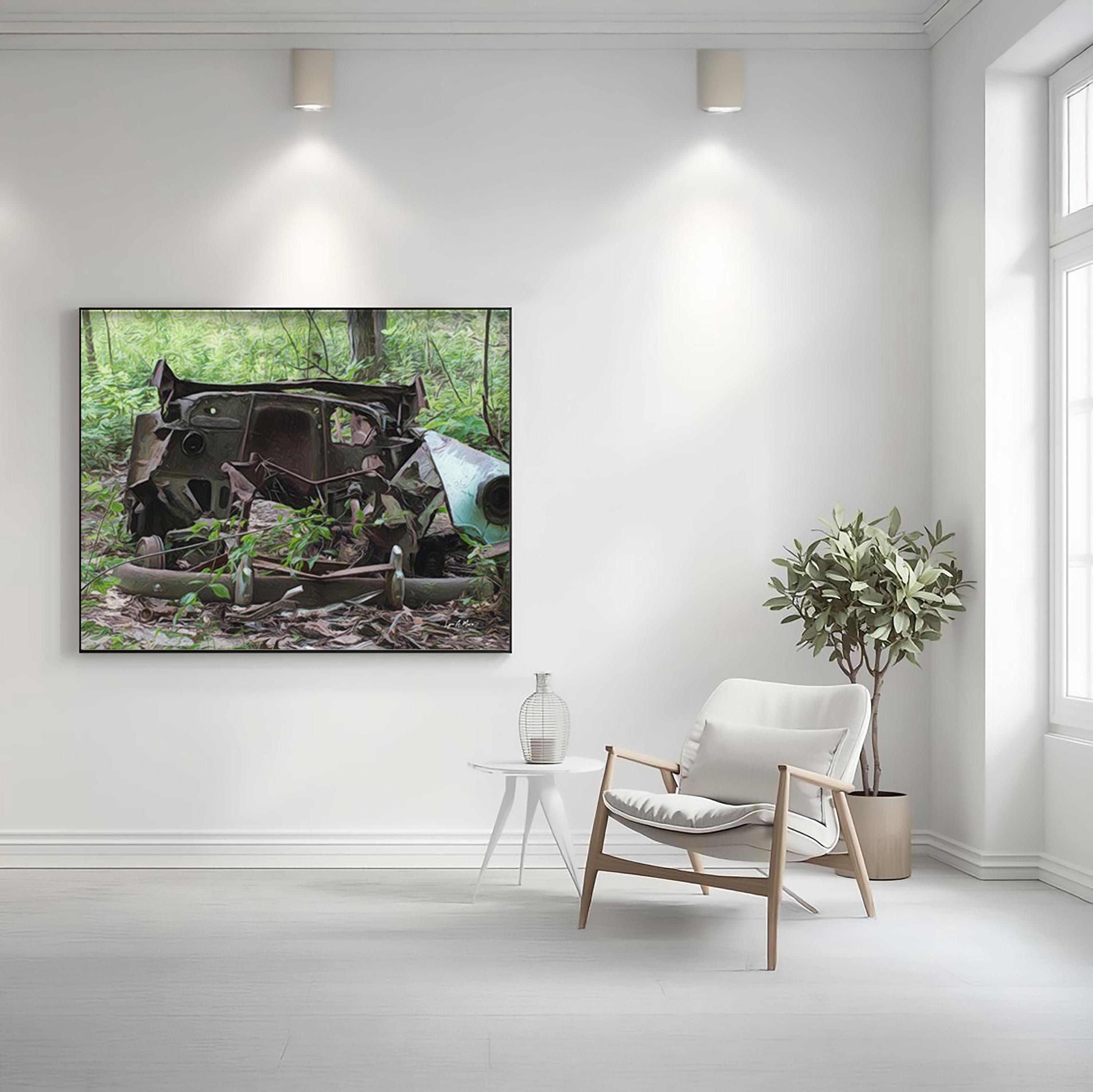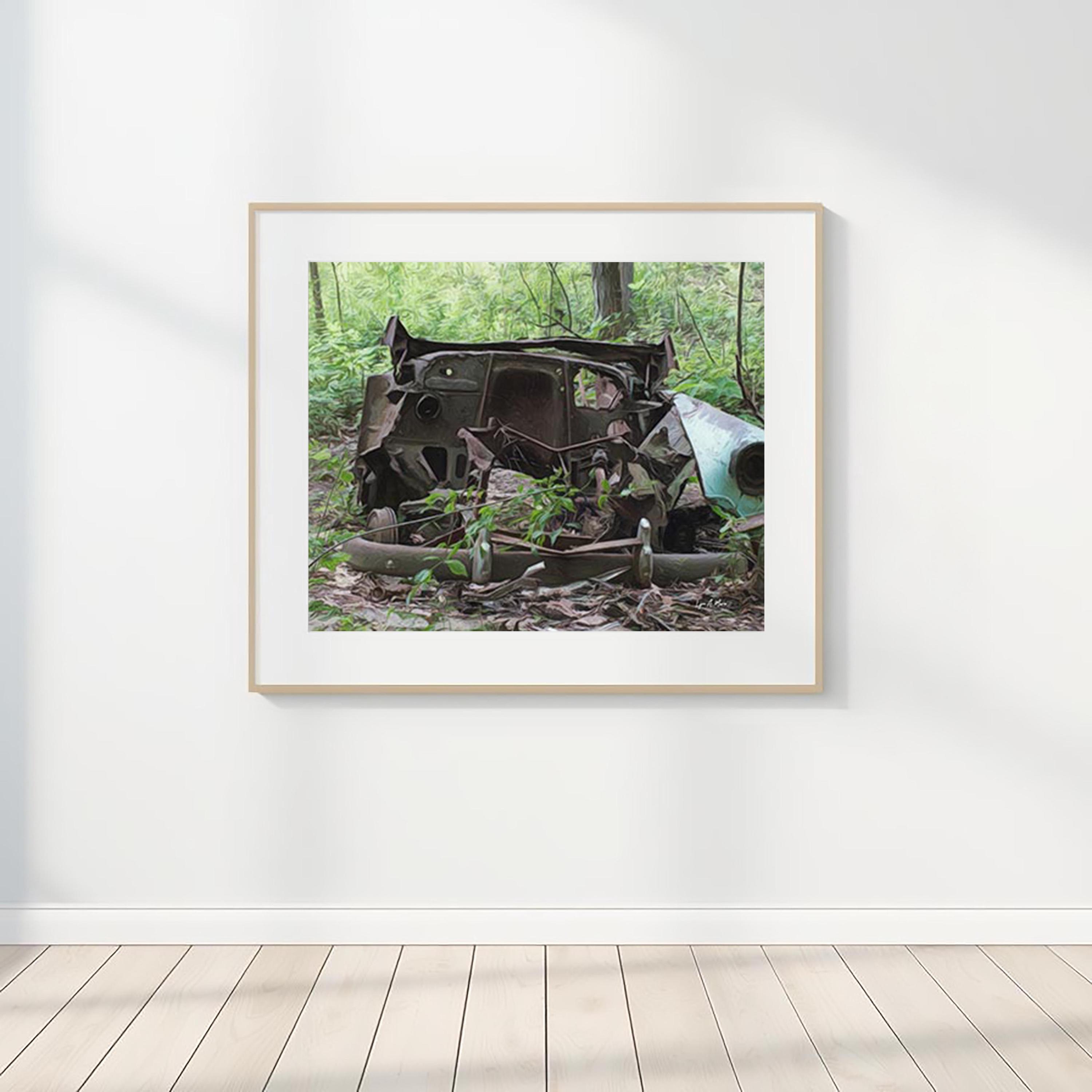 I created this artwork because I was drawn to how nature was taking back what was once man-made. The old car slowly being reclaimed by the forest felt peaceful and powerful at the same time, and I wanted to capture that moment in a simplistic way.