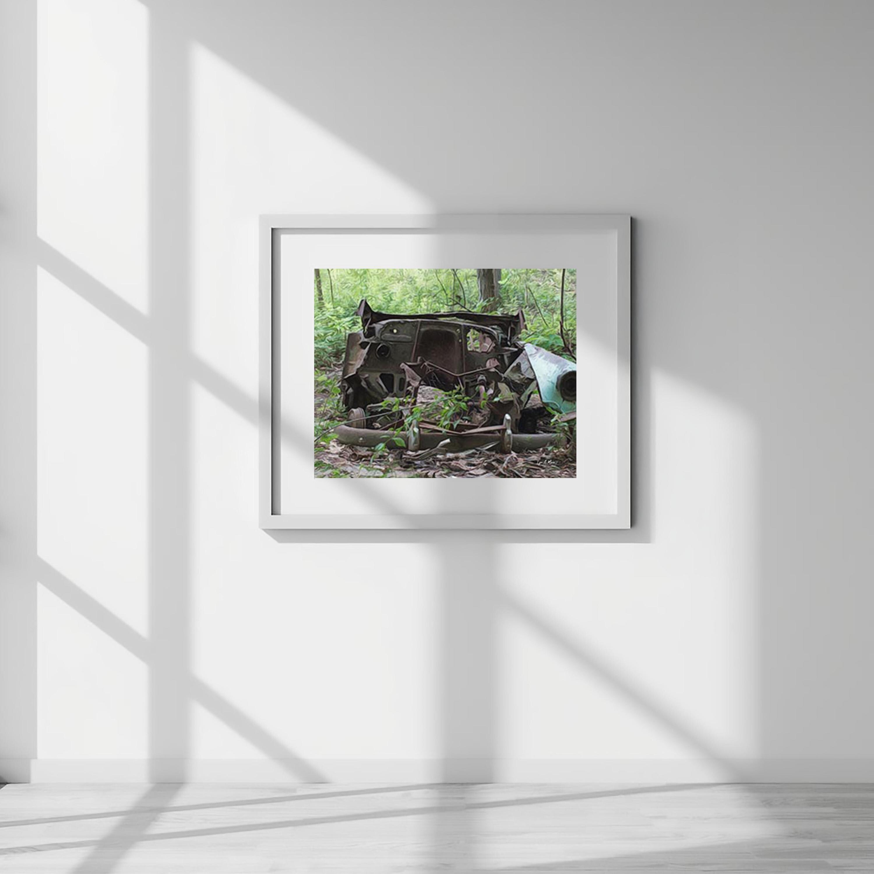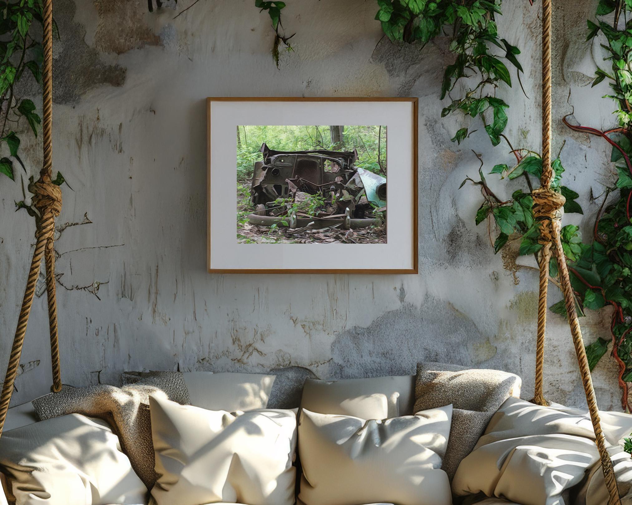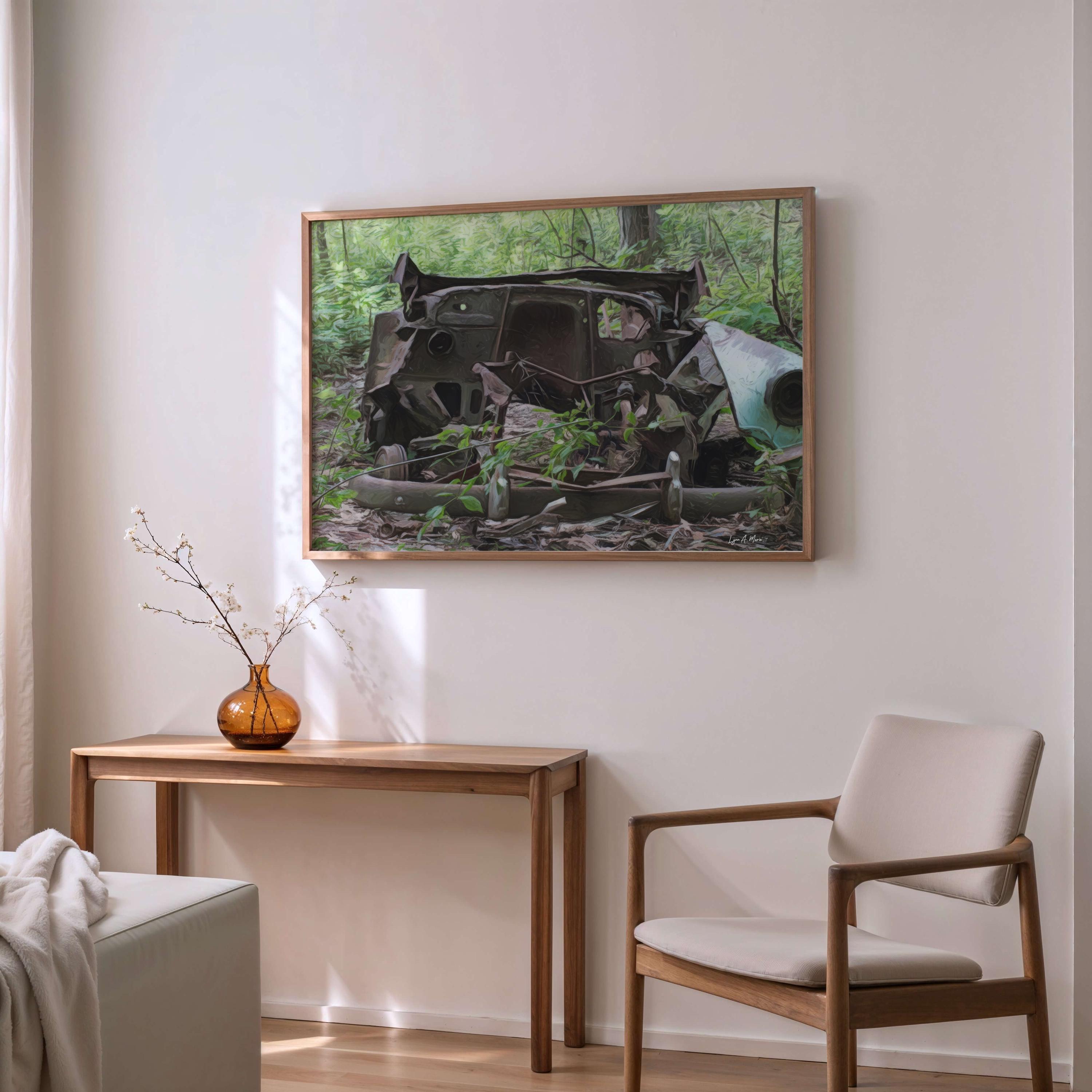 I created this artwork to blend the beauty of the forest with the story of an old automobile returning to nature. The real yet softly created style creates an elegant, themed landscape perfect for living room wall décor. The mix of green foliage and the weathered car adds unique character to any decor or nature-themed home. This is not AI generated but created in Photoshop.