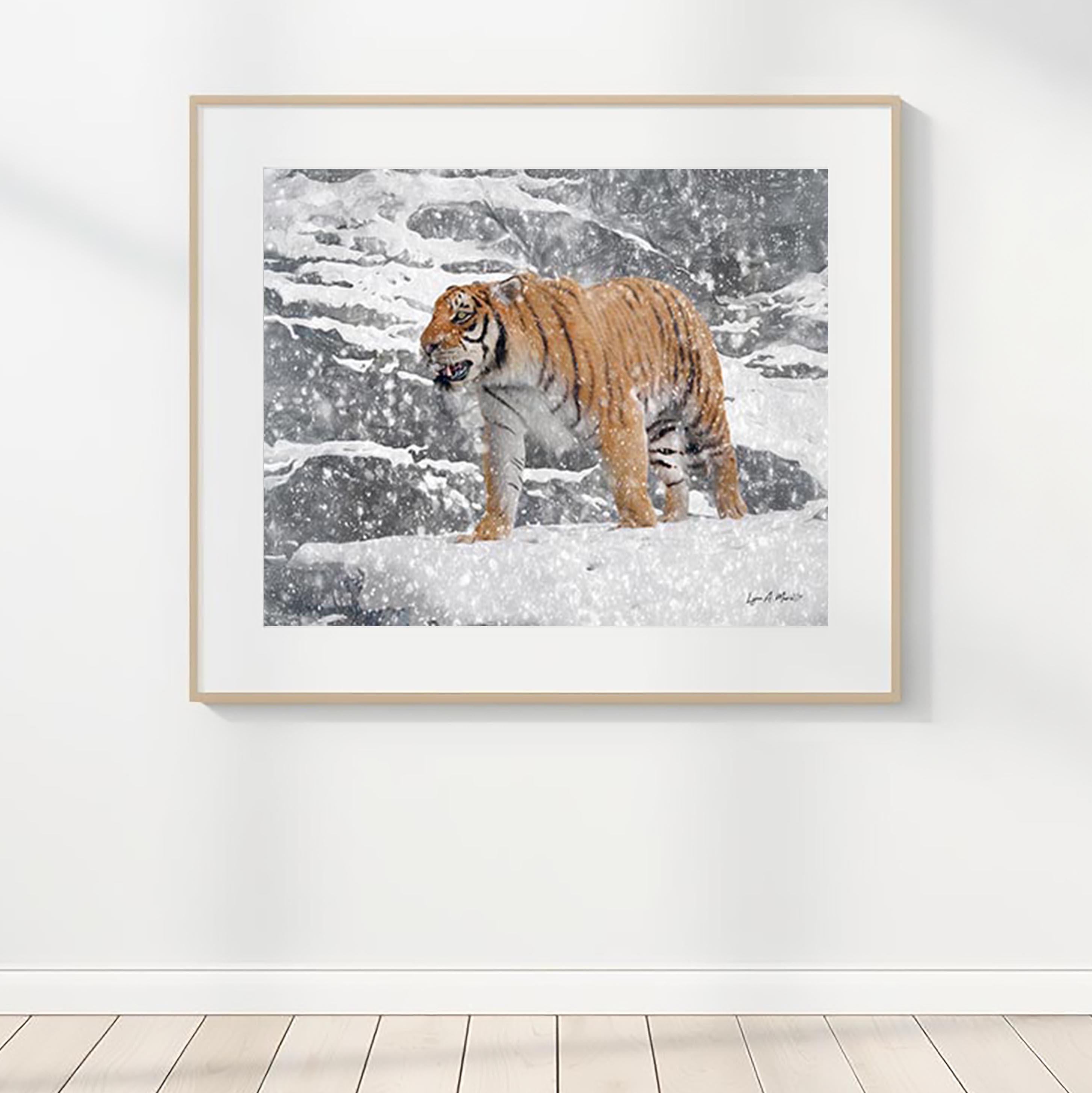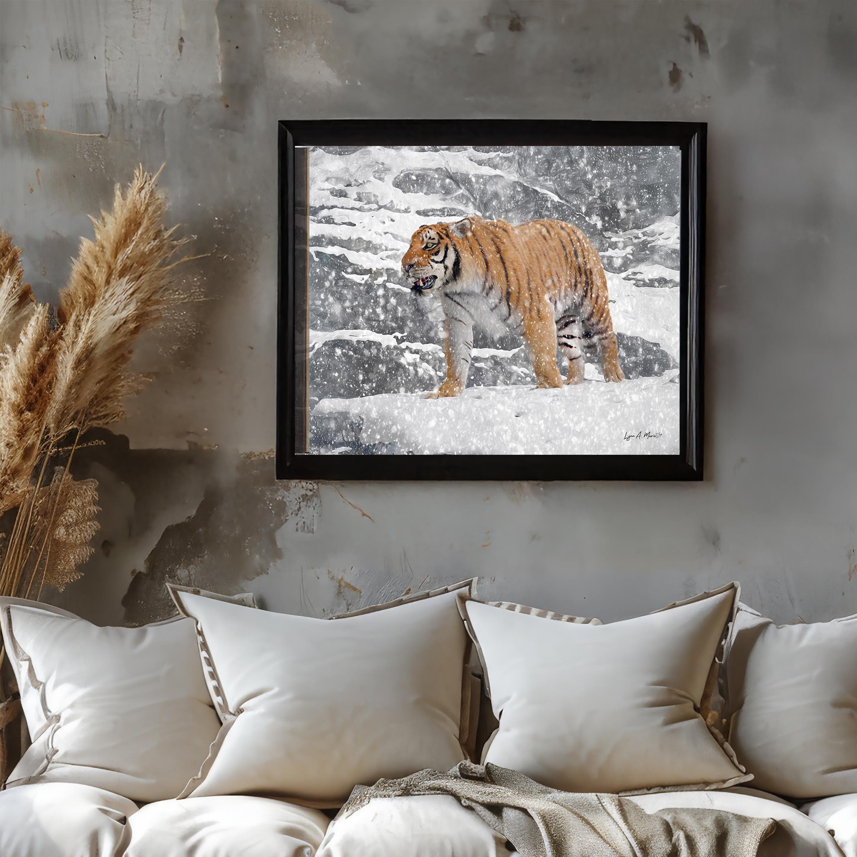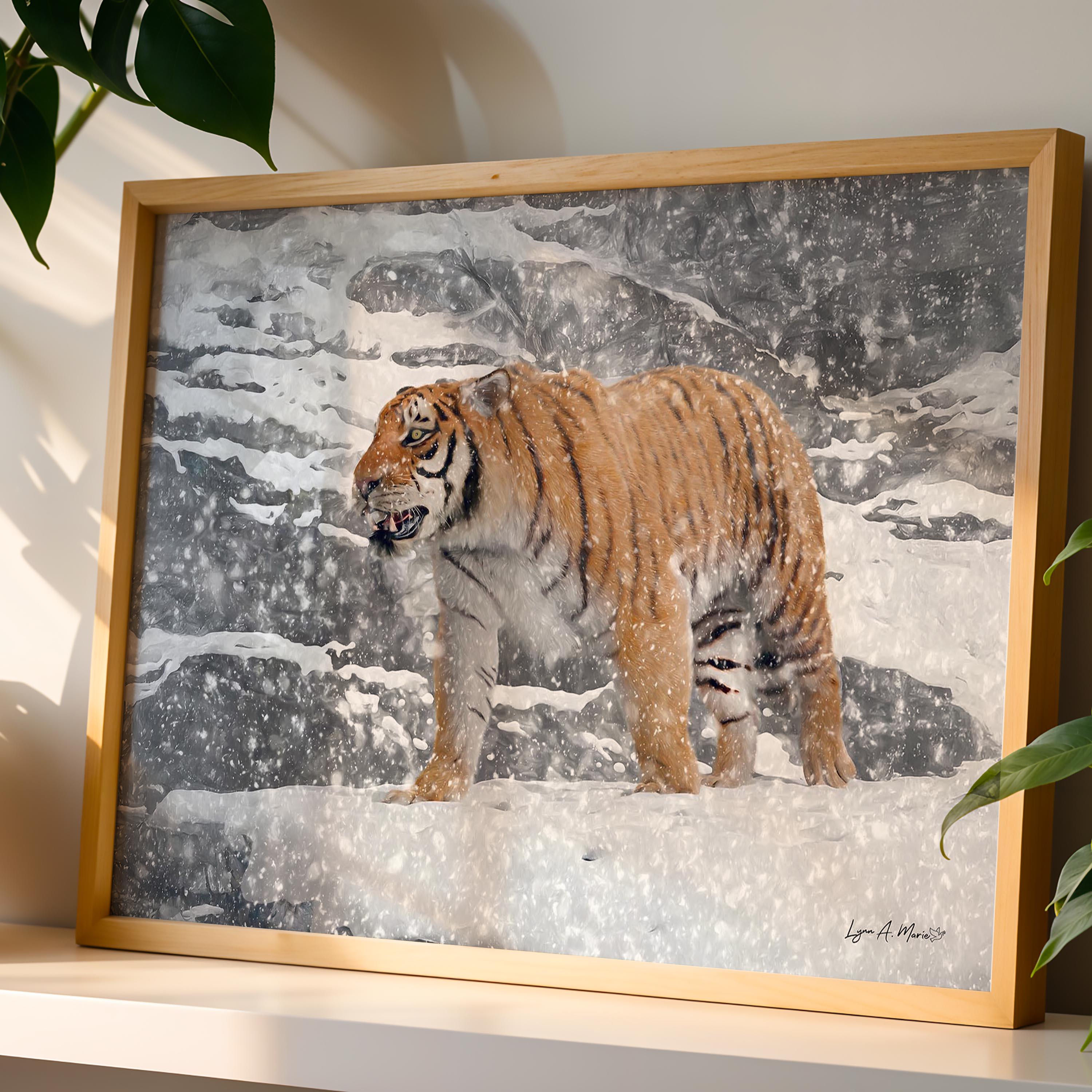 I created this signed animal art print to capture the quiet power of the Siberian tiger moving through a winter storm. This wildlife work of art is perfect for any living room wall, a rustic cabin, or elegant lodge interiors. Every detail was digitally created, not AI generated. This work blends big cat artwork, forest animal art, and natural atmosphere, making it perfect for a lodge, cabin decor or simply a meaningful nature lover gift for the home.