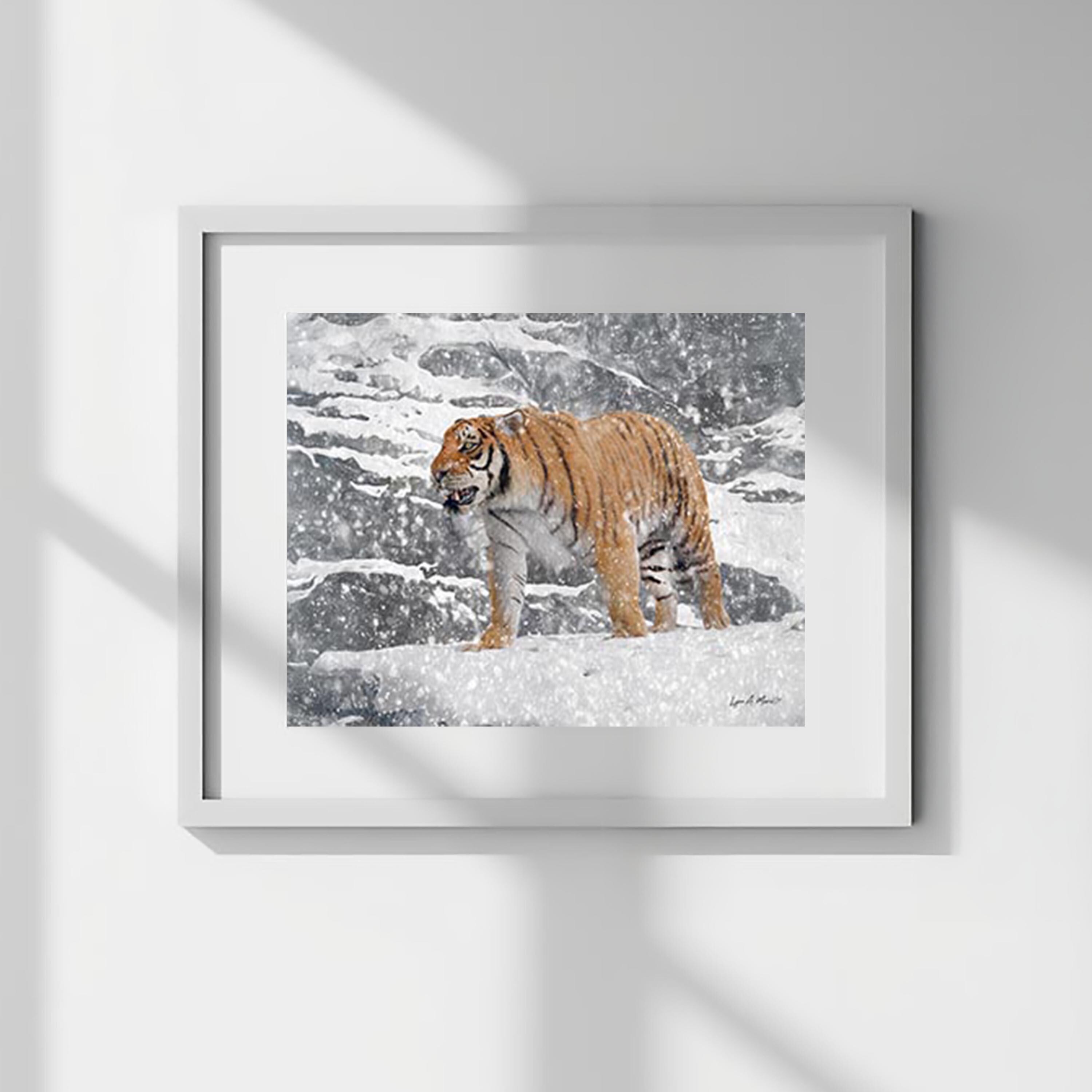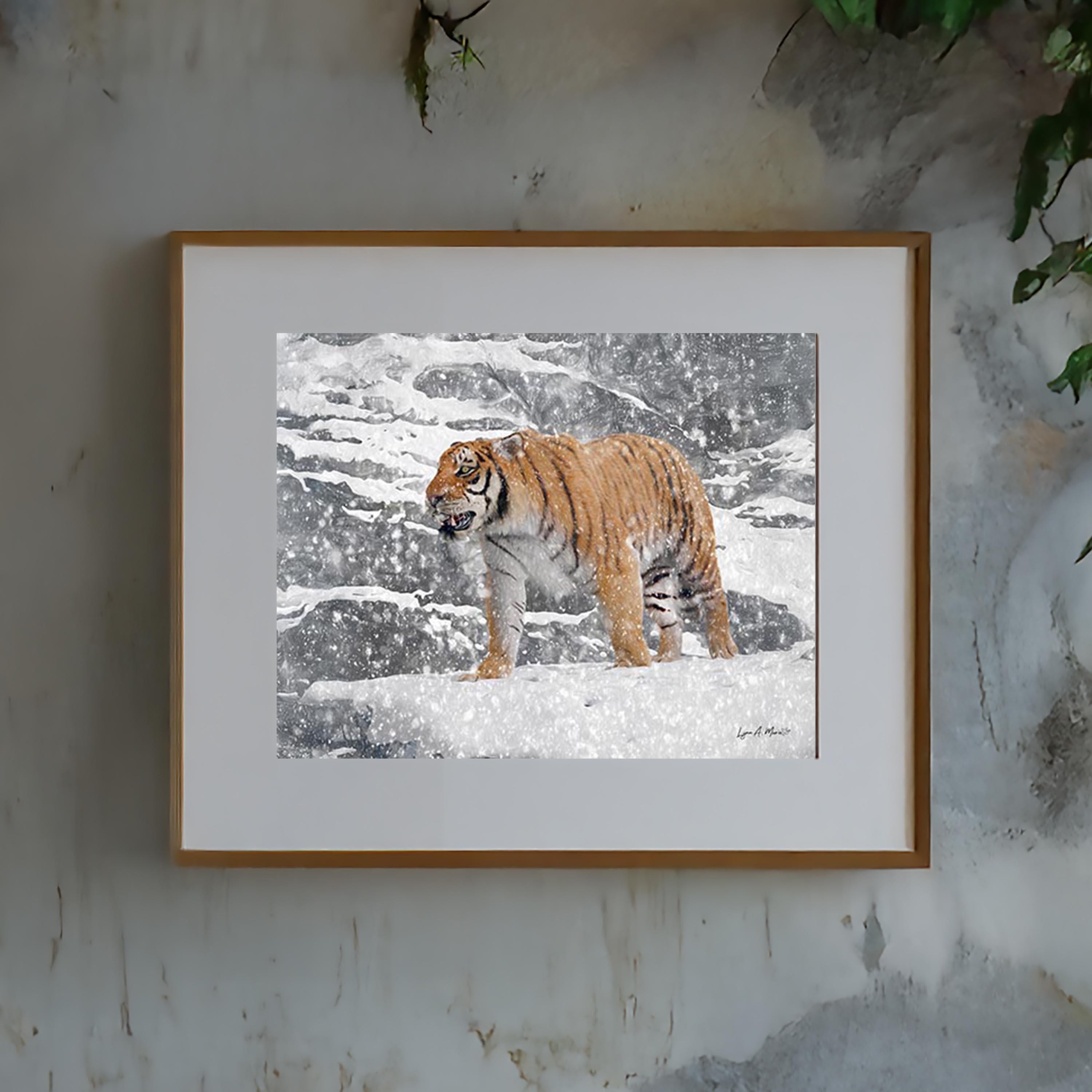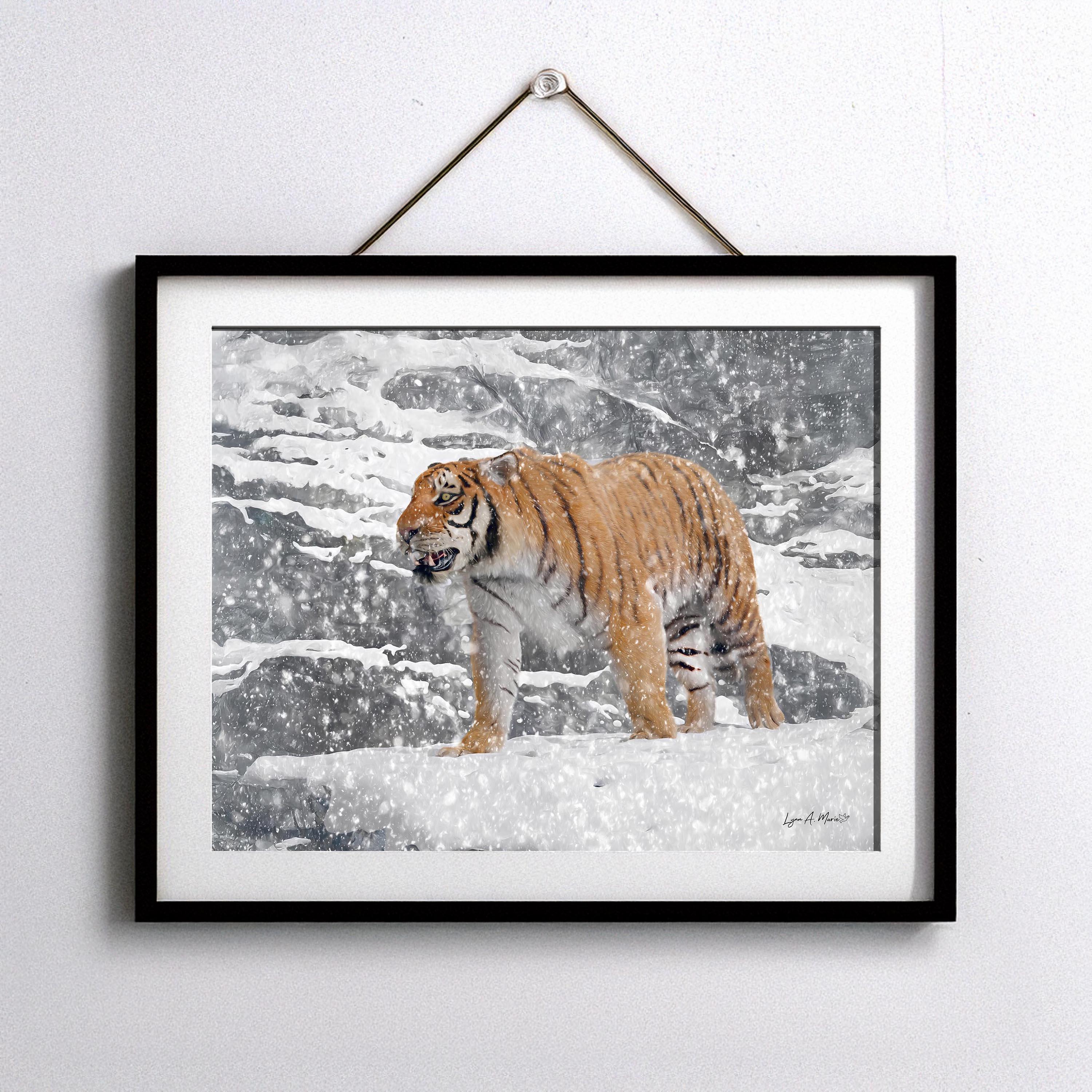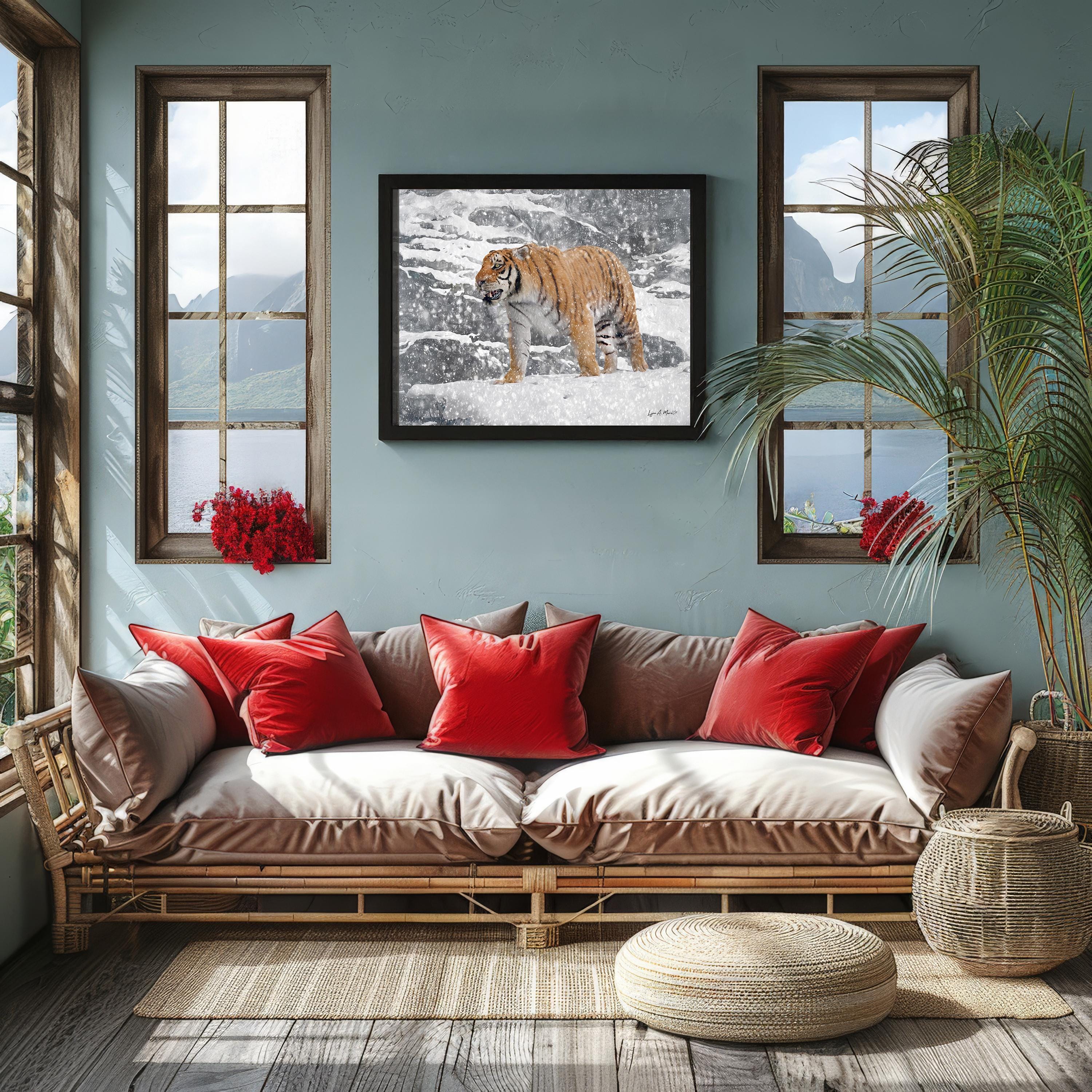 I created this signed animal art print to capture the quiet power of the Siberian tiger moving through a winter storm. This wildlife work of art is perfect for any living room wall, a rustic cabin, or elegant lodge interiors. Every detail was digitally created, not AI generated. This work blends big cat artwork, forest animal art, and natural atmosphere, making it perfect for a lodge, cabin decor or simply a meaningful nature lover gift for the home.