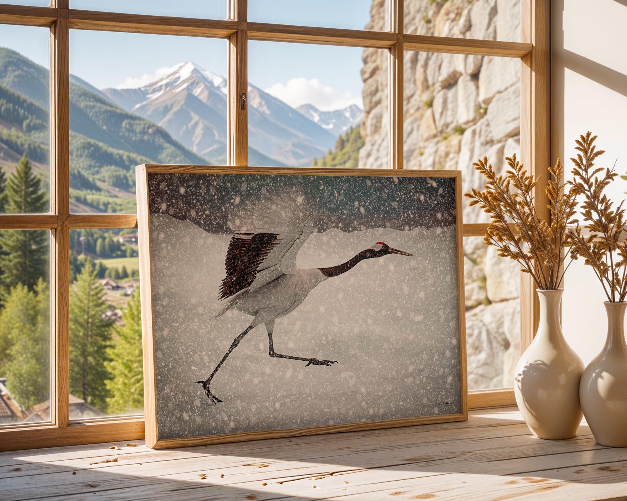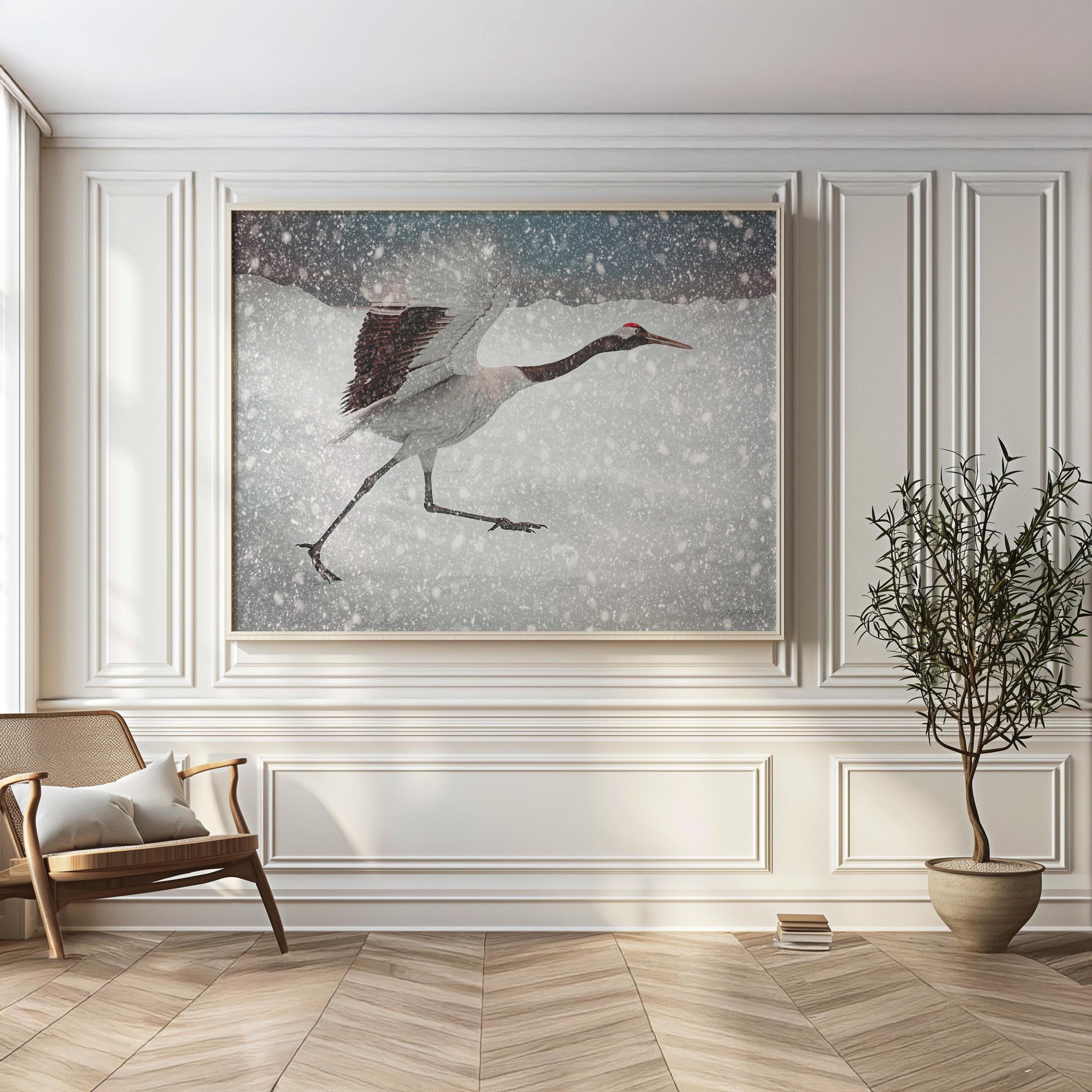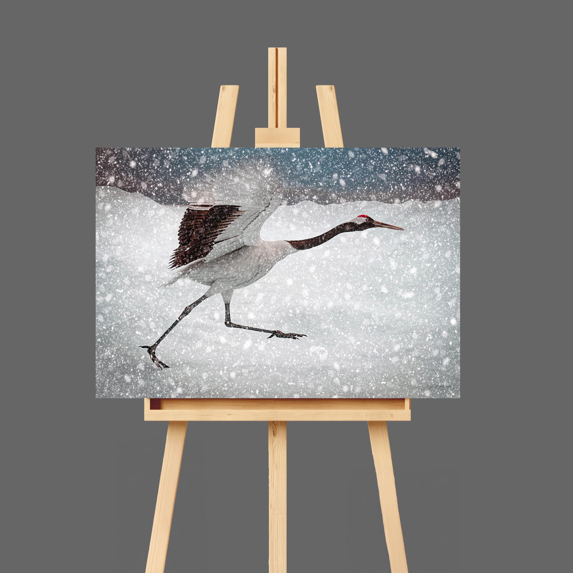 I created this piece to freeze the split second a crane outruns a snowstorm, wings lifting, legs flying, pure determination. The motion against winter’s white speaks to resilience and grace, a reminder to keep moving even when the world feels cold.