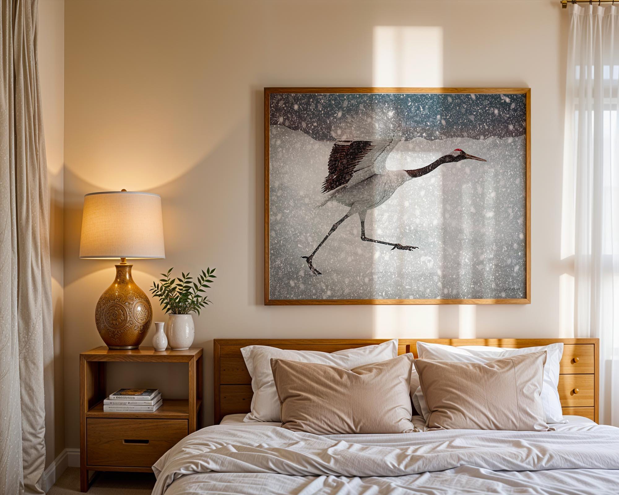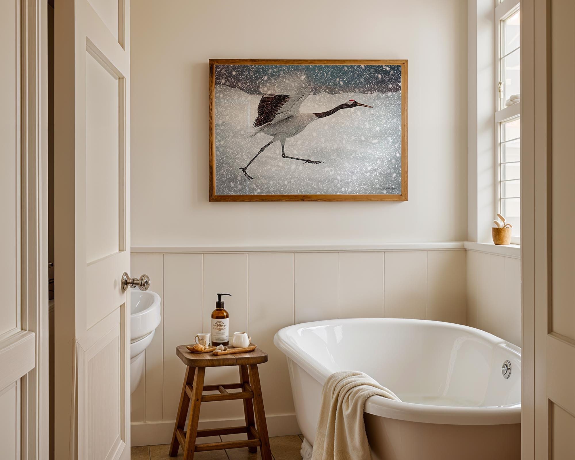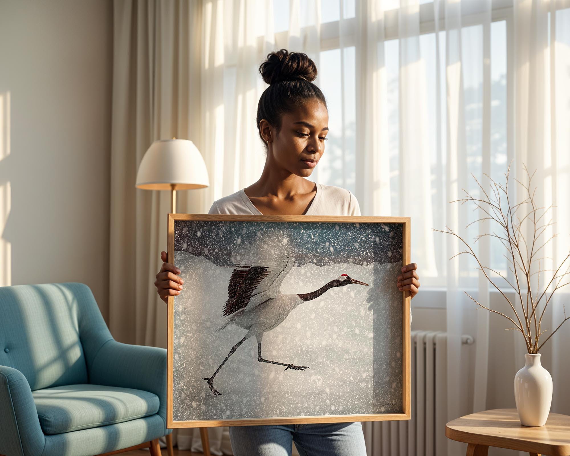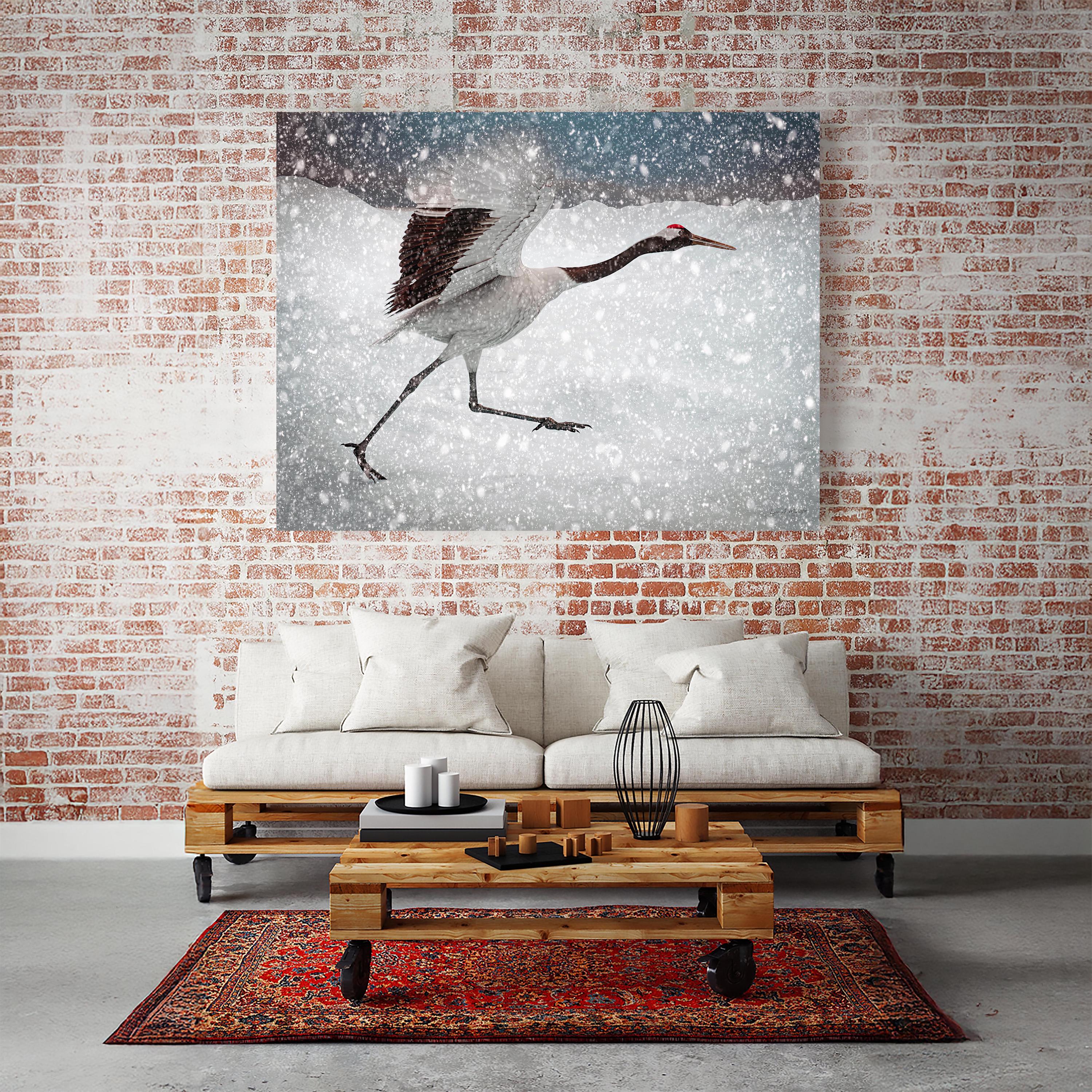 I created this piece to freeze the split second a crane outruns a snowstorm, wings lifting, legs flying, pure determination. The motion against winter’s white speaks to resilience and grace, a reminder to keep moving even when the world feels cold.