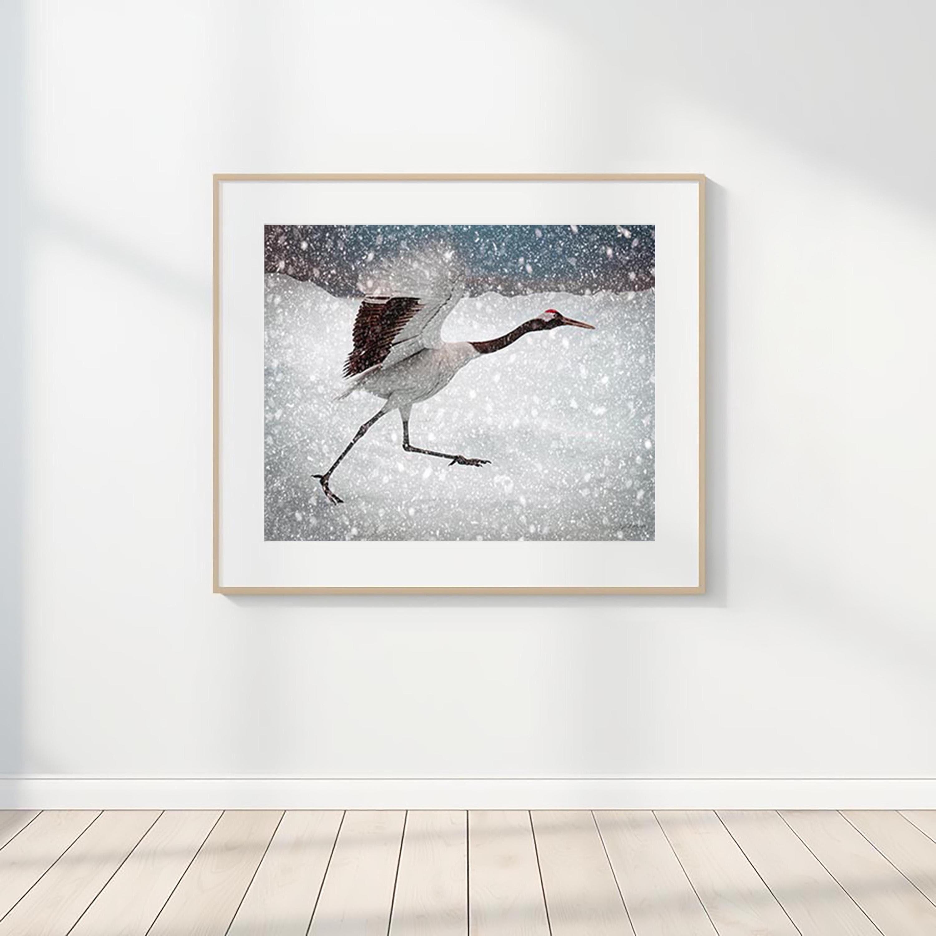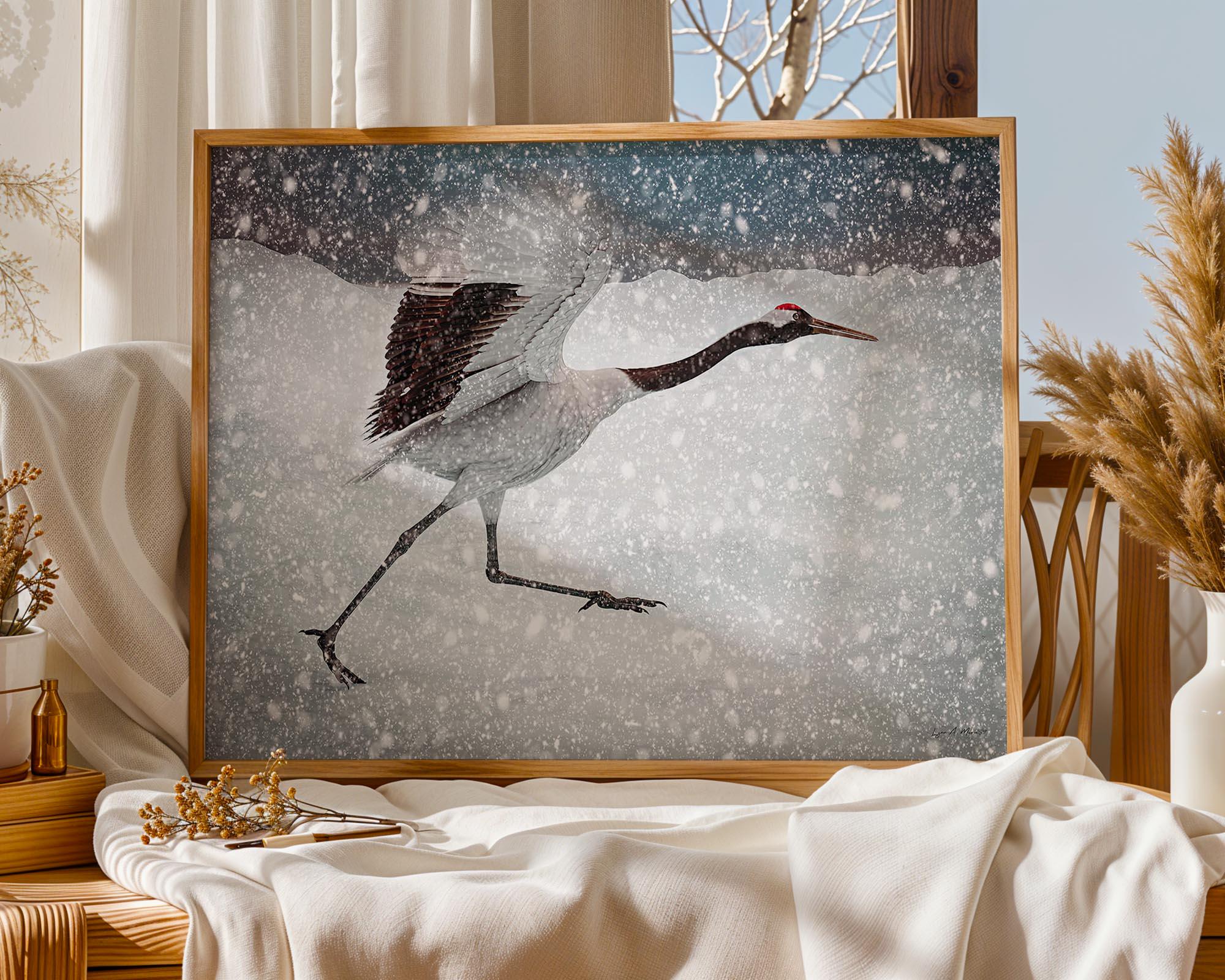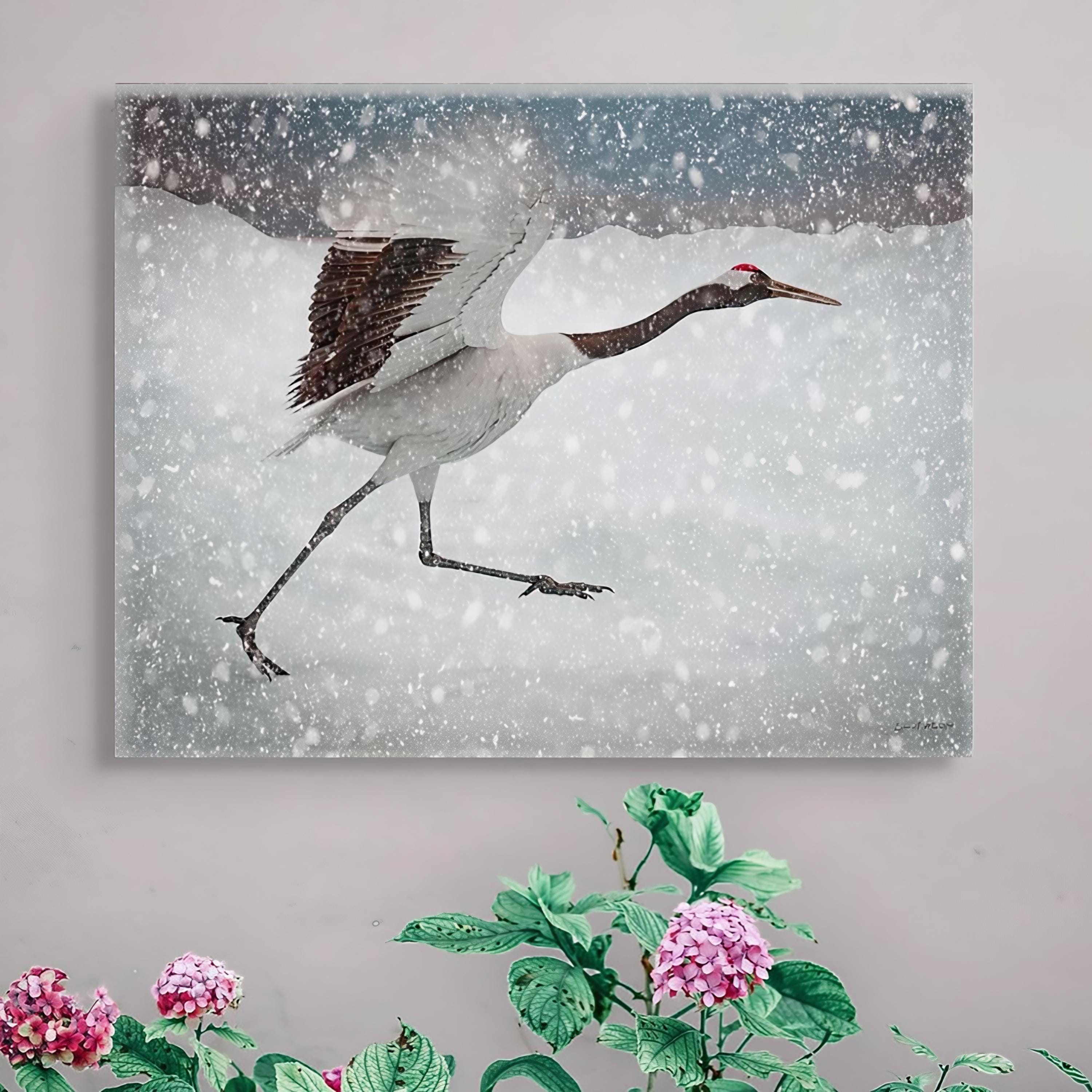 I created this bird lover art piece to freeze the split second a endangered Red Crowned crane outruns a snowstorm, wings lifting, legs flying, pure determination. The motion against winter’s white landscape speaks to resilience and grace, a reminder to keep moving even when the world feels cold.