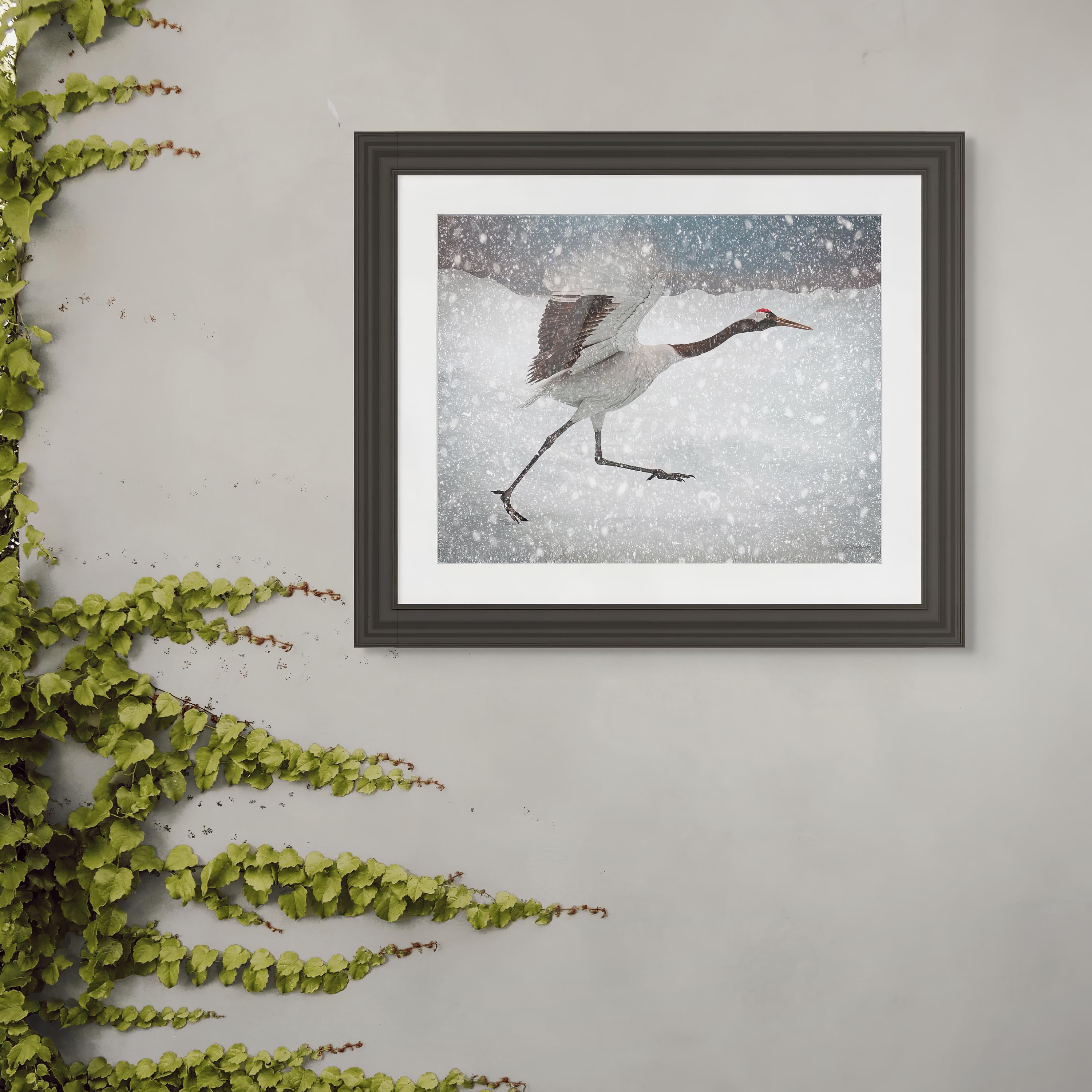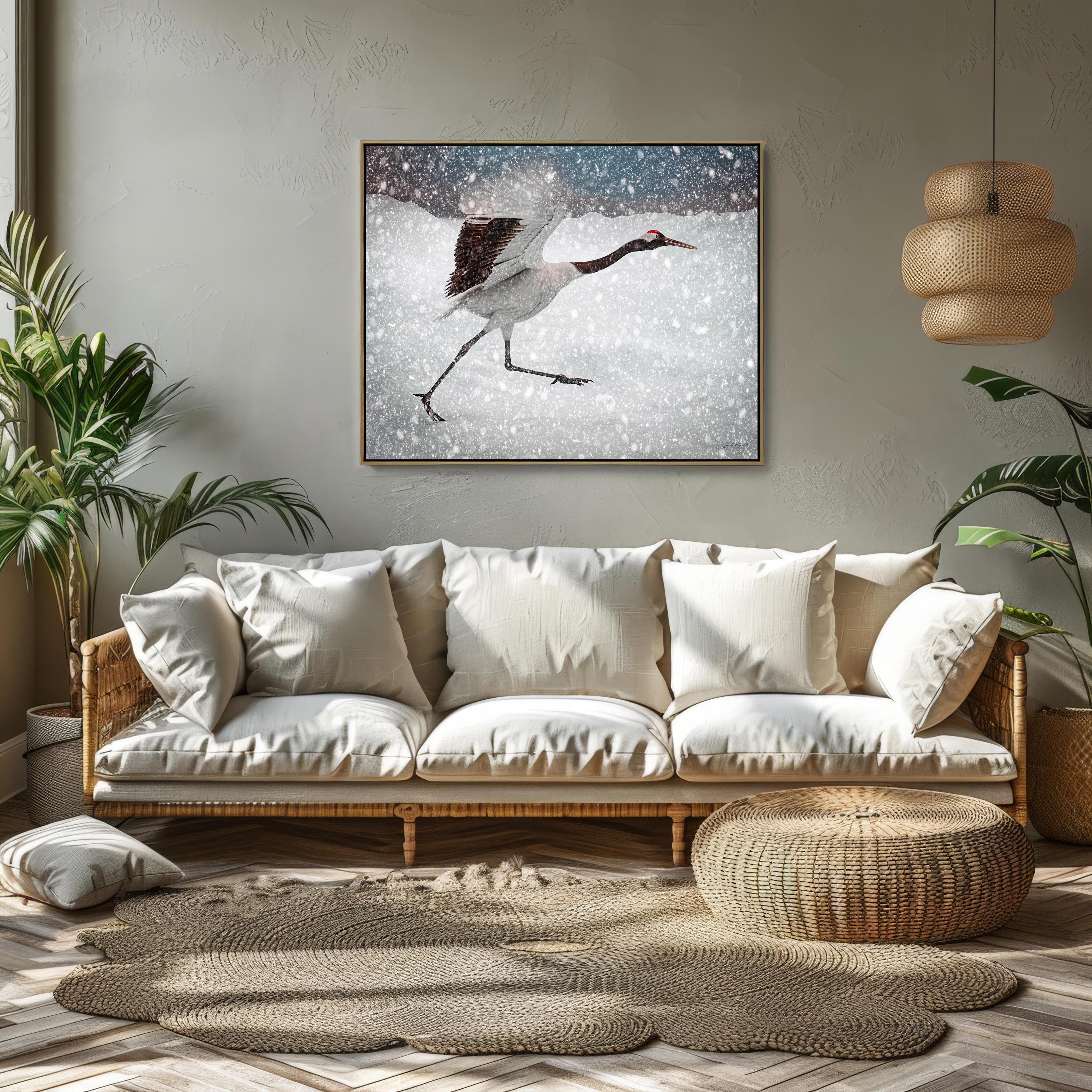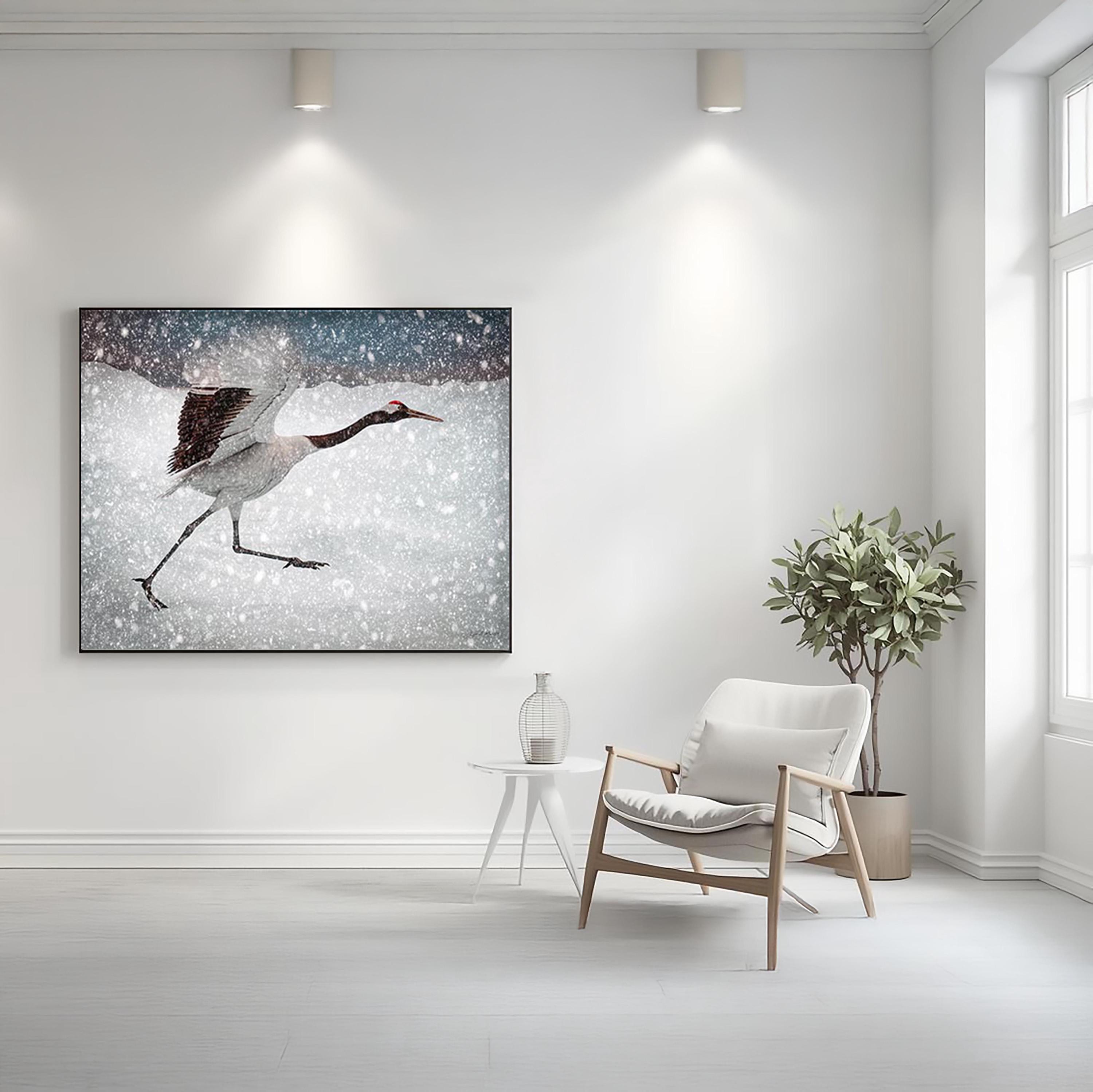 I created this bird lover art piece to freeze the split second a endangered Red Crowned crane outruns a snowstorm, wings lifting, legs flying, pure determination. The motion against winter’s white landscape speaks to resilience and grace, a reminder to keep moving even when the world feels cold.