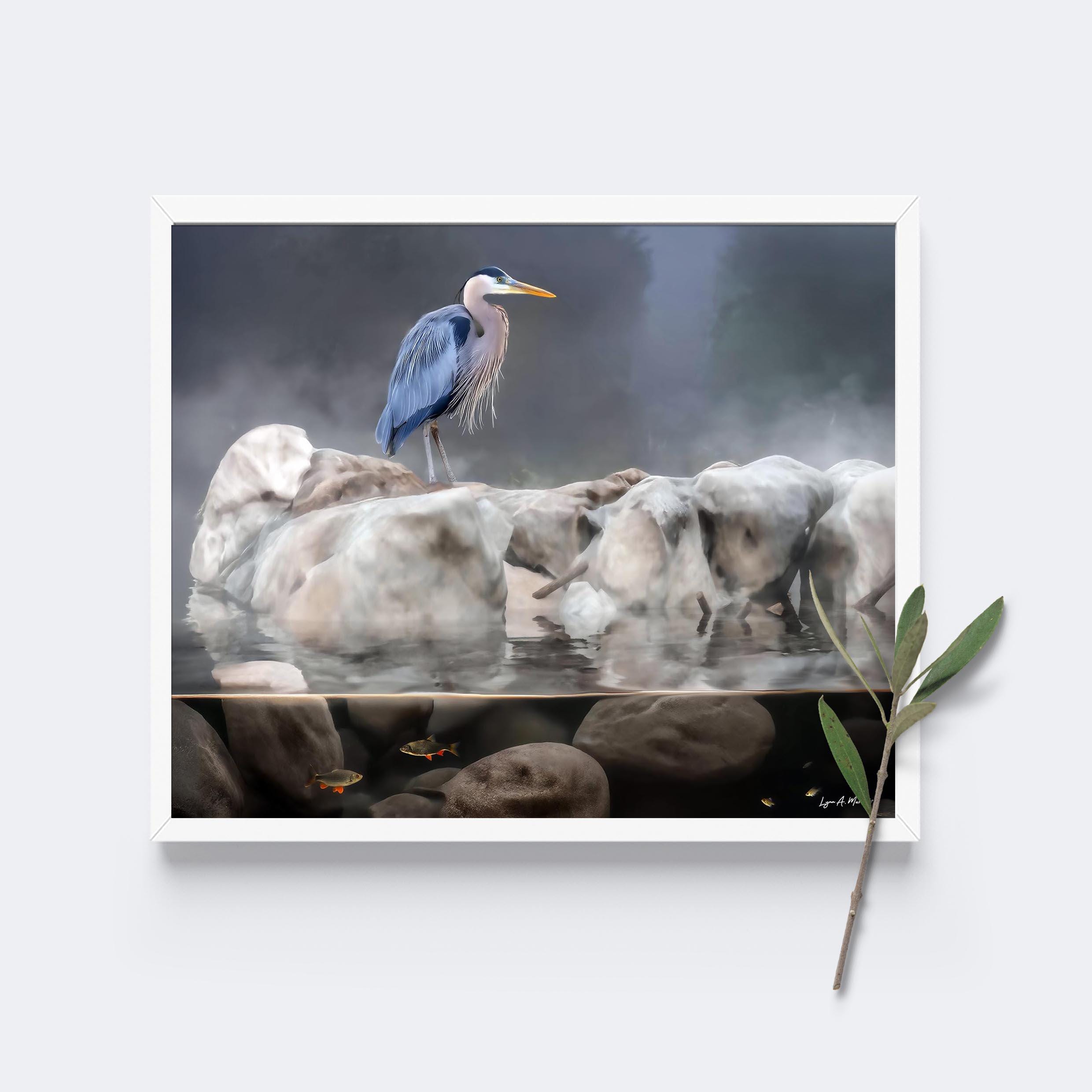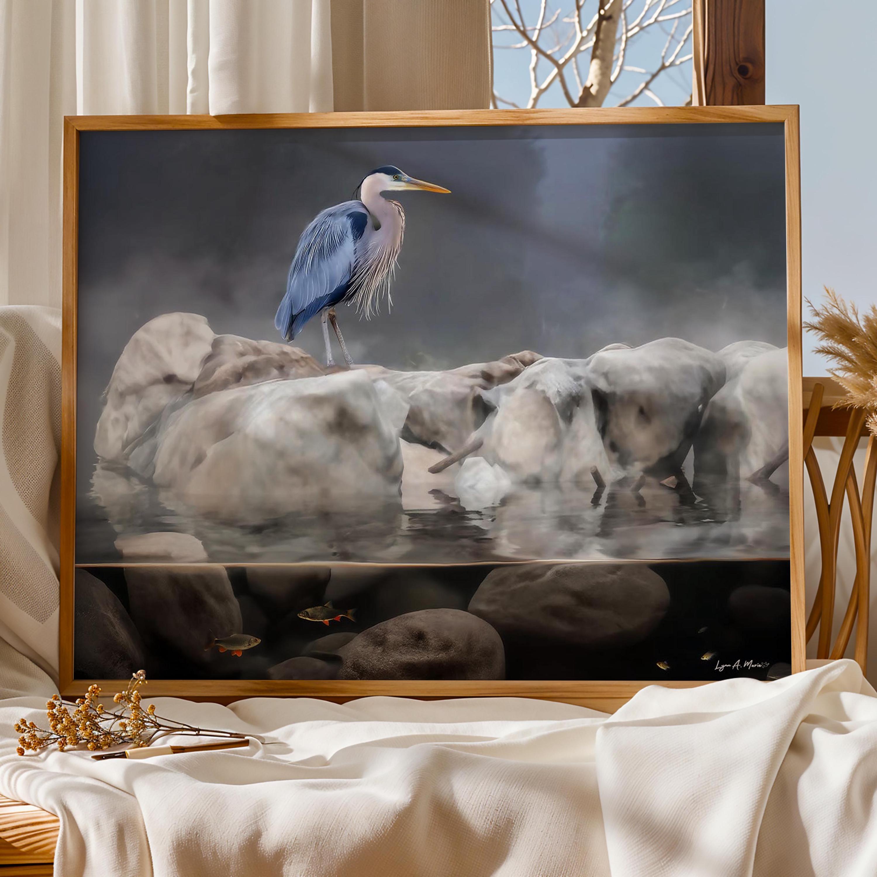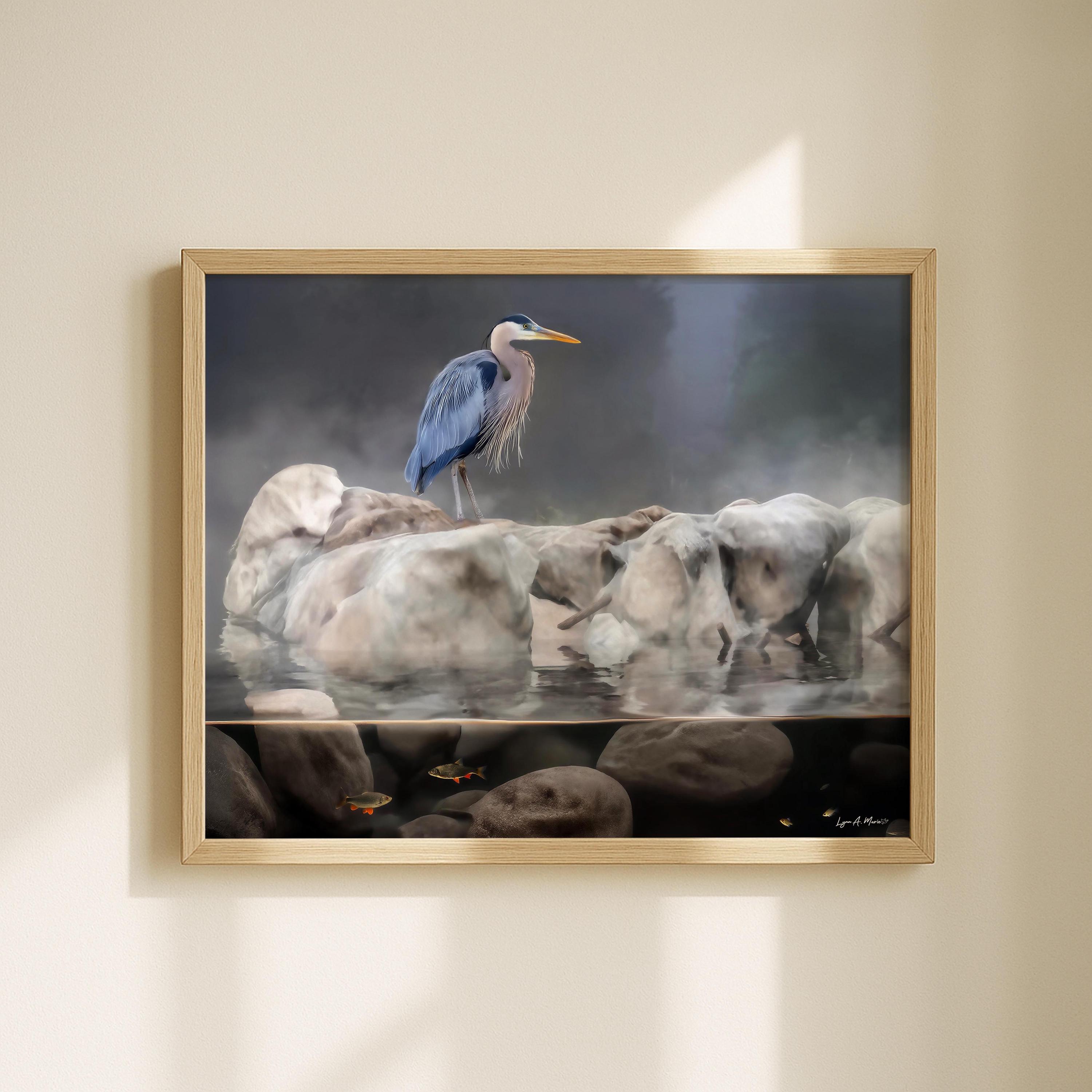 This blue heron artwork captures the quiet beauty of nature, featuring a graceful bird standing calmly above the water. Soft, natural tones highlight the heron’s elegance, making this piece a peaceful addition to any space.