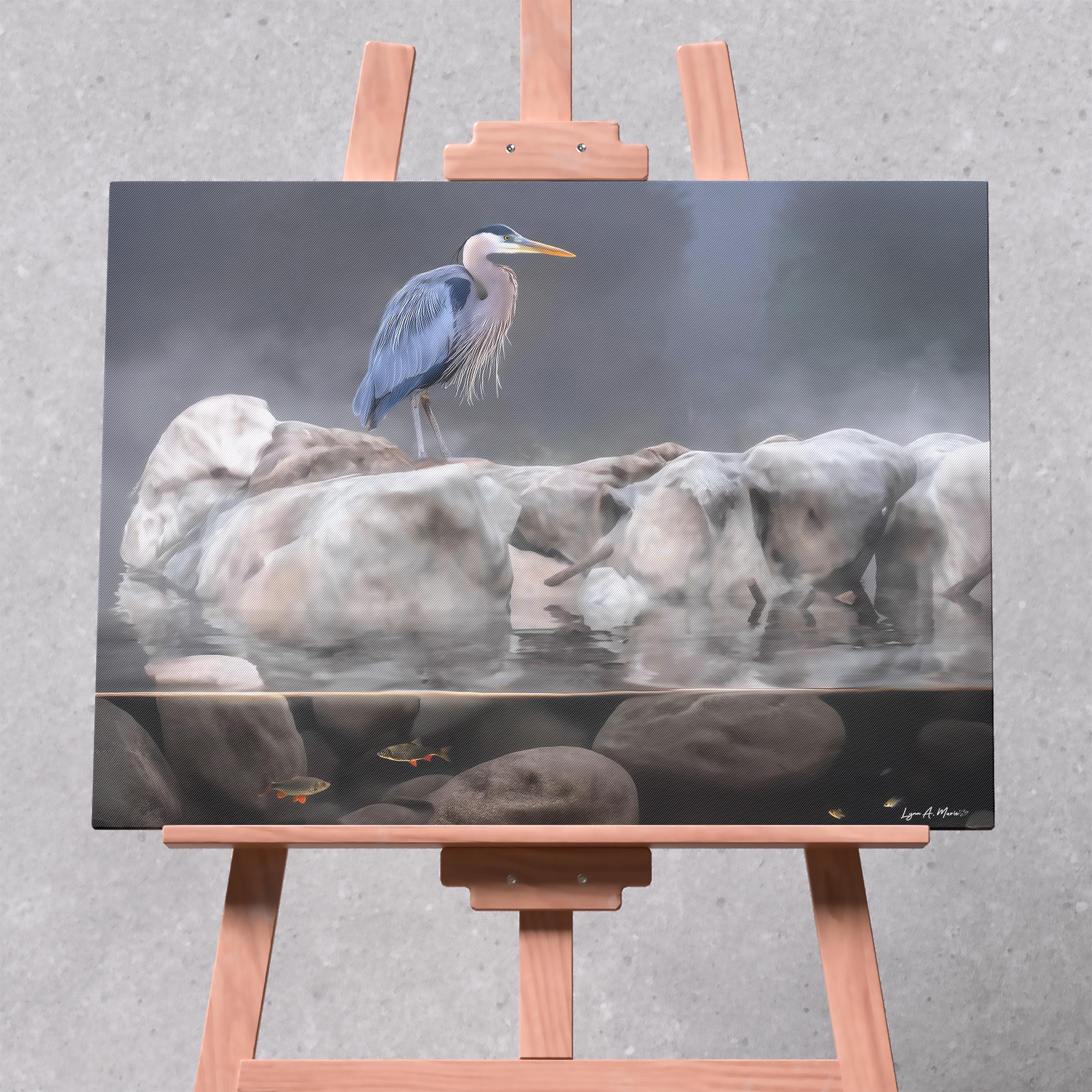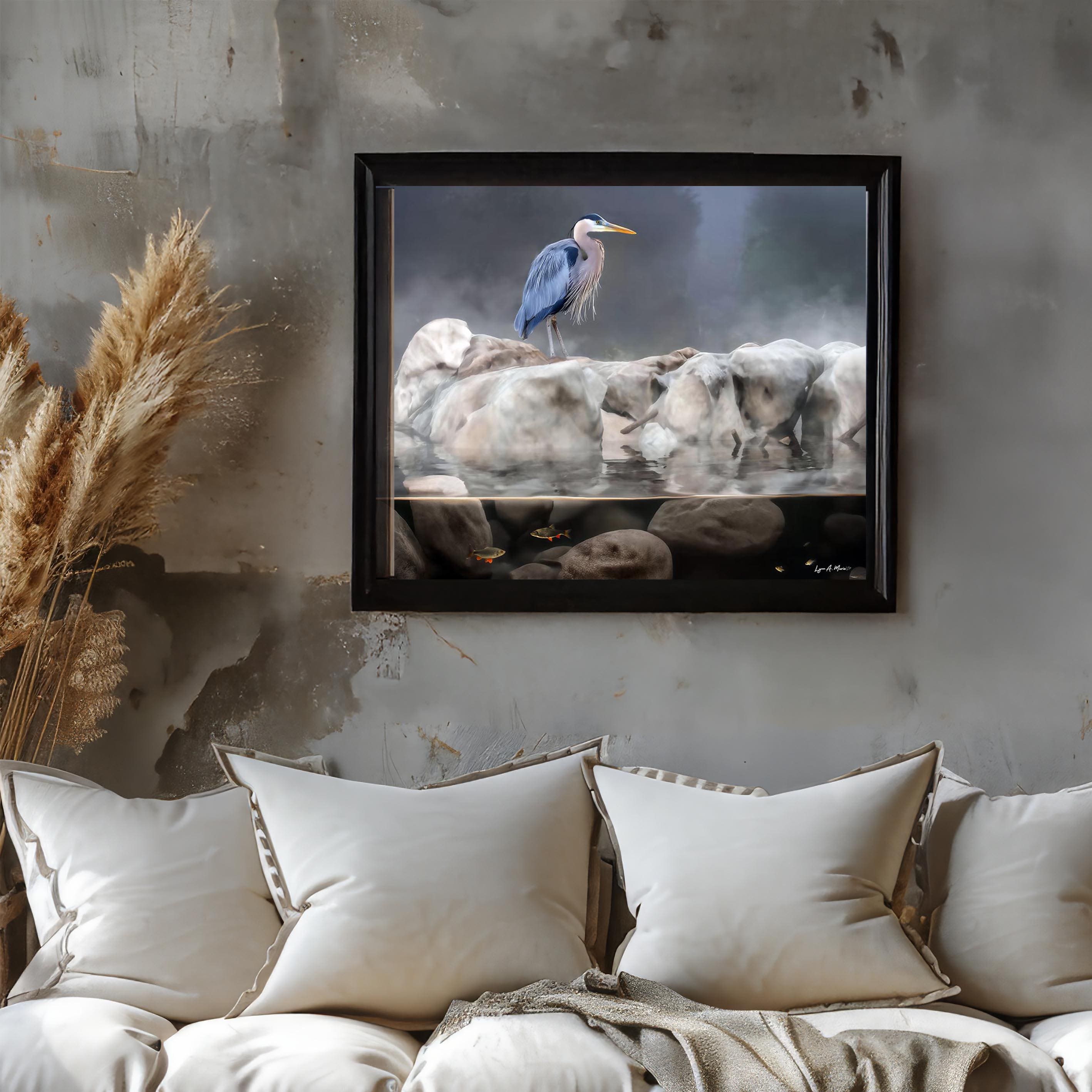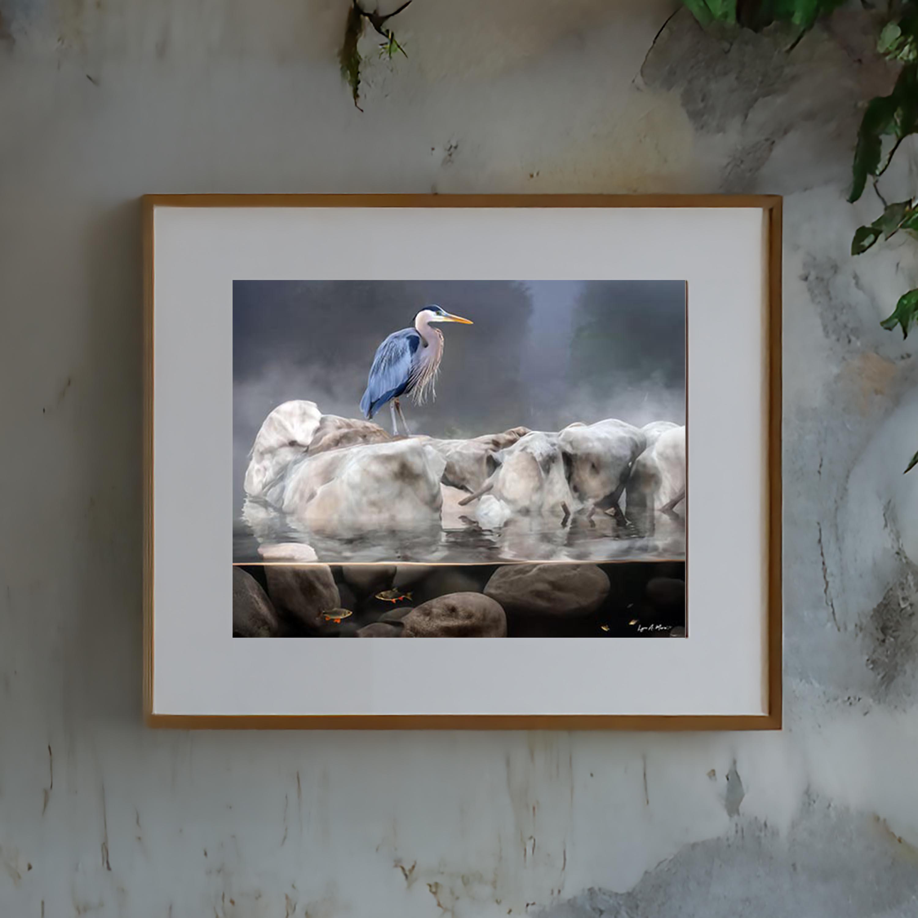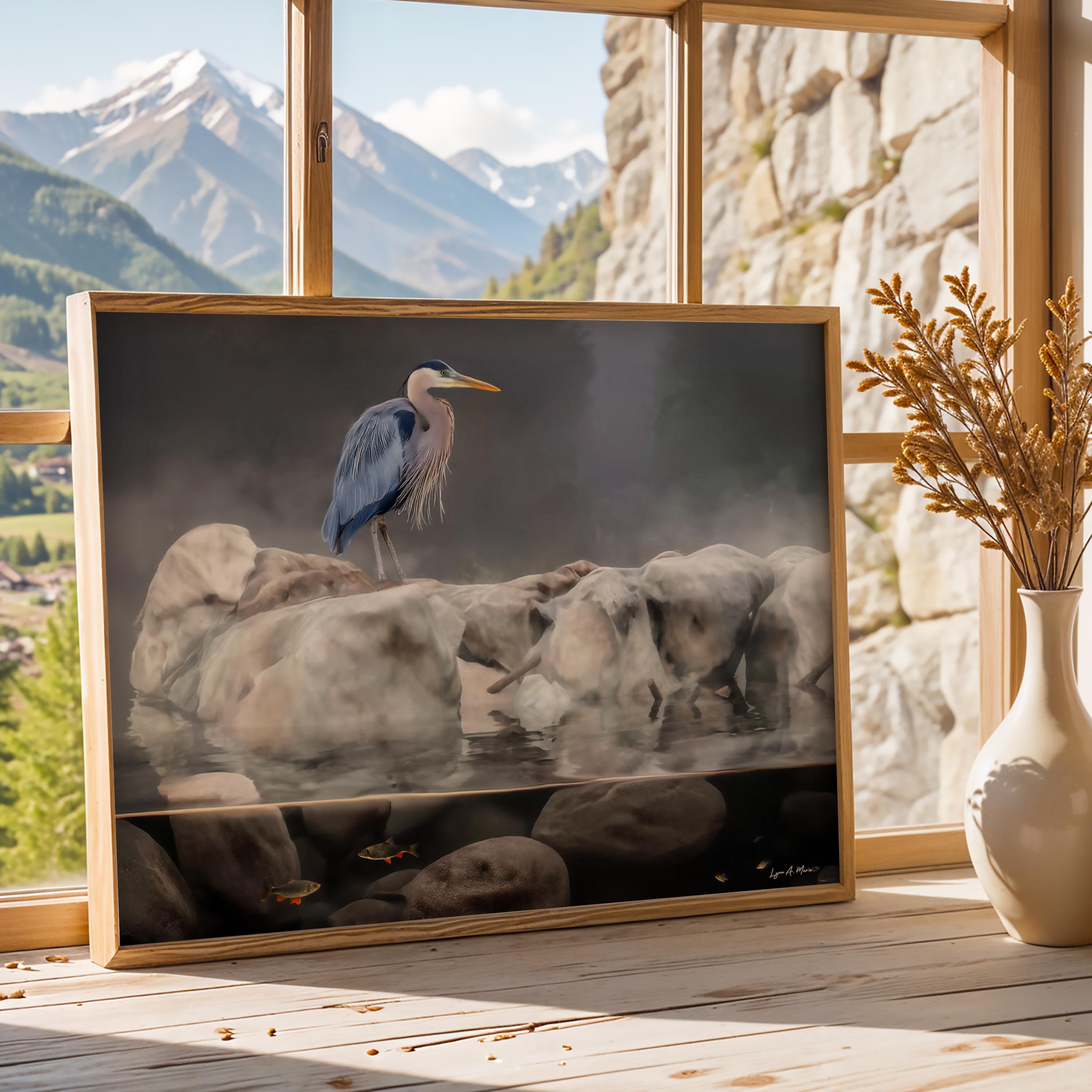This blue heron artwork captures the quiet beauty of nature, featuring a graceful bird standing calmly above the water. Soft, natural tones highlight the heron’s elegance, making this piece a peaceful addition to any space.