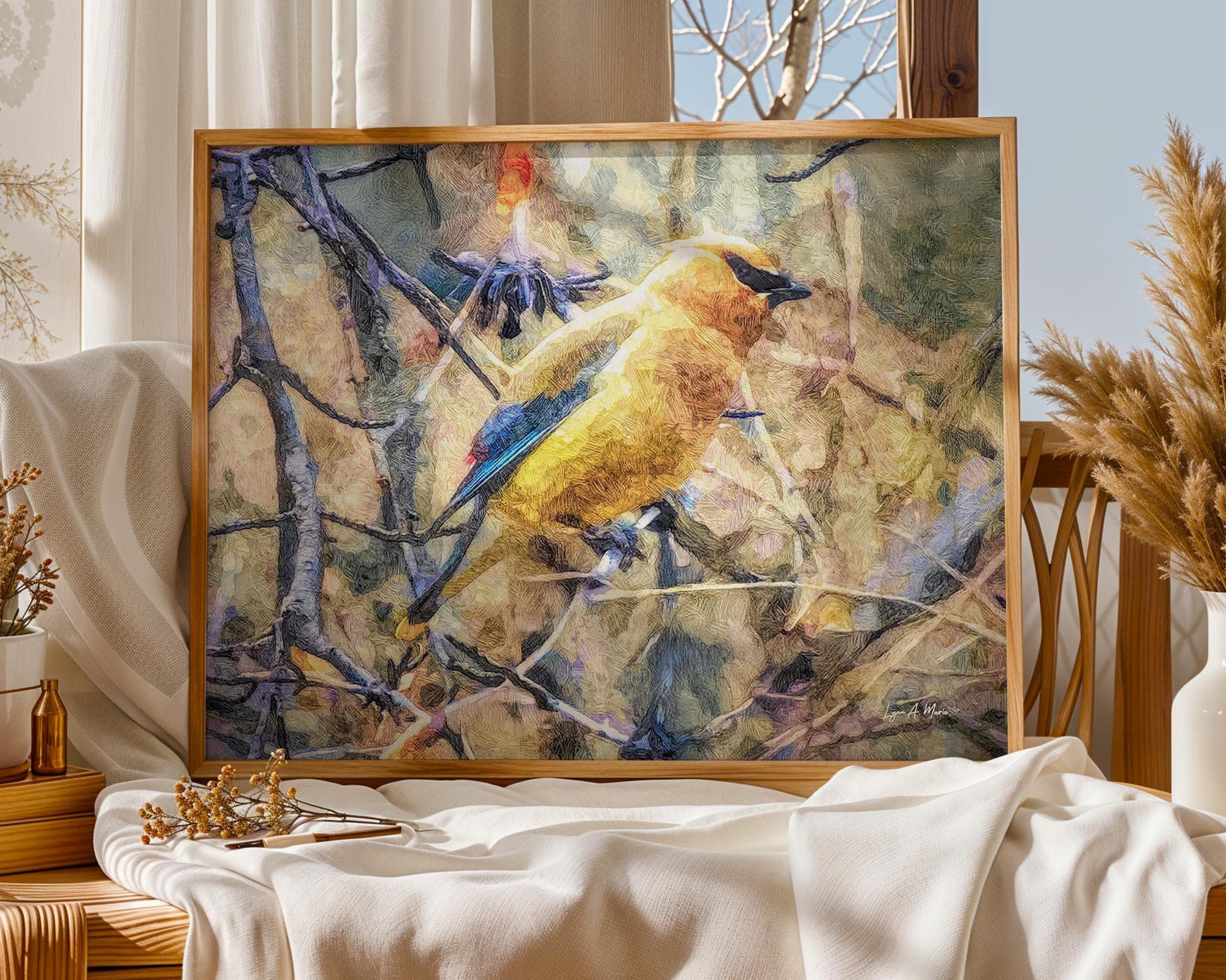 I created this cedar-waxwing piece to hold onto a small, quiet moment in the woods, the kind of calm that belongs in a livingroom or any cozy home. The songbird’s honey-gold body and sleek mask glowed against winter branches, and I wanted to display that elegant wildlife presence for fellow birds and birdwatcher admirers. This artwork is a signed, collectible print meant to double as warm decor and a thoughtful gift for the nature lover. It brings a gentle reminder of wild neighbors indoors, turning a fleeting encounter with a cedar-waxwing into an everyday pause of beauty.