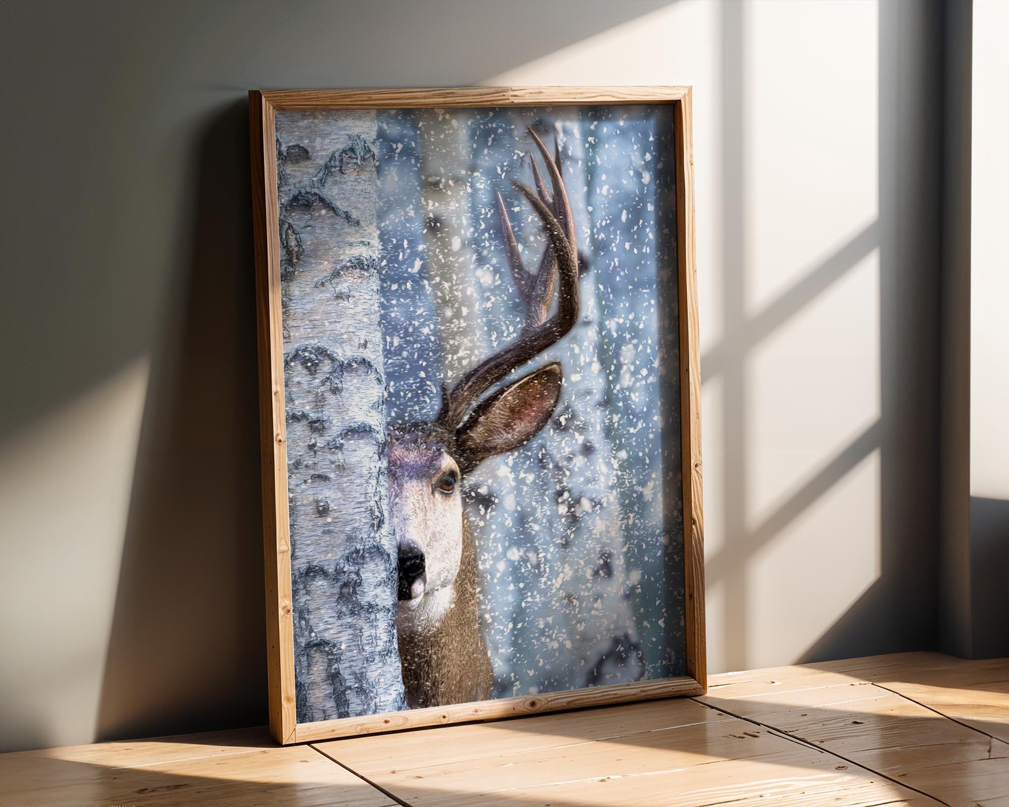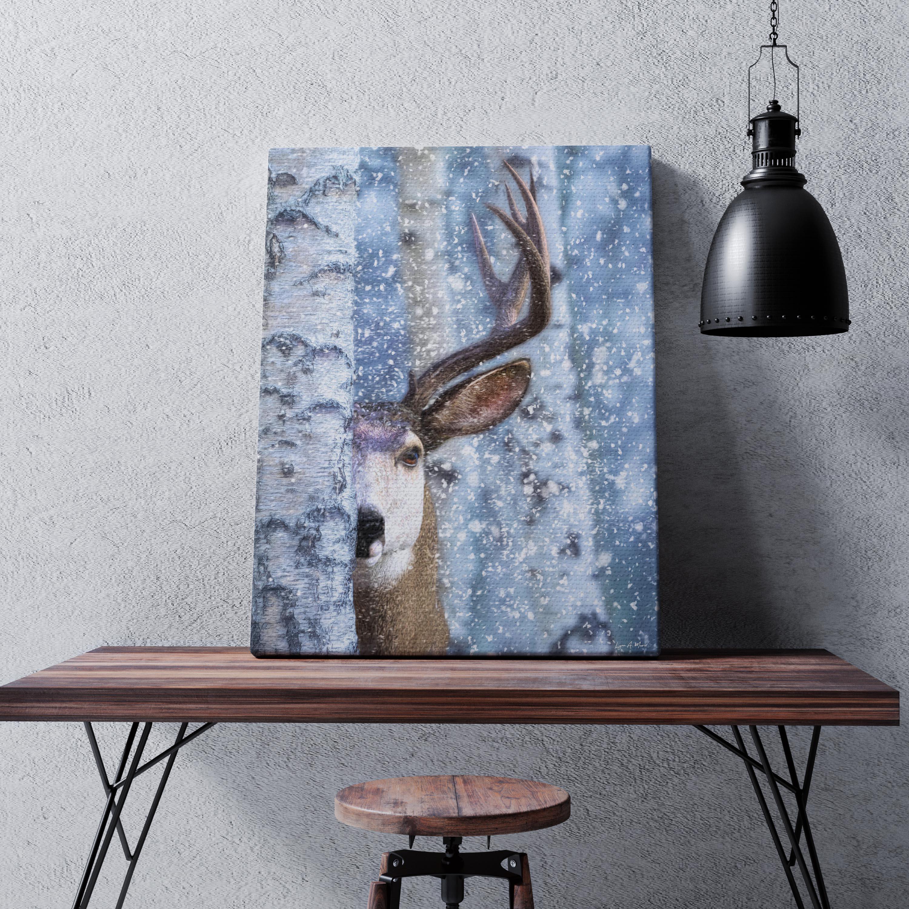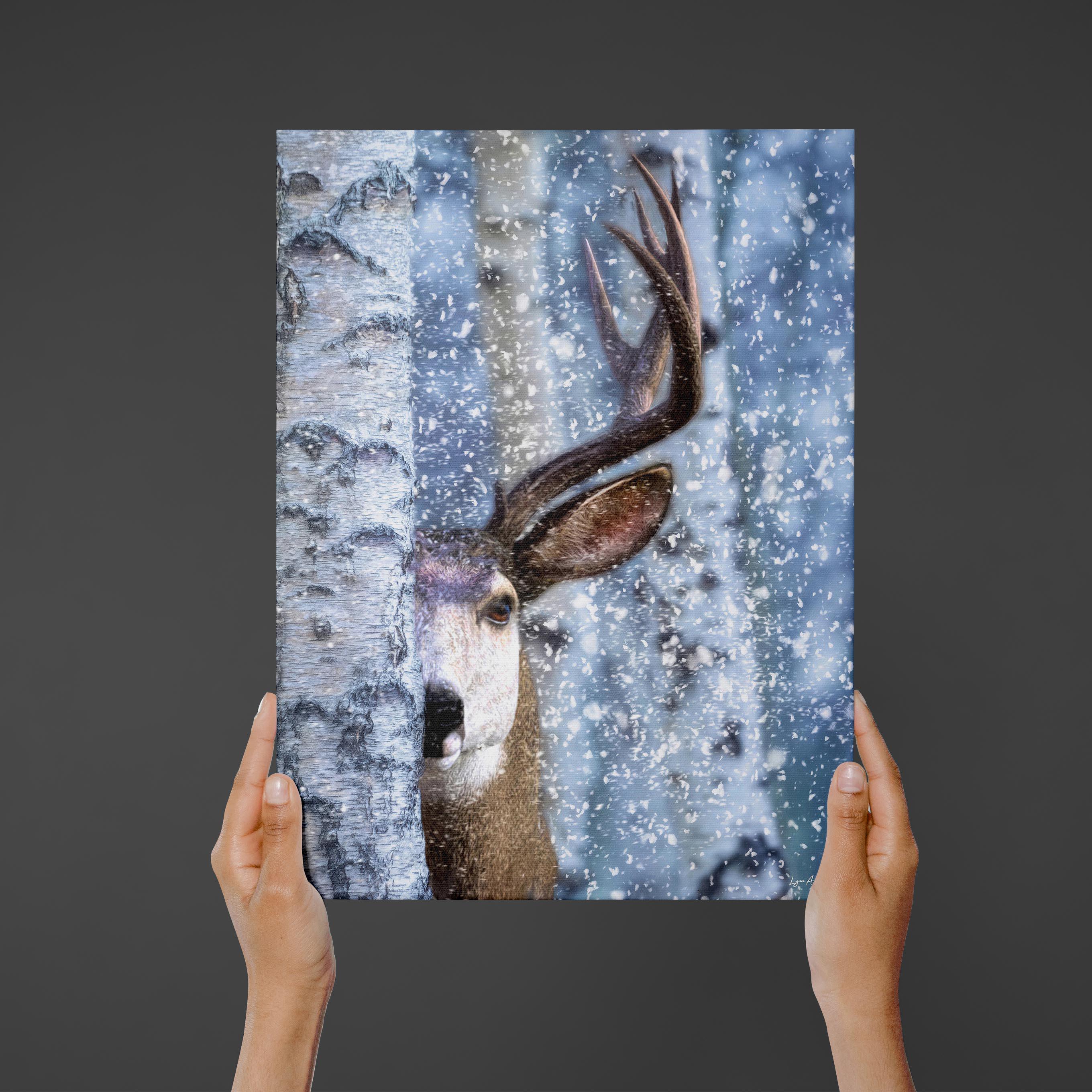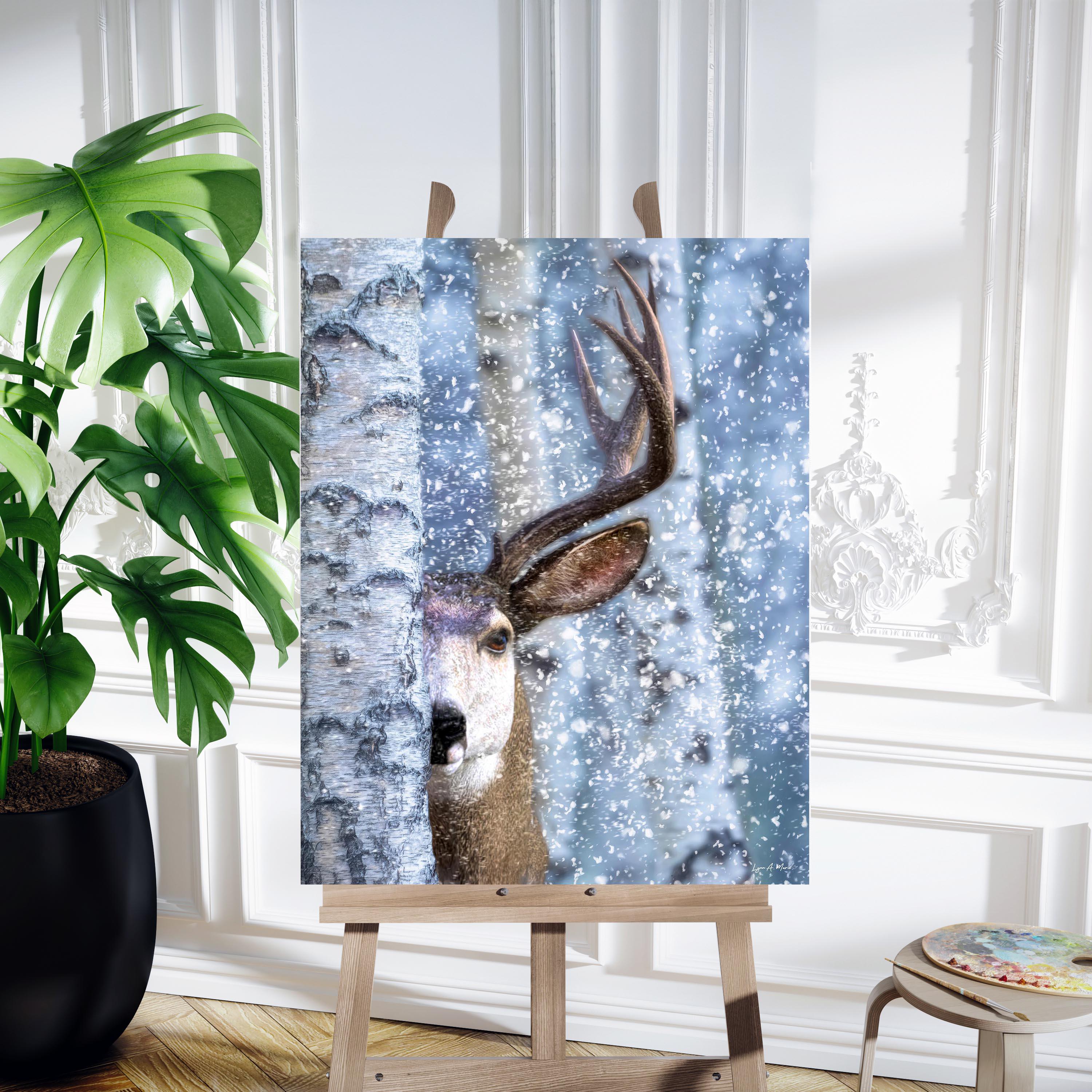 I made this piece to capture that playful, quiet second when a mule deer buck peeks over a birch tree as the snow comes down. The soft flakes, rough bark, and warm fur let me show winter’s calm and curiosity, like a glimpse you’d catch from a cabin window and want to hold onto.