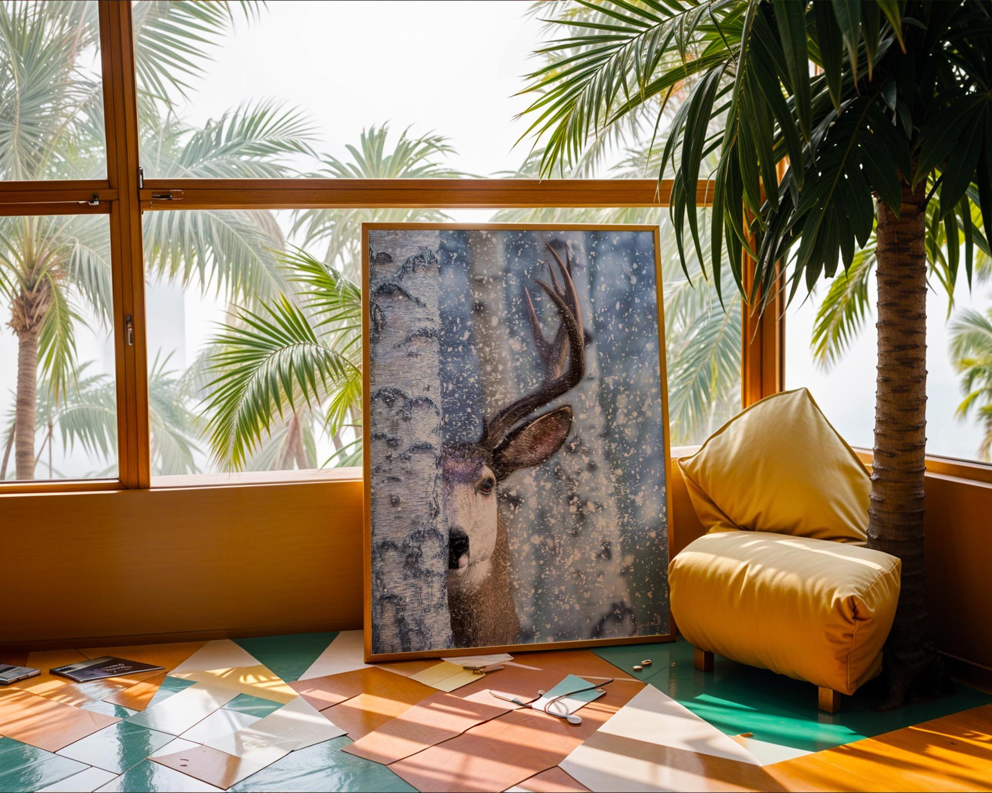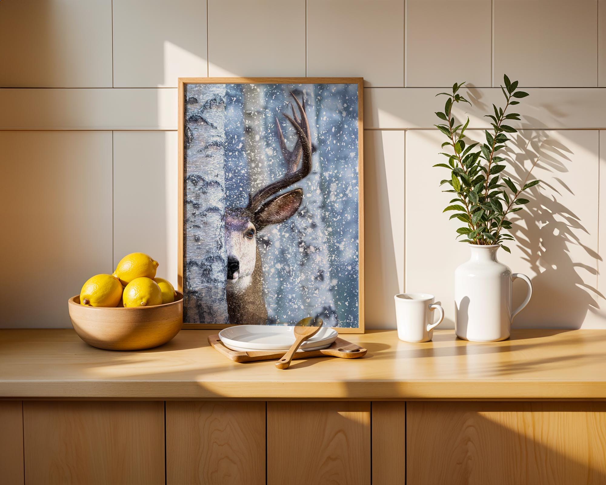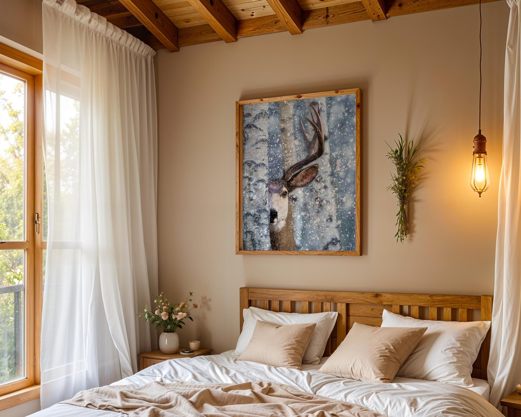 I made this piece to capture that playful, quiet second when a mule deer buck peeks over a birch tree as the snow comes down. The soft flakes, rough bark, and warm fur let me show winter’s calm and curiosity, like a glimpse you’d catch from a cabin window and want to hold onto.