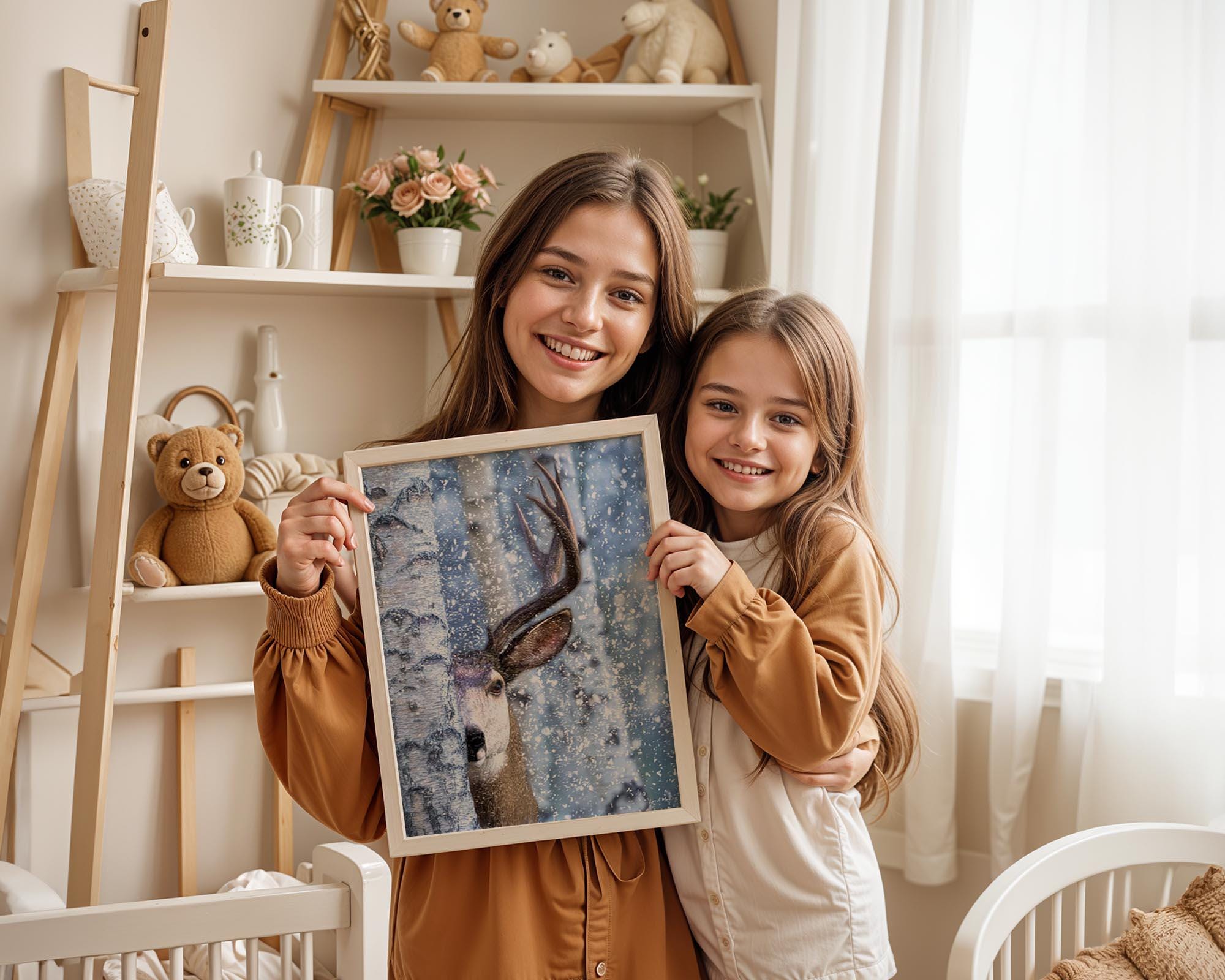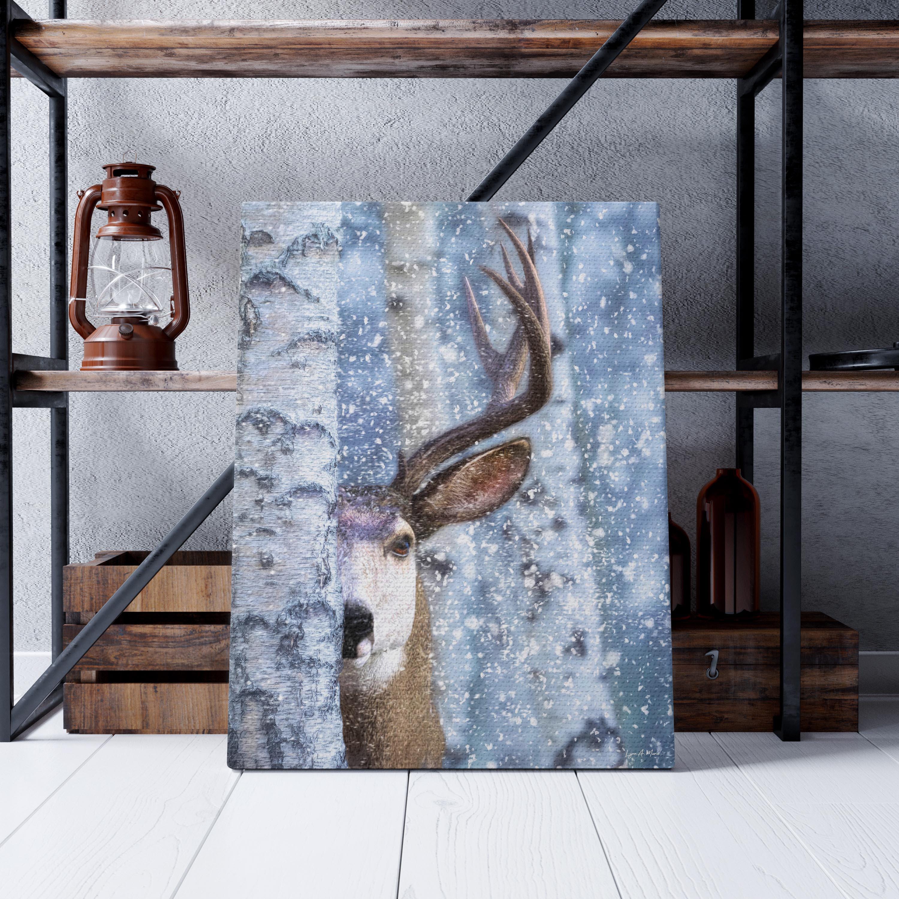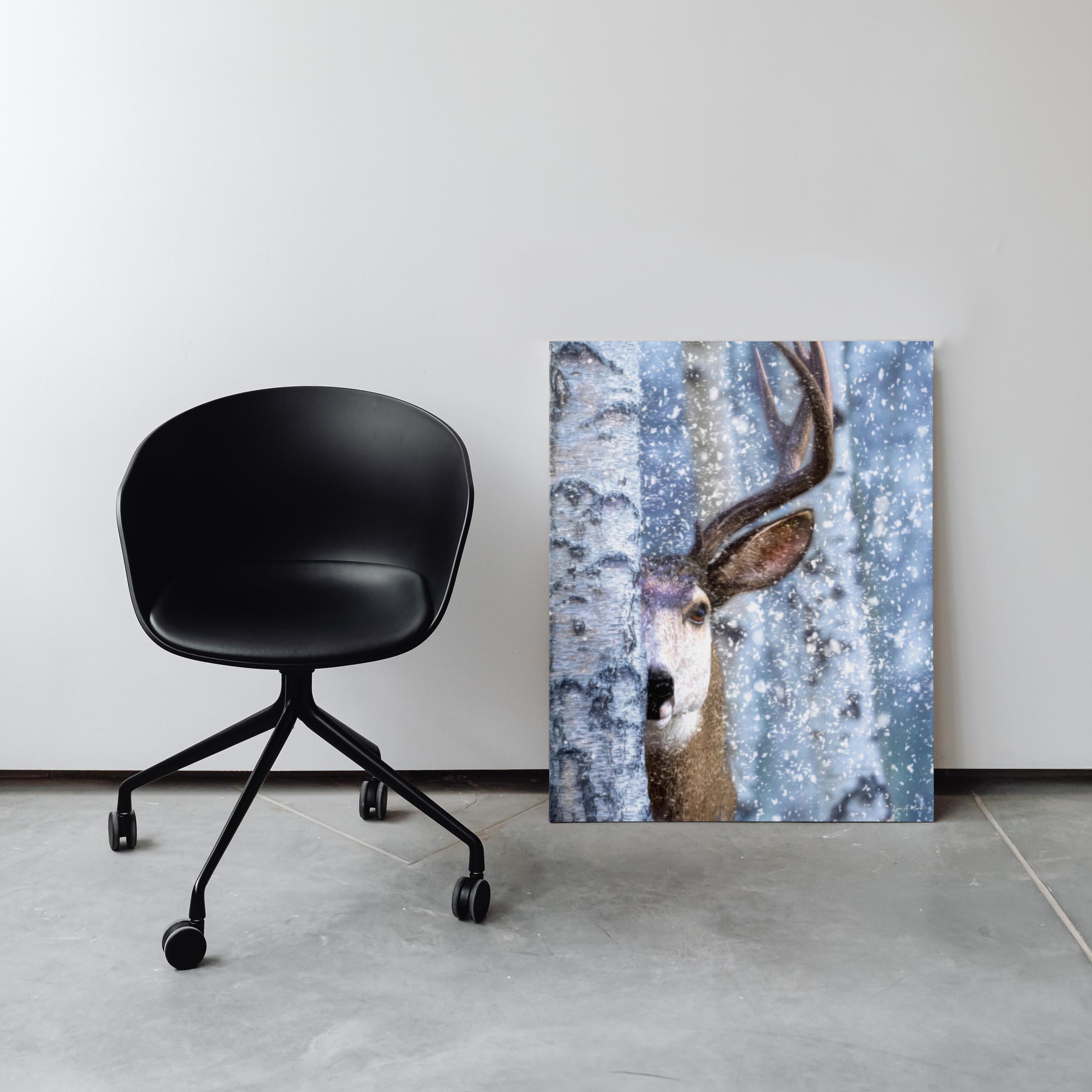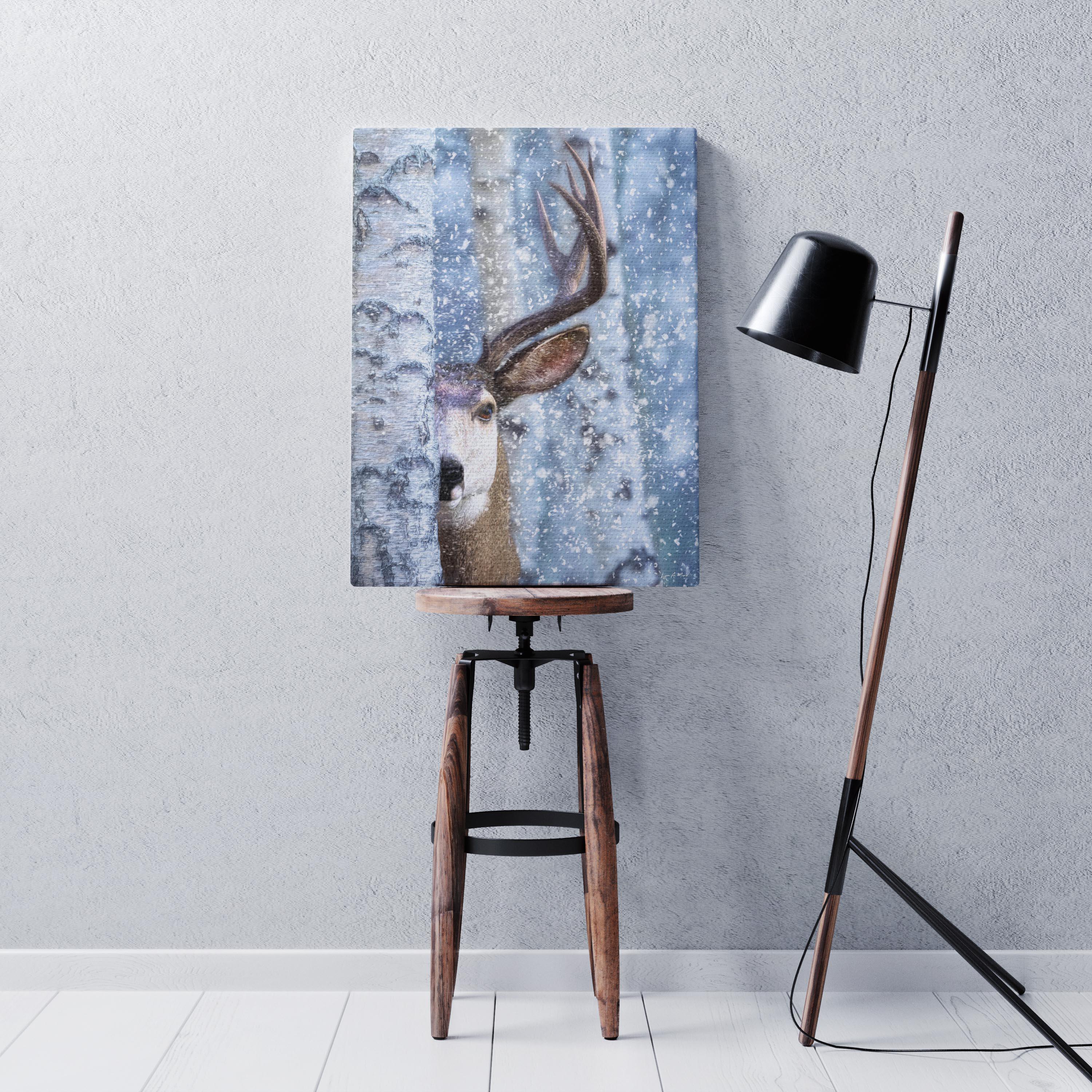 I made this piece to capture that playful, quiet second when a mule deer buck peeks over a birch tree as the snow comes down. The soft flakes, rough bark, and warm fur let me show winter’s calm and curiosity, like a glimpse you’d catch from a cabin window and want to hold onto.
