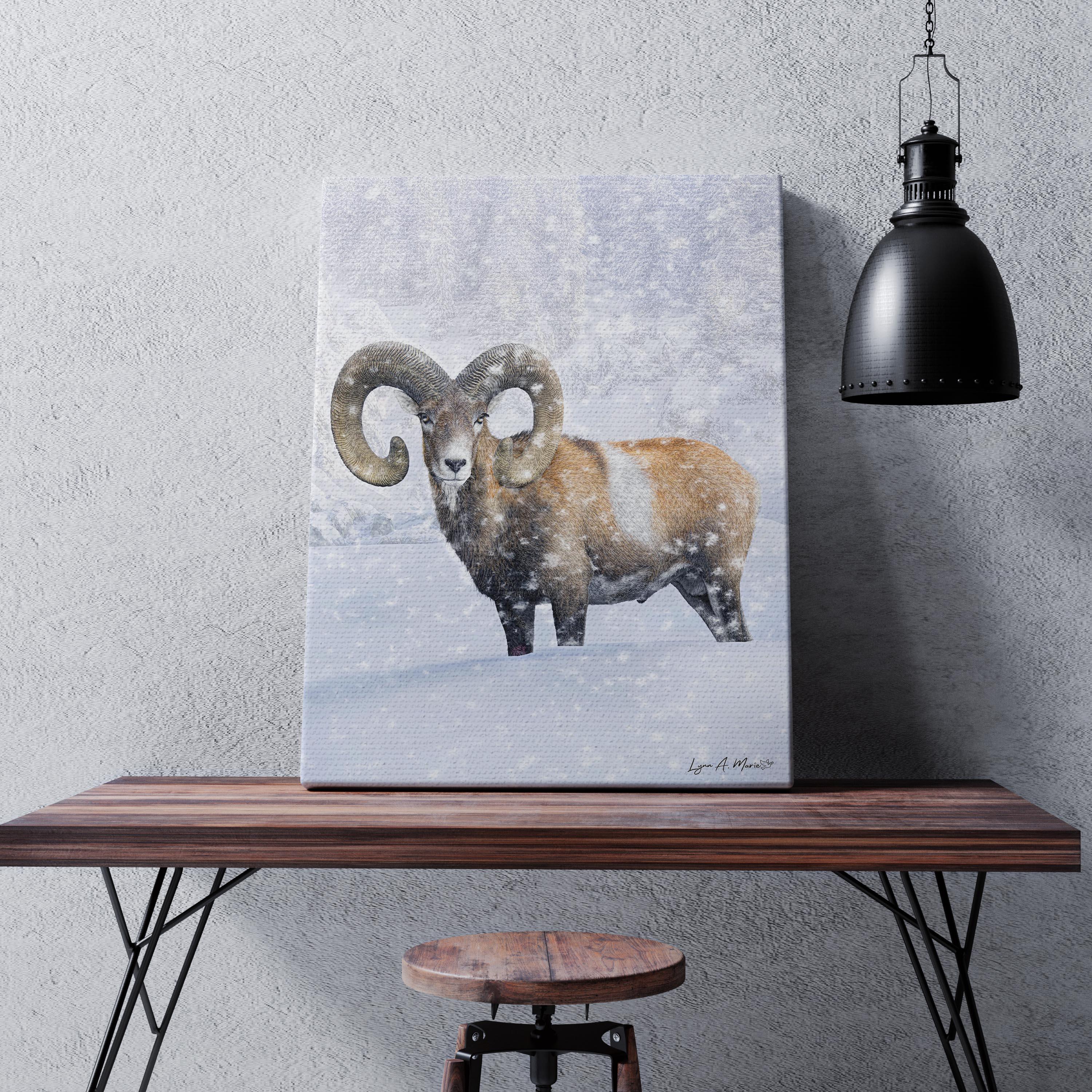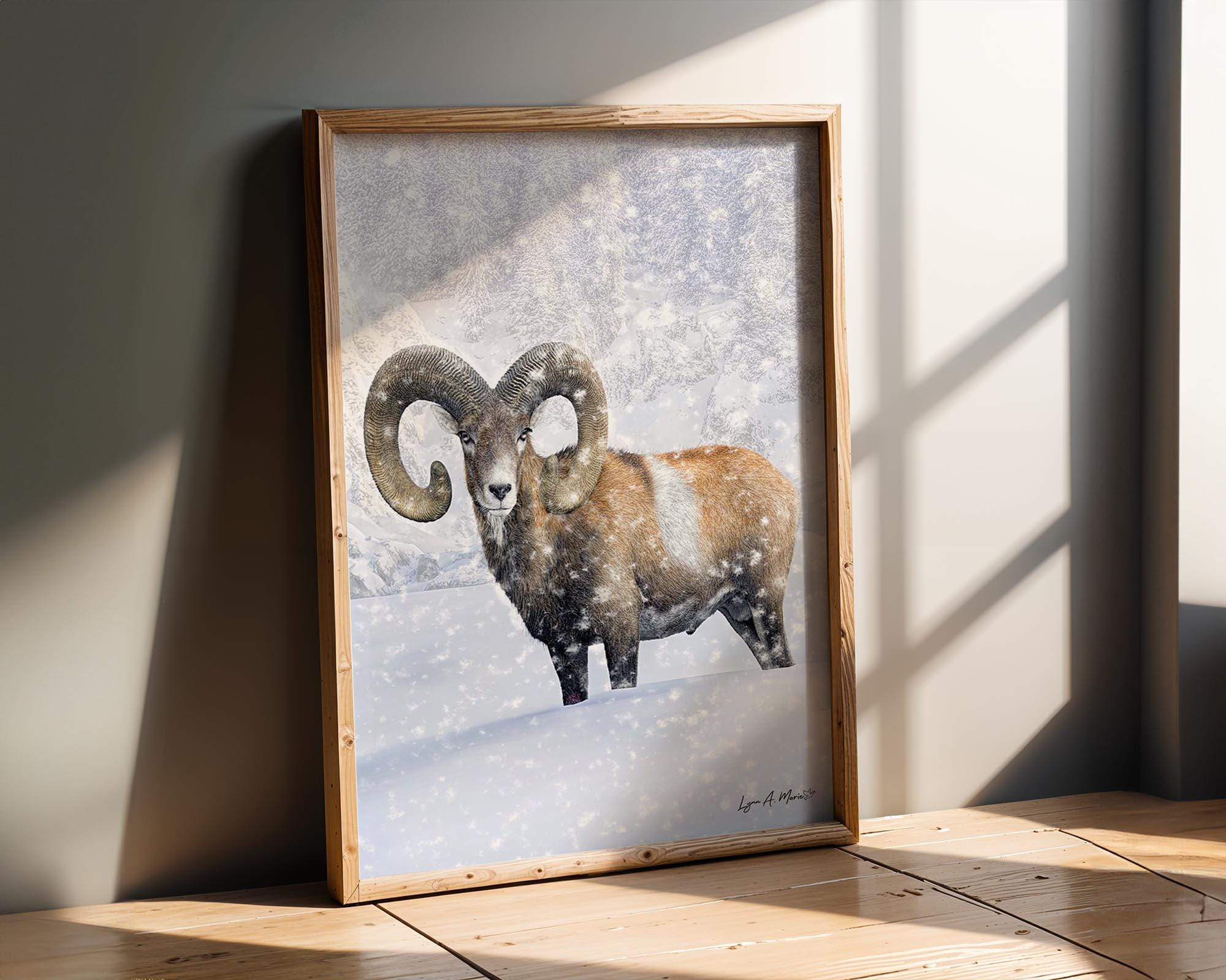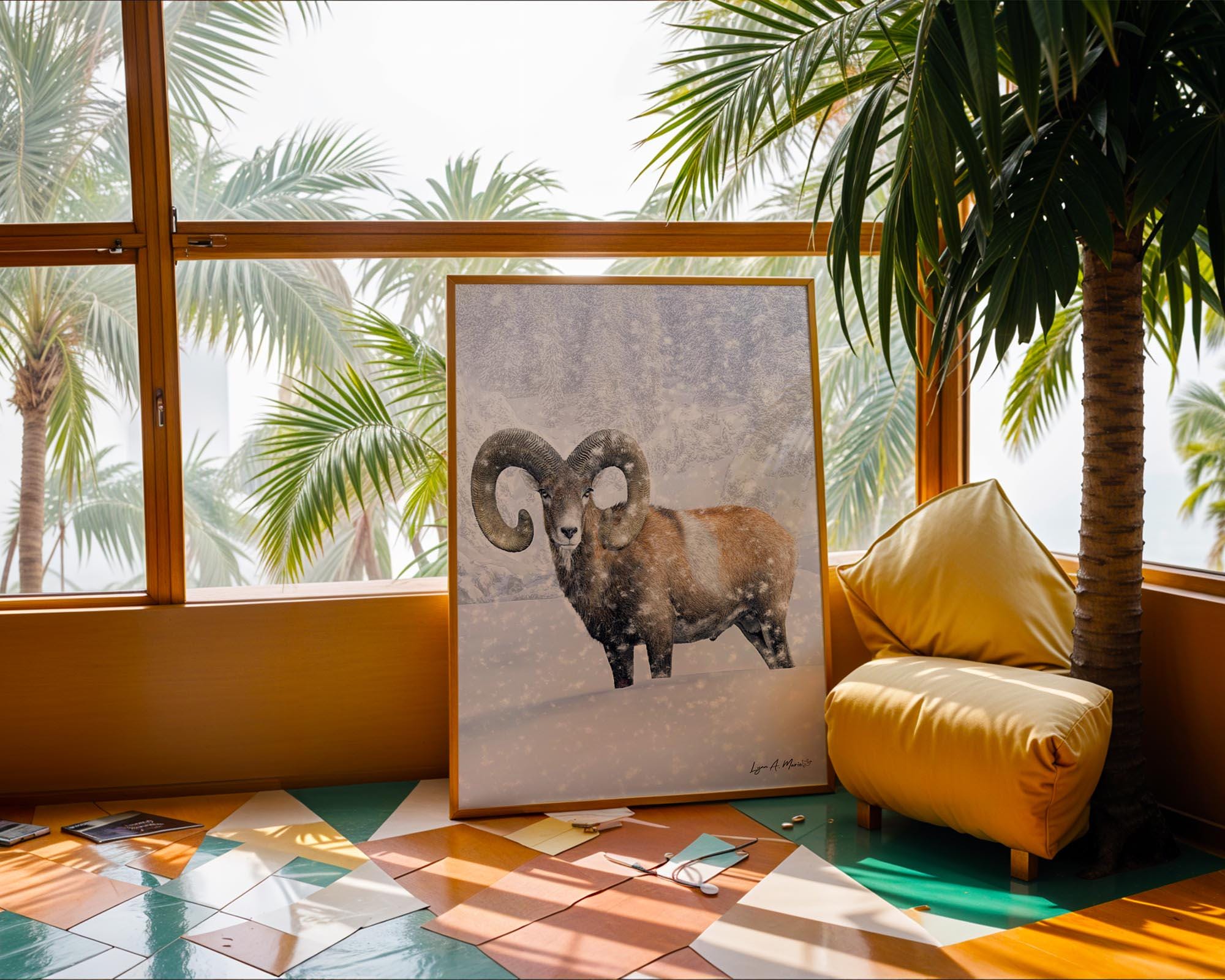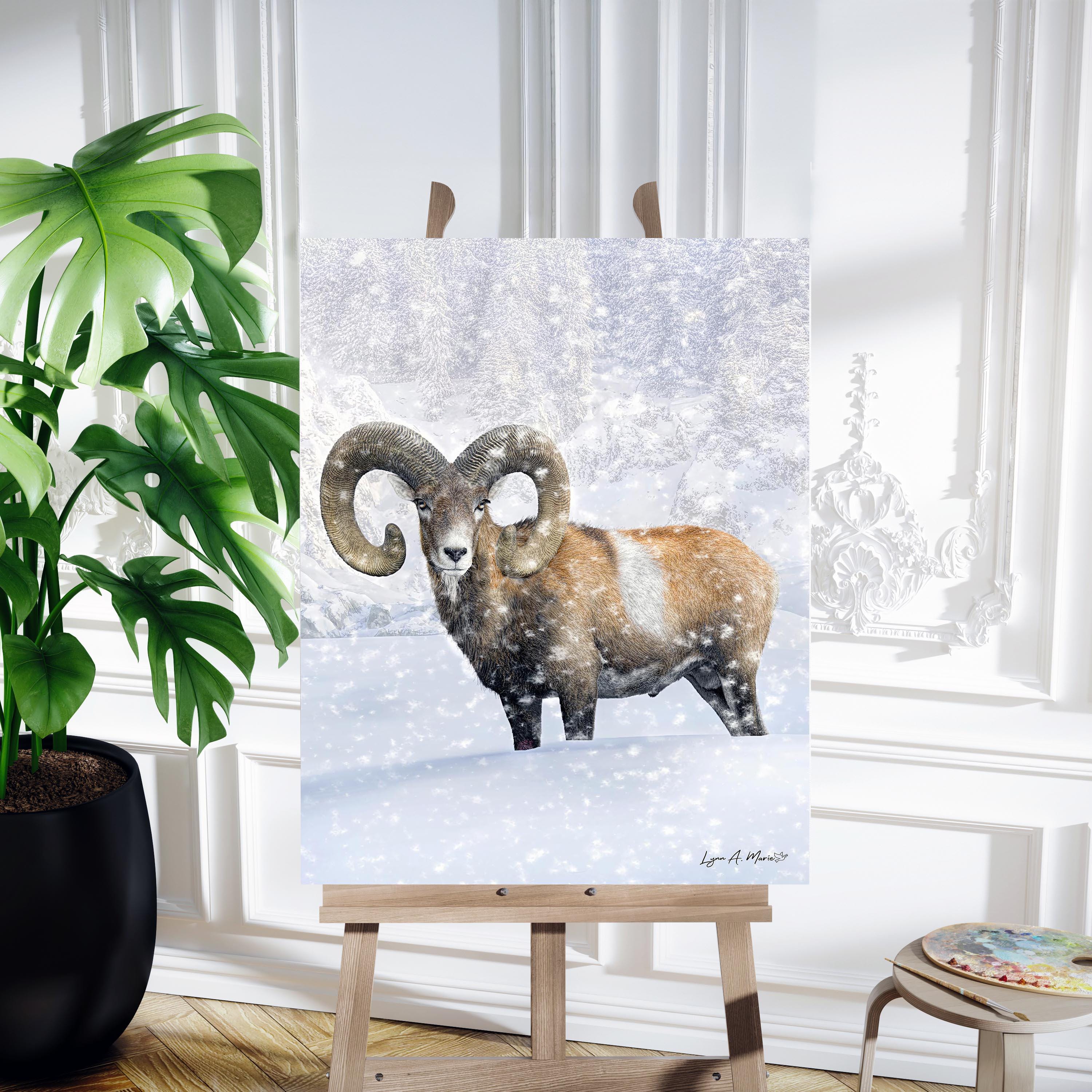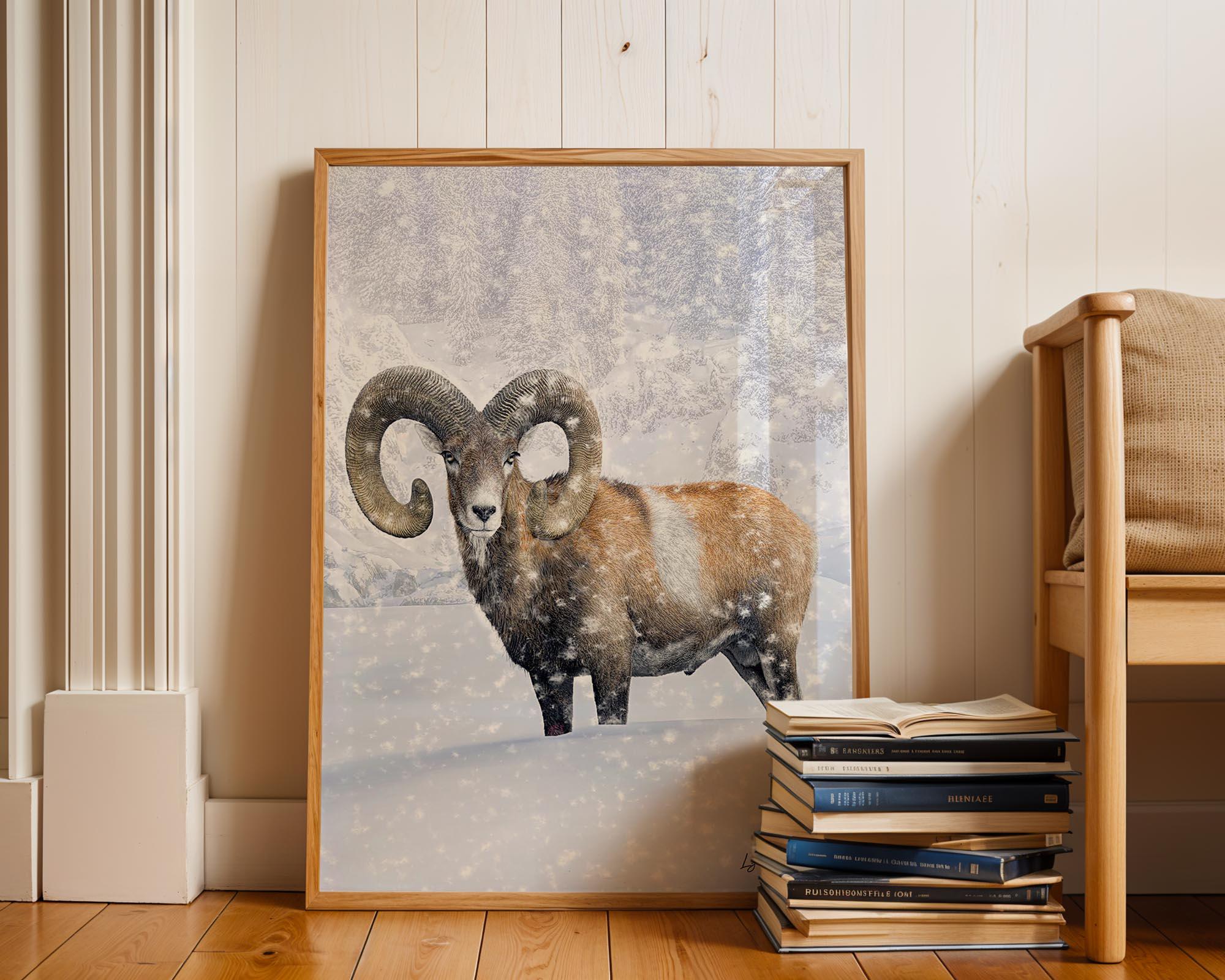 I created this piece to honor the ram’s power and calm in harsh winter. The sweeping horns and quiet stance show resilience, while the falling snow adds a sense of solitude and wilderness. It’s a tribute to strength, survival, and the wild beauty of the mountains.