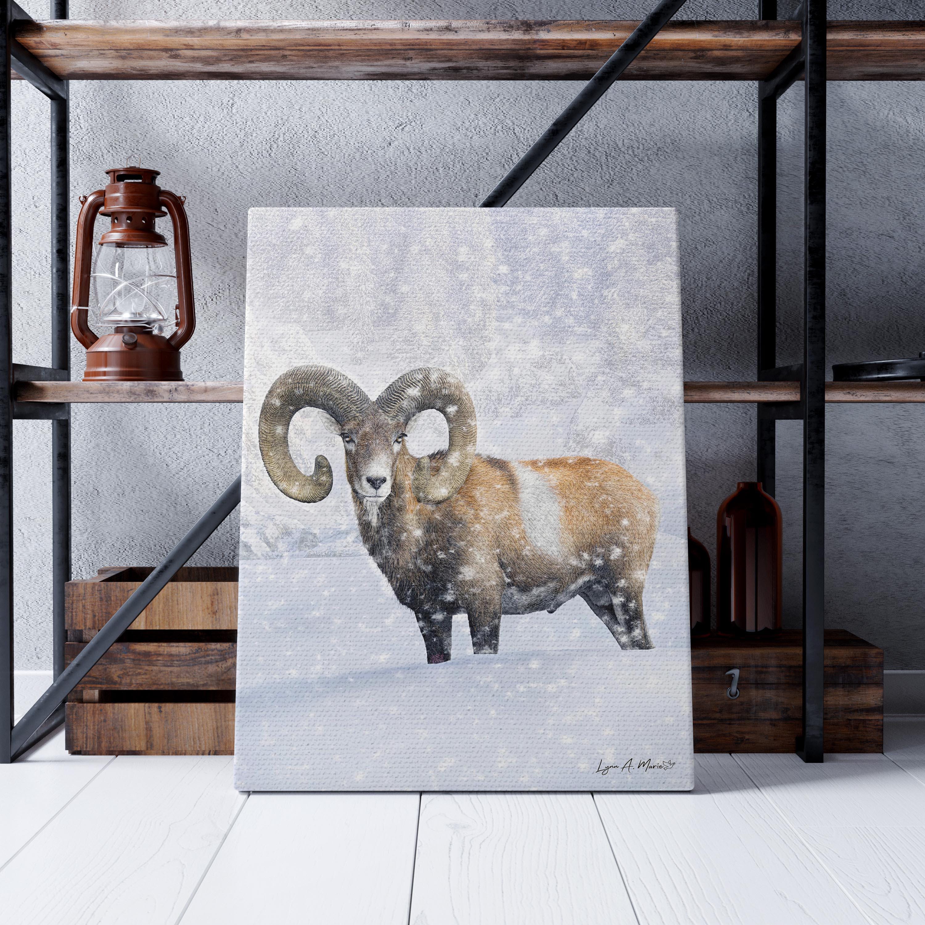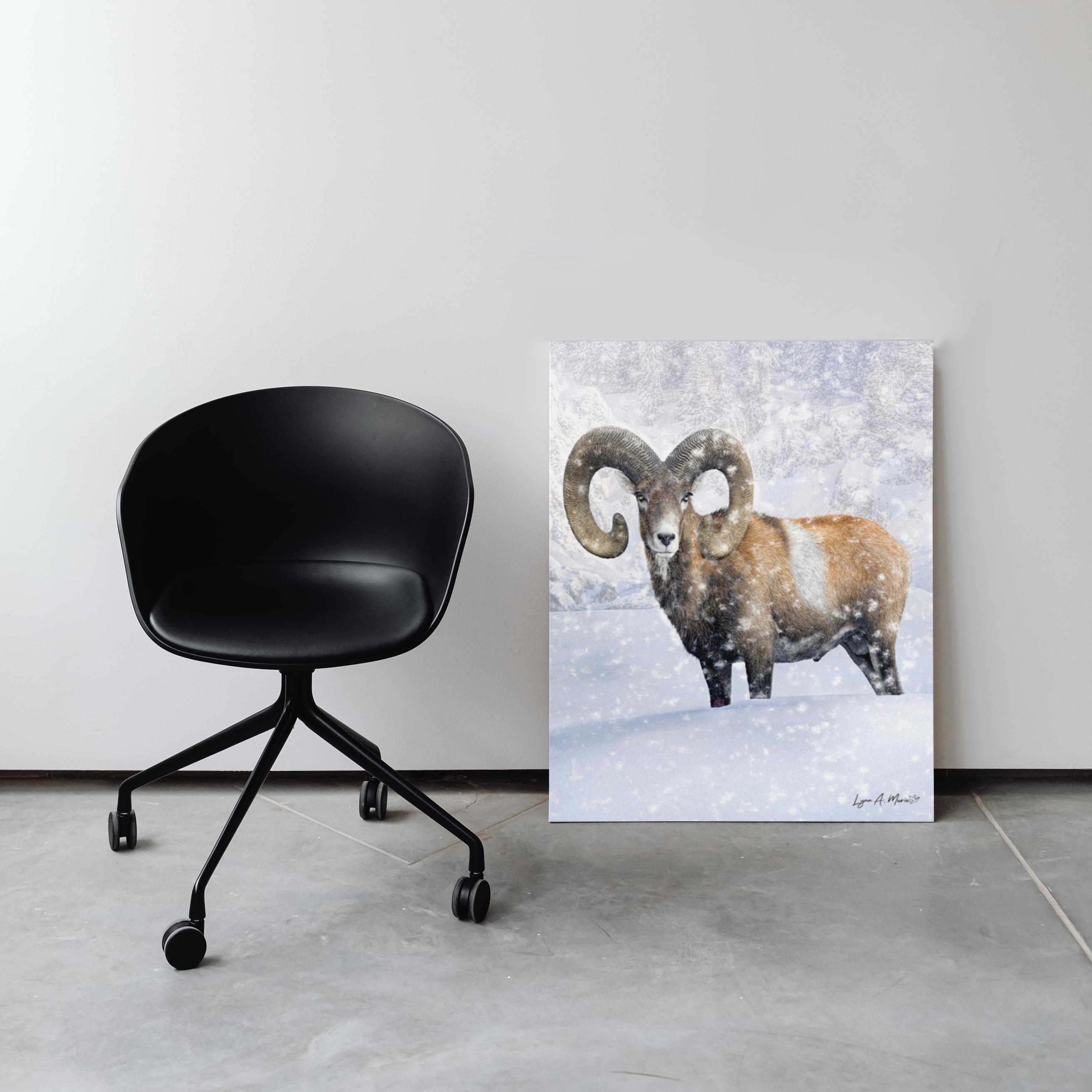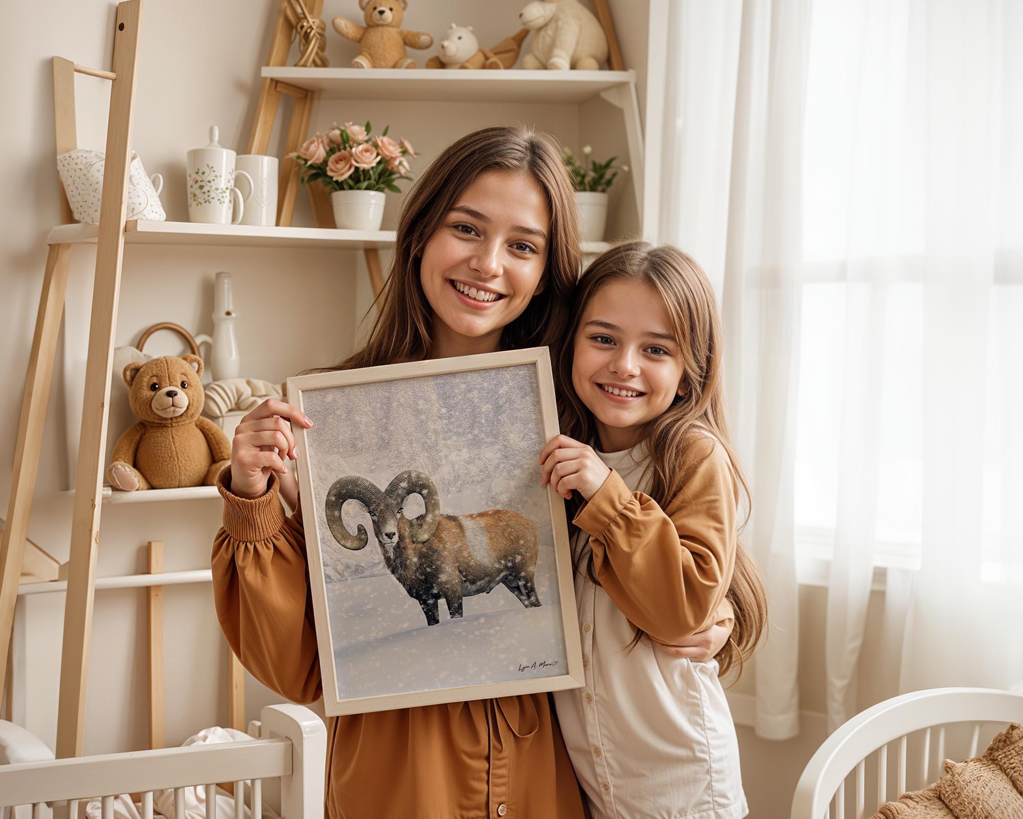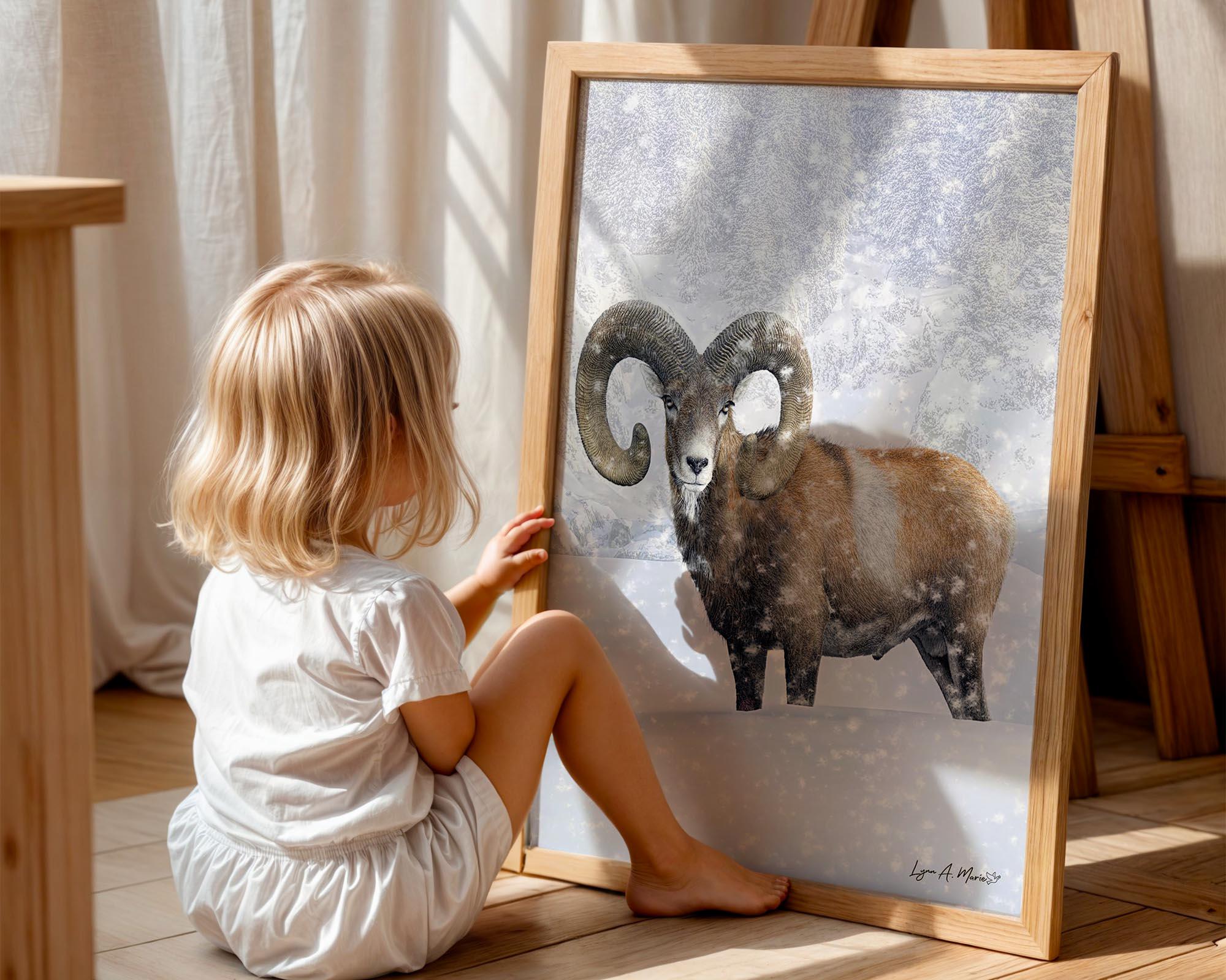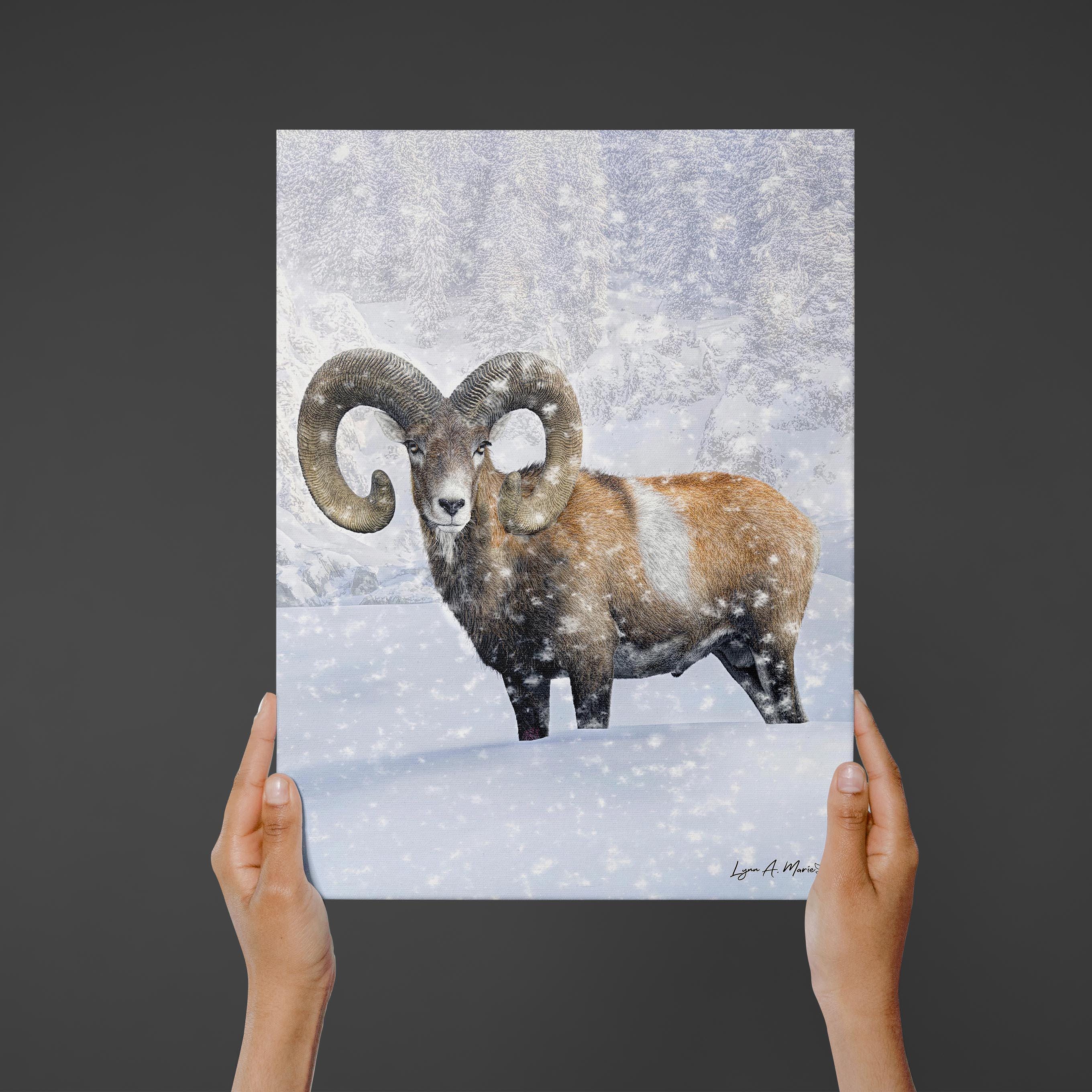 I created this piece to honor the ram’s power and calm in harsh winter. The sweeping horns and quiet stance show resilience, while the falling snow adds a sense of solitude and wilderness. It’s a tribute to strength, survival, and the wild beauty of the mountains.