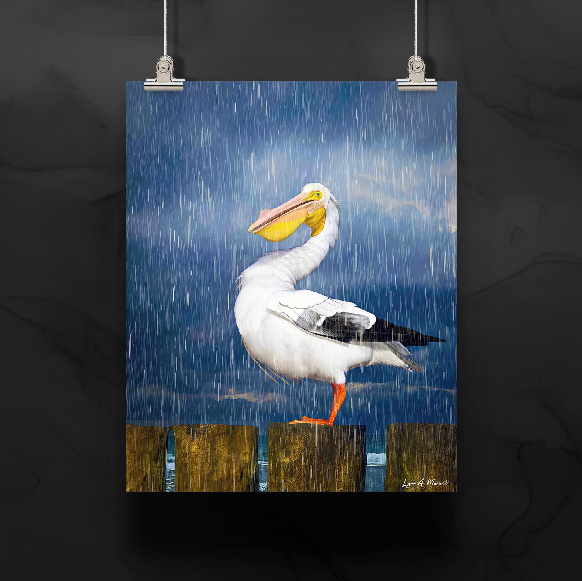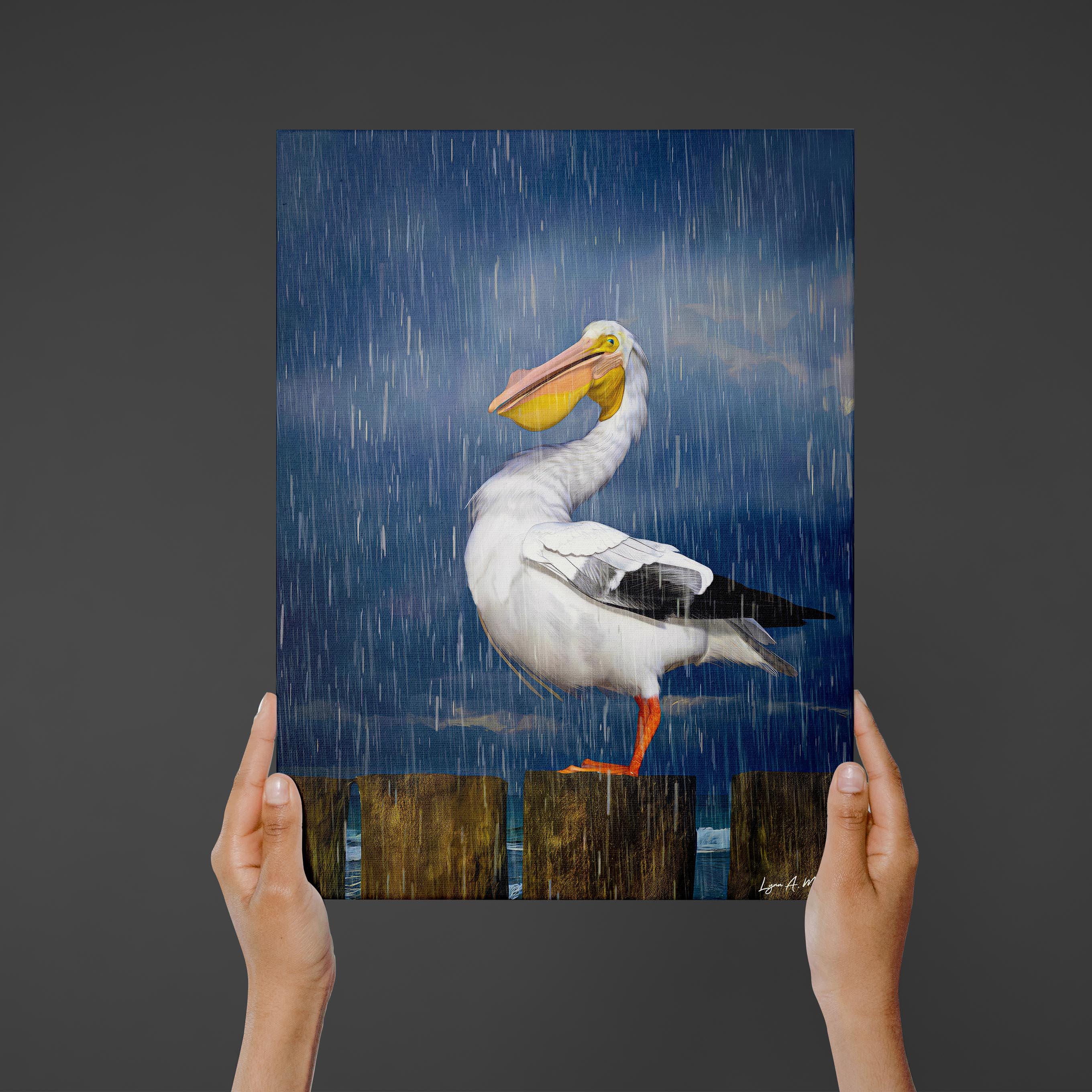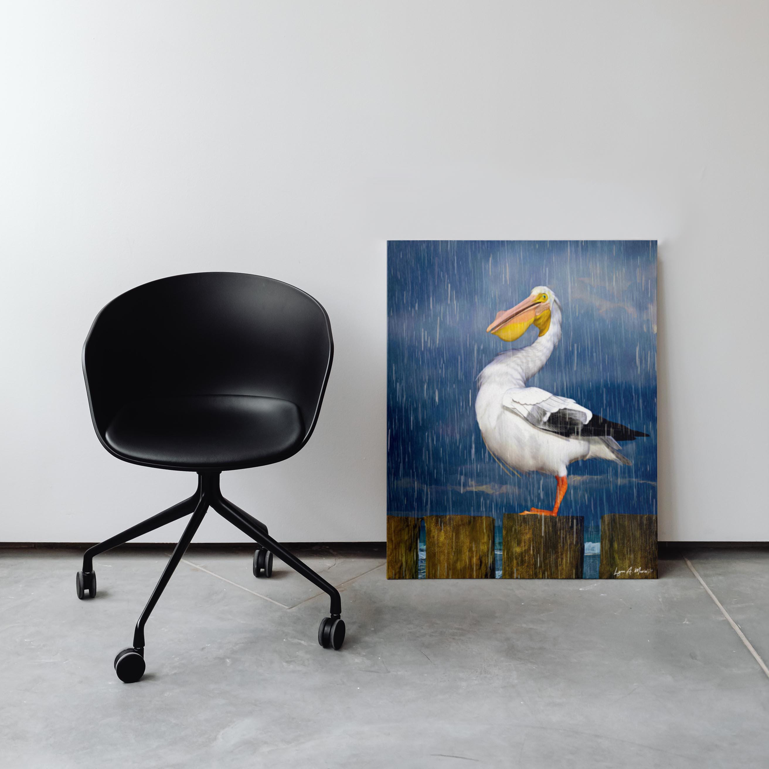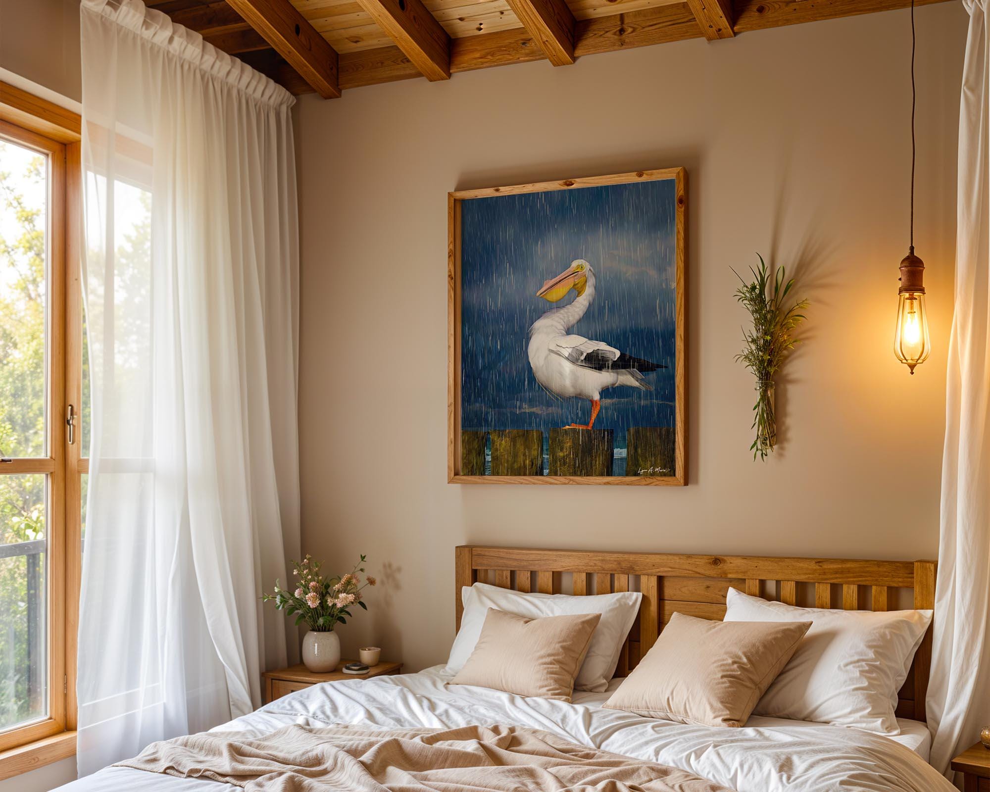 I created this piece to show the calm resilience of coastal life, one bright, confident pelican holding steady through driving rain. The contrast of its glowing bill against the stormy sky celebrates strength, grit, and the unexpected beauty of bad weather. This signed bird artwork brings a bold seascape scene into the livingroom, blending wildlife and nature with an ocean horizon and raining atmosphere. Perfect as nautical-themed wall decor, it adds a steady, uplifting presence to any space.