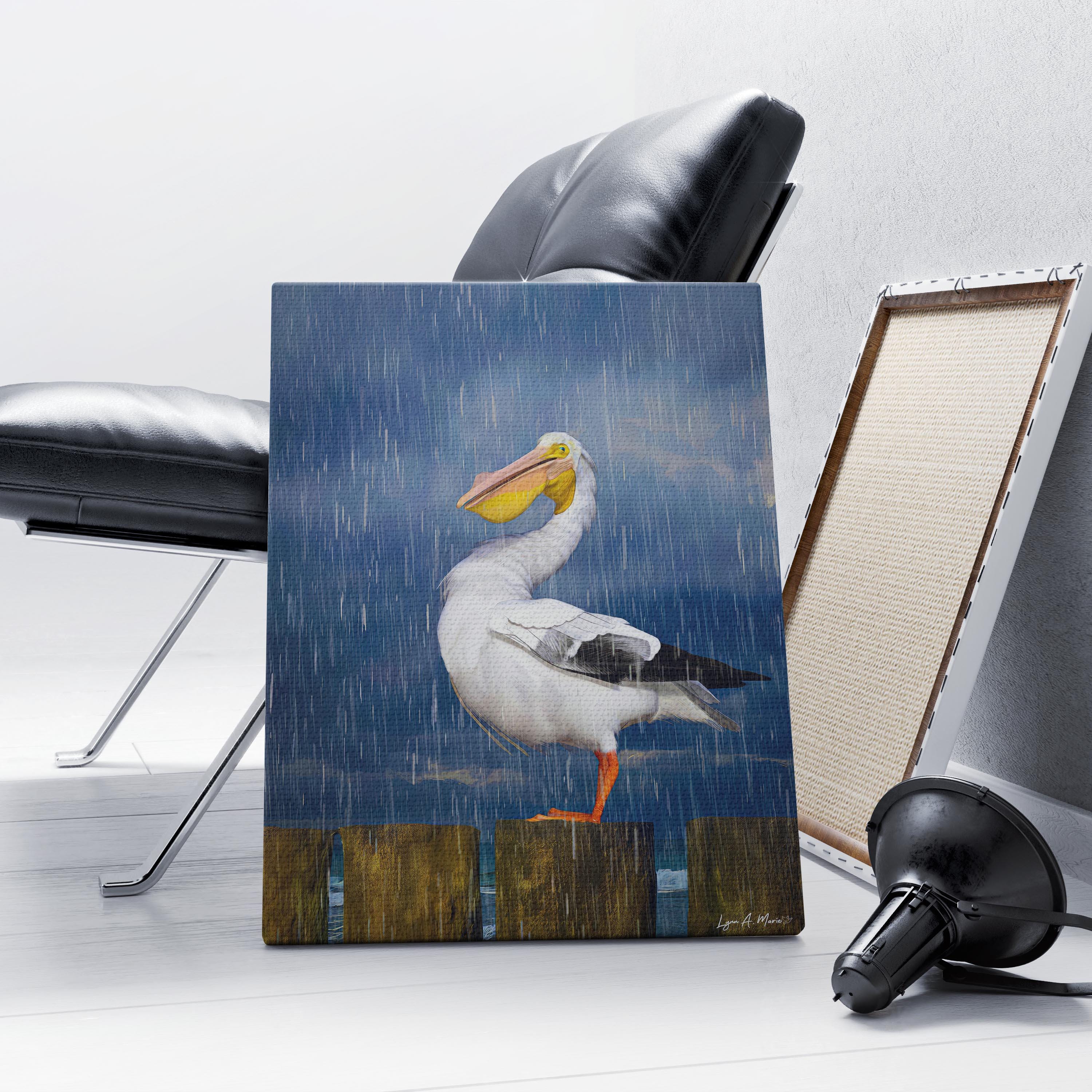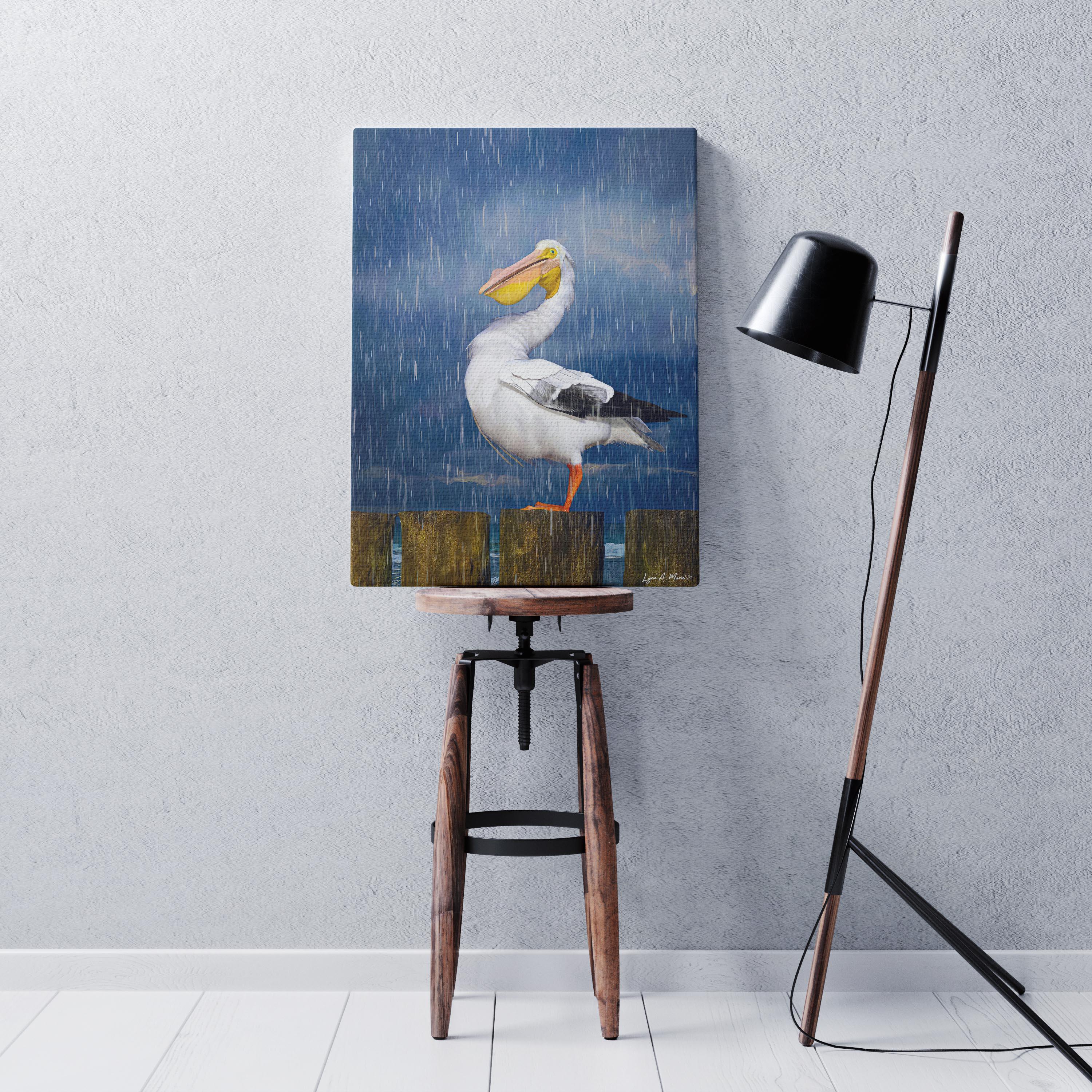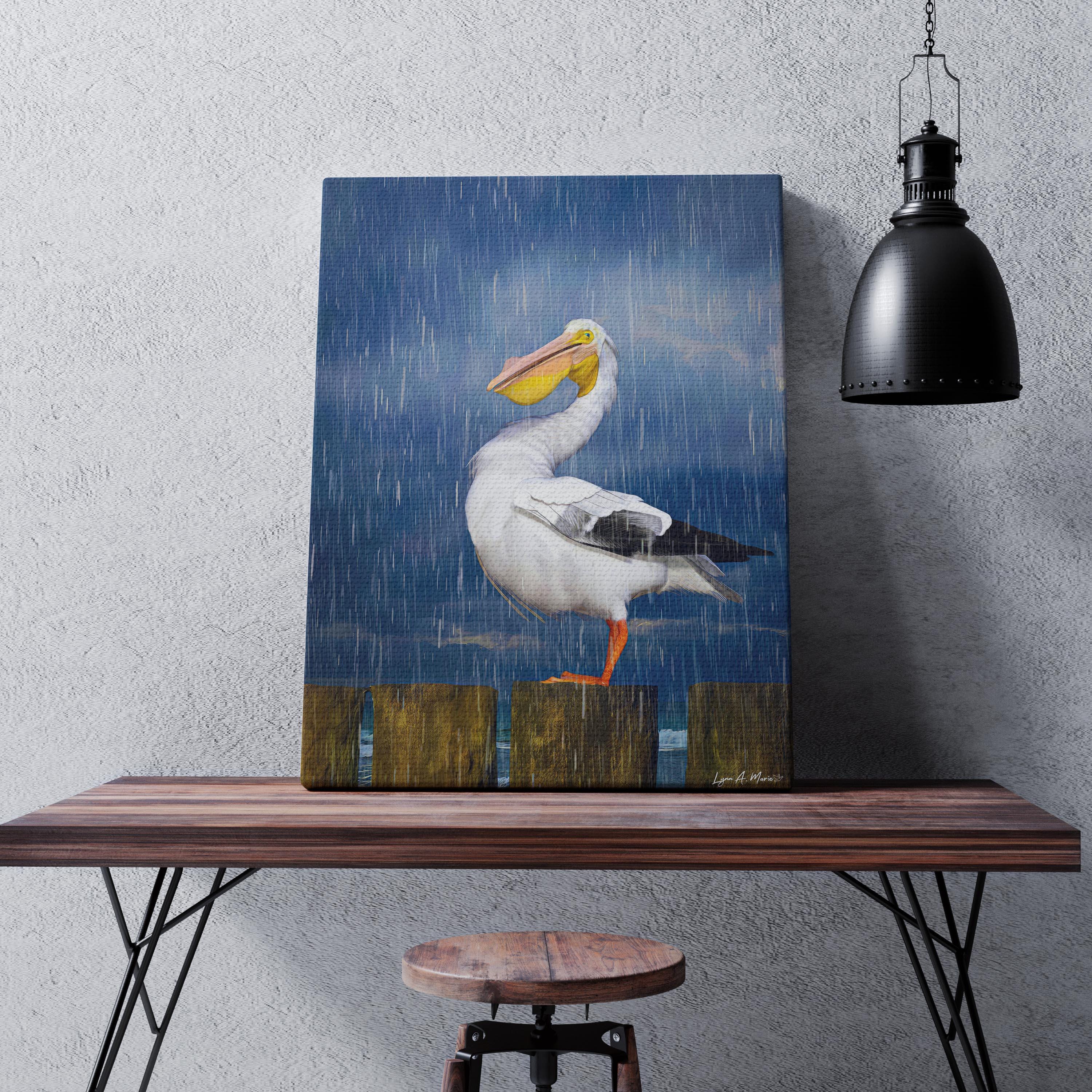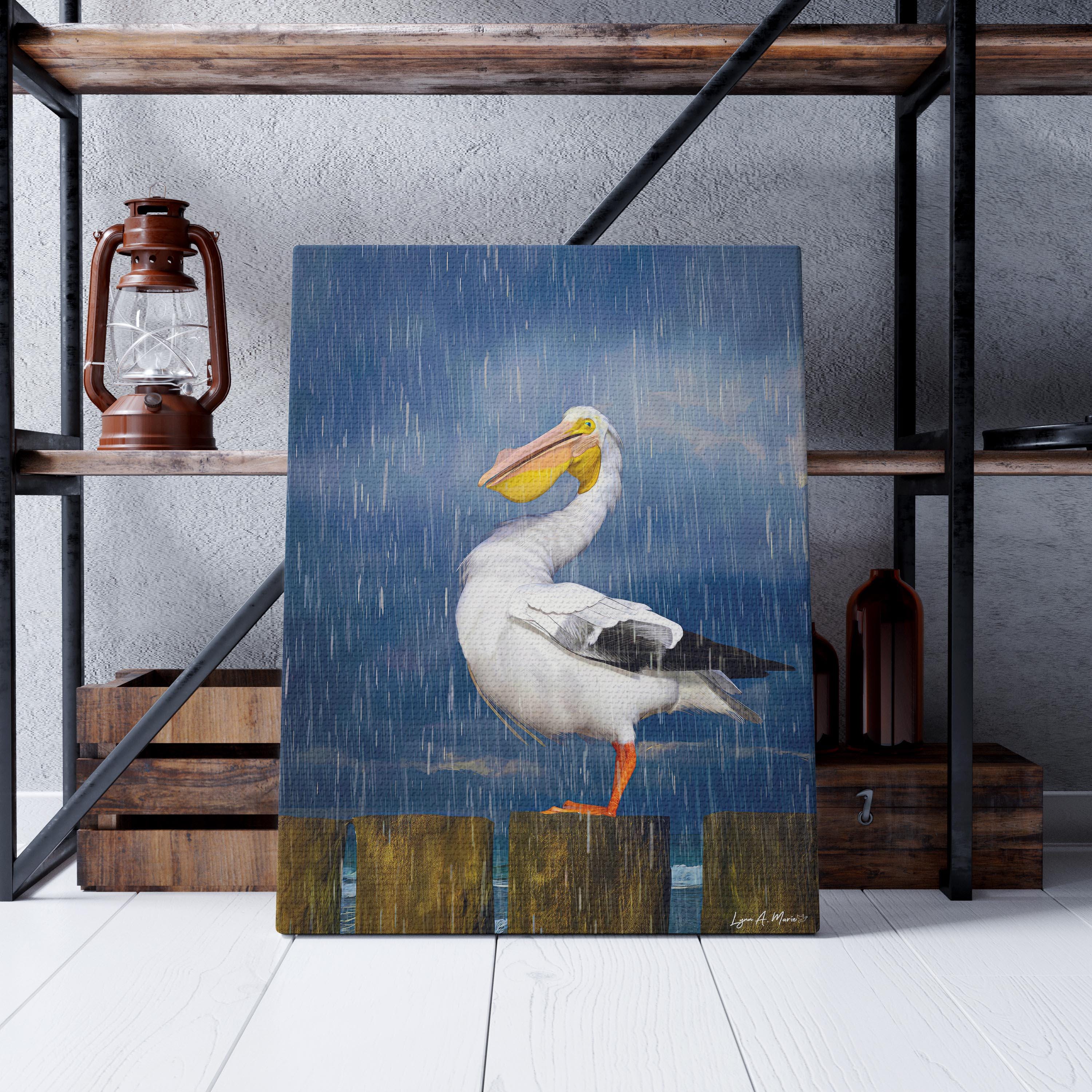 I created this piece to show the calm resilience of coastal life, one bright, confident pelican holding steady through driving rain. The contrast of its glowing bill against the stormy sky celebrates strength, grit, and the unexpected beauty of bad weather. This signed bird artwork brings a bold seascape scene into the livingroom, blending wildlife and nature with an ocean horizon and raining atmosphere. Perfect as nautical-themed wall decor, it adds a steady, uplifting presence to any space.
