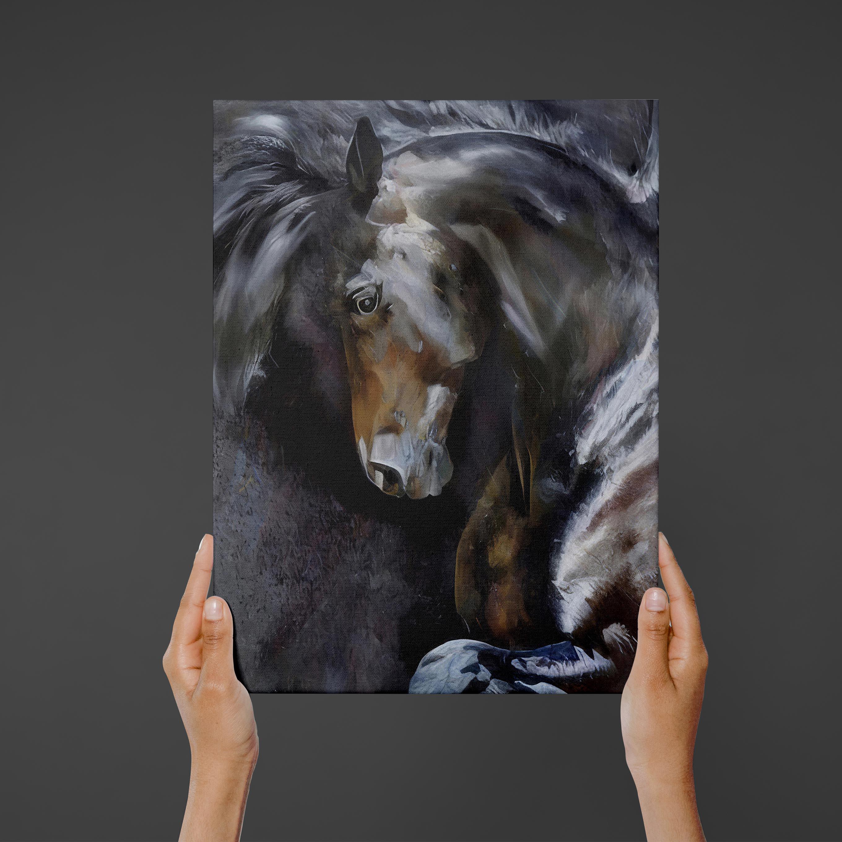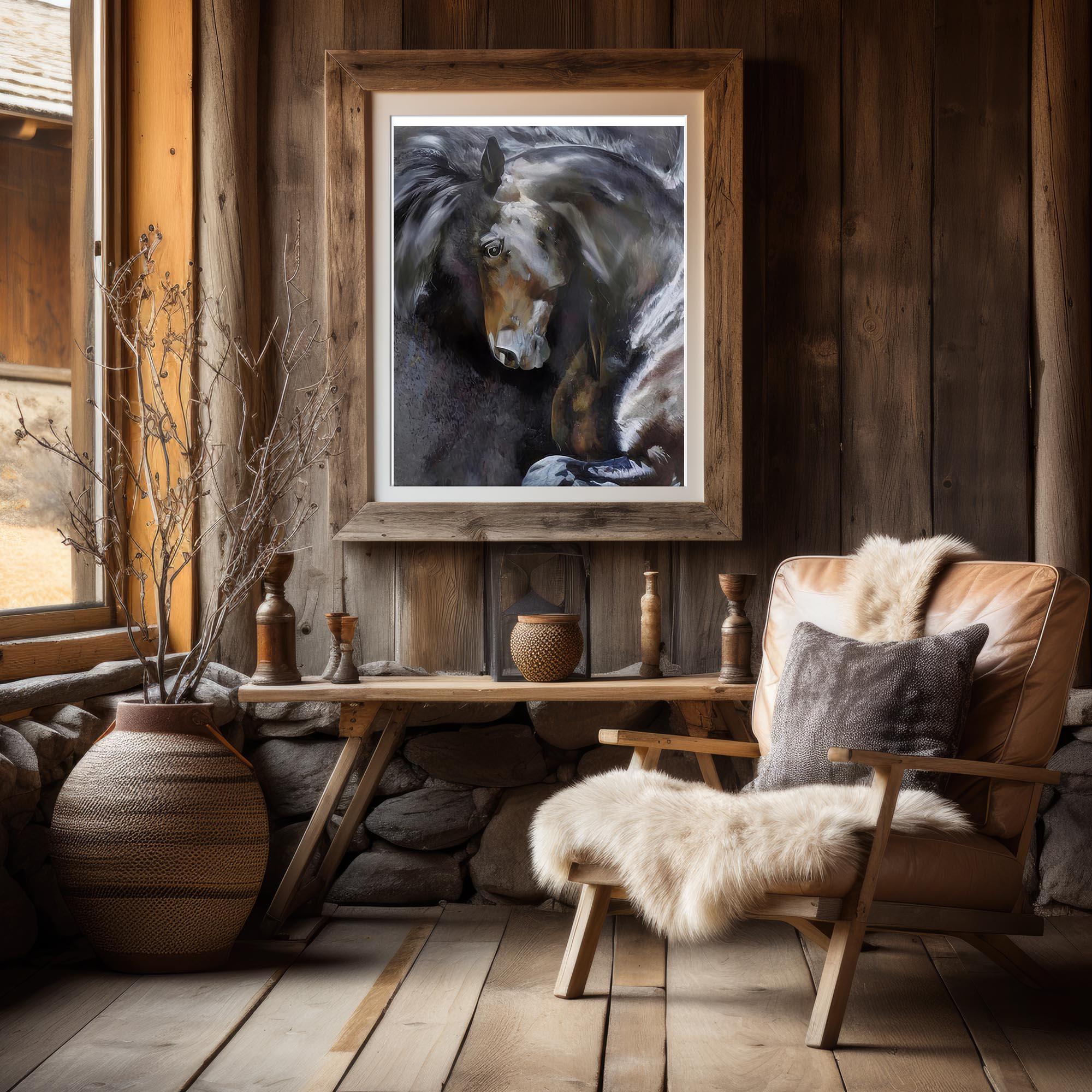 I created this elegant black horse piece to bring the power and calm of real equestrian beauty into a living room wall space. This was digitally created in Photoshop and Daz studio, it is not AI generated. This unique style makes it a unique decor piece for horse lovers and a meaningful gift for anyone who appreciates the grace of these animals.