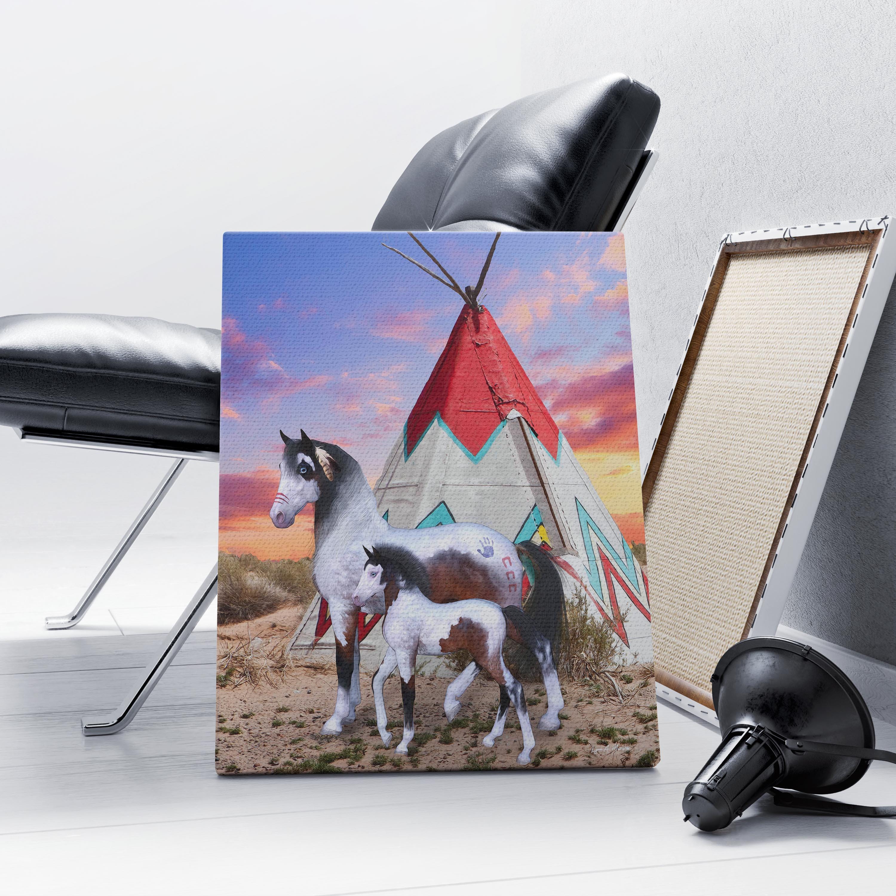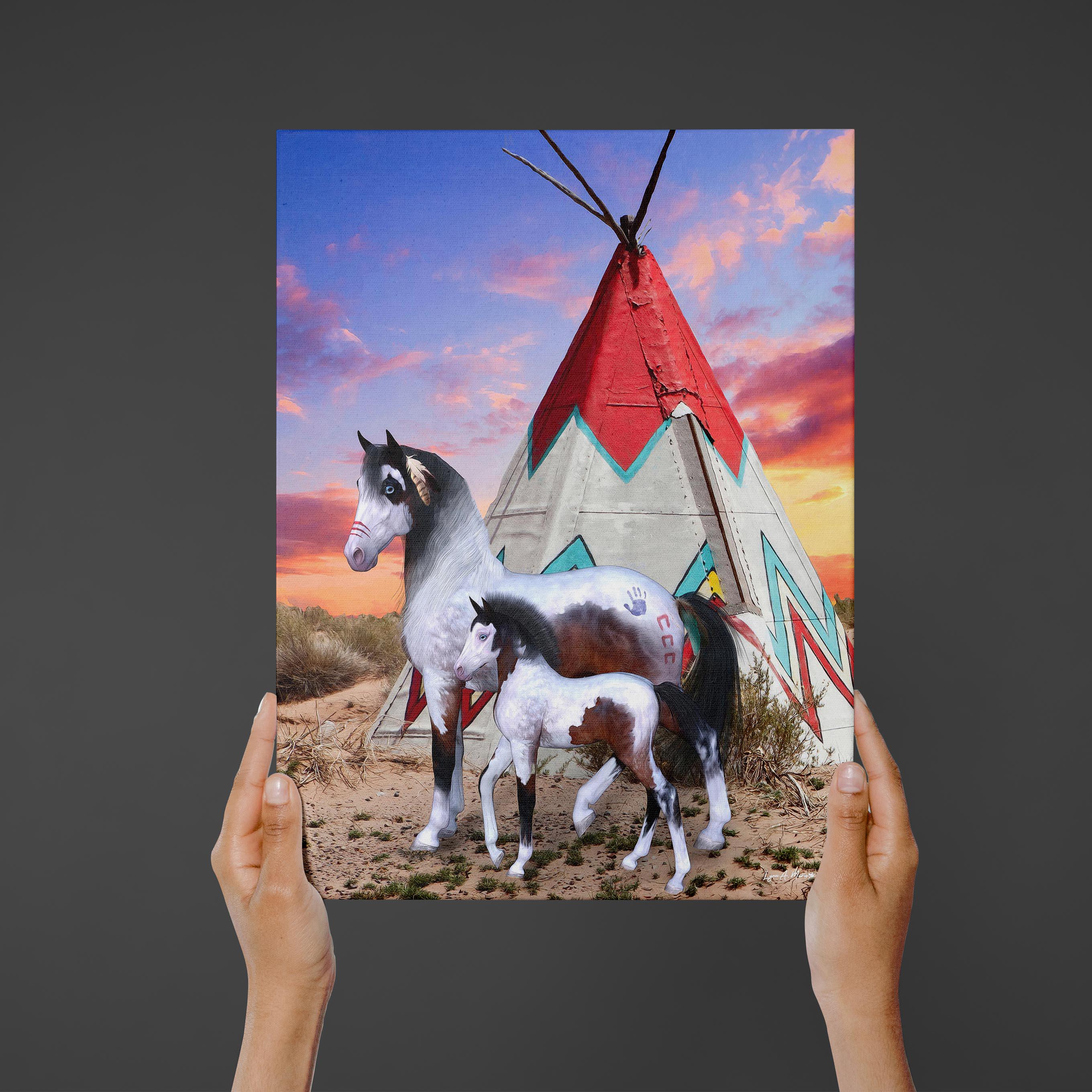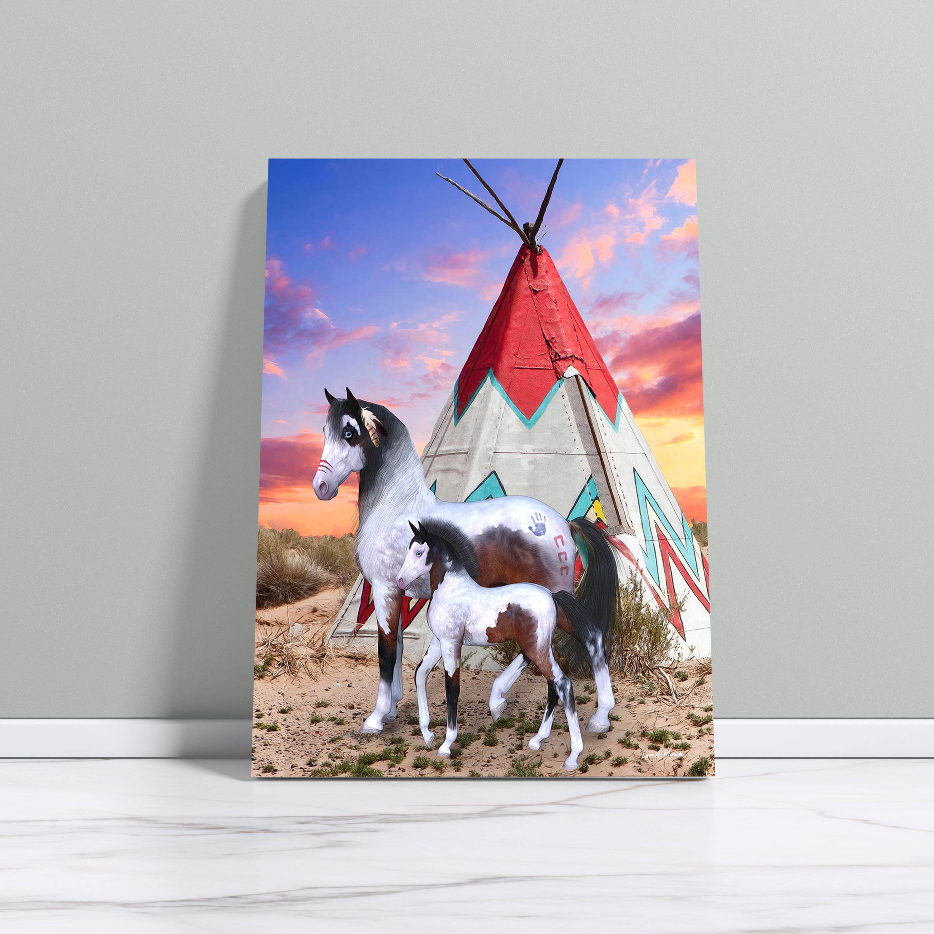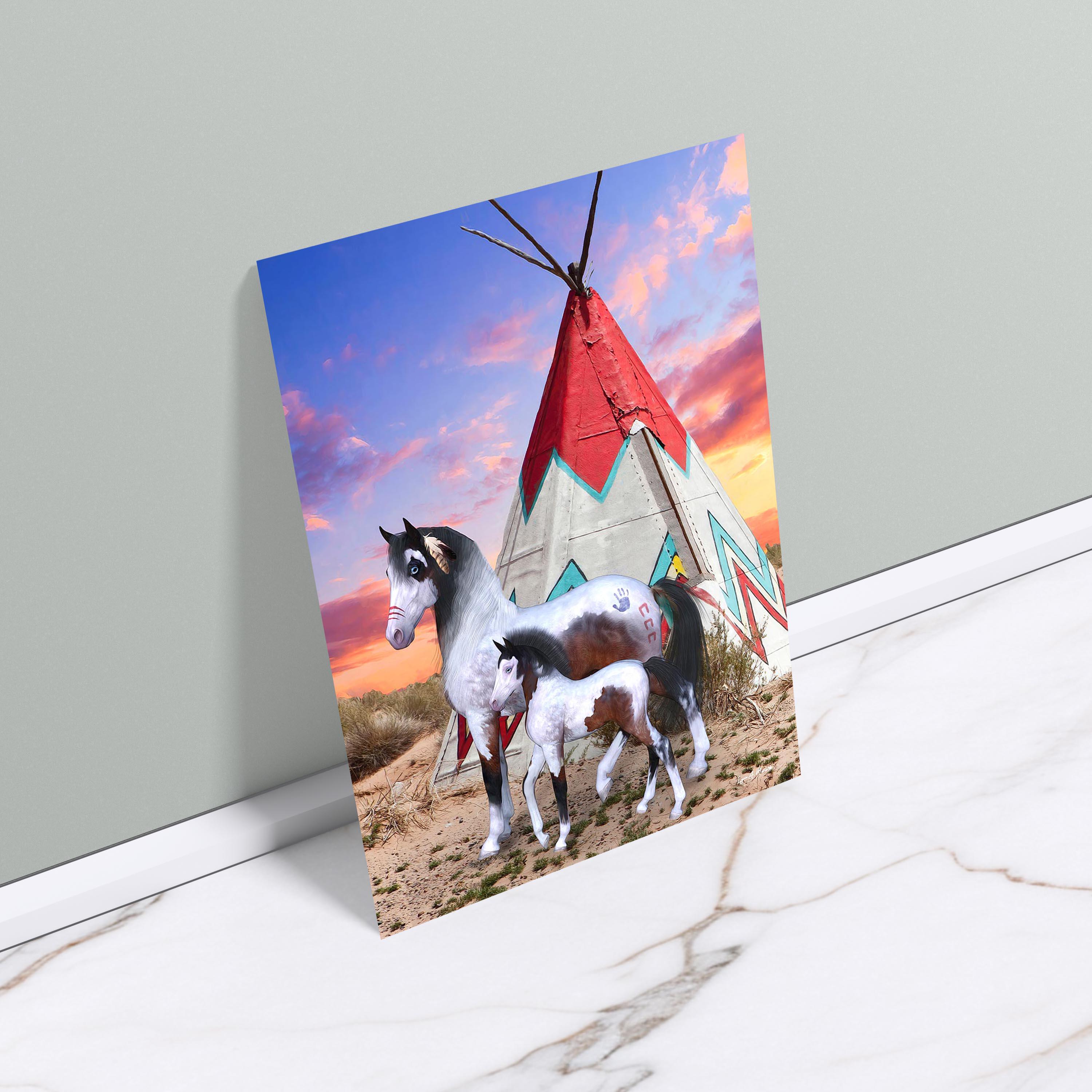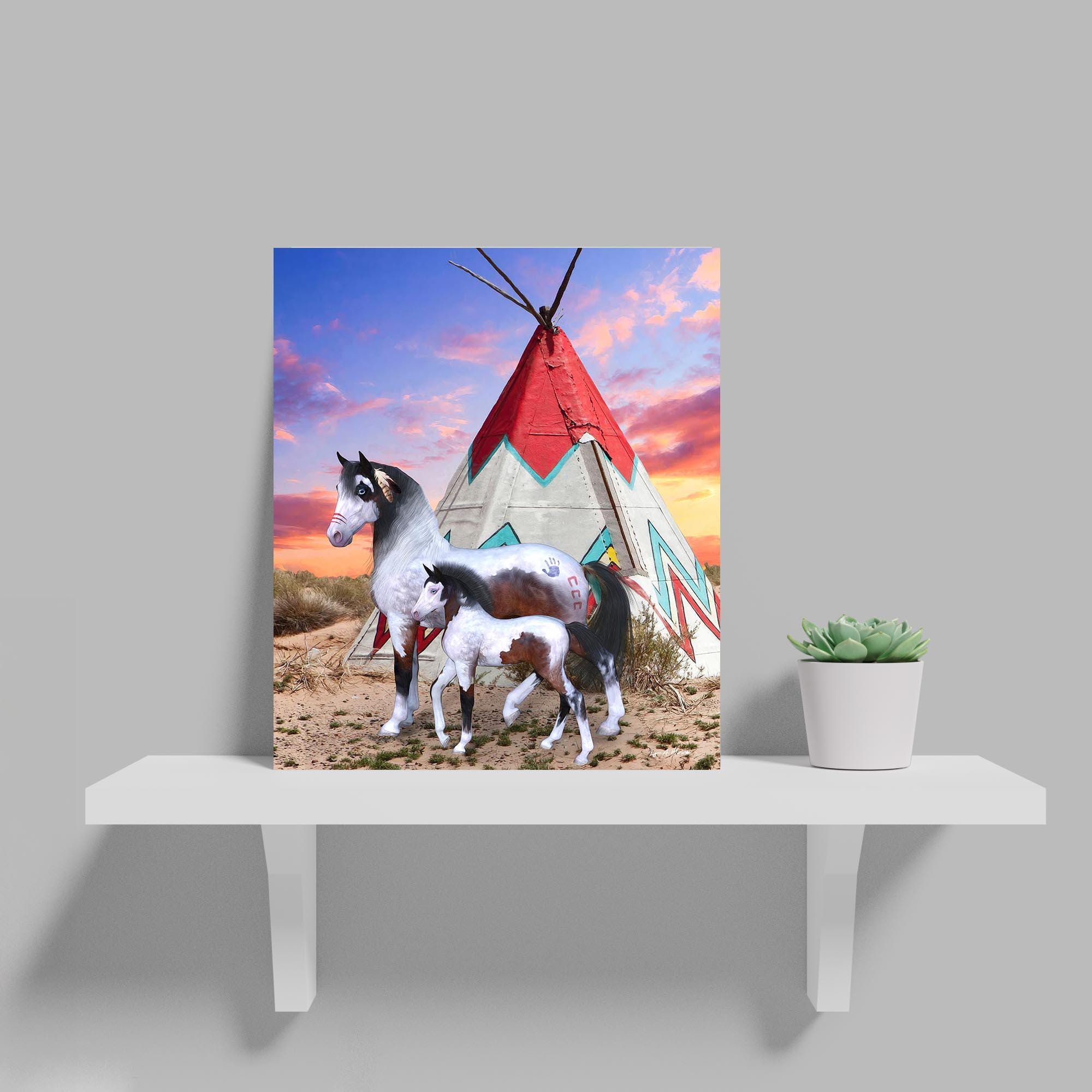 Bring a touch of Western warmth into your living room wall with this signed equine horse art print featuring a pinto American pony and foal. Created in Photoshop and Daz Studio, this is NOT ai generated, with real, detailed paint markings, this artwork adds rustic charm to any cabin. Perfect for pony lovers, Western homes, and anyone who enjoys bold, nature-inspired décor.