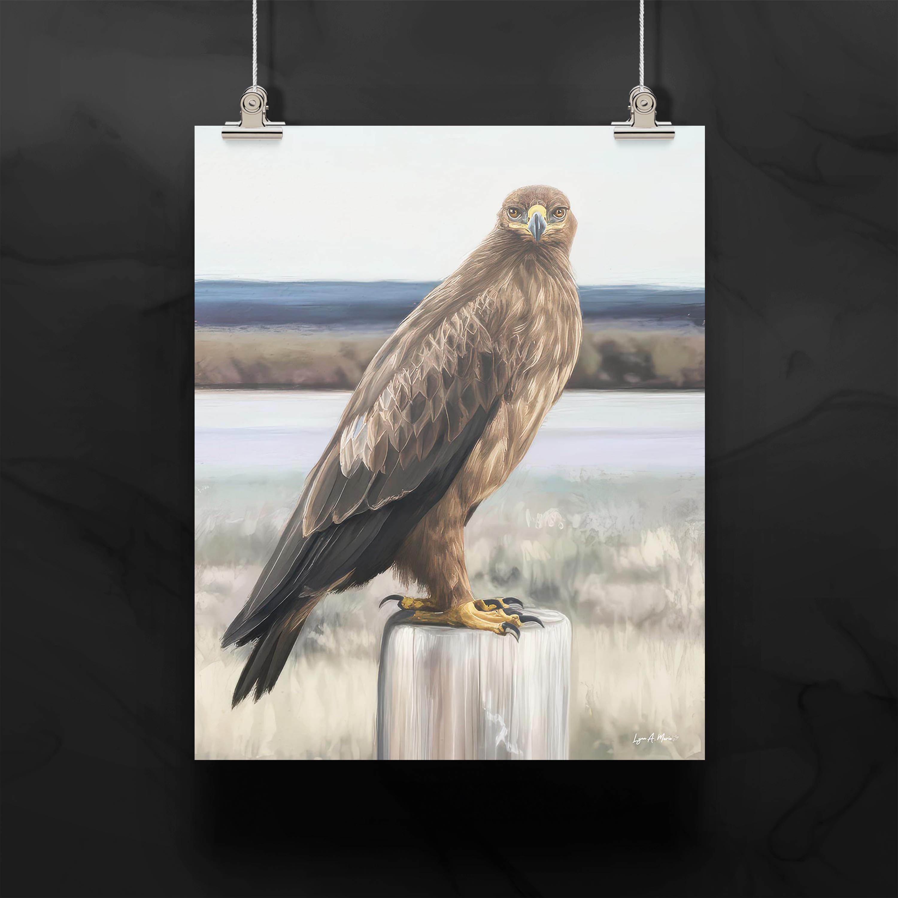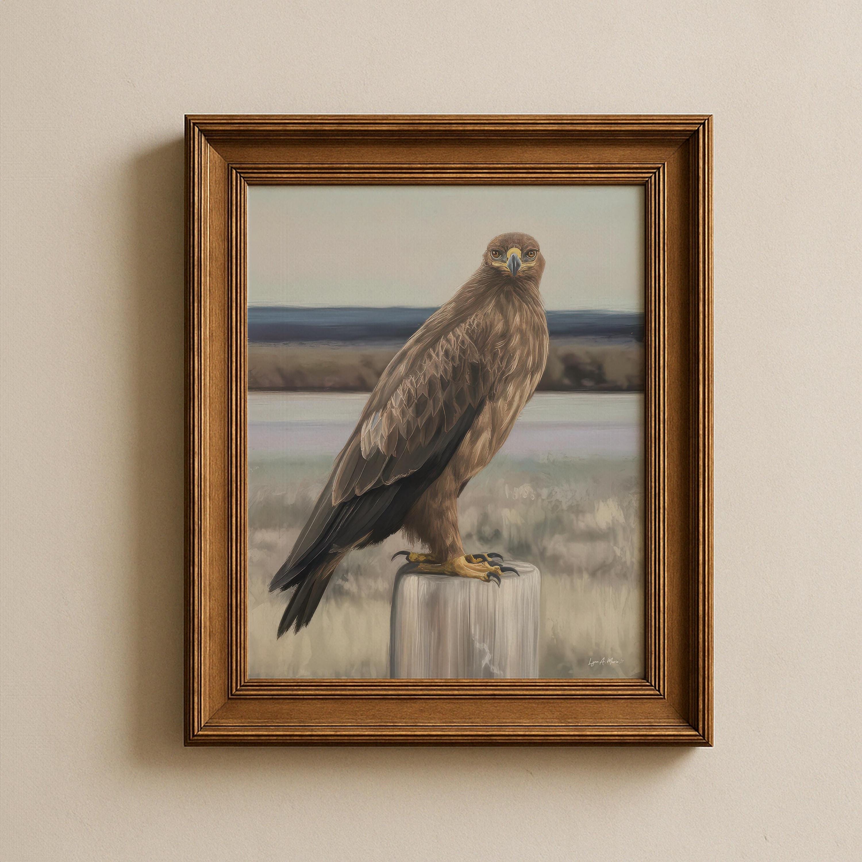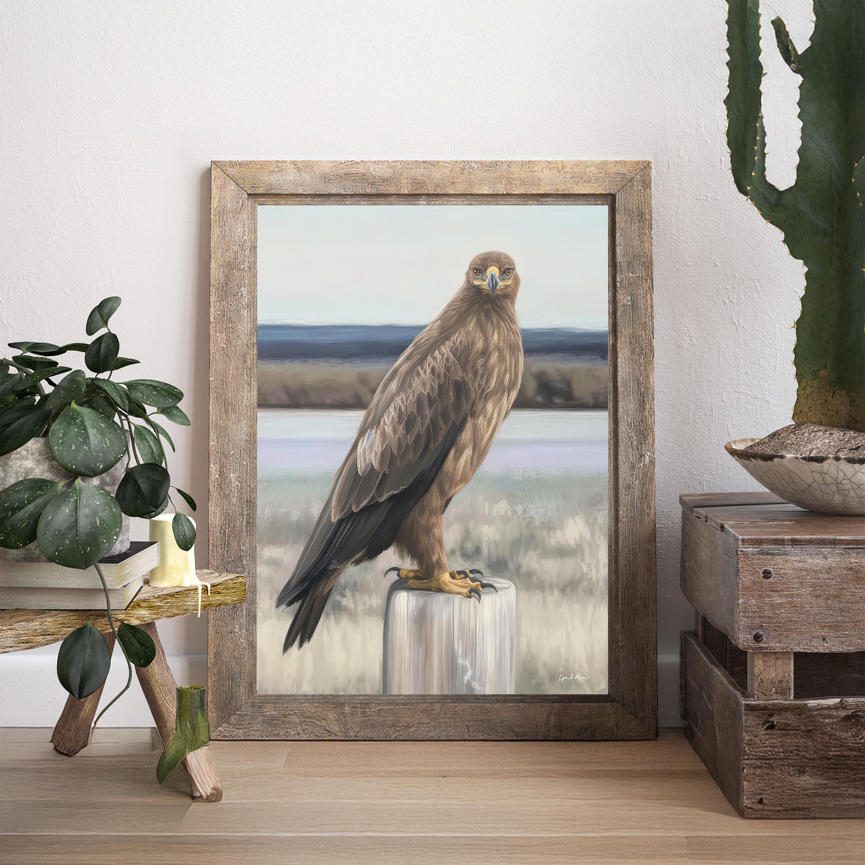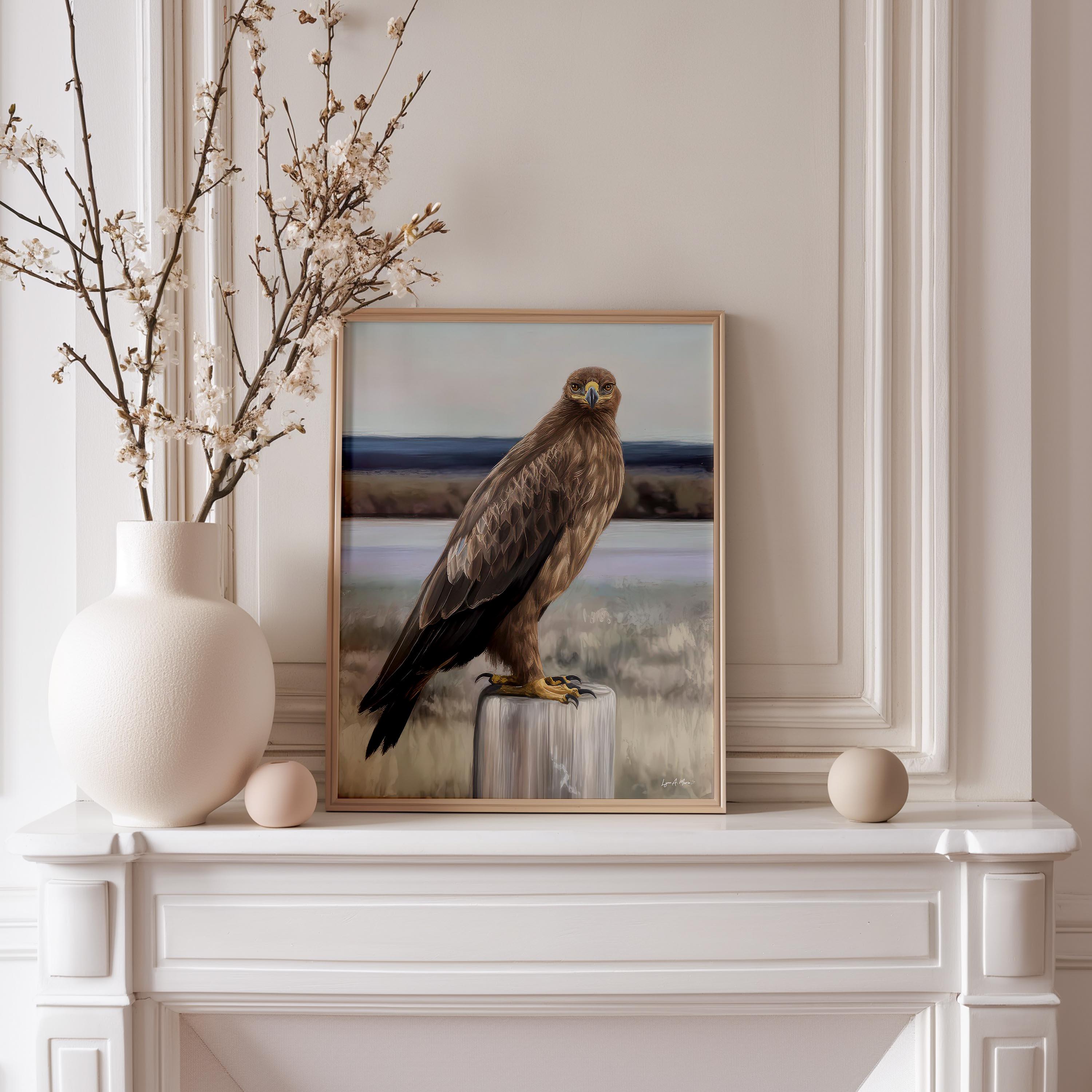 I created this steppe eagle piece because I was struck by how calm and powerful these raptors look when they stop and observe their surroundings. The Steppe Eagle is a magnificent bird of prey, known for its strength, sharp vision. Once a familiar sight across vast grasslands, it is now an endangered species. Representing courage, freedom, and resilience, the Steppe Eagle brings a touch of wild majesty and inspiration to any space. I wanted to capture that natural confidence in a way that feels real and grounded. This was digitally created, but not AI generated. It was created to bring a touch of the wild into a living room or any space that appreciates nature. This signed art print is meant for anyone who loves majestic bird wall art, collects eagle decor, or simply wants a meaningful nature lover gift that feels authentic and connected to wildlife.