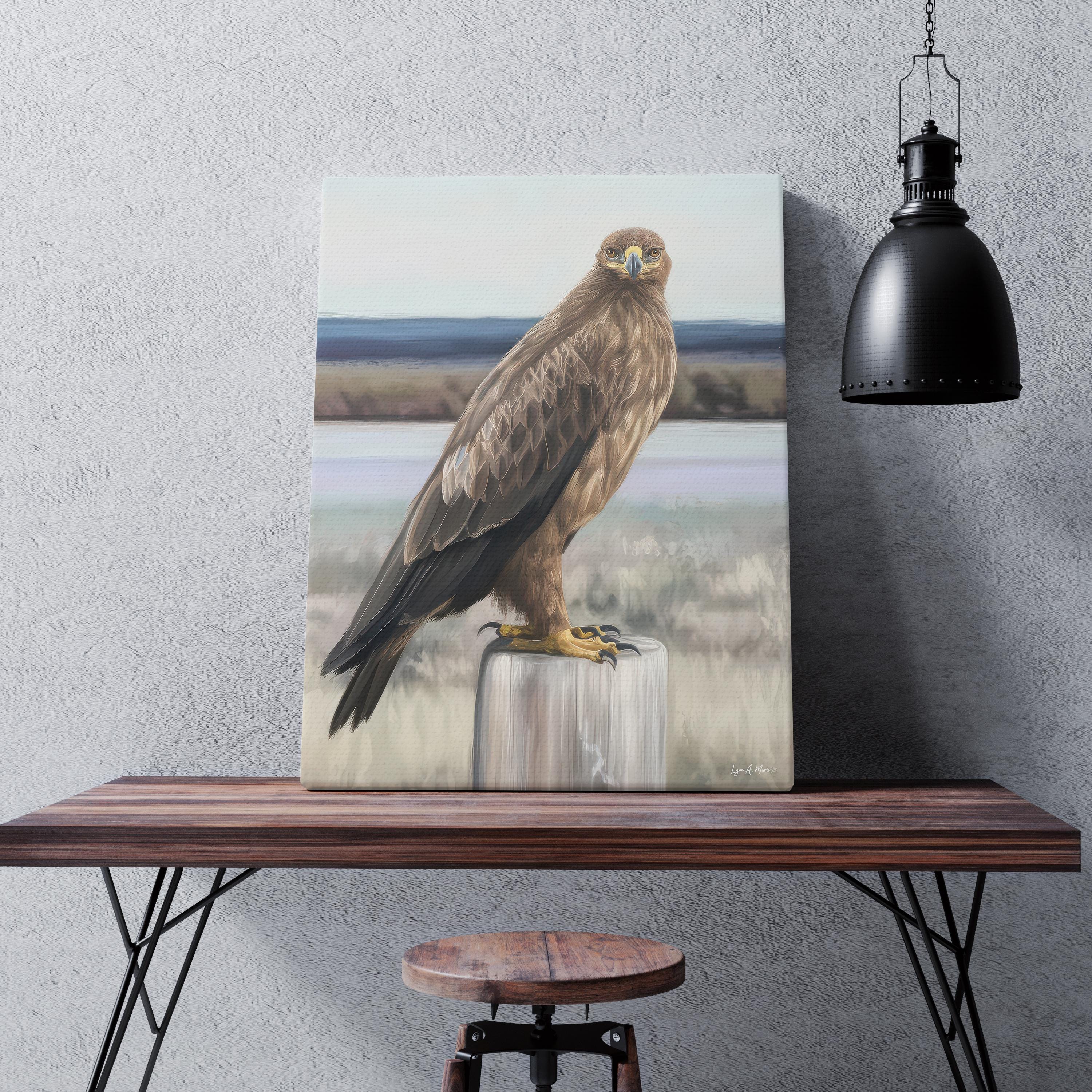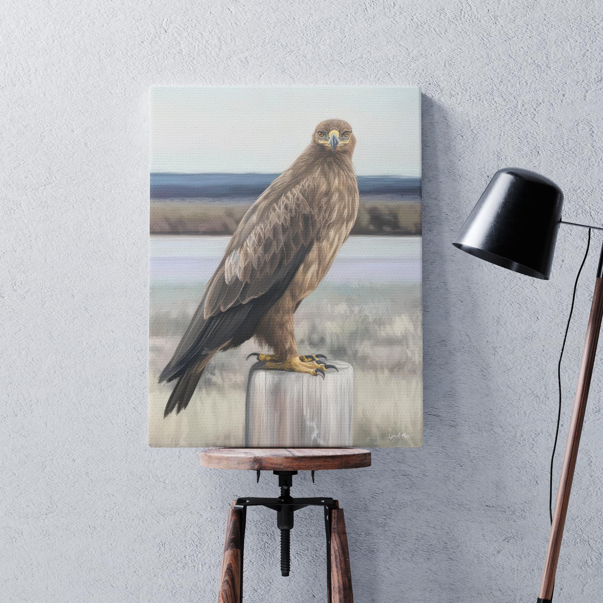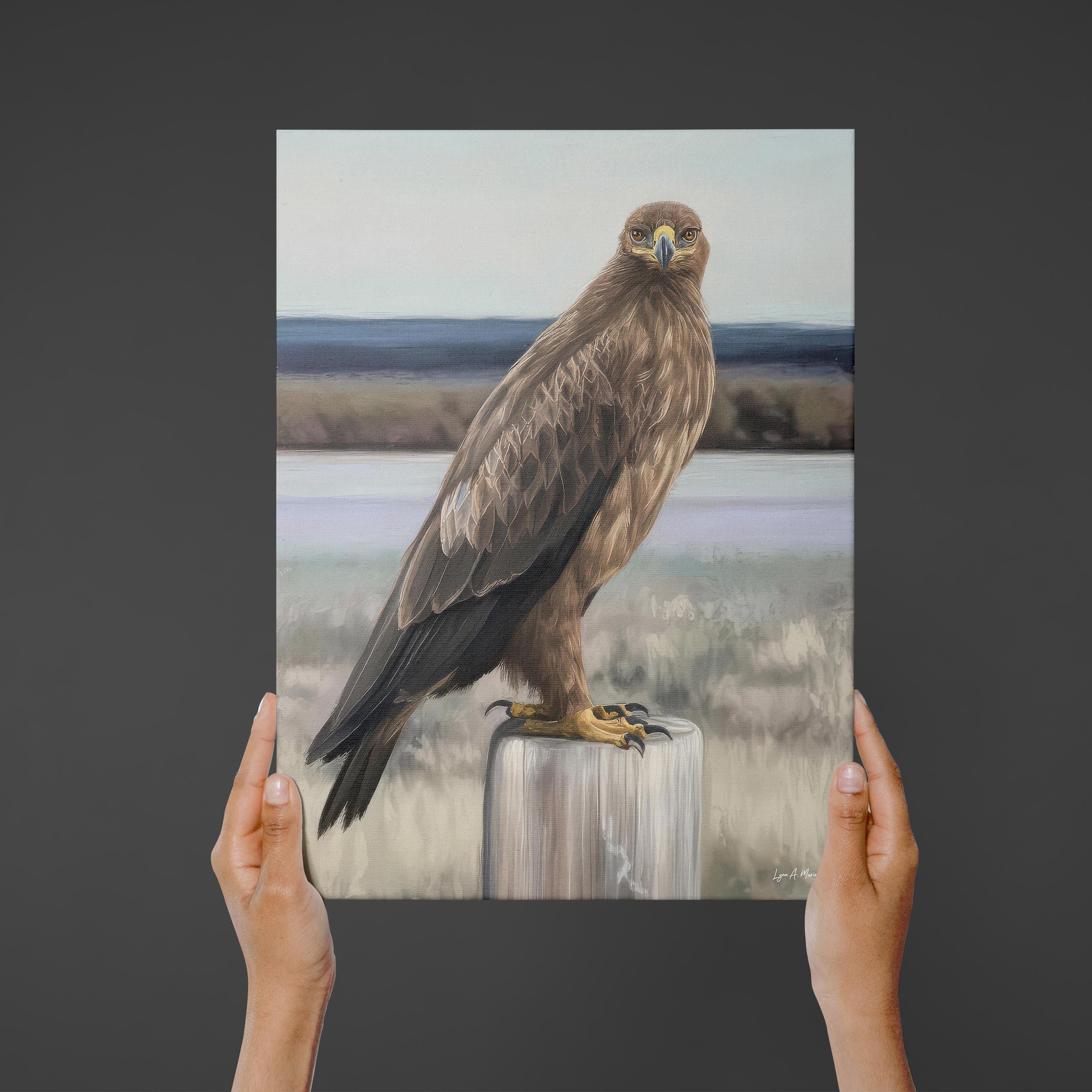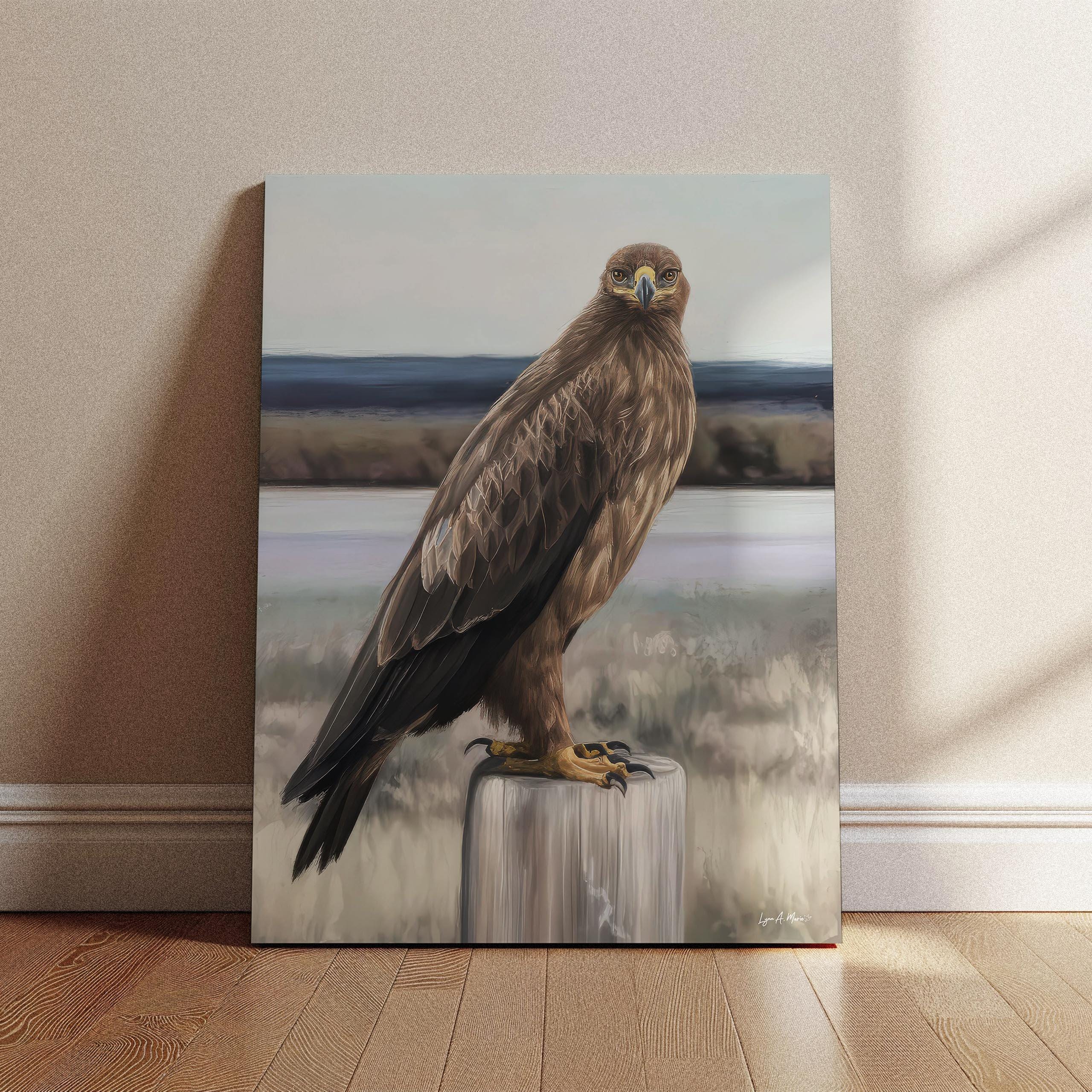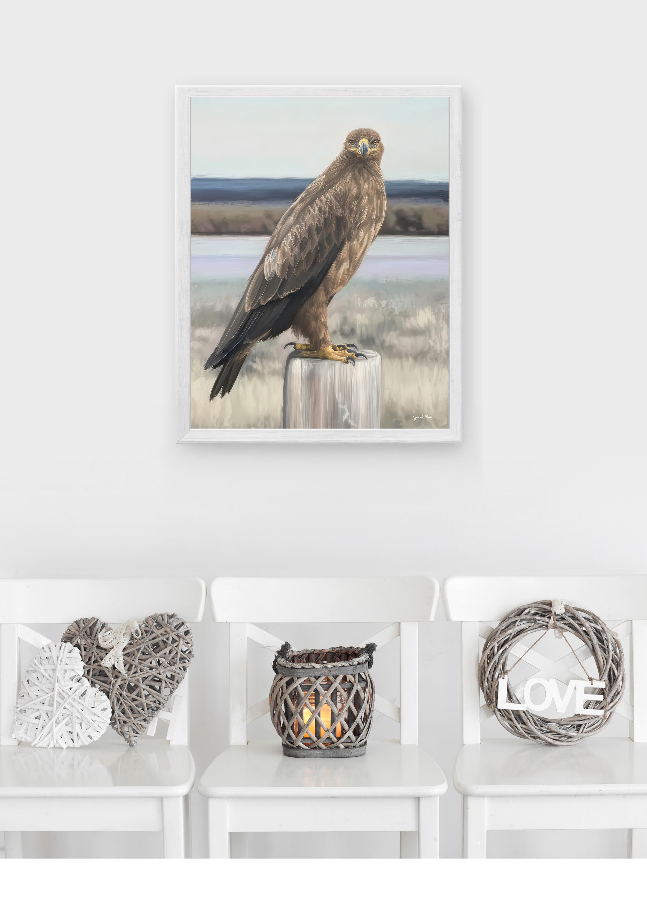 I created this steppe eagle piece because I was struck by how calm and powerful these raptors look when they stop and observe their surroundings. The Steppe Eagle is a magnificent bird of prey, known for its strength, sharp vision. Once a familiar sight across vast grasslands, it is now an endangered species. Representing courage, freedom, and resilience, the Steppe Eagle brings a touch of wild majesty and inspiration to any space. I wanted to capture that natural confidence in a way that feels real and grounded. This was digitally created, but not AI generated. It was created to bring a touch of the wild into a living room or any space that appreciates nature. This signed art print is meant for anyone who loves majestic bird wall art, collects eagle decor, or simply wants a meaningful nature lover gift that feels authentic and connected to wildlife.