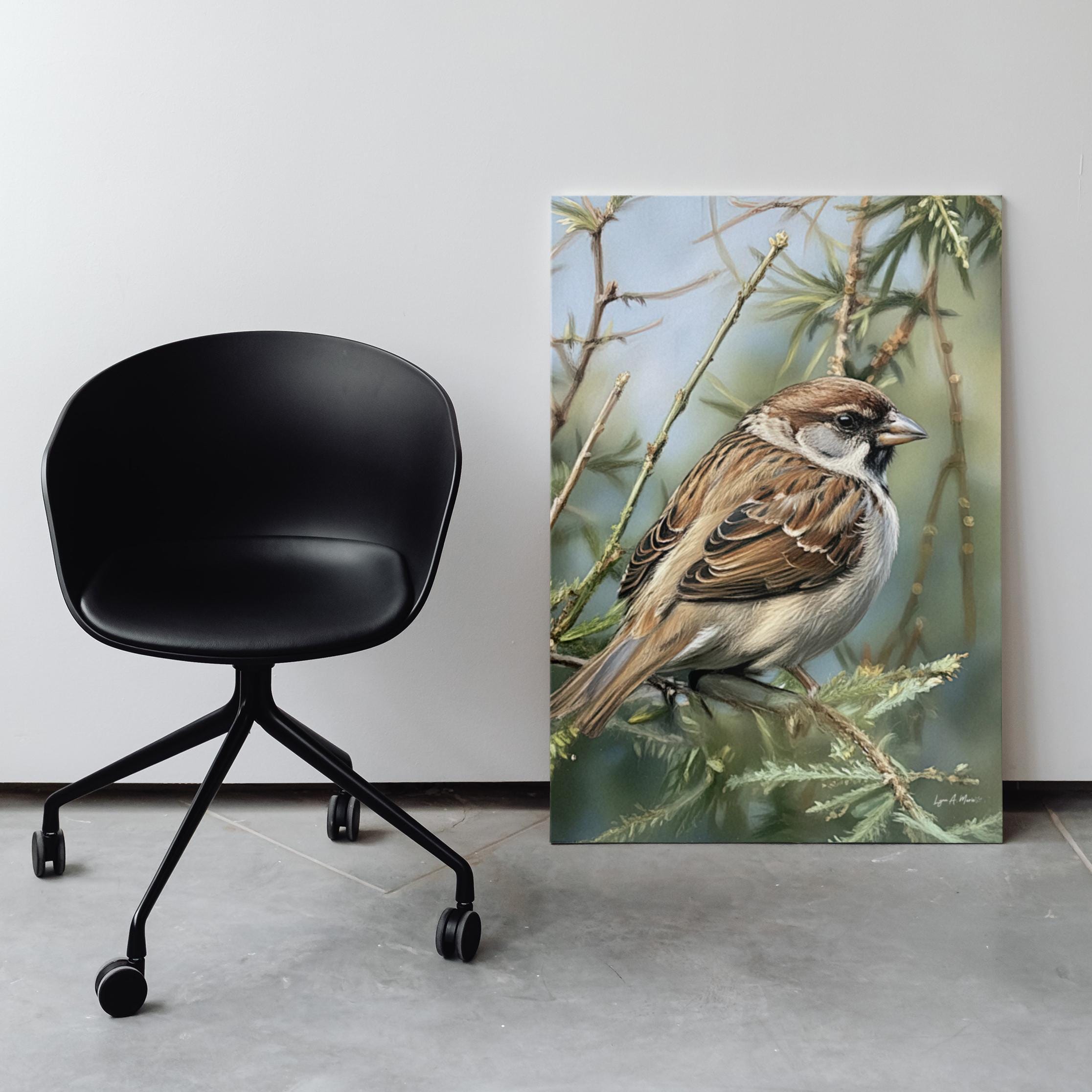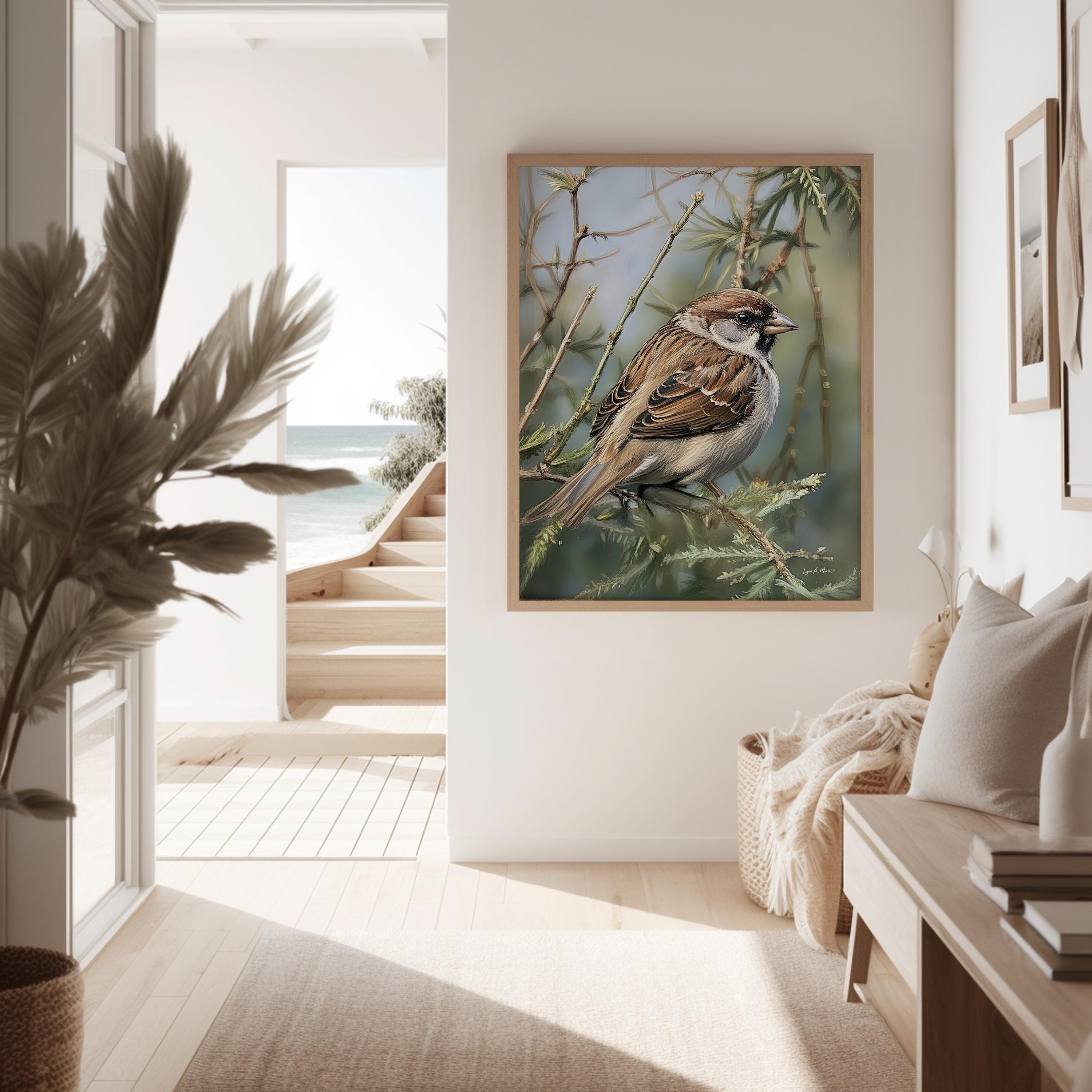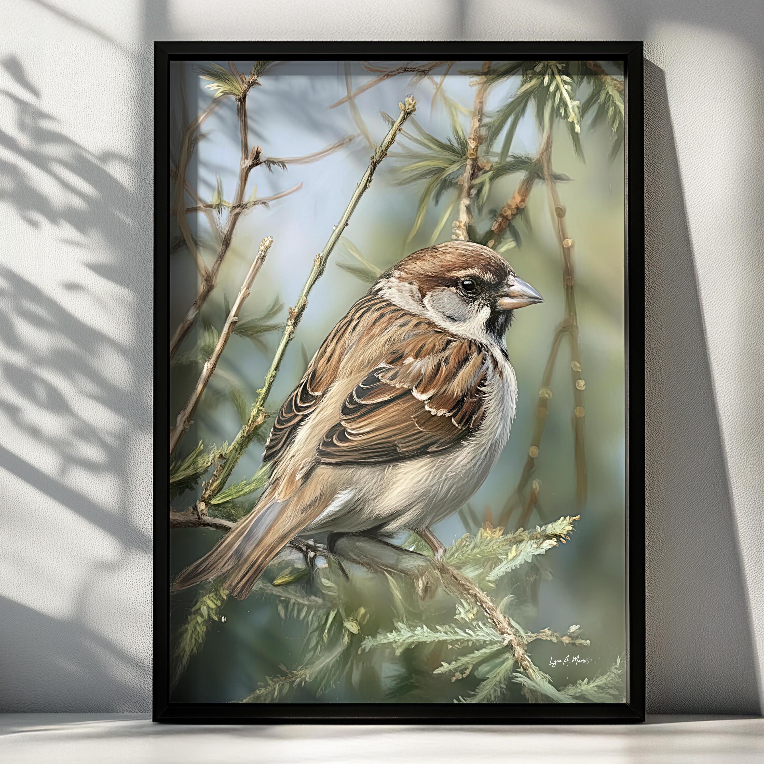 I created this sparrow piece to bring a quiet moment from nature into everyday spaces. I imagined it hanging in a cozy living room or bright home office as calming decor for any bird lover or birdwatcher who feels connected to small backyard birds. The detailed, signed artwork is meant to feel like a little avian treasure, both fine art and a warm gift idea, something you’d keep as a cherished collectible in your house. This gentle animal portrait celebrates the simple beauty of a familiar songbird, turning an ordinary sparrow into a quiet companion on the wall.