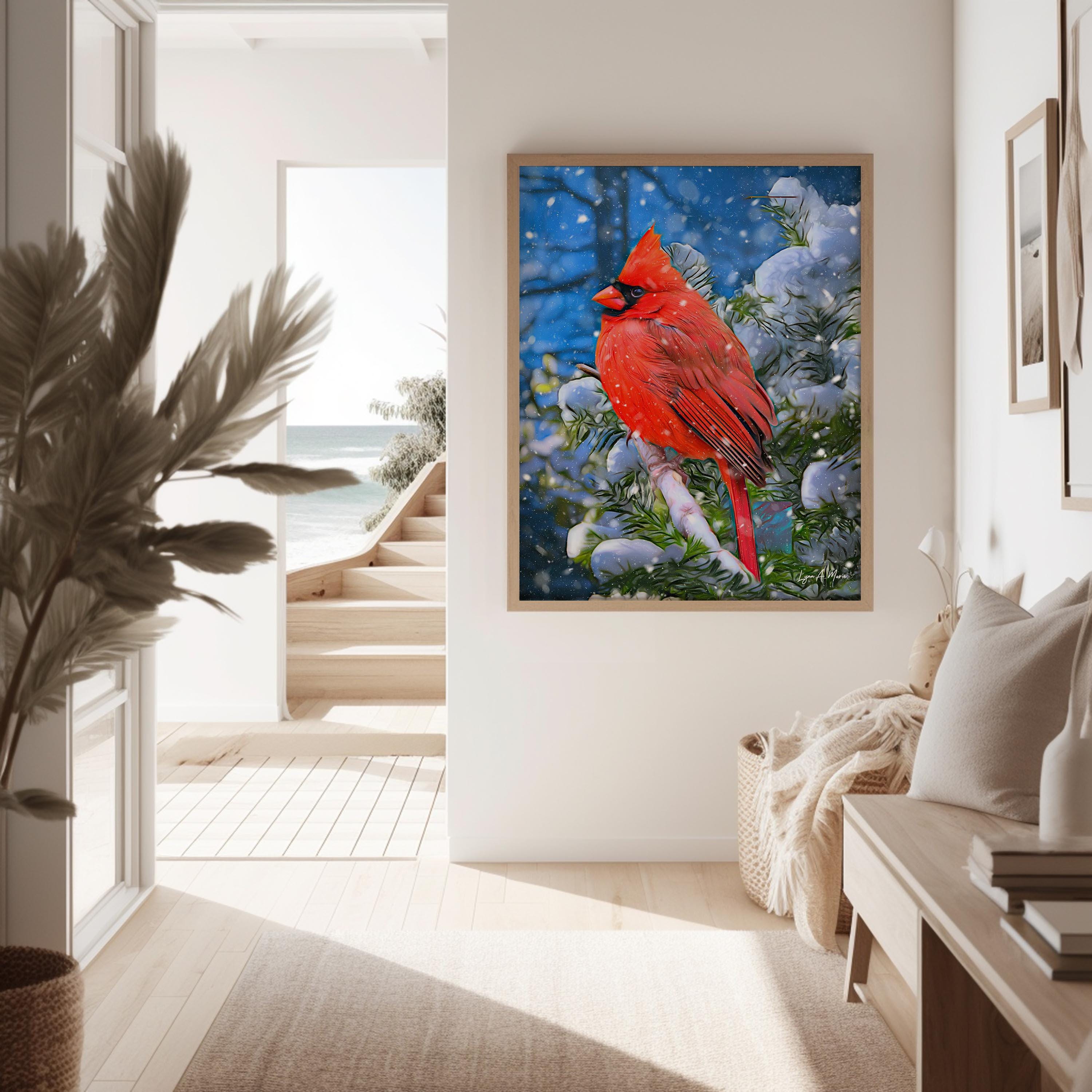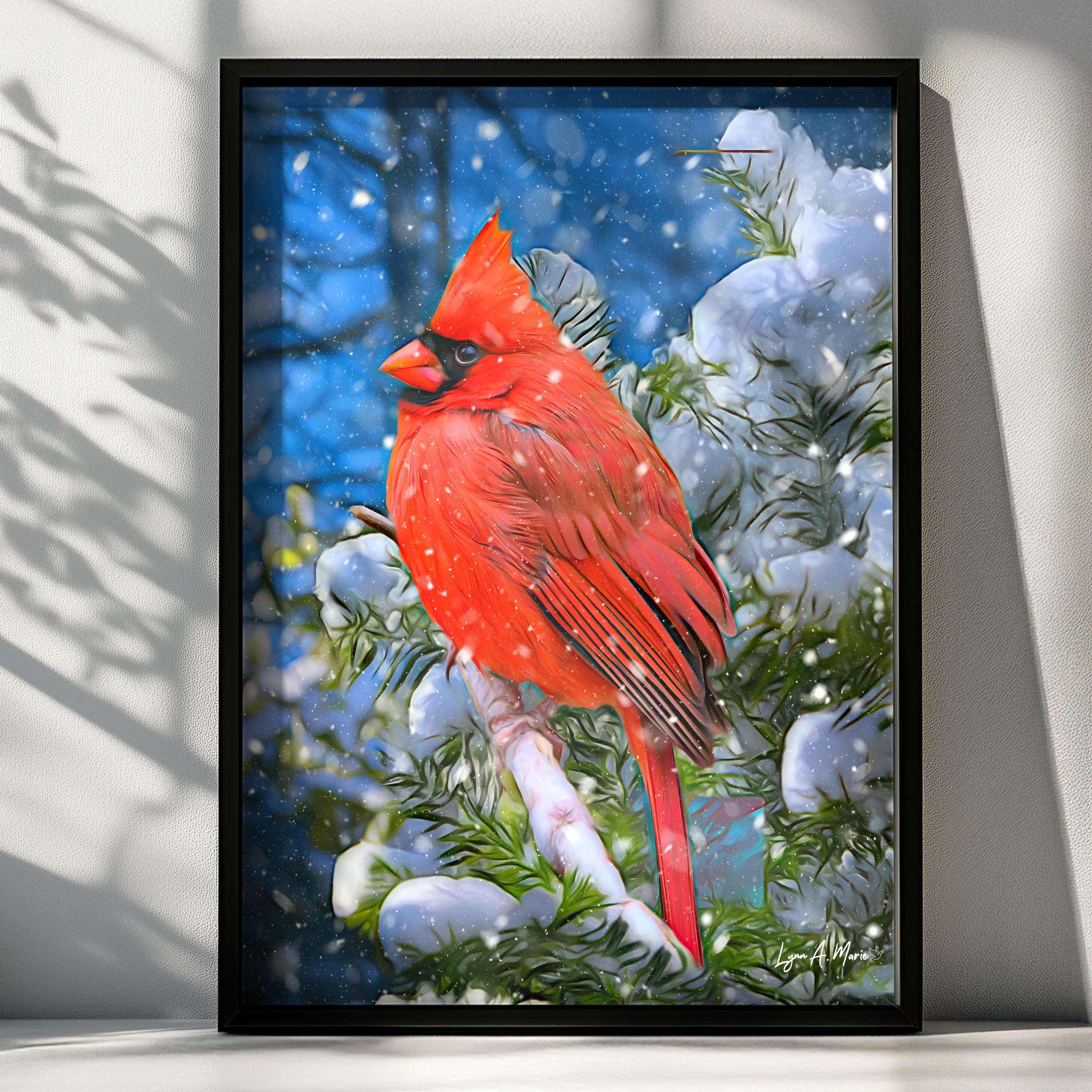 I created this piece to capture the quiet beauty of a real cardinal in nature, symbolizing warmth and resilience. My goal was to design elegant decor that brings the peaceful presence of birds into the home, making it a timeless addition to any living room wall as a gift for birdwatchers and bird lovers alike.