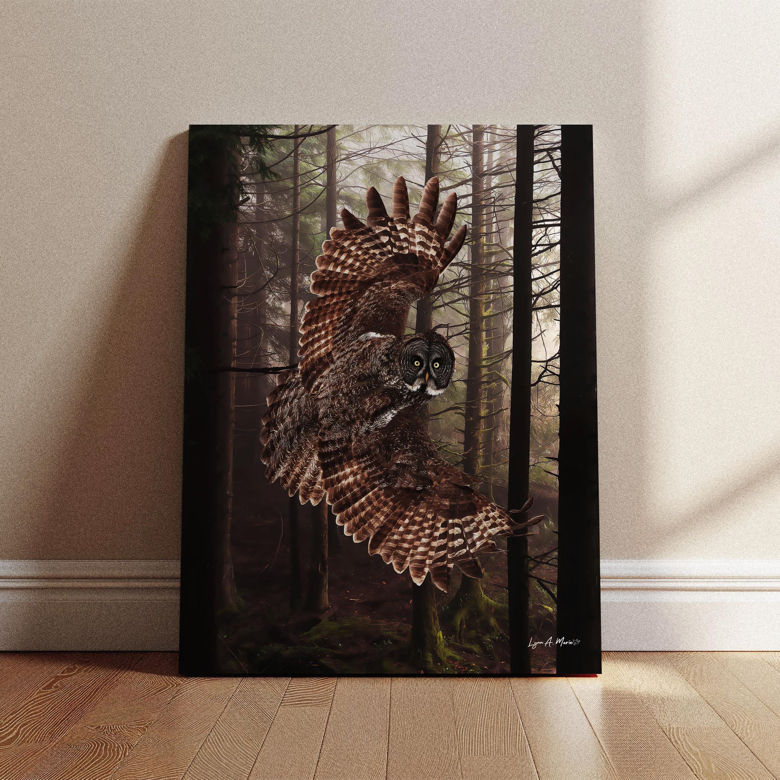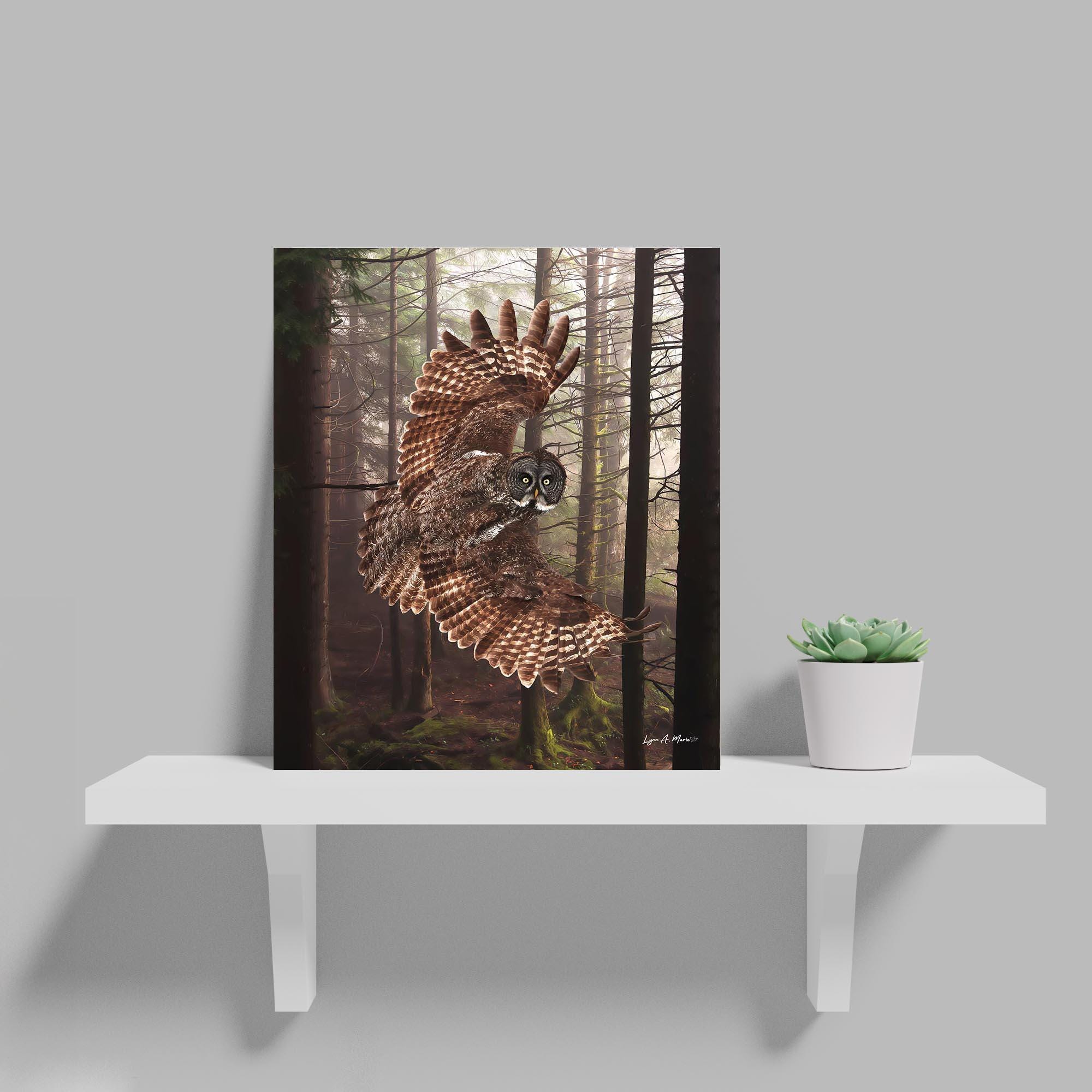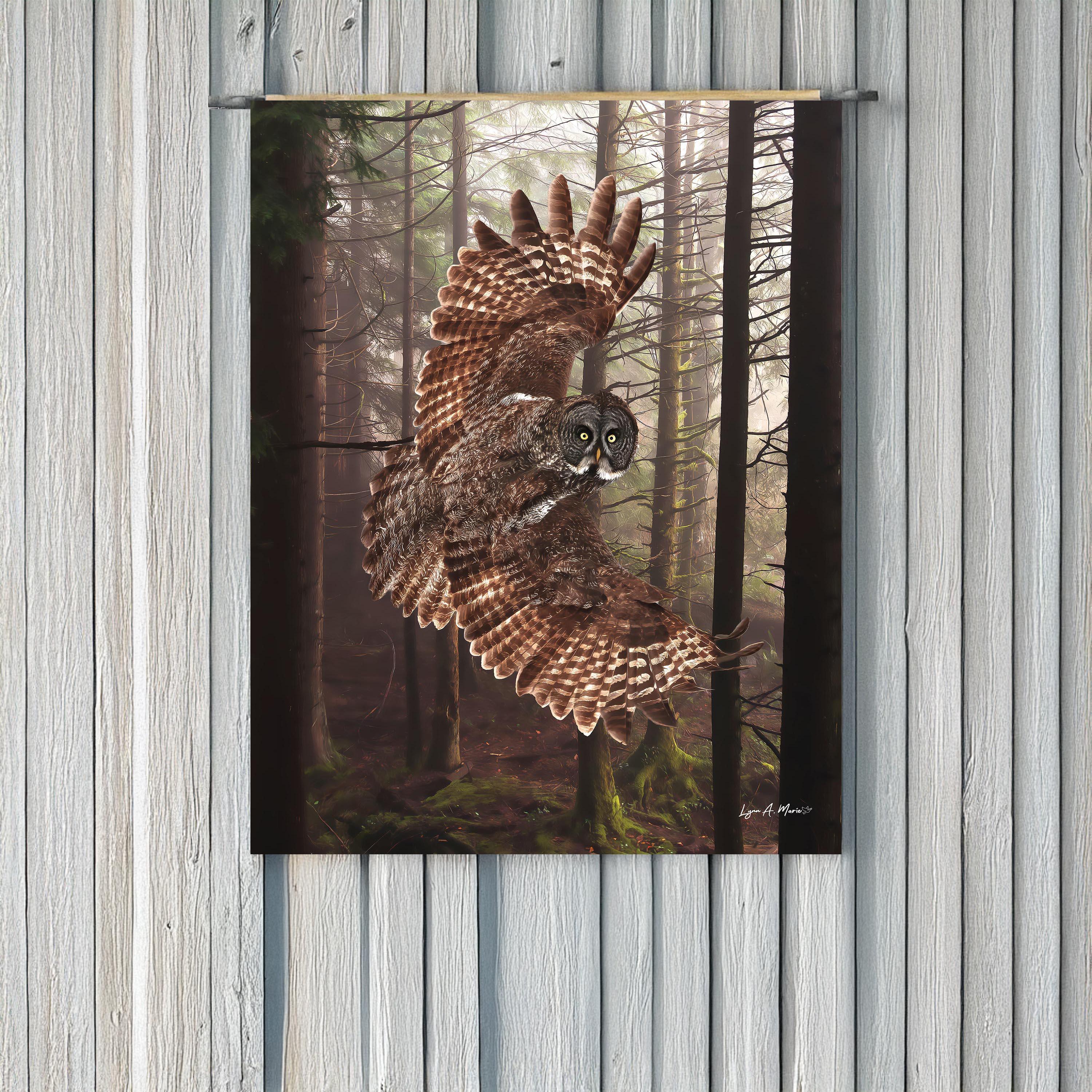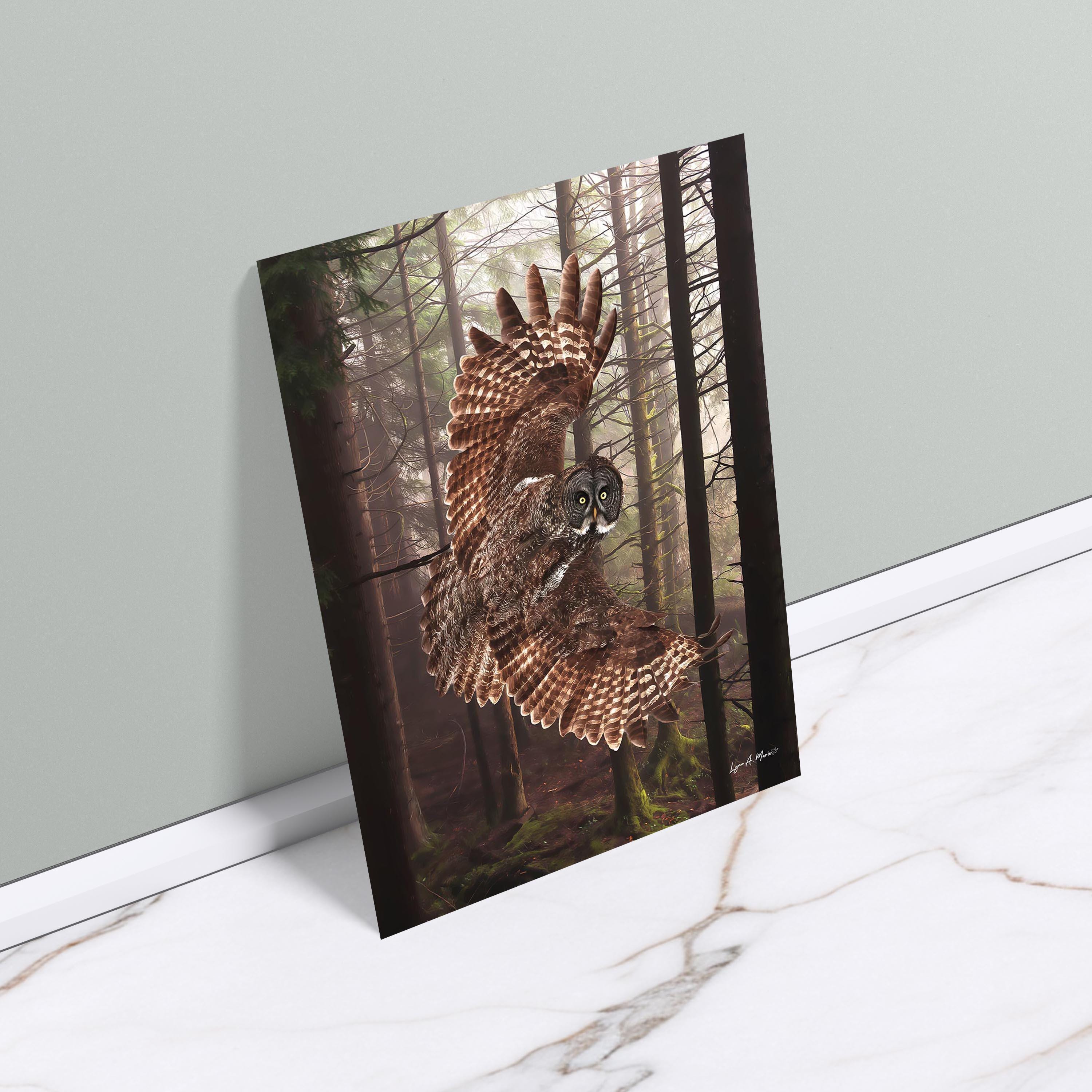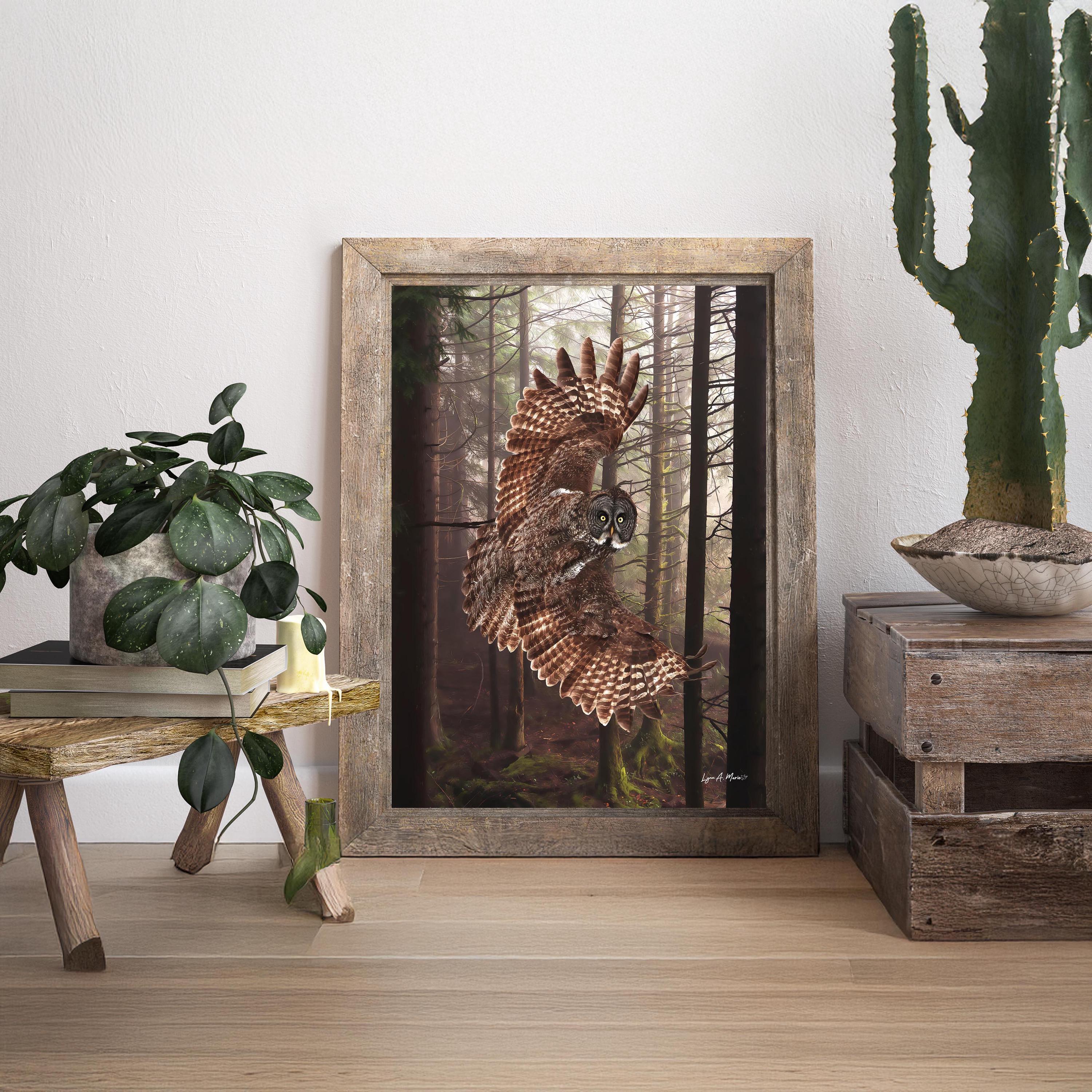 Bring the calm beauty of the woods into your home with this Great Gray Owl piece. This signed art print captures a serene forest landscape and makes stunning living room wall art, cabin art, or a unique gift for any nature lover. This detailed nature art work adds warmth and depth as rustic home décor while highlighting the quiet power of wildlife. Perfect for those who appreciate authentic wildlife artwork, peaceful landscape scenes, and standout owl decor. This timeless nature art print brings the wild straight into your space.