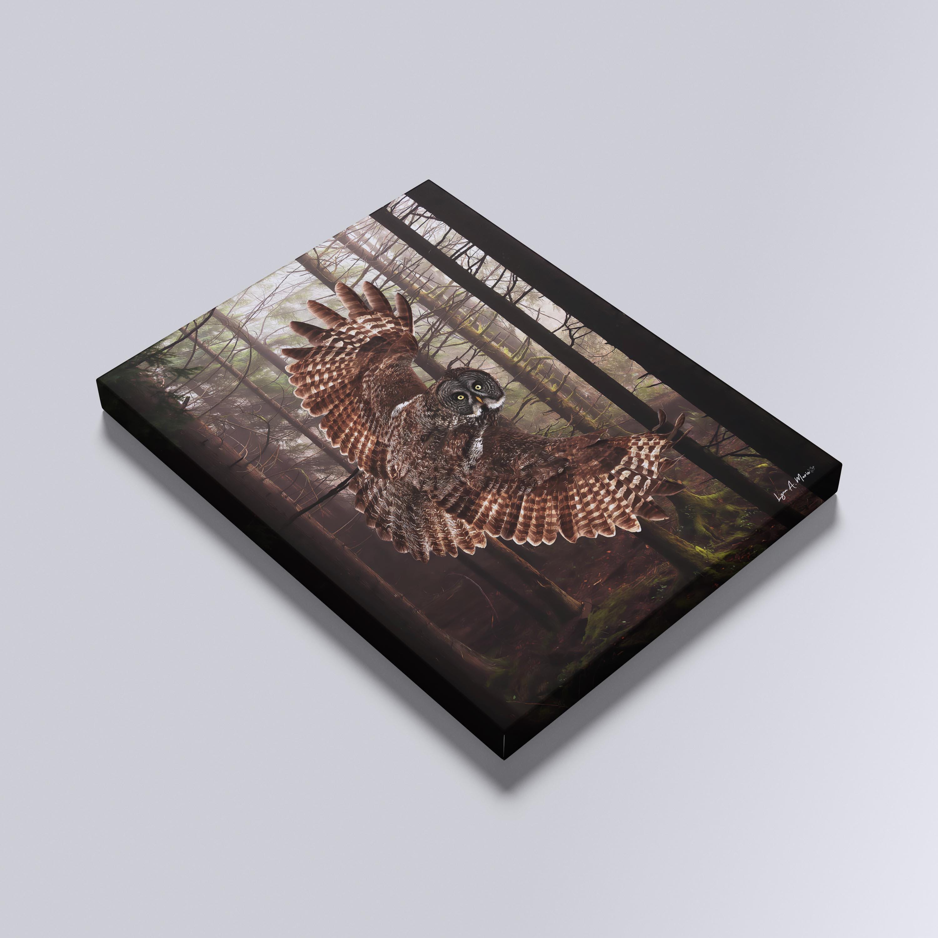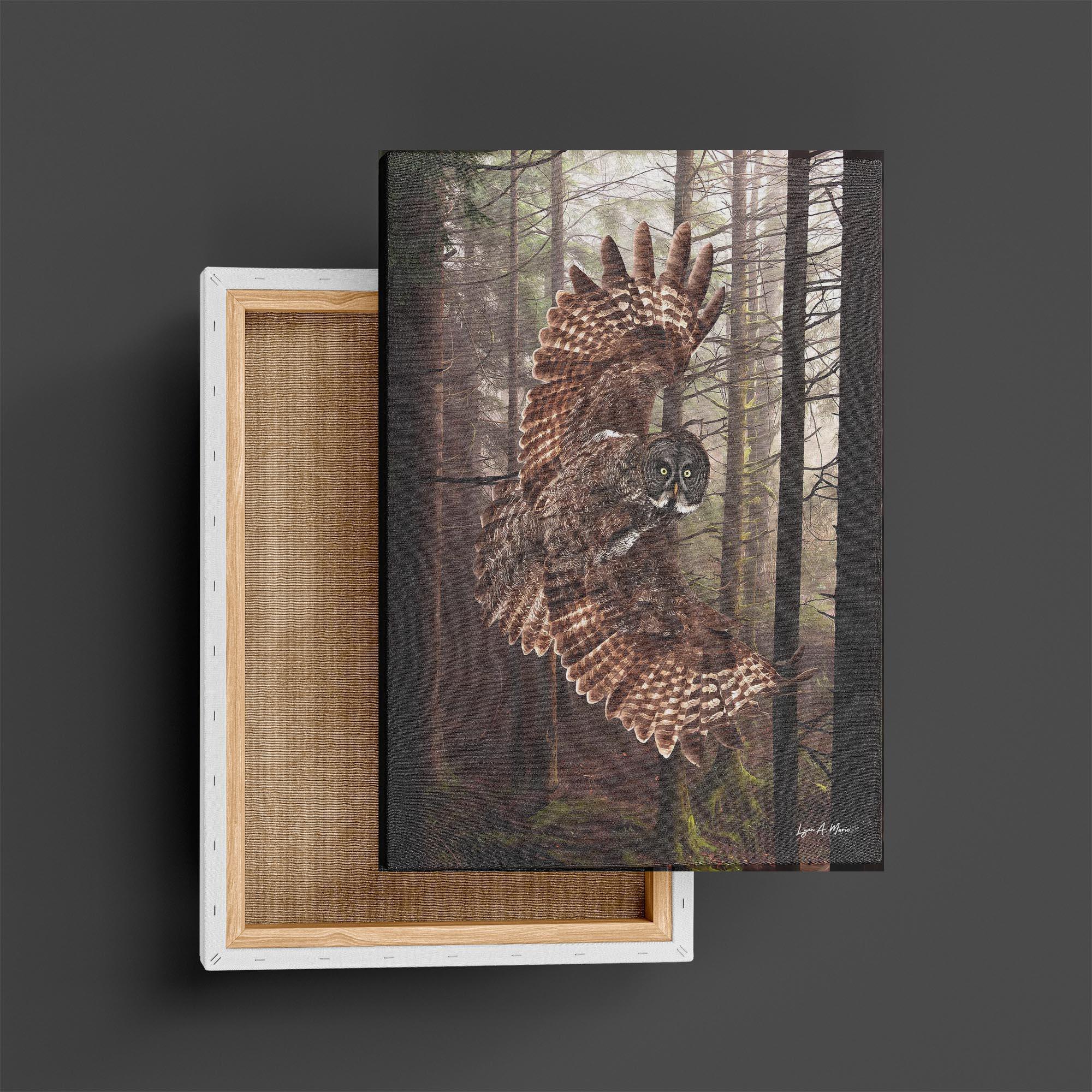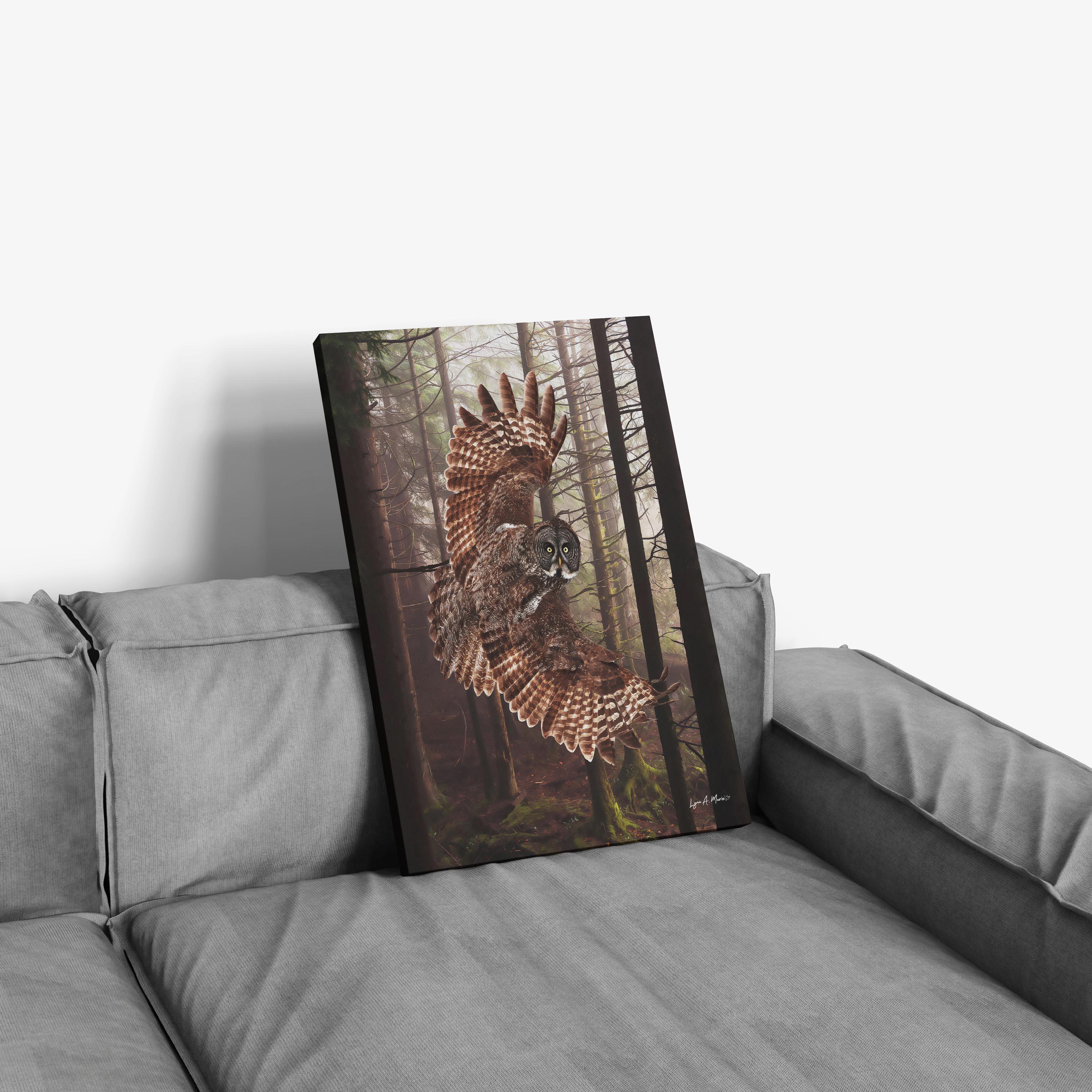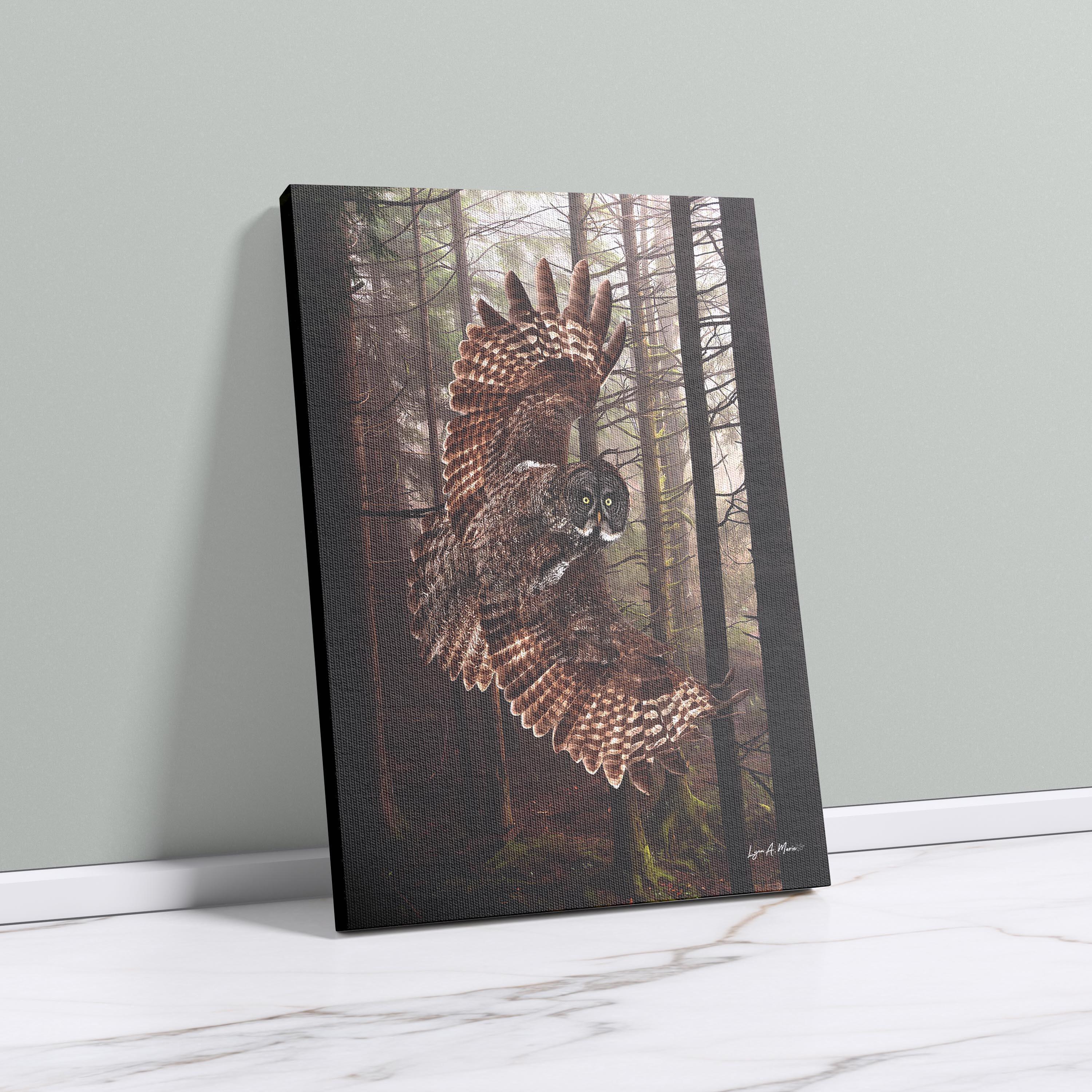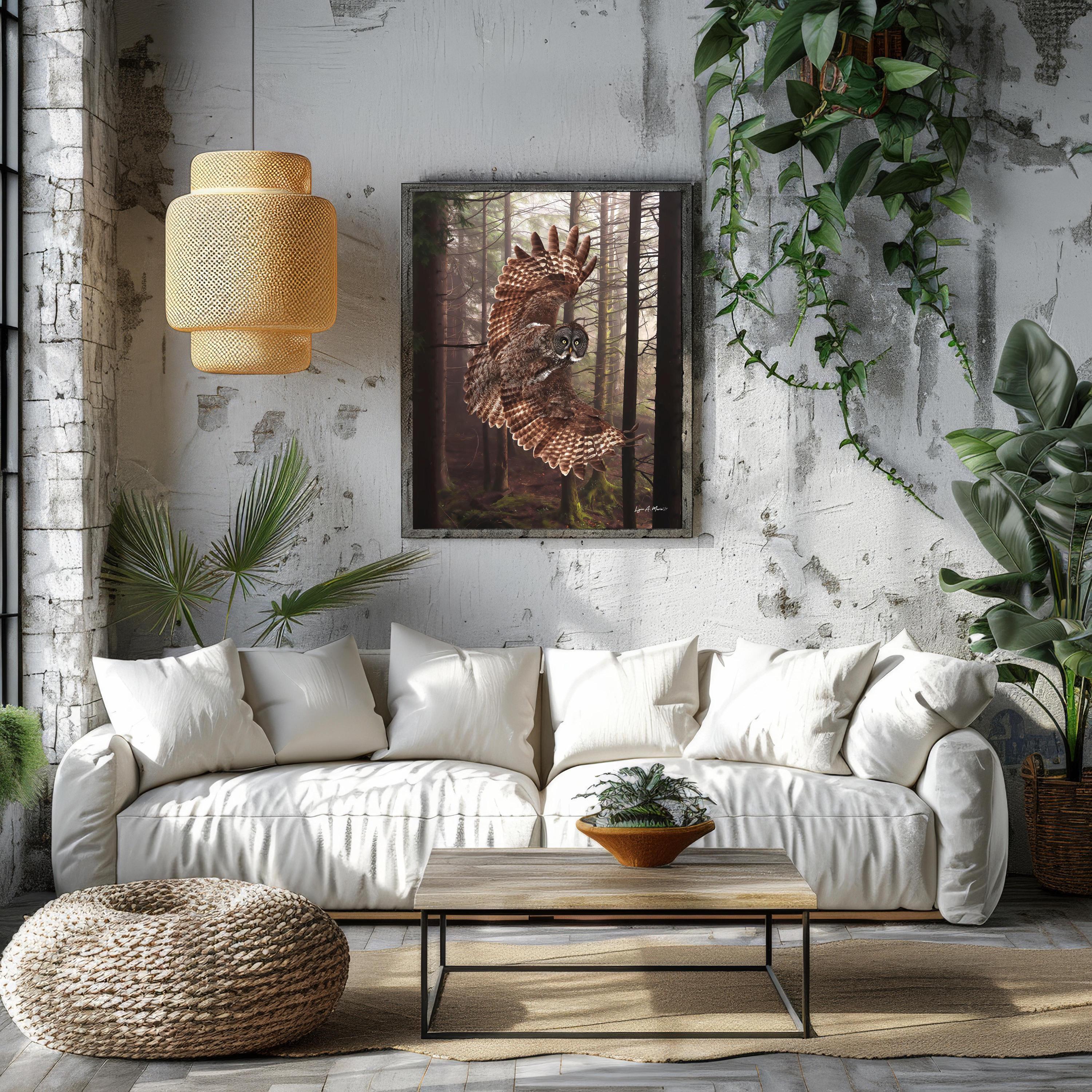 Bring the calm beauty of the woods into your home with this Great Gray Owl piece. This signed art print captures a serene forest landscape and makes stunning living room wall art, cabin art, or a unique gift for any nature lover. This detailed nature art work adds warmth and depth as rustic home décor while highlighting the quiet power of wildlife. Perfect for those who appreciate authentic wildlife artwork, peaceful landscape scenes, and standout owl decor. This timeless nature art print brings the wild straight into your space.