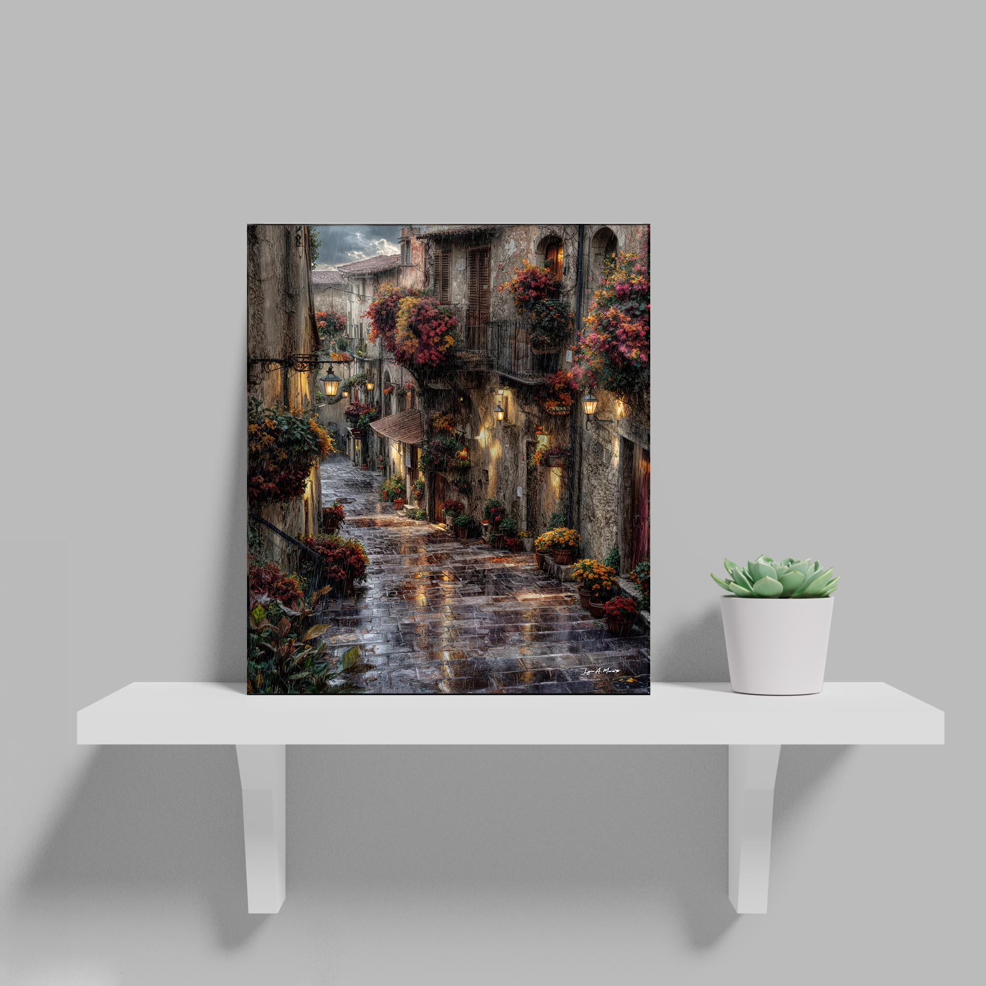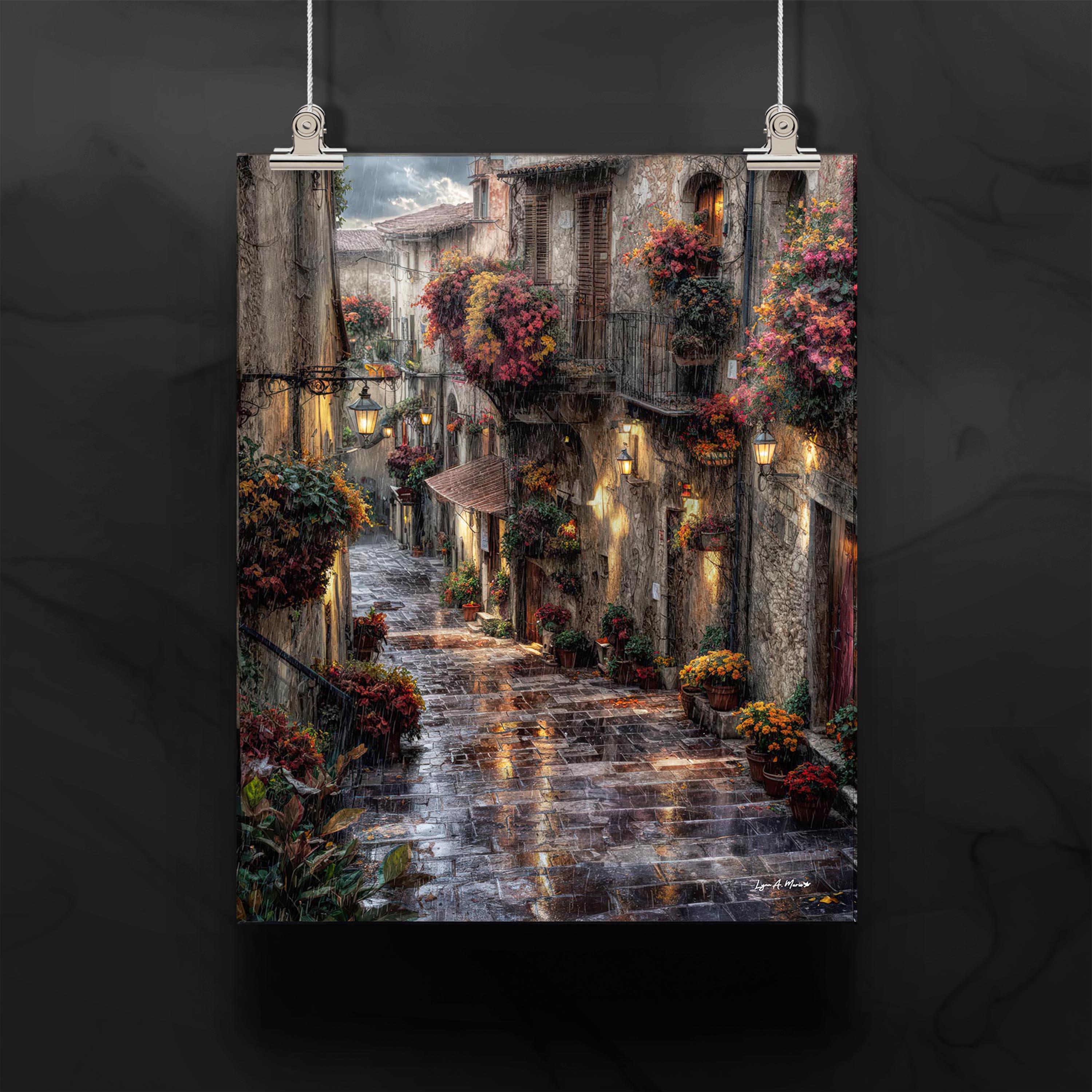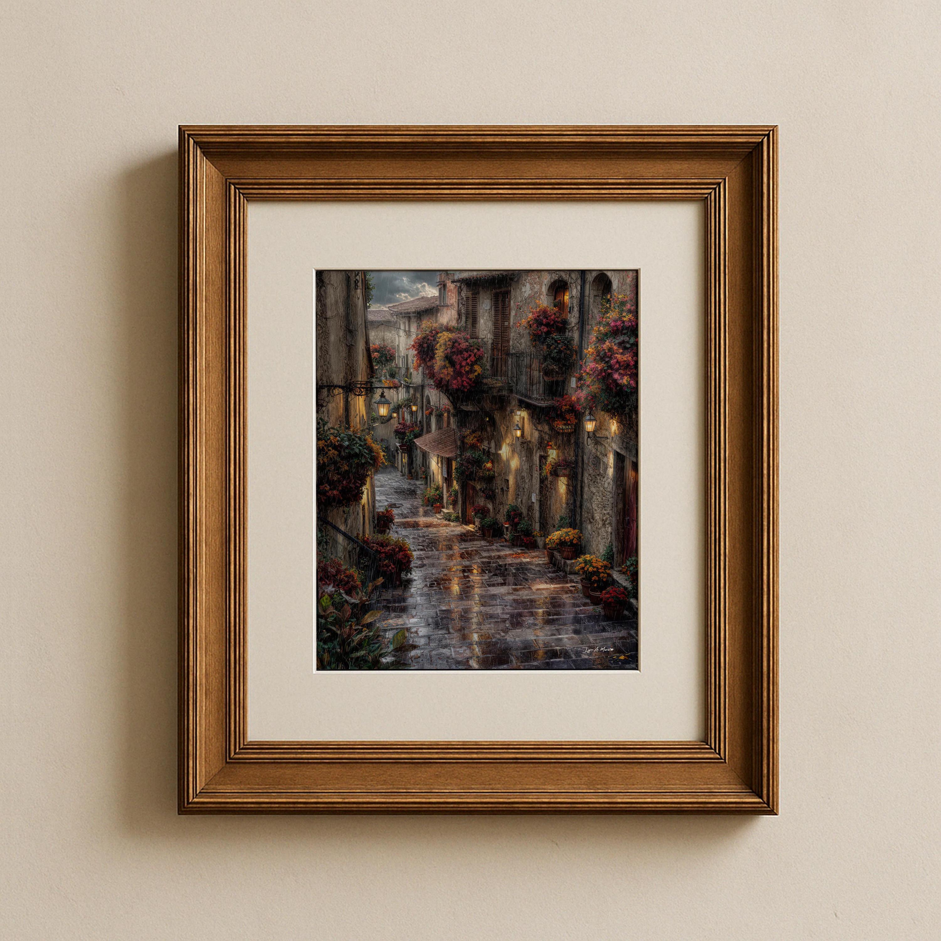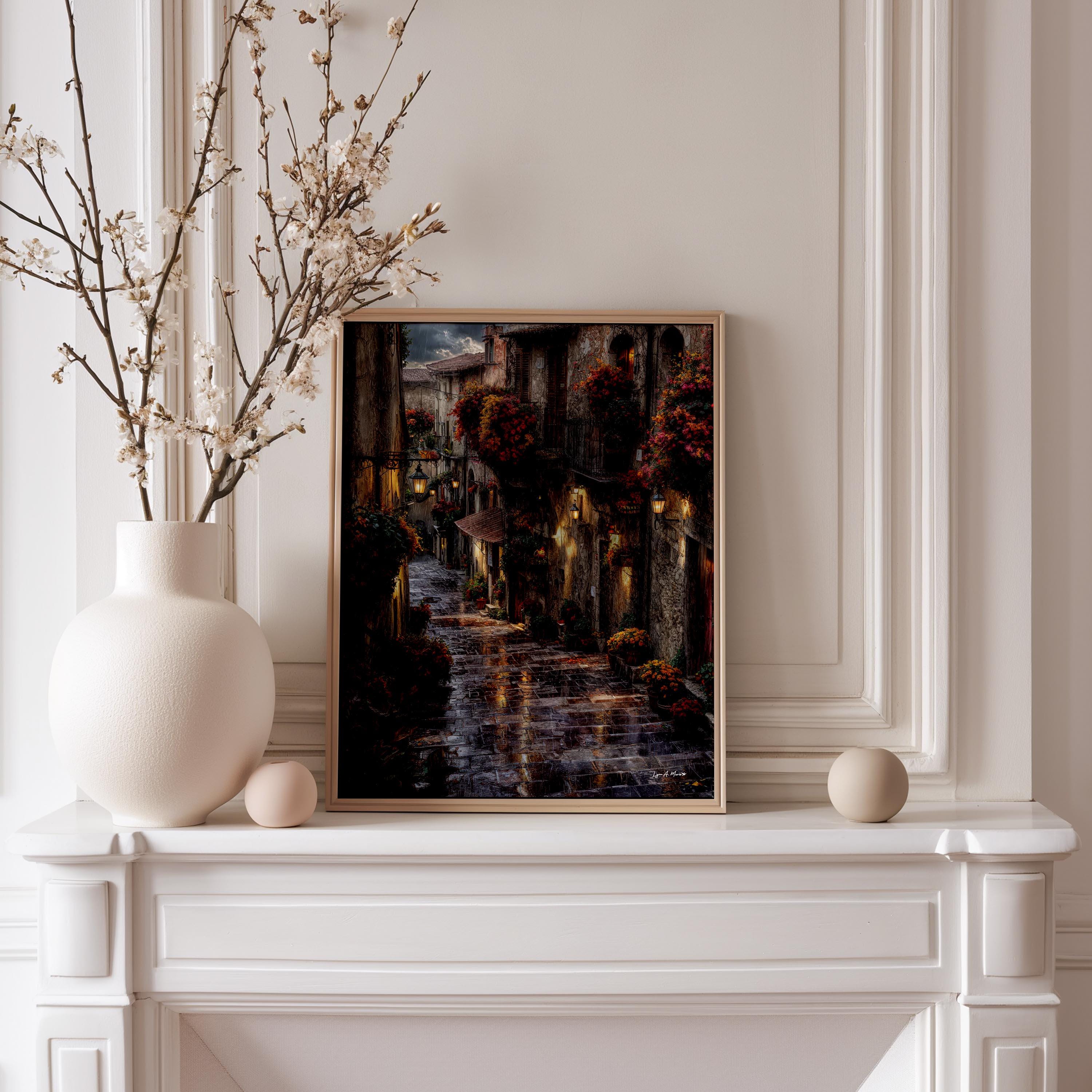 I created “Summer Rain” to capture the calm beauty of a rainy rustic street scene in an old European Italian village. The glowing lanterns, wet cobblestones, and bright balcony flowers inspired me to turn this moment into a signed art print for warm, cozy home decor and relaxing living room wall art. Digitally created by me, Lynn A Marie, it is not a AI generated art print. It’s perfect for anyone who loves autumn wall decor, rainy day artwork, and meaningful travel-inspired art.