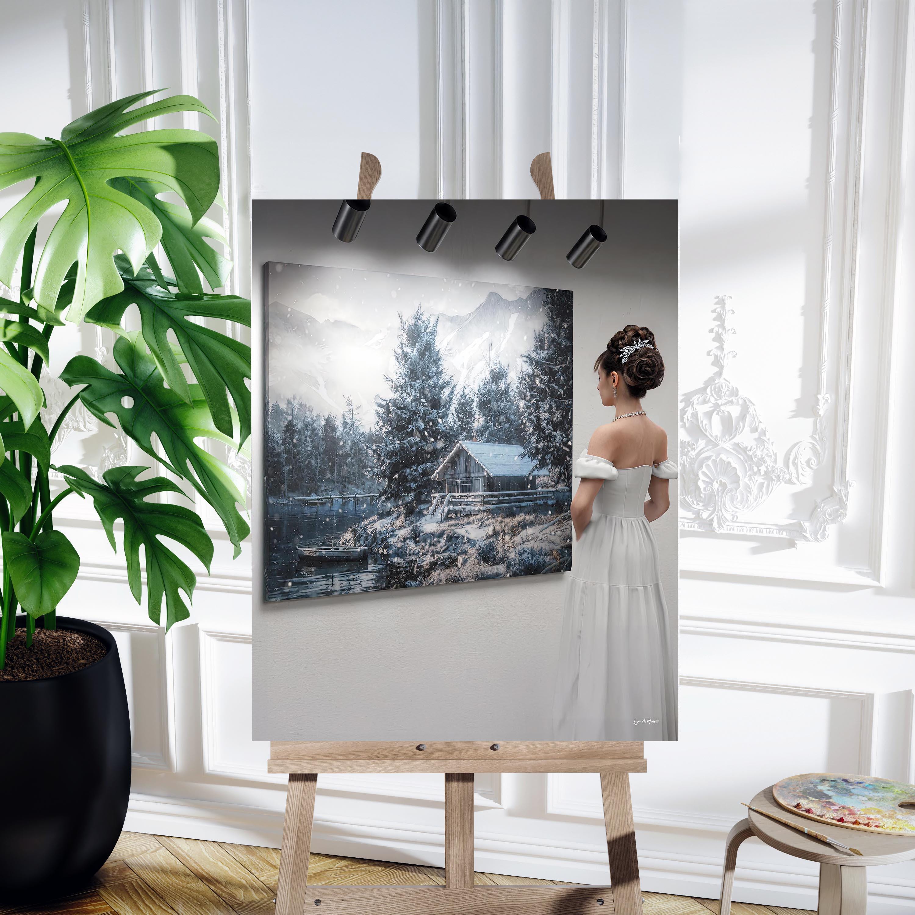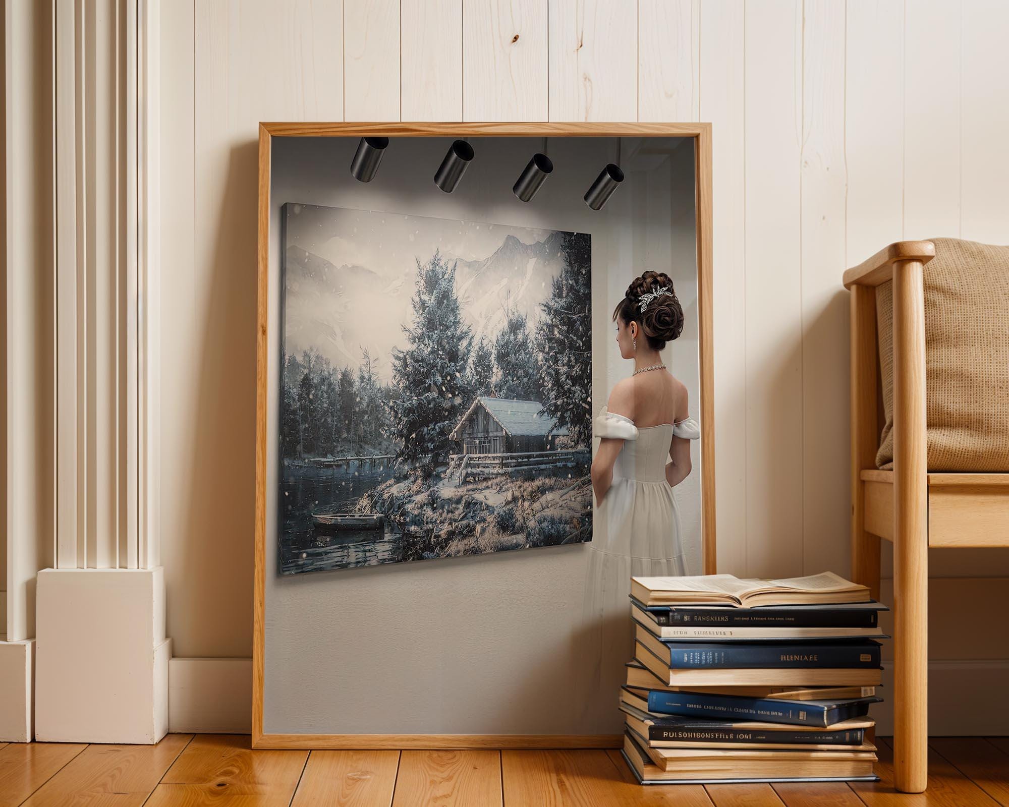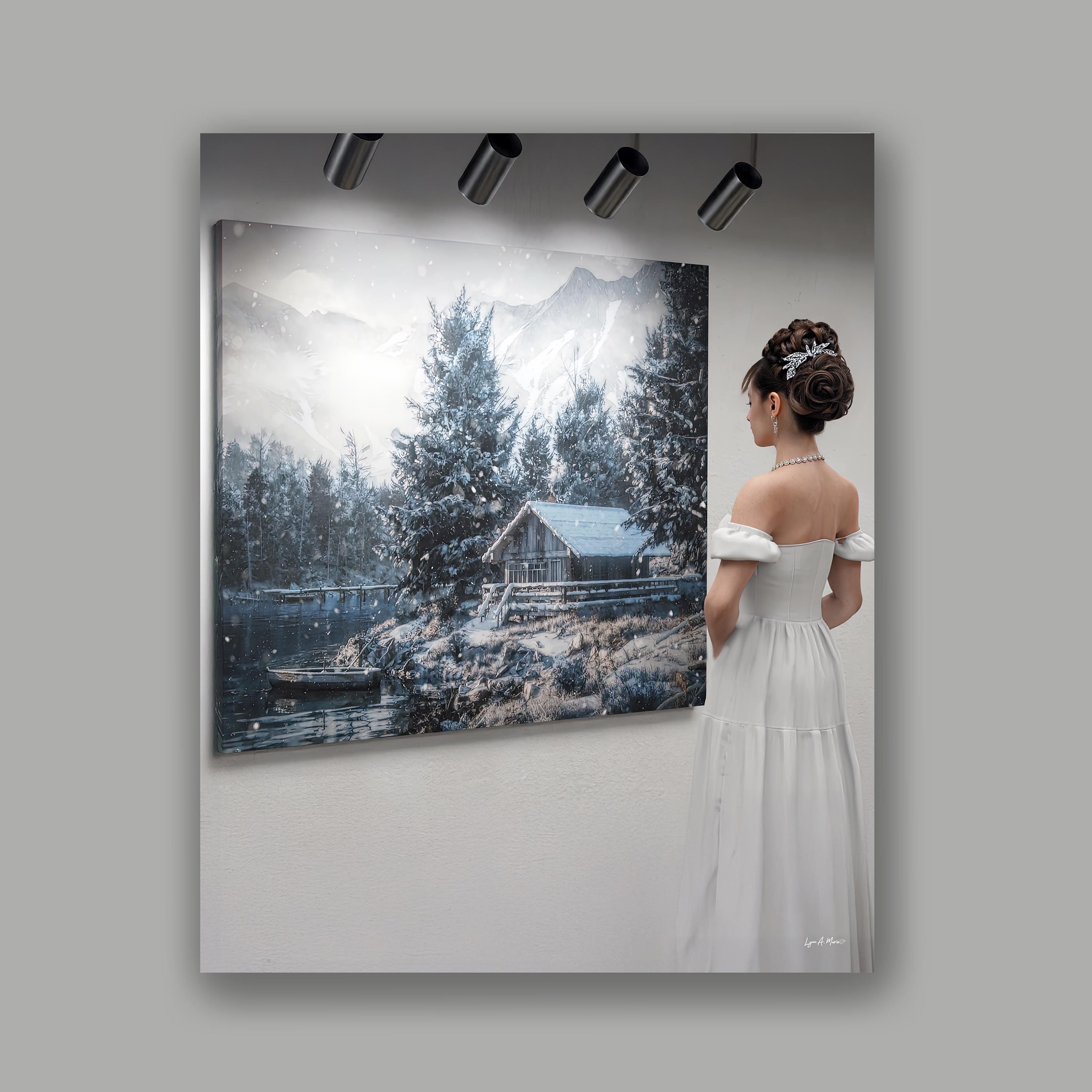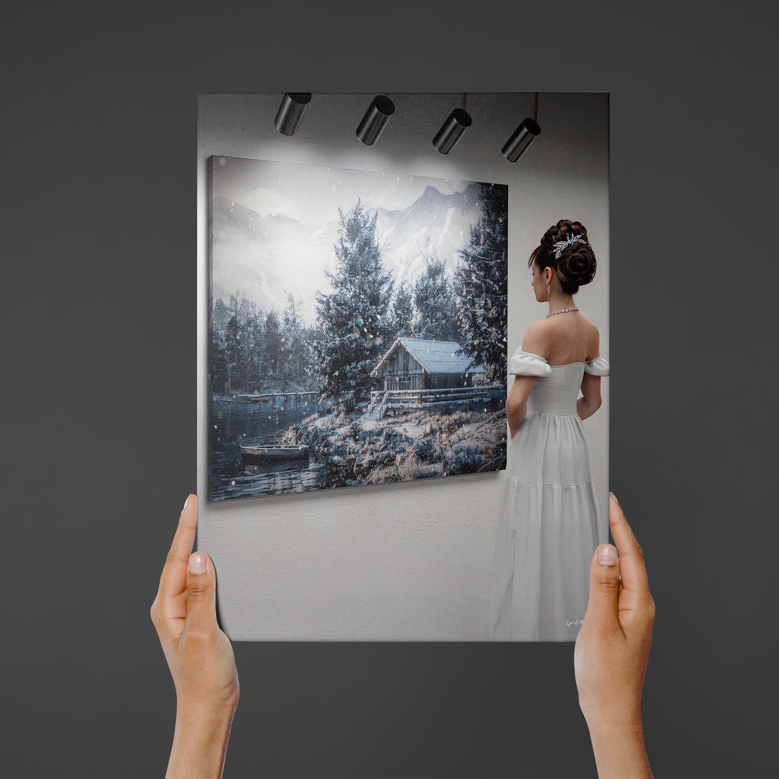 I made this to capture quiet winter peace—a snowy cabin by the lake you’d pause to admire in an art gallery, and want to bring that calm home.