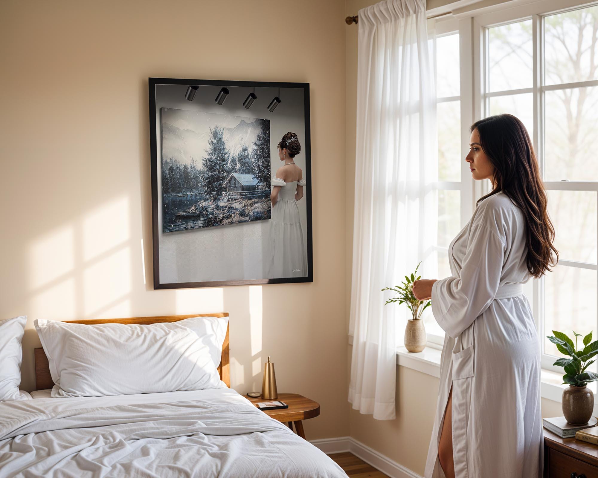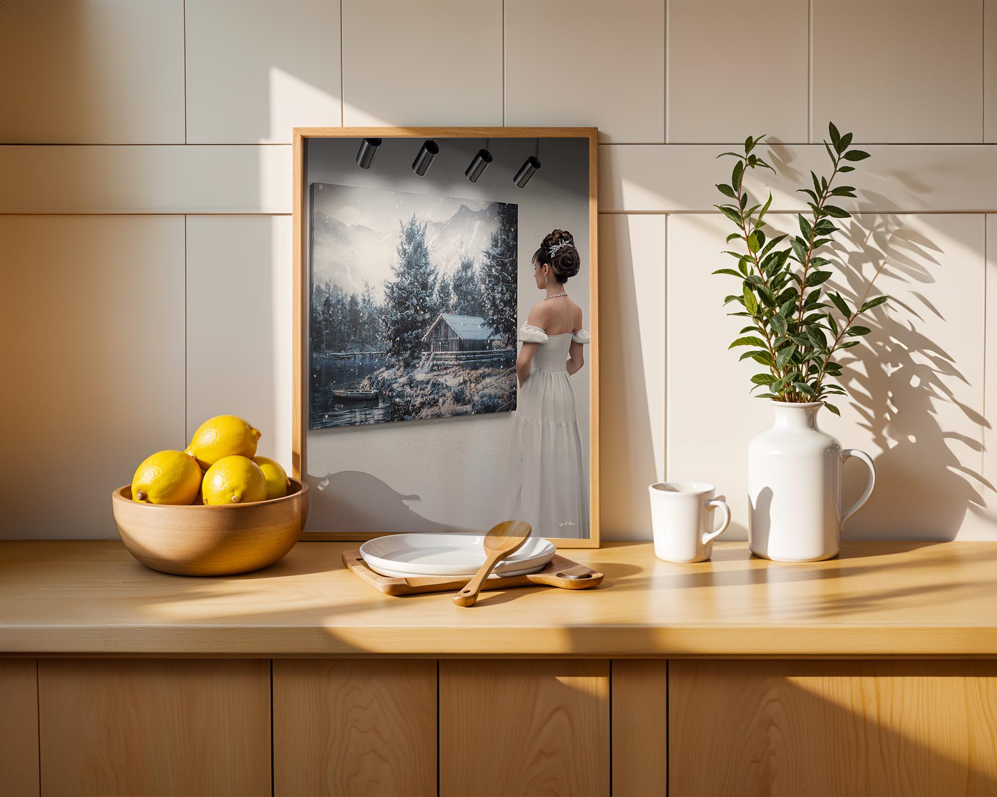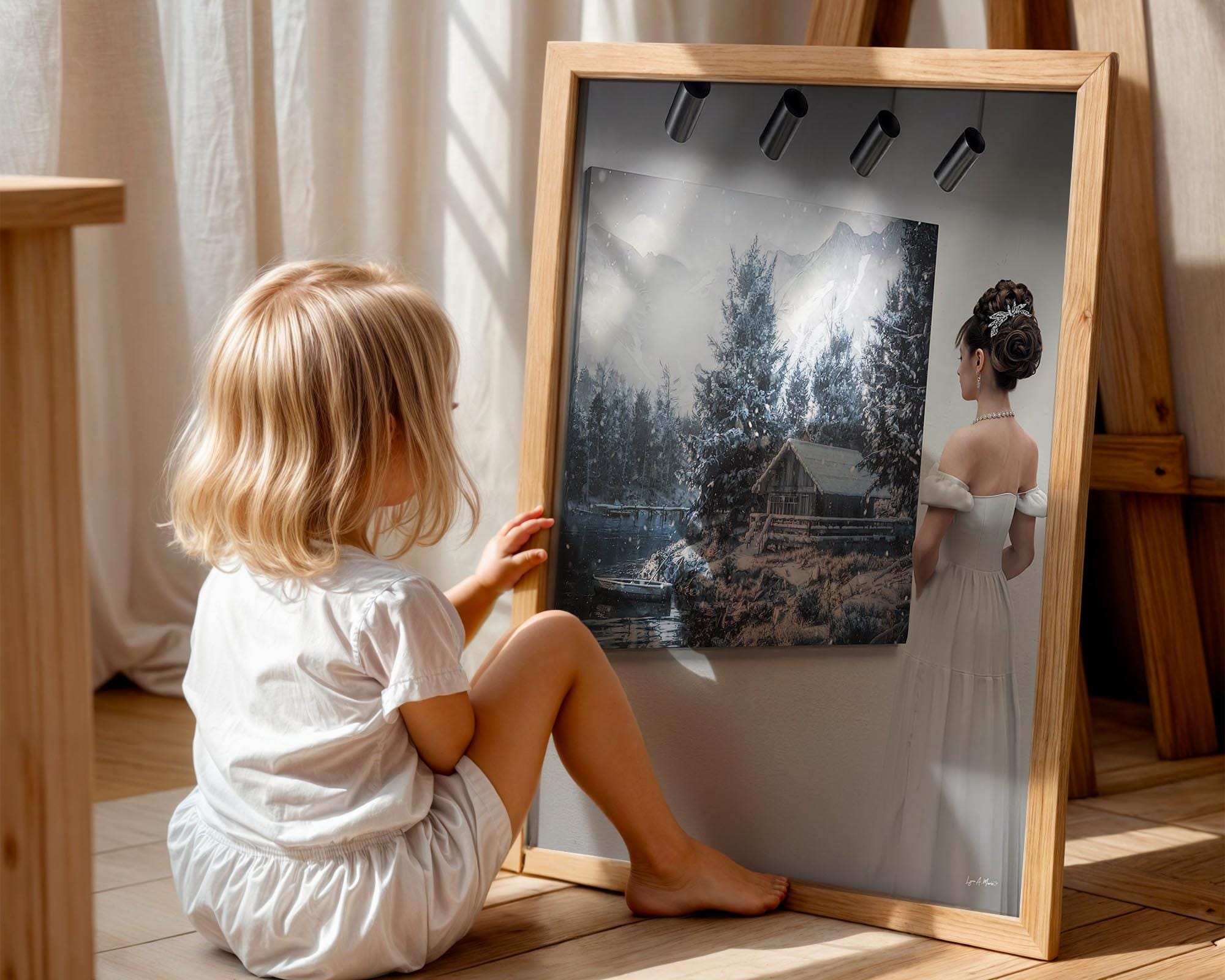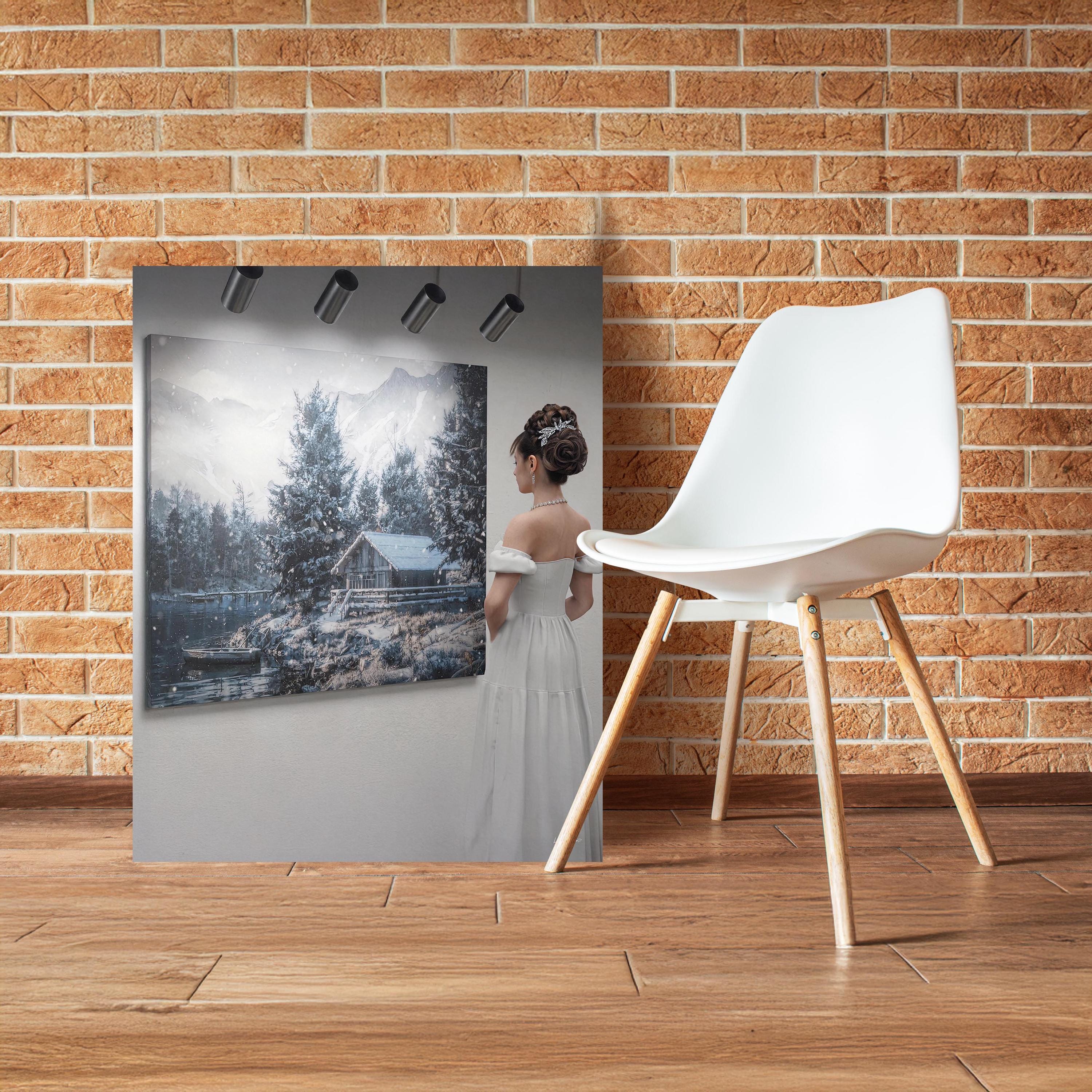 I made this to capture quiet winter peace—a snowy cabin by the lake you’d pause to admire in an art gallery, and want to bring that calm home.