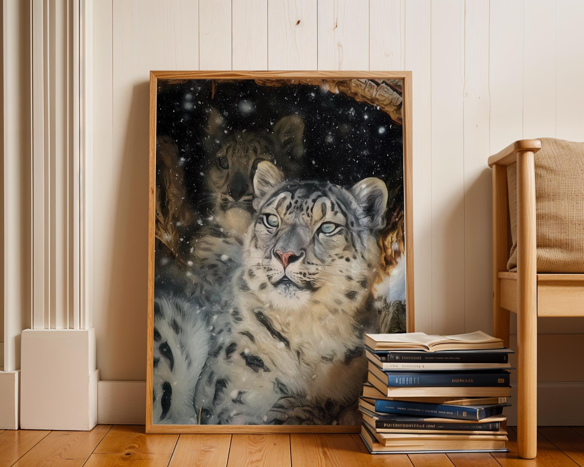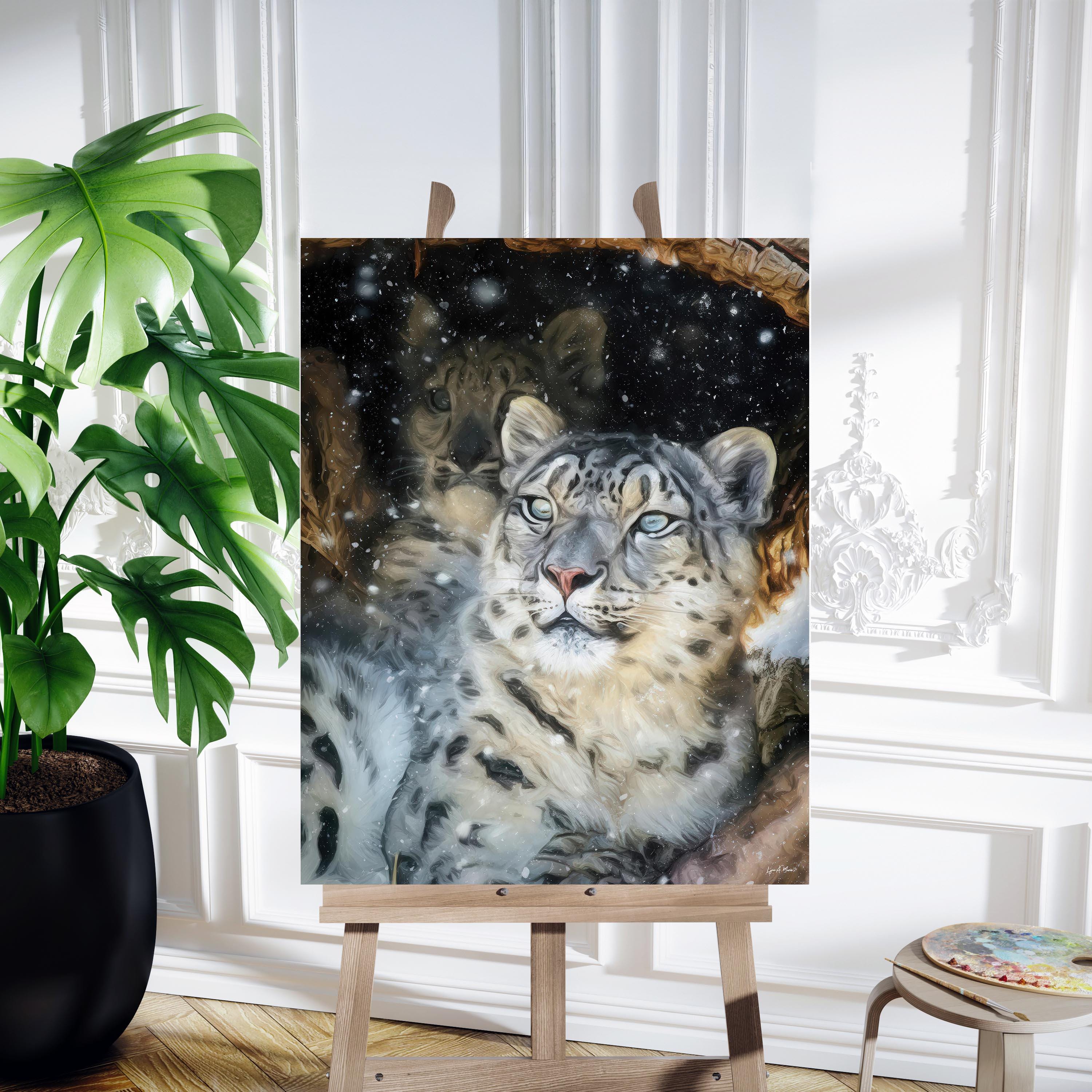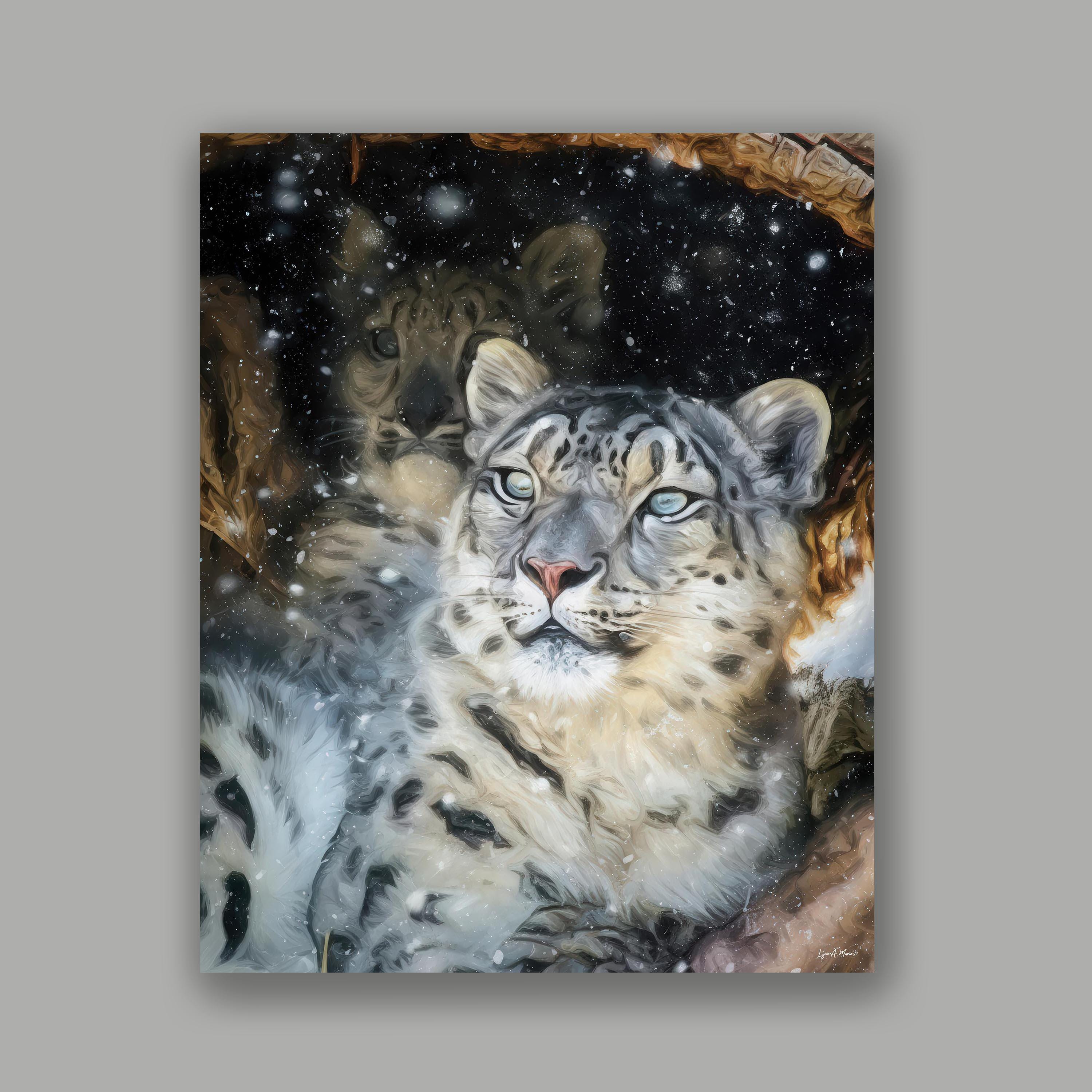 This piece celebrates the rare beauty of an endangered snow leopard and her young. The calm, watchful gaze and falling snow highlight both their strength and their fragile future. I hope it brings a quiet reminder to care for the wild places they call home.