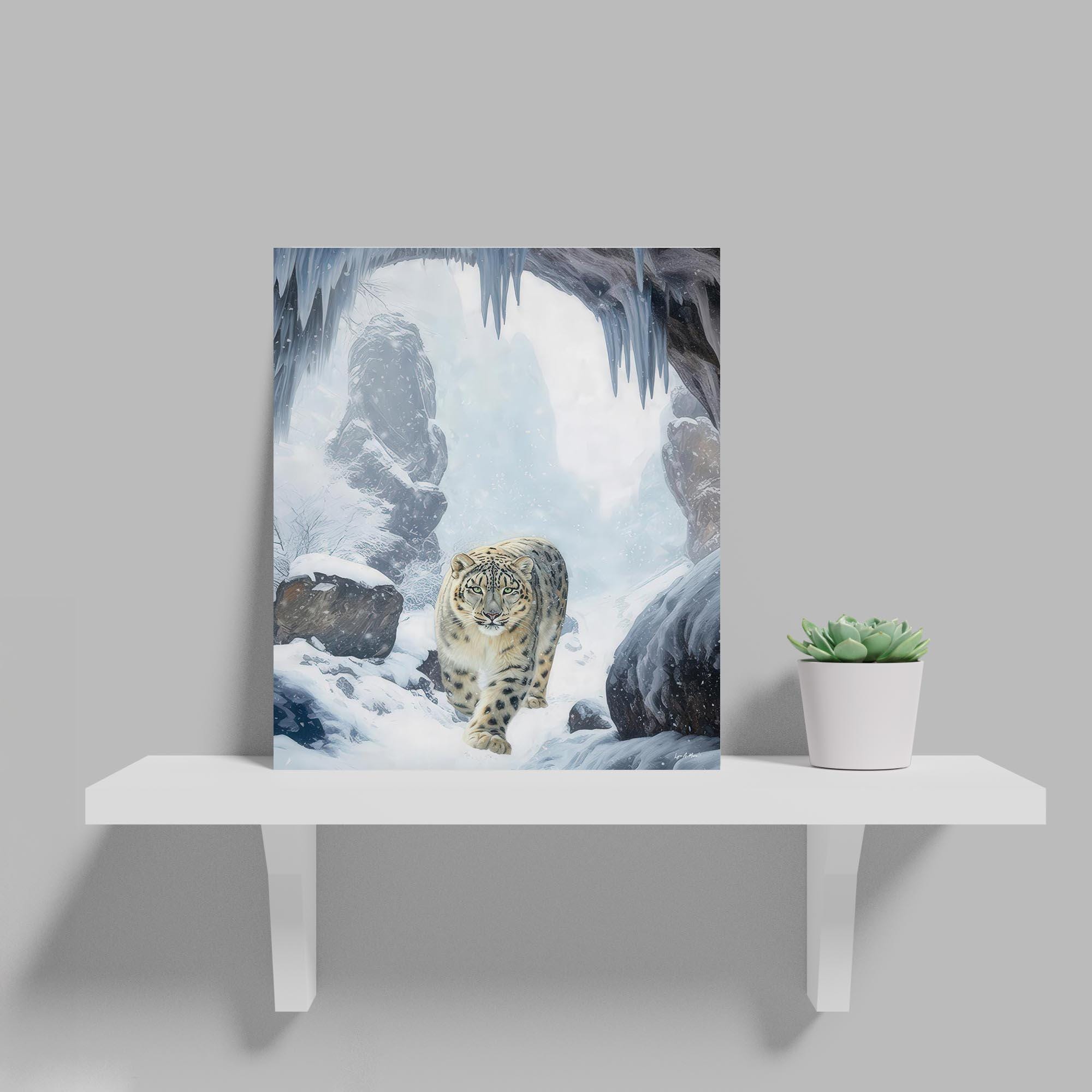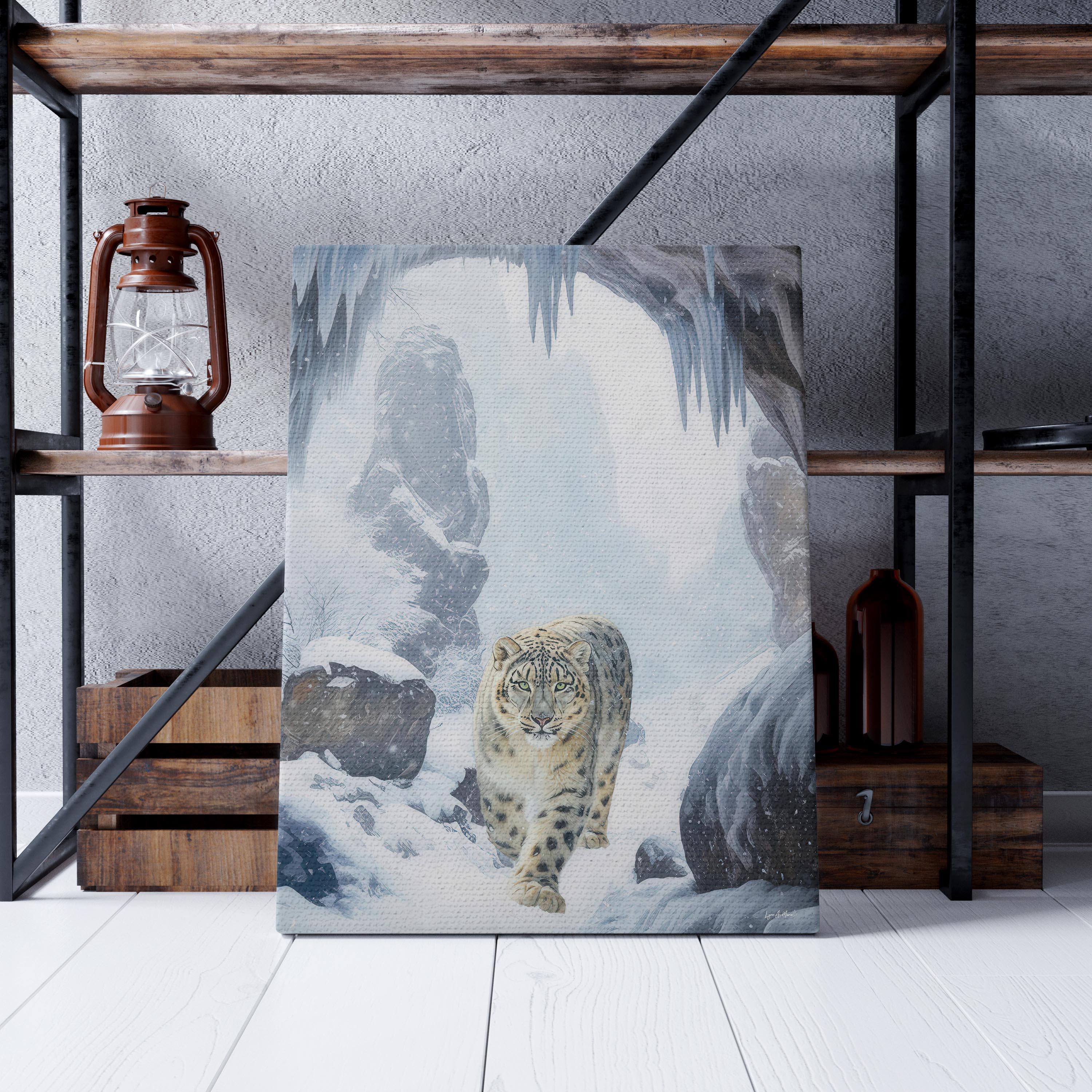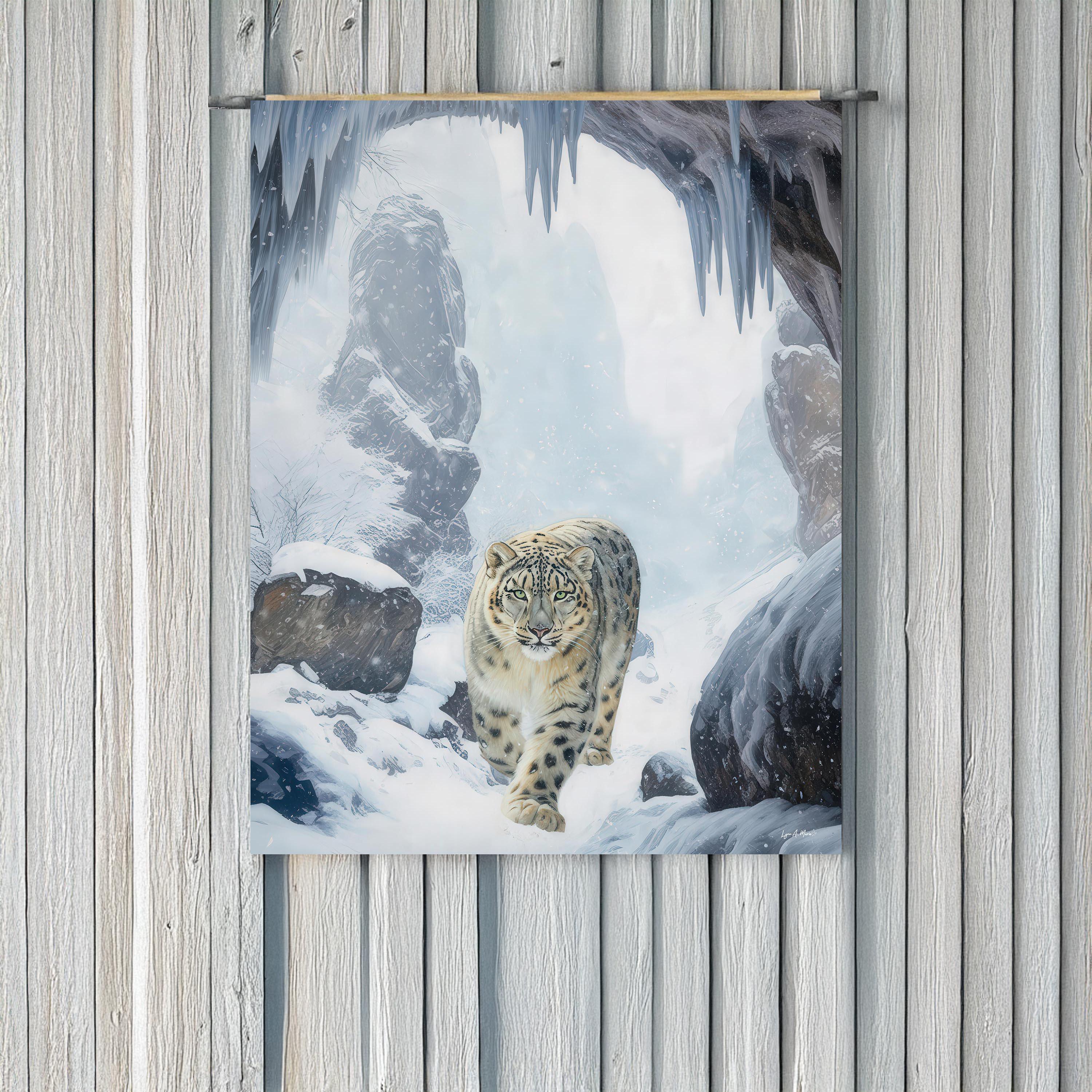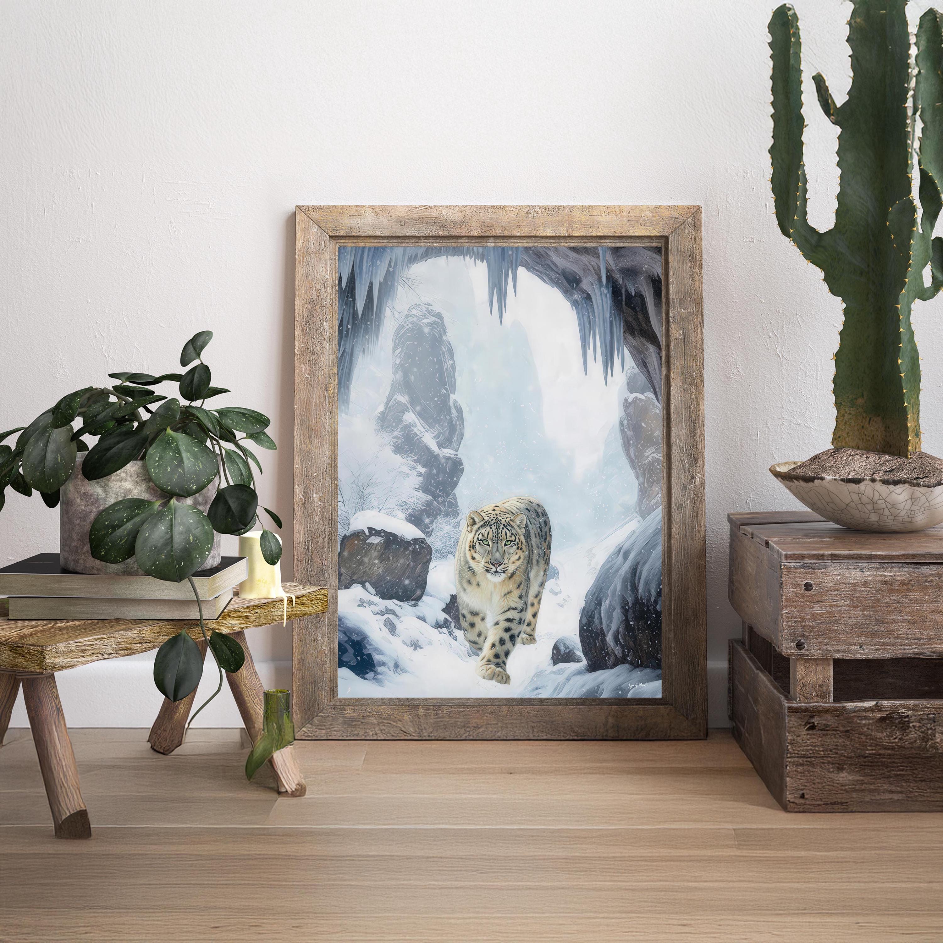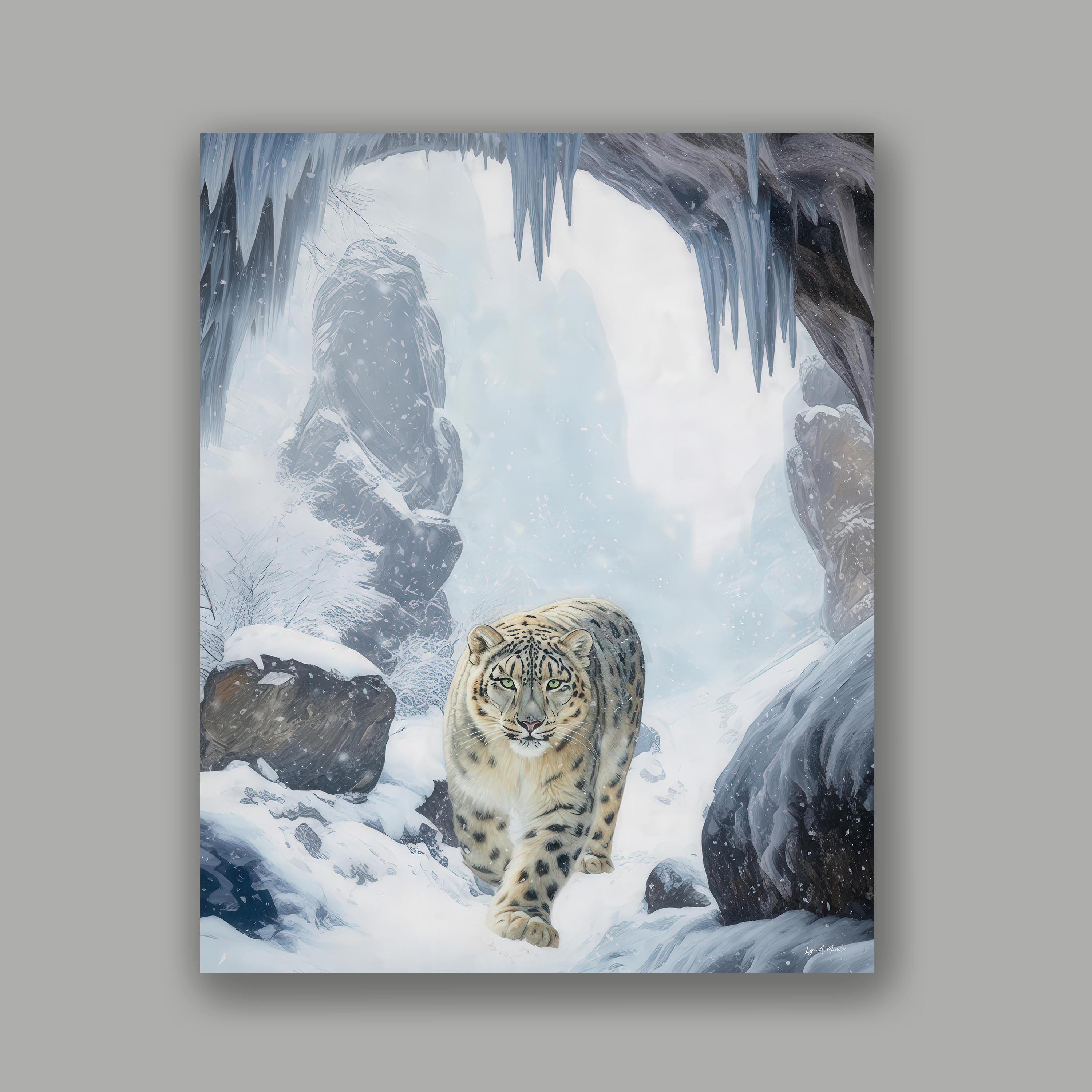 This piece celebrates the resilience of an endangered snow leopard moving through its icy home. The cool tones and steady gaze are meant to bring calm, wild energy into your space while reminding us to protect the habitats that keep these cats alive.