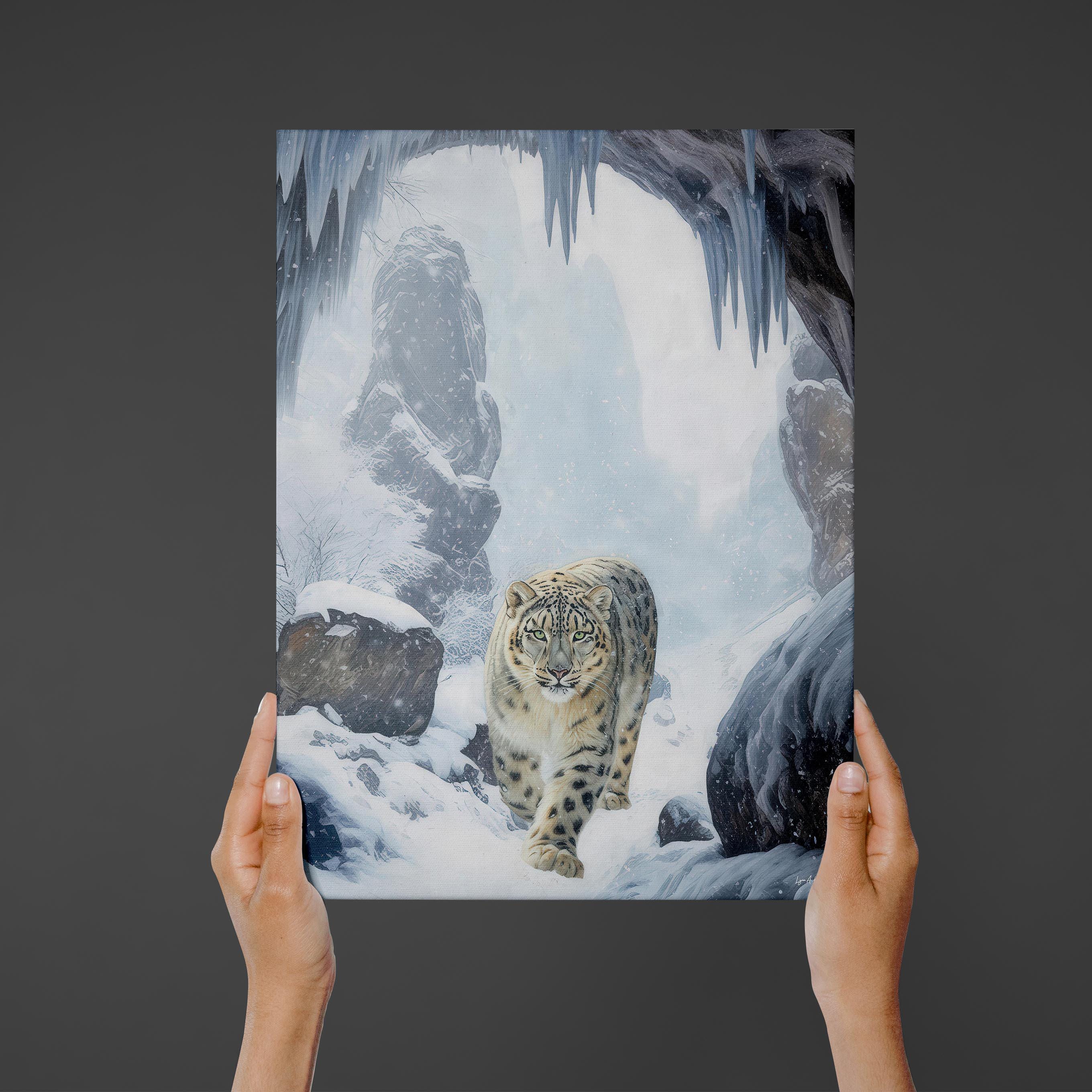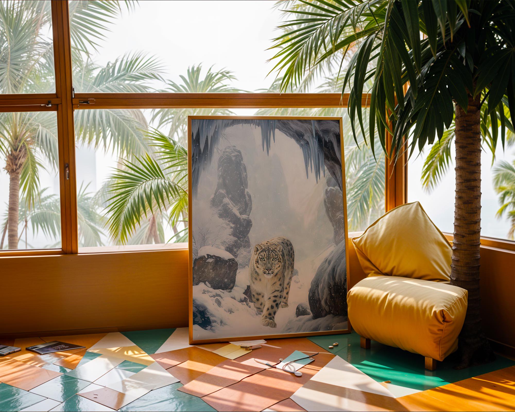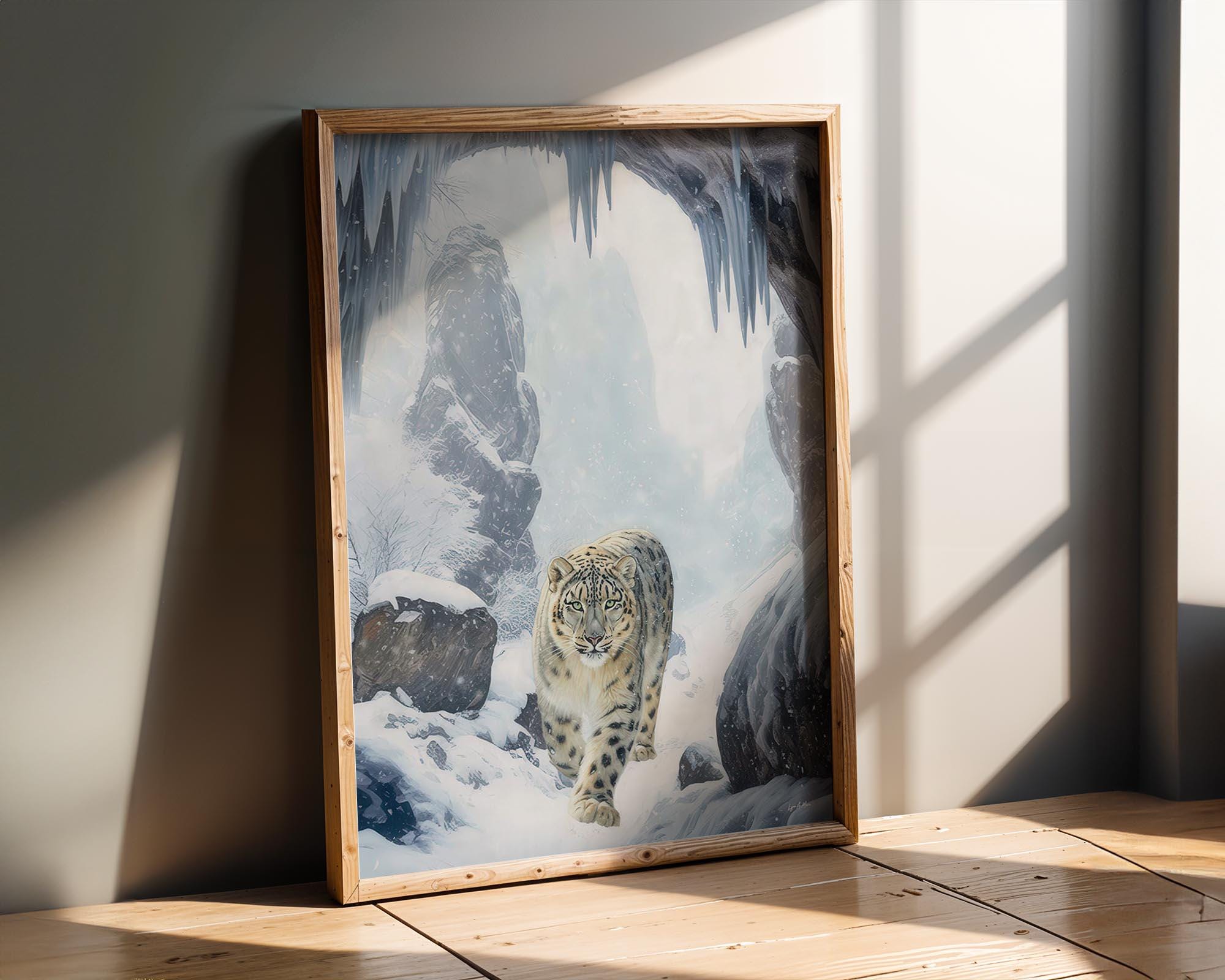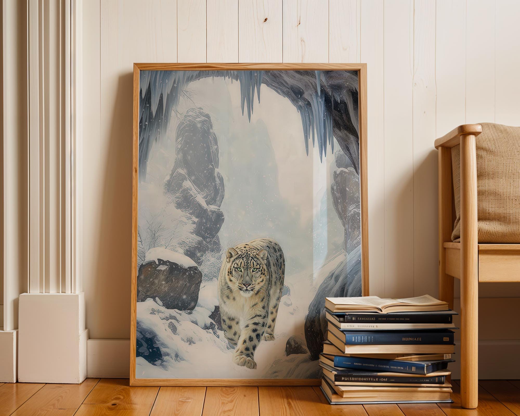 This piece celebrates the resilience of an endangered snow leopard moving through its icy home. The cool tones and steady gaze are meant to bring calm, wild energy into your space while reminding us to protect the habitats that keep these cats alive.