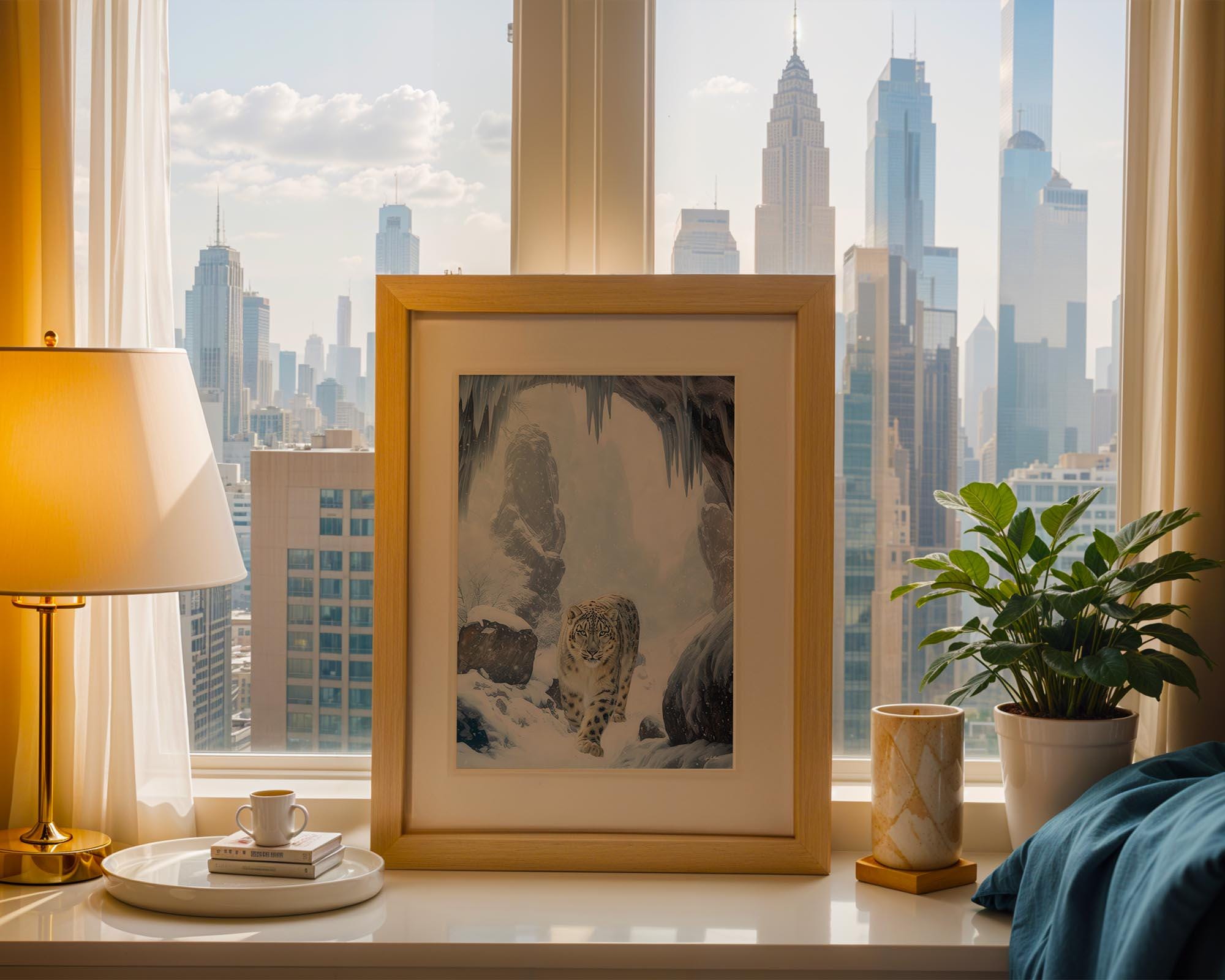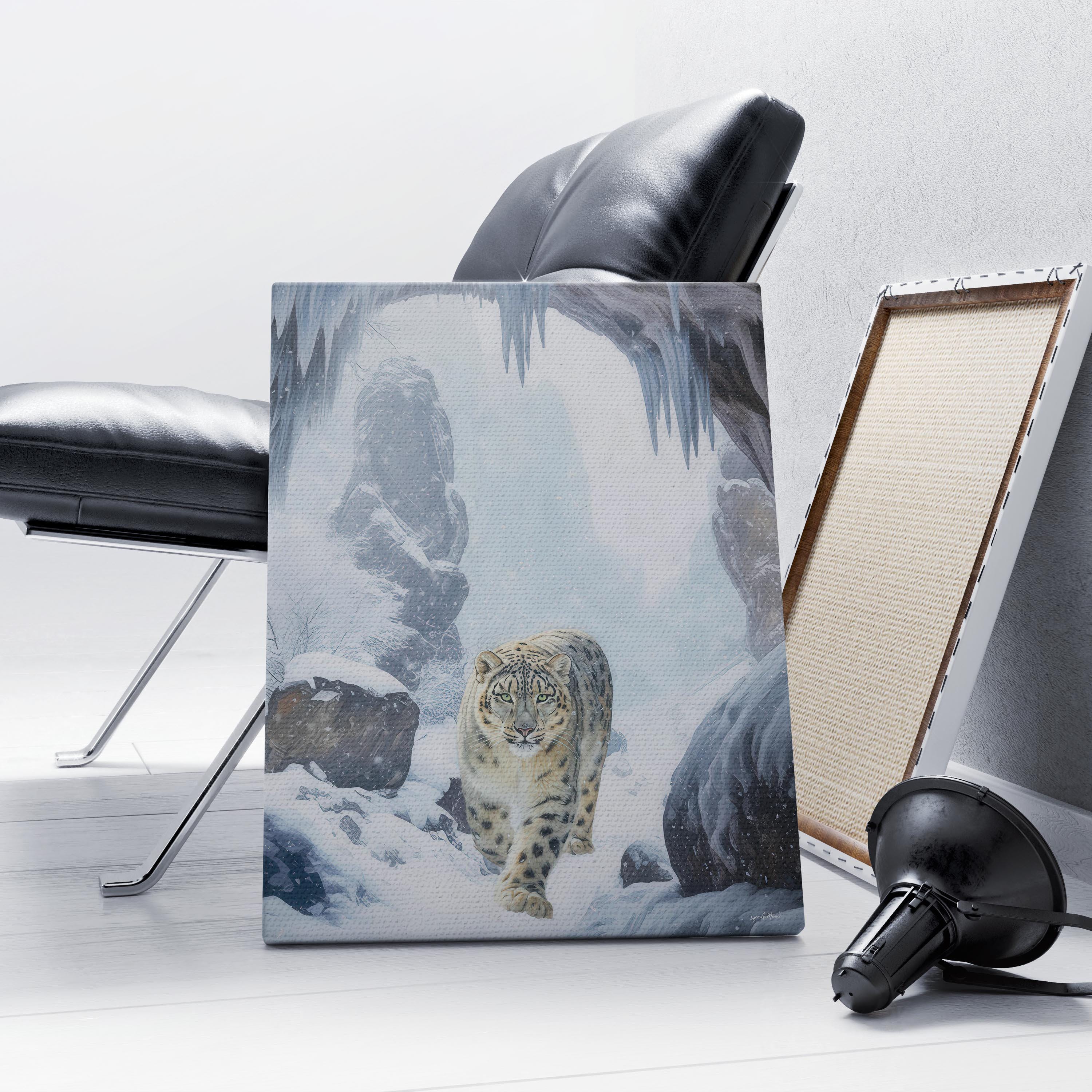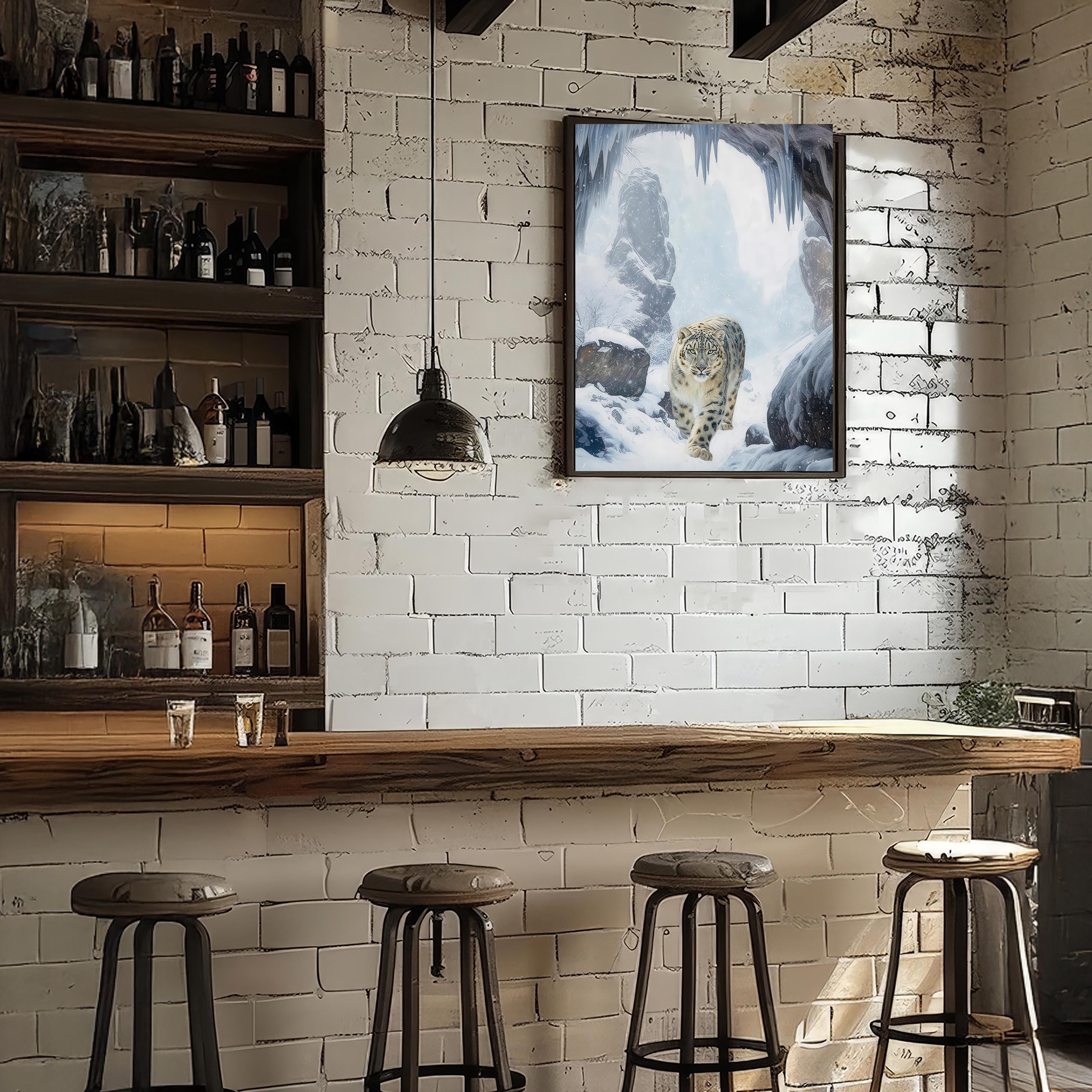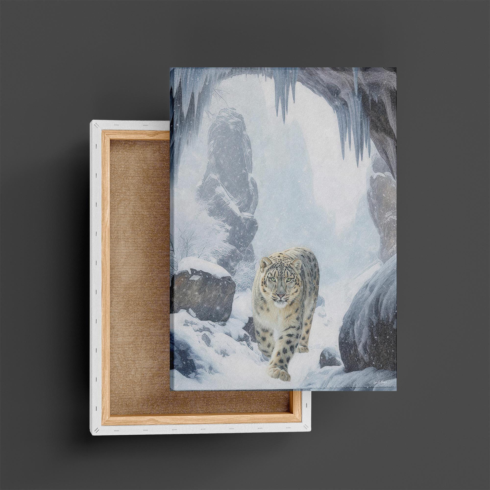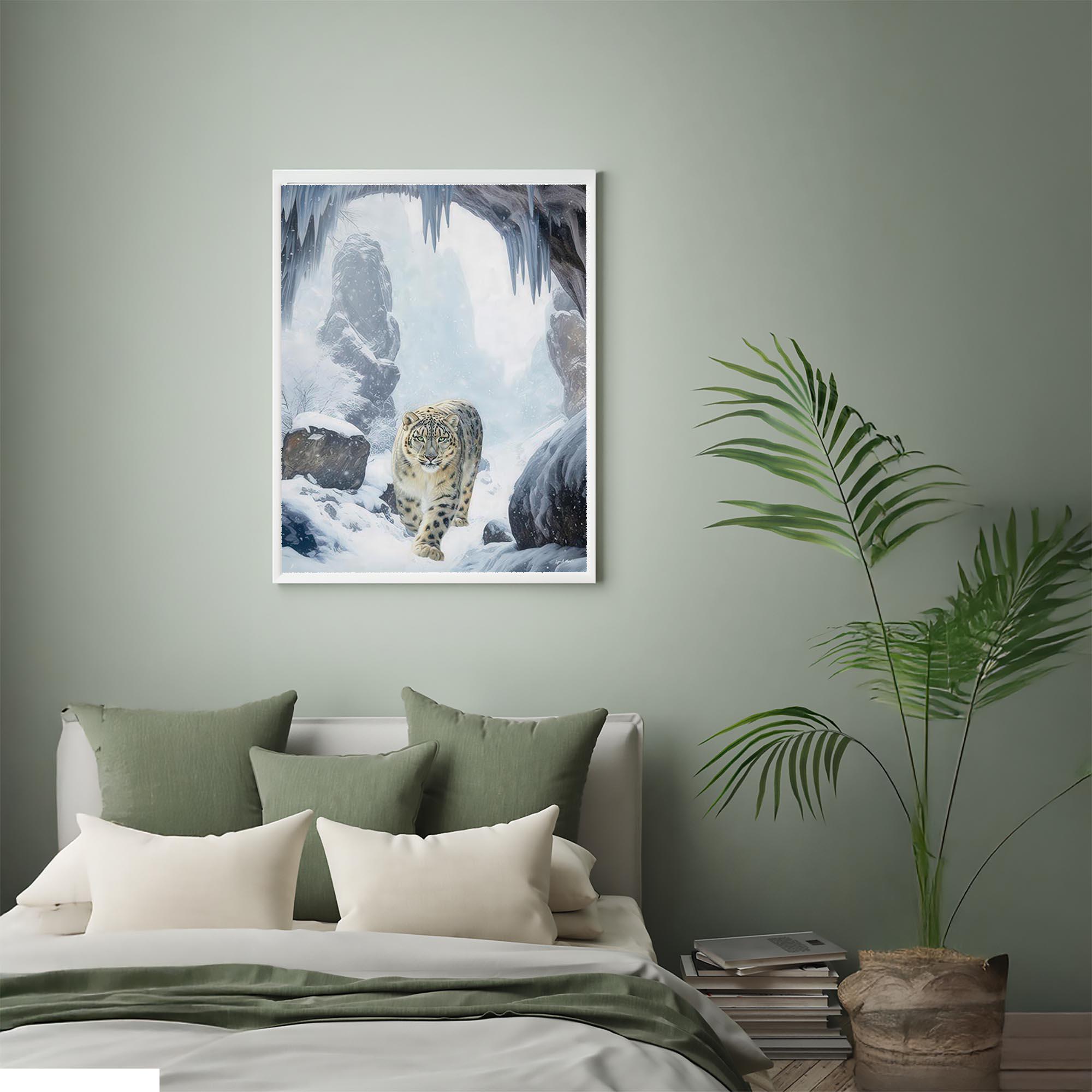 This piece celebrates the resilience of an endangered snow leopard moving through its icy home. The cool tones and steady gaze are meant to bring calm, wild energy into your space while reminding us to protect the habitats that keep these cats alive.