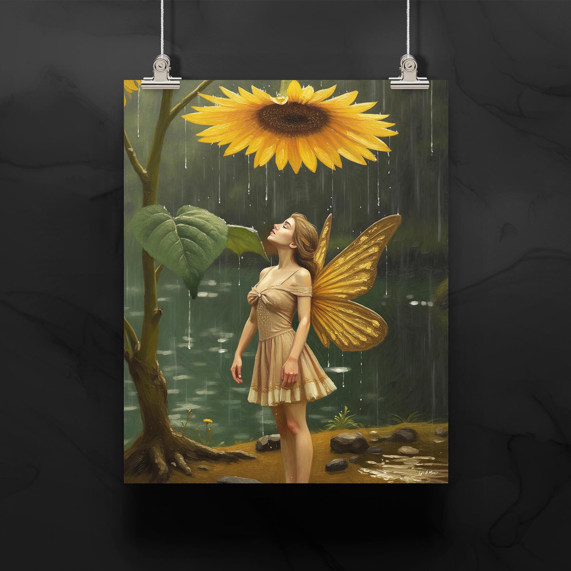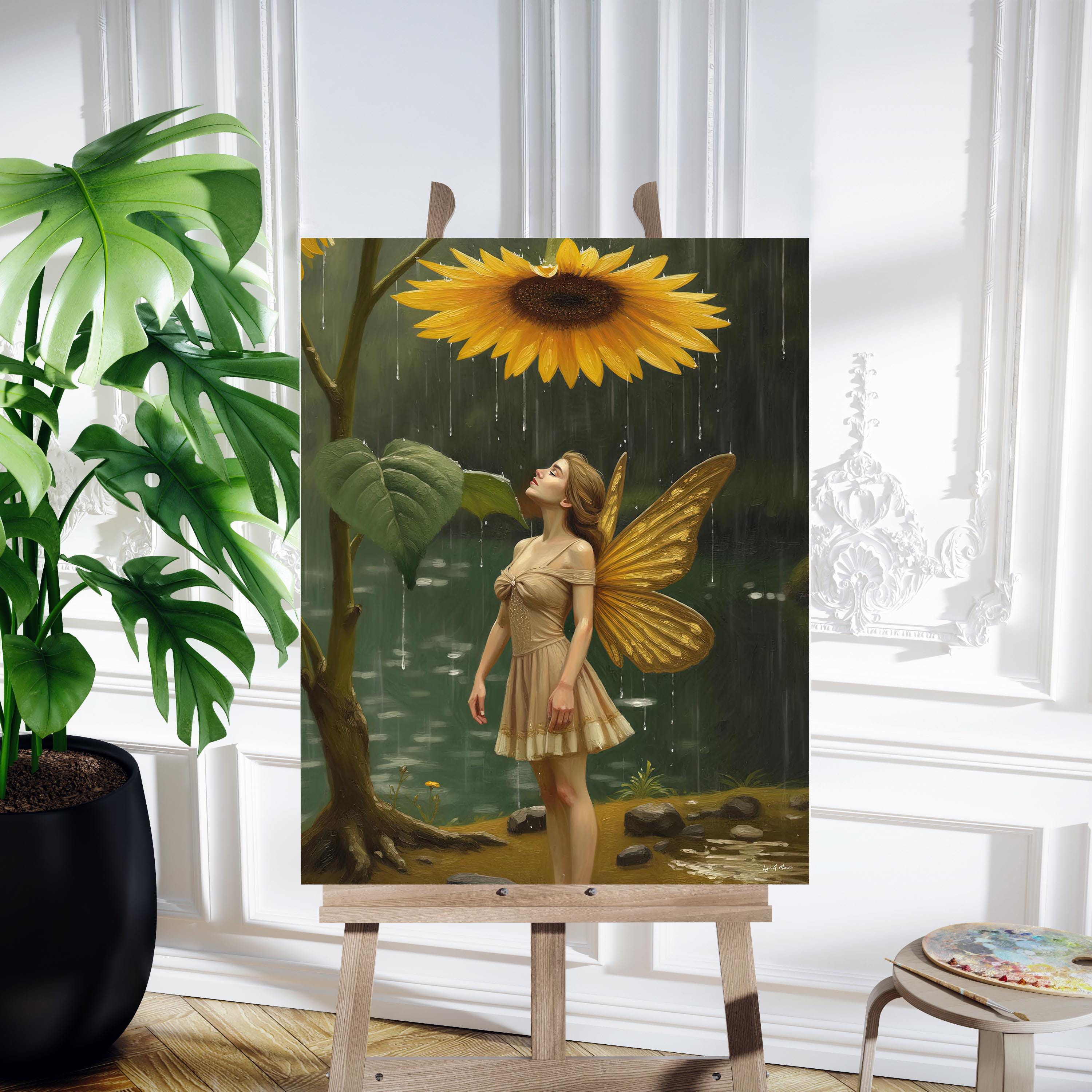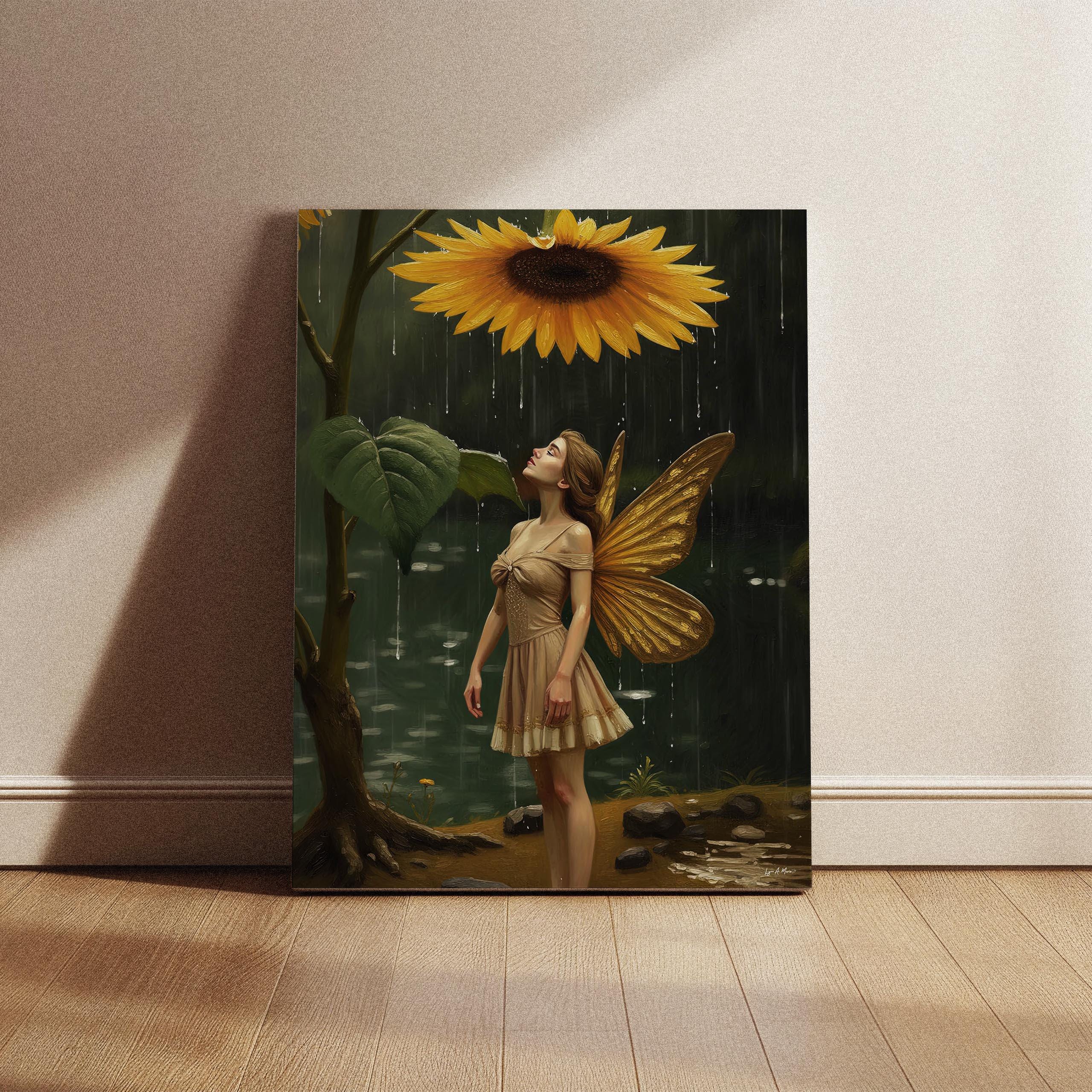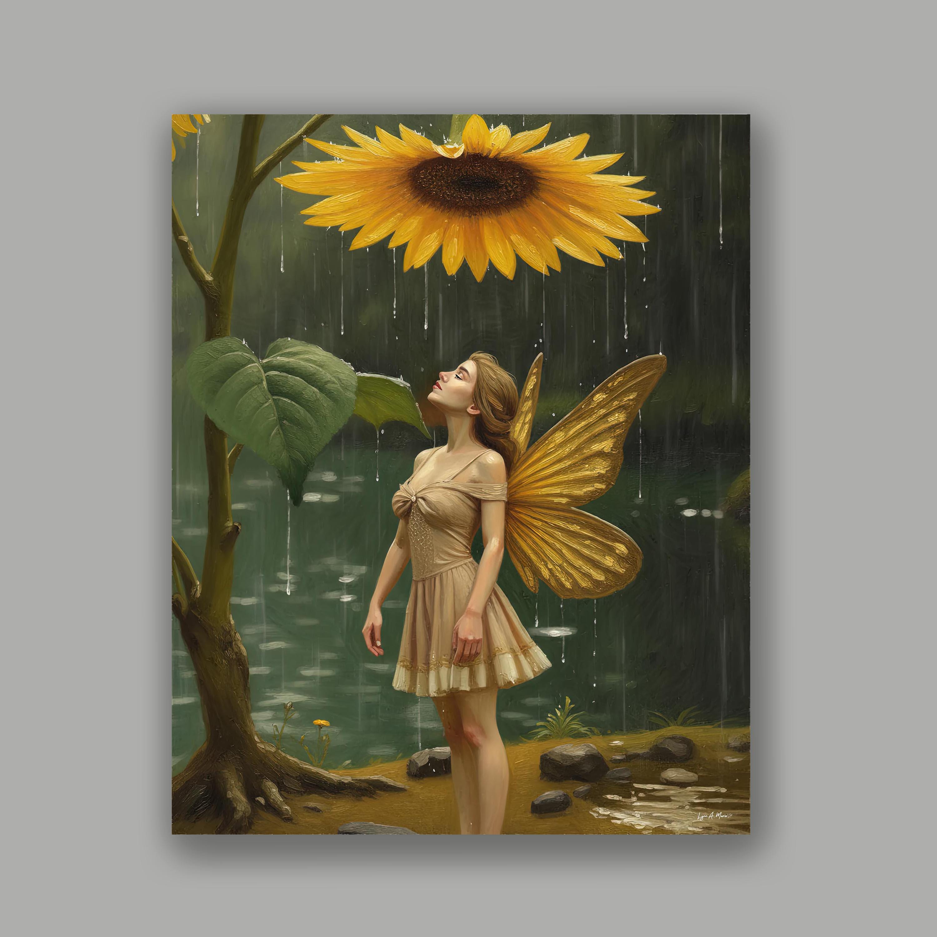 I made this to capture a quiet rainy moment where a sunflower shelters a fairy, nature and gentle magic together.