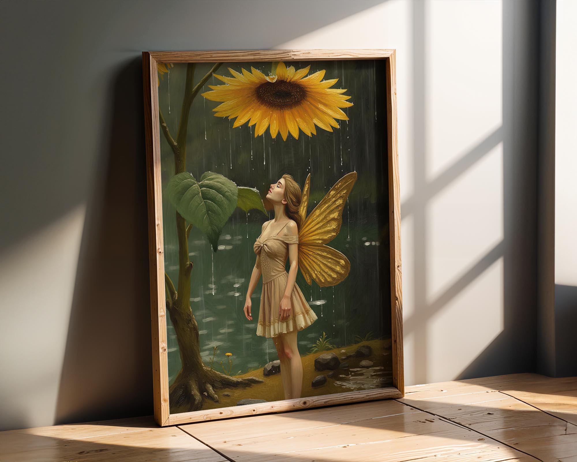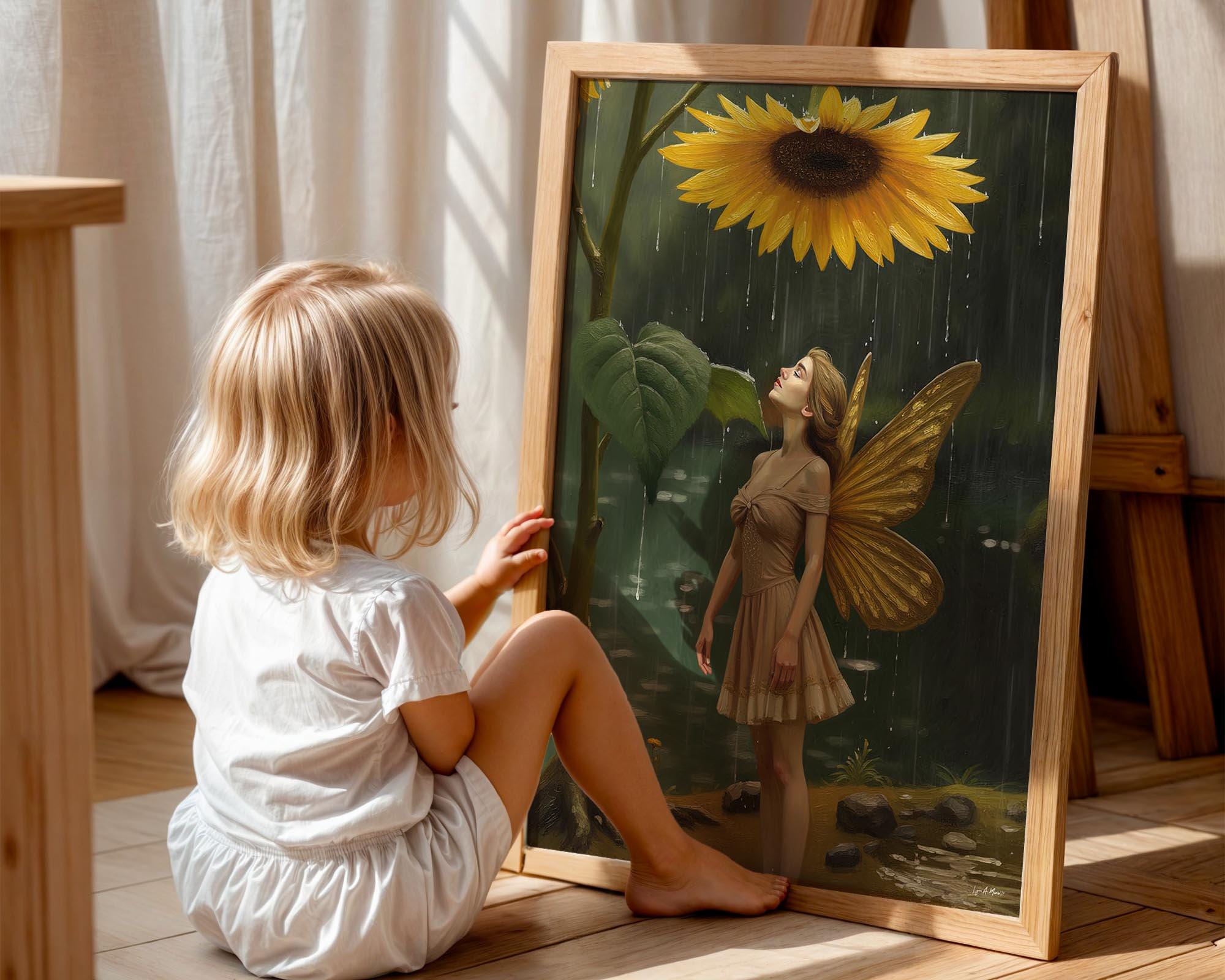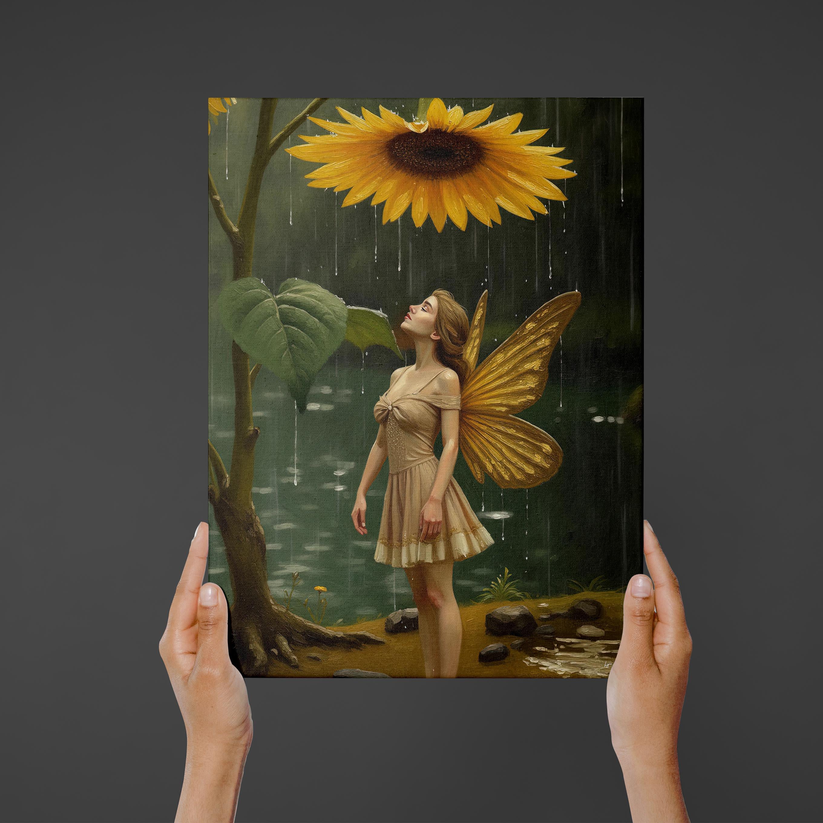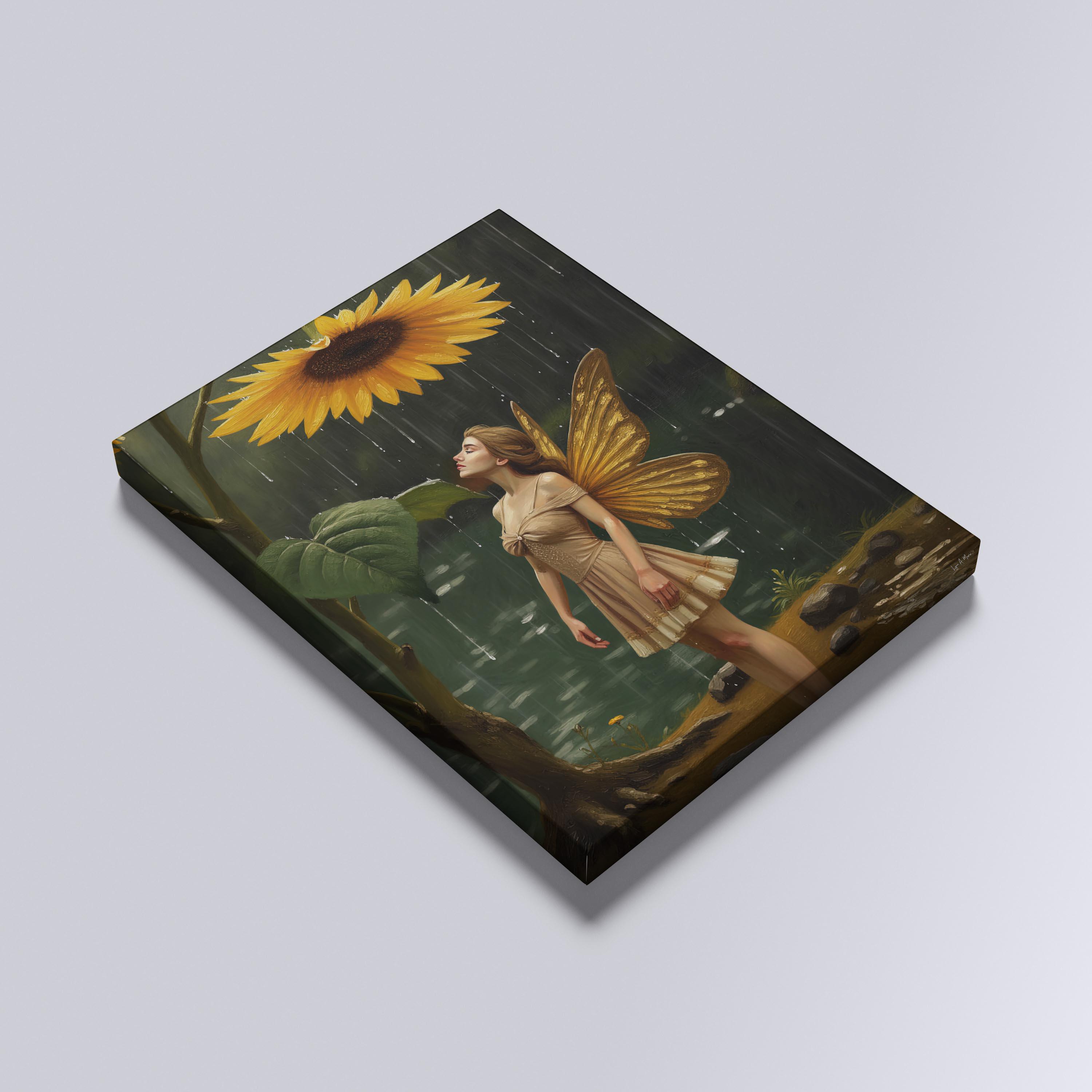 I made this to capture a quiet rainy moment where a sunflower shelters a fairy, nature and gentle magic together.