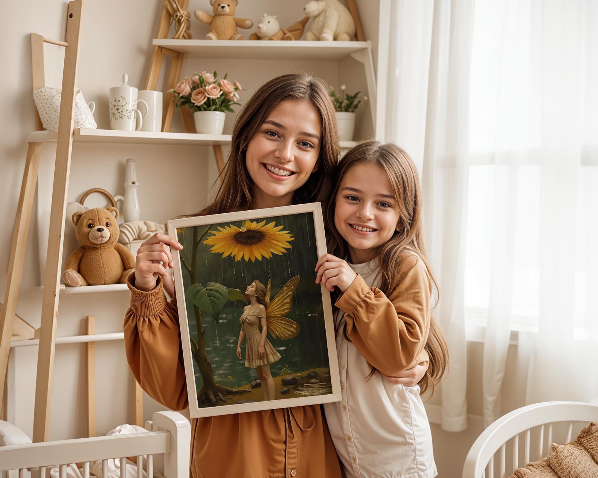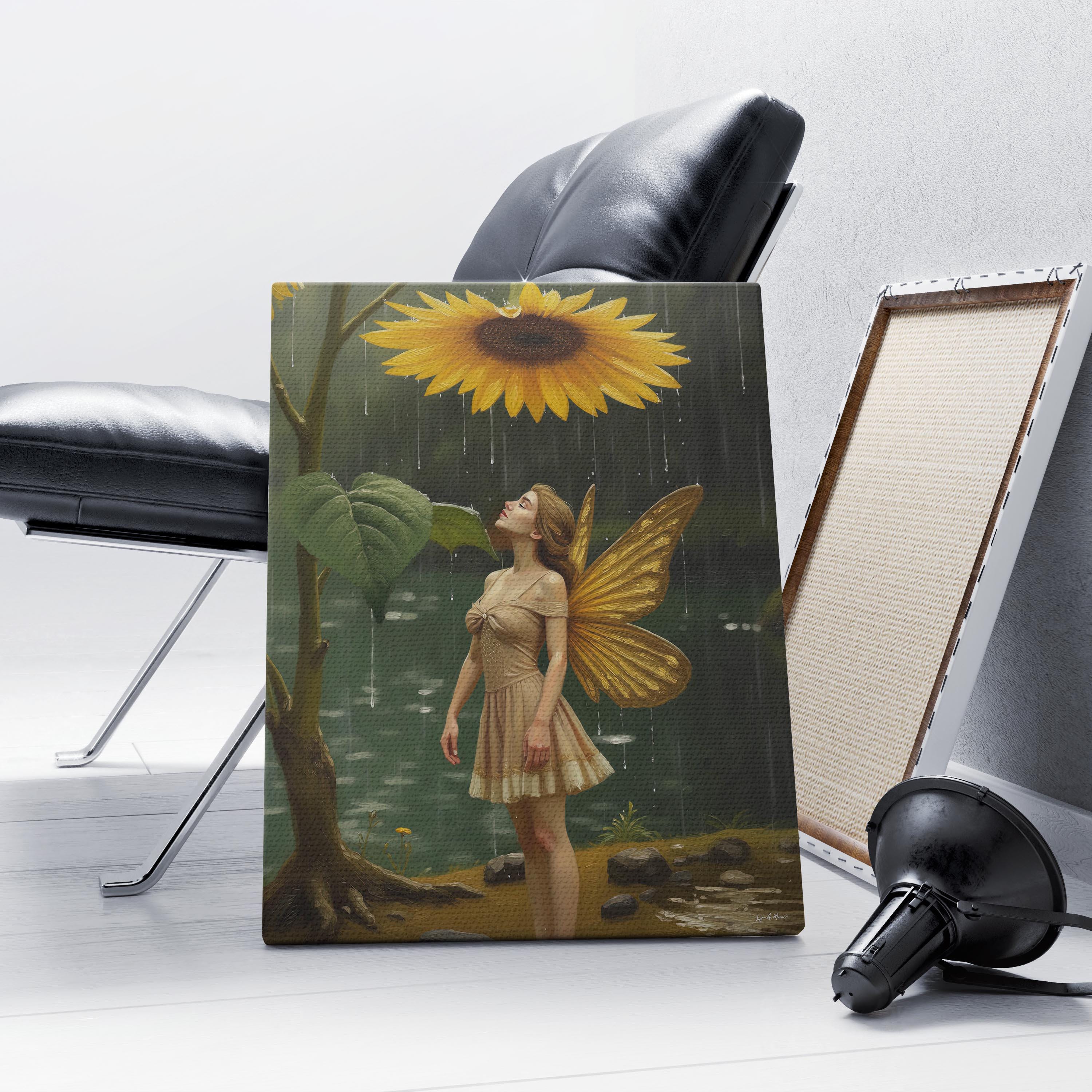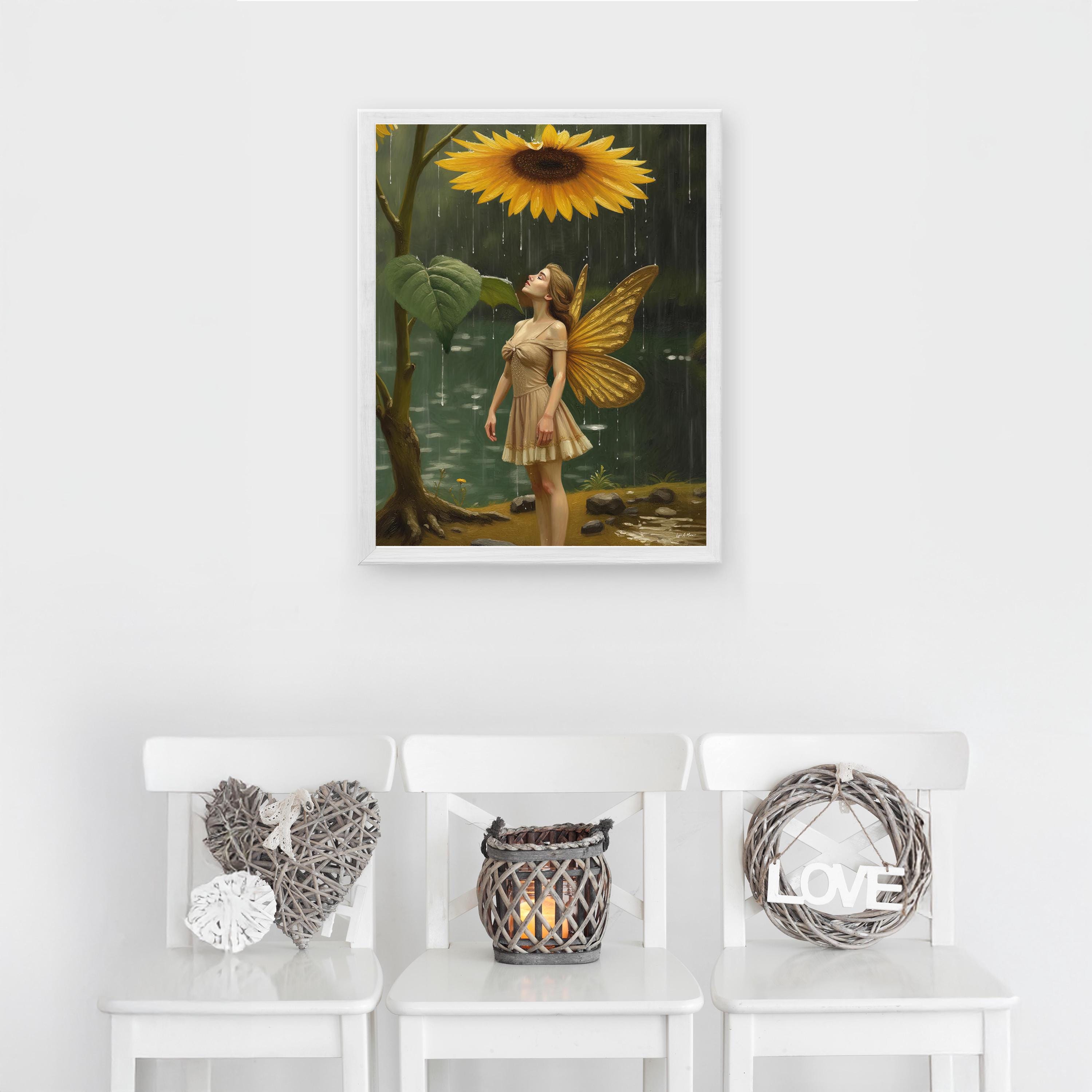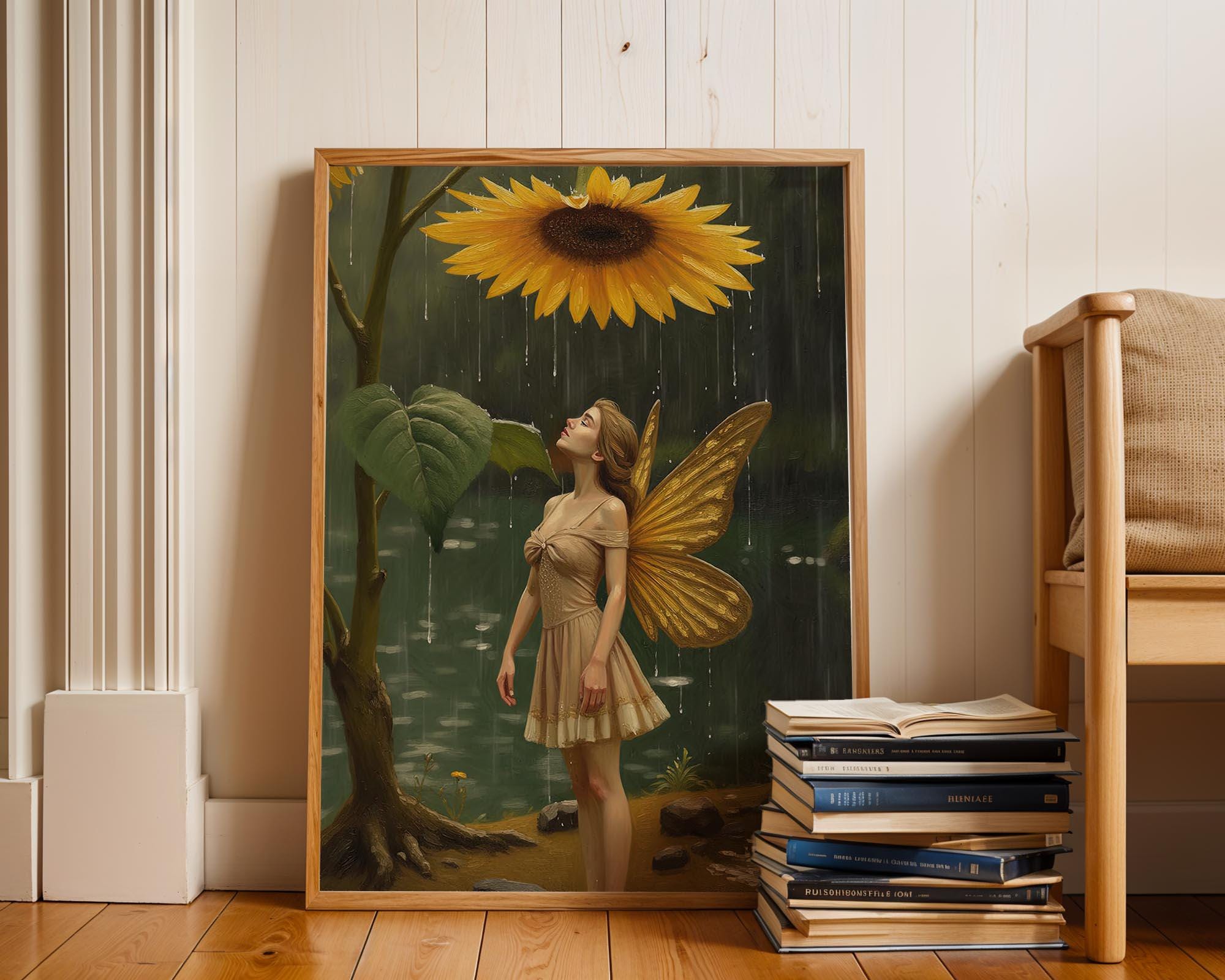 I made this to capture a quiet rainy moment where a sunflower shelters a fairy, nature and gentle magic together.