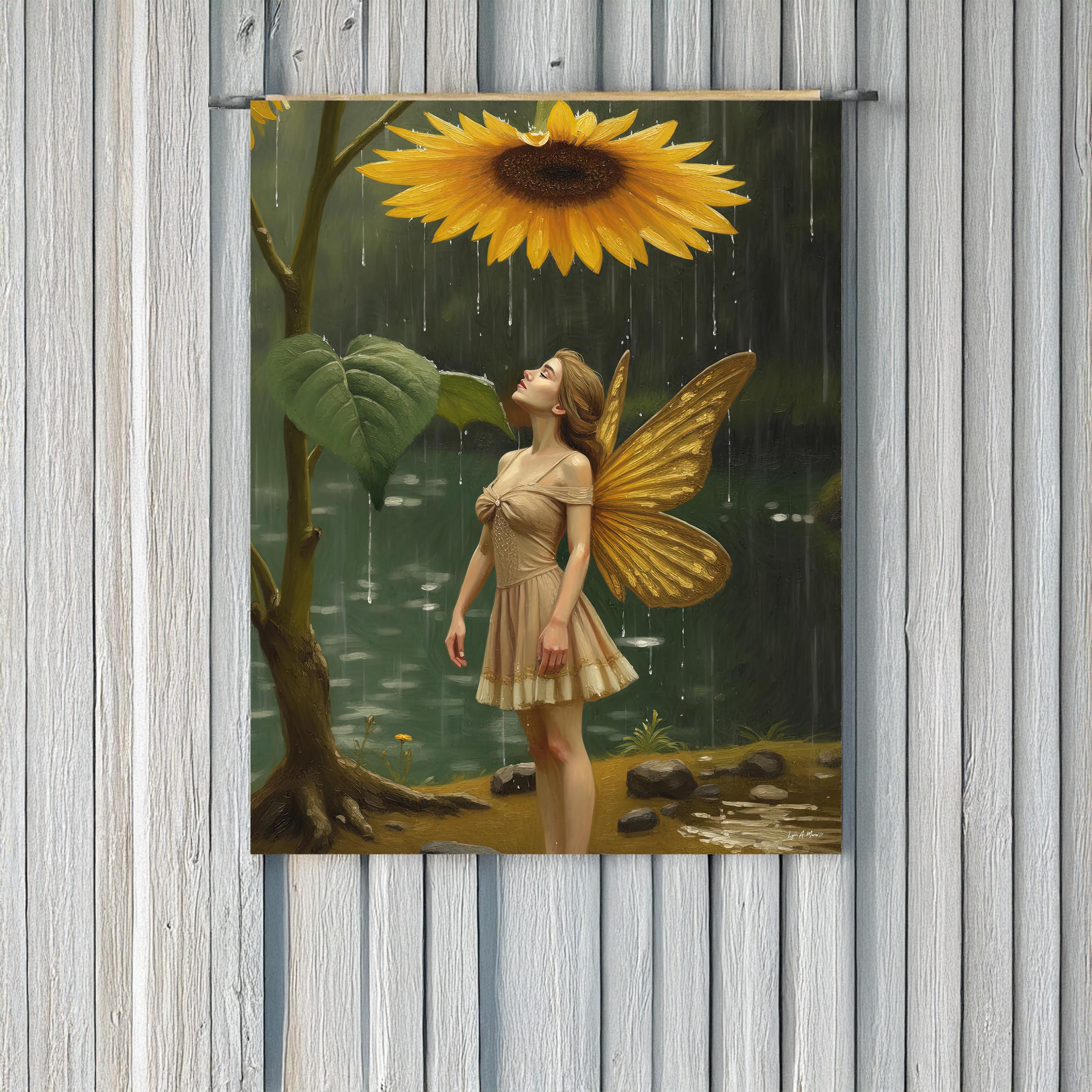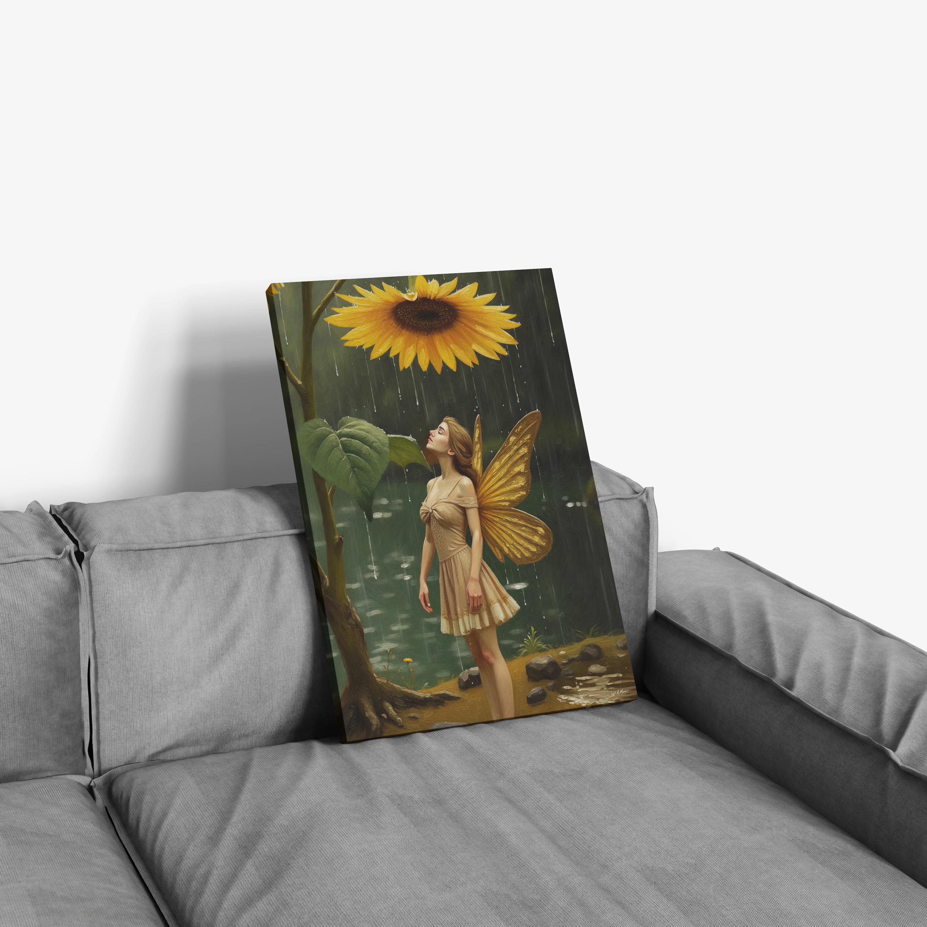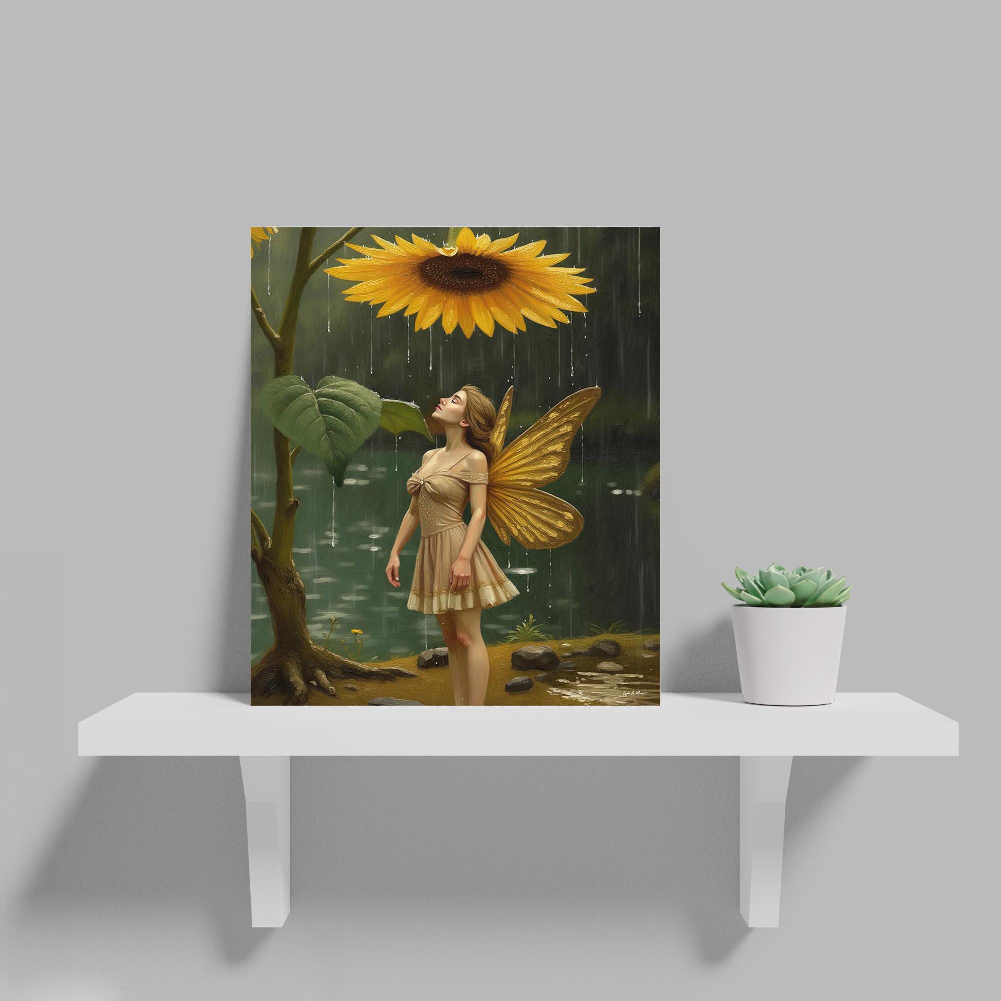 I created this sunflower fairy art to bring a soft, magical moment into everyday spaces. I wanted to blend fantasy art with the peaceful feeling of a rainy day fantasy scene, capturing a tiny nature sprite taking shelter under a sunflower during a magical rain shower. This piece is digitally created, NOT AI generated, and made to add warmth and whimsy to your living room wall or any cozy corner of your home. As an artist, I love creating worlds that feel gentle and uplifting, and this botanical fantasy print is meant to be exactly that. Perfect as an art print for yourself or a gift for a fantasy fan, a fairy under the sunflower scene for collectors, or a whimsy art gift for someone who loves imaginative nature art.
