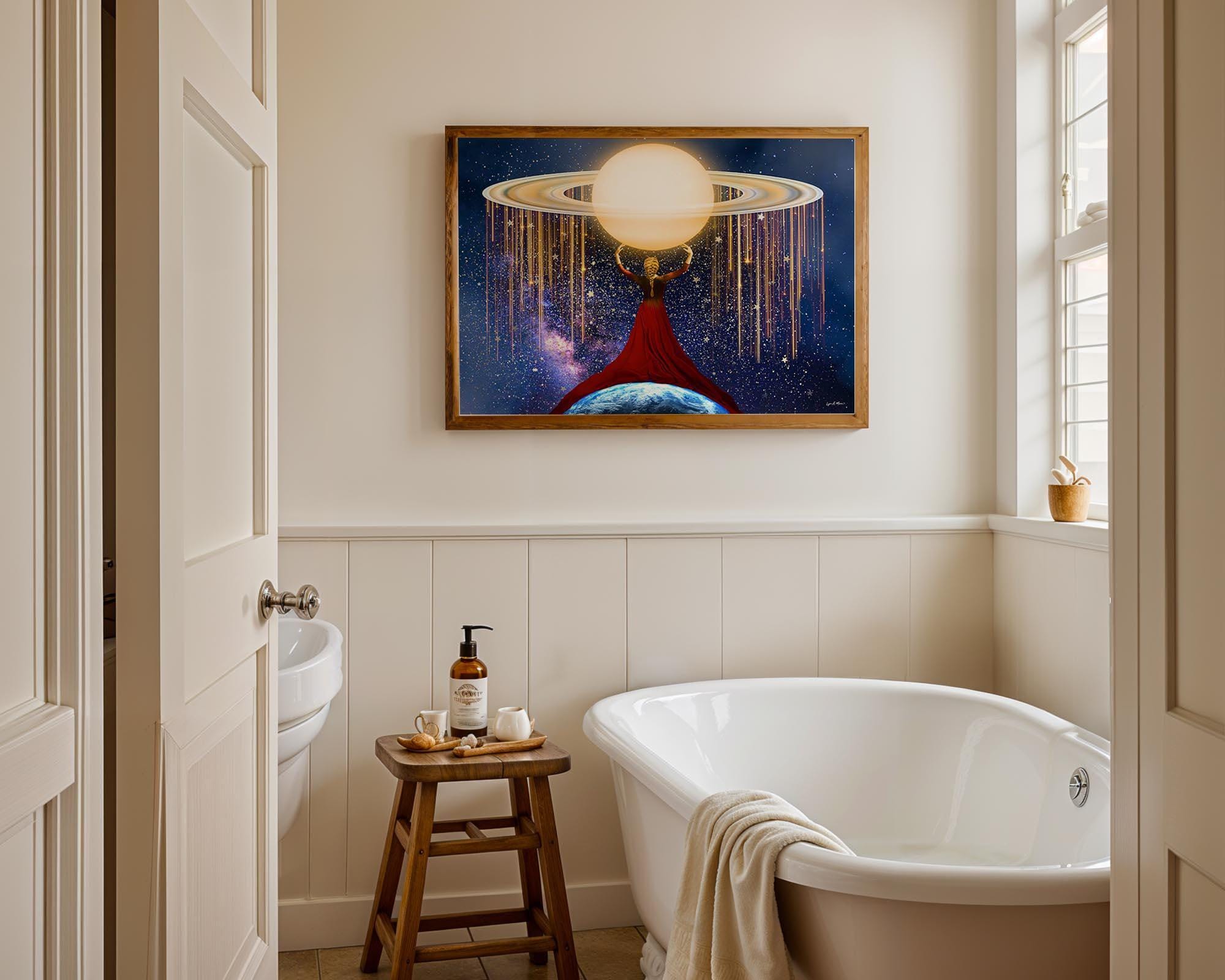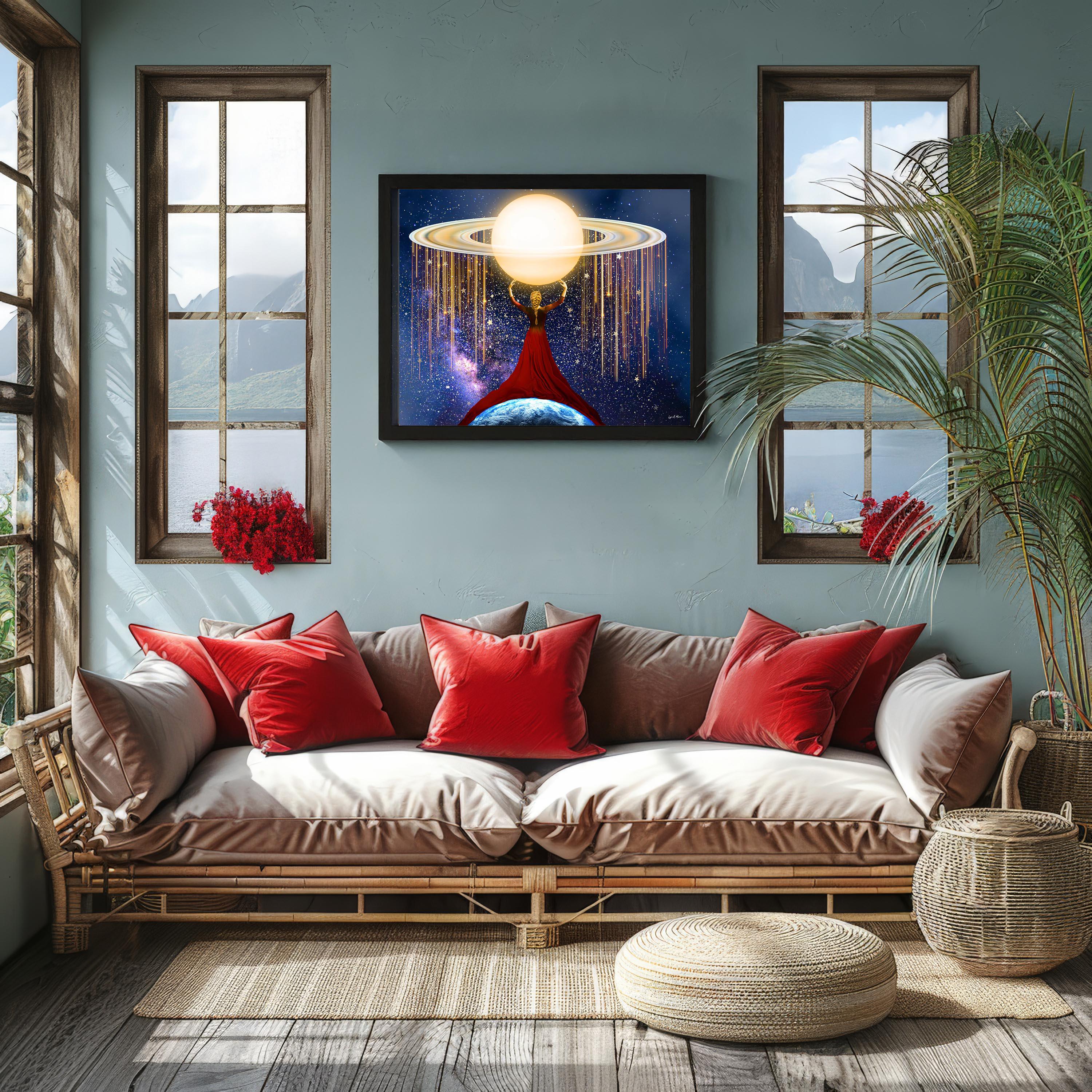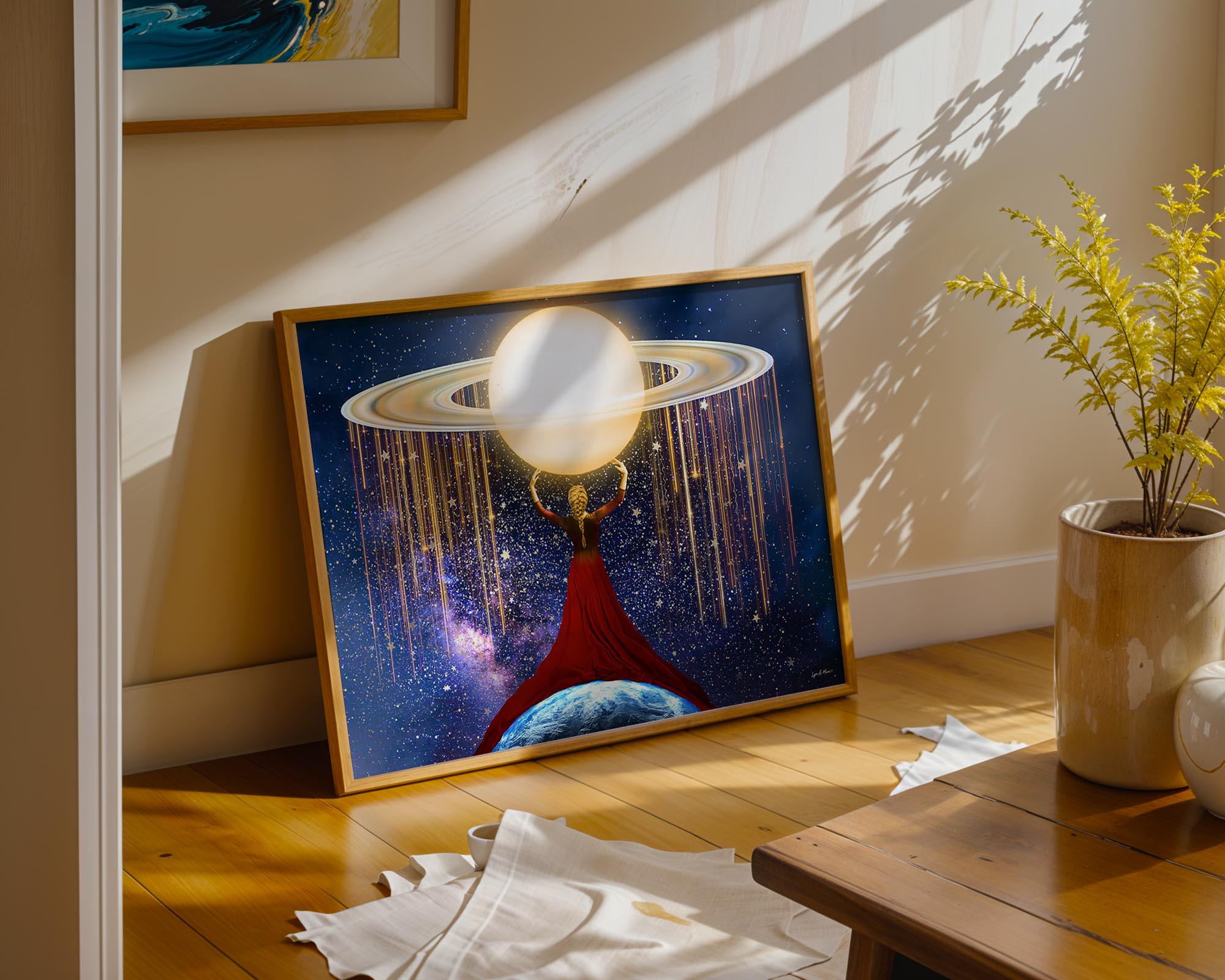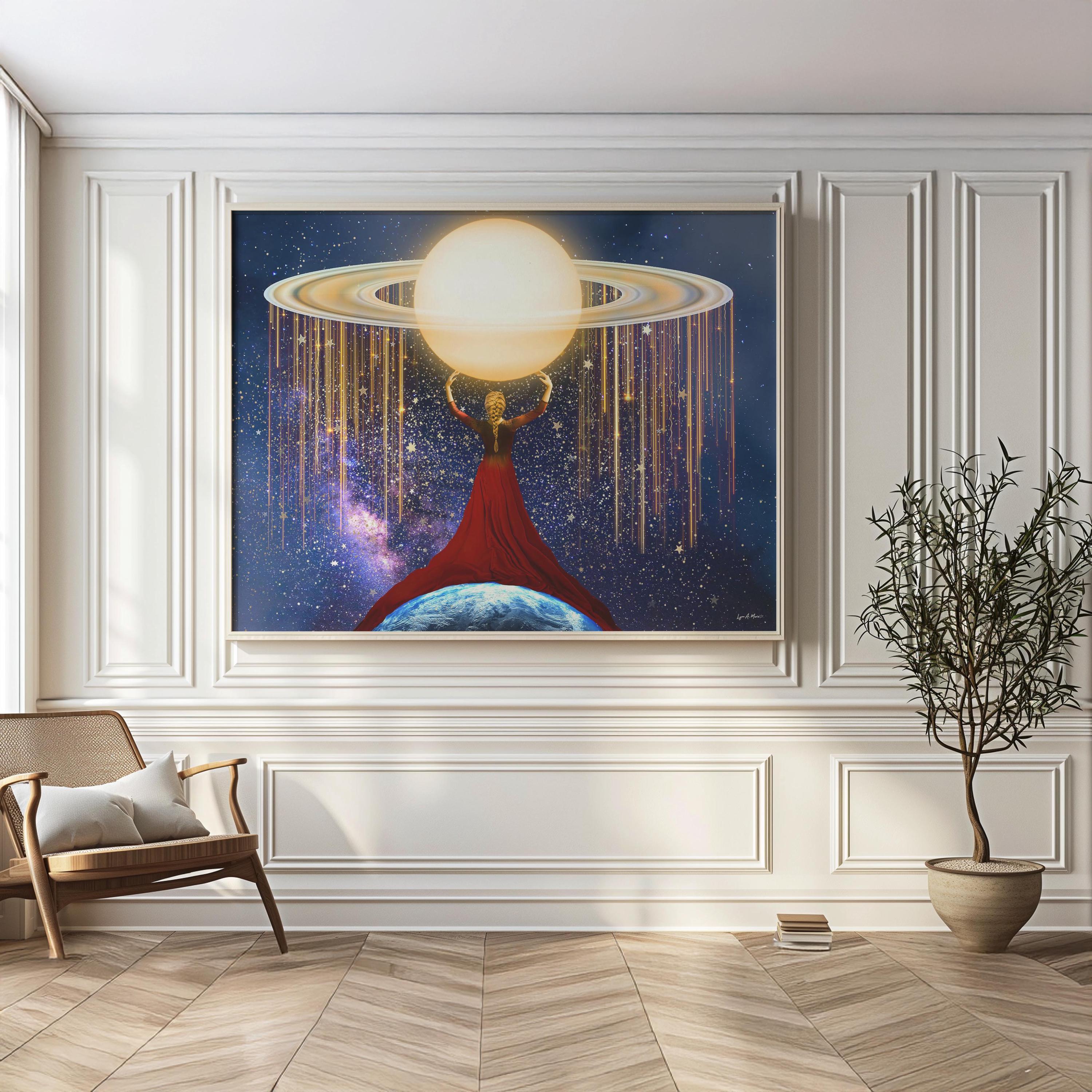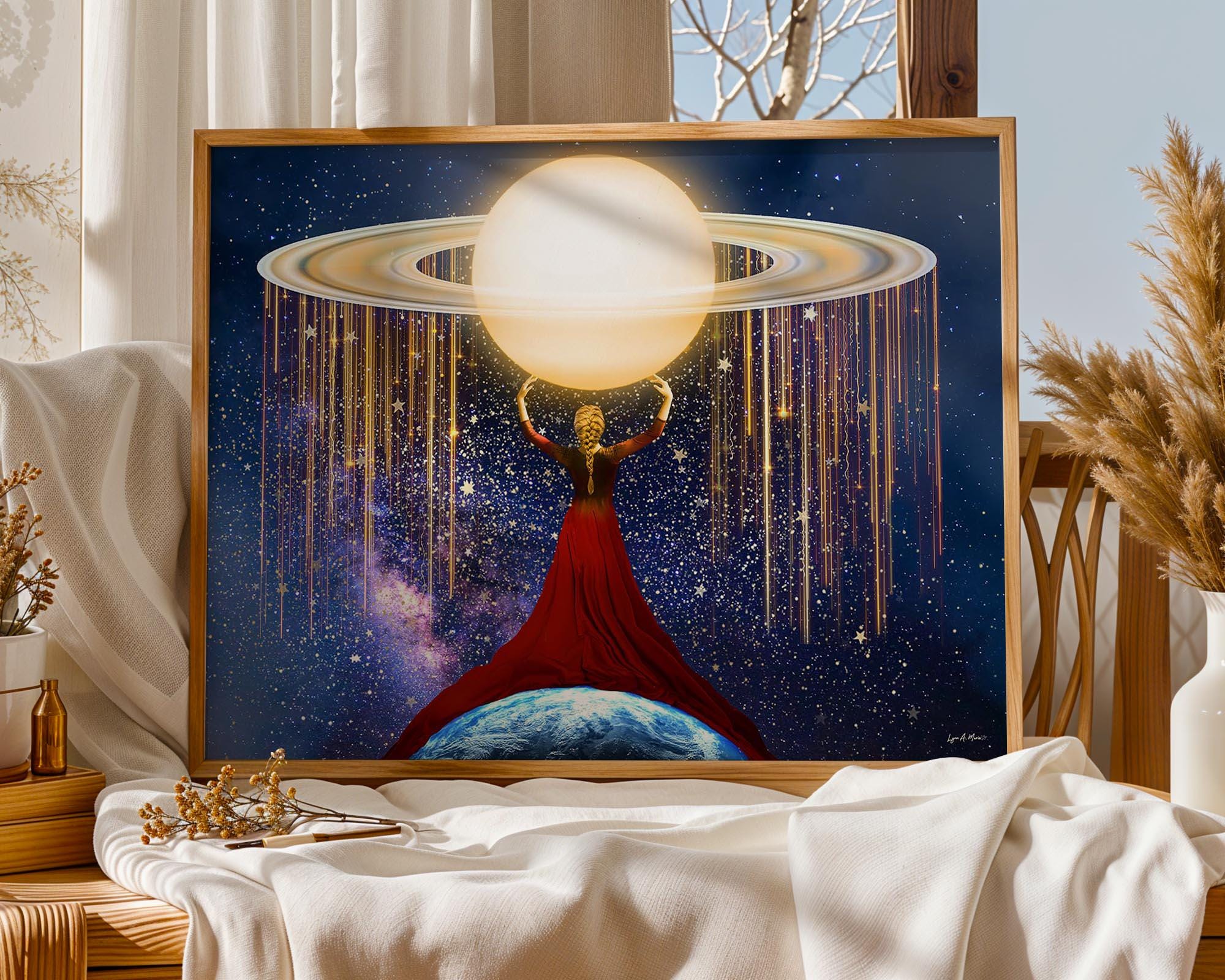 I created this bright, colorful fantasy piece to capture the feeling of strength, wonder, and night sky magic. I wanted to show a woman lifting her own starlit world—glowing Saturn rings, drifting stars, and a galaxy gown that turns the sky into a dream. This empowering fantasy artwork reflects everything I love to create as Lynn A Marie and makes a beautiful signed art print for living room wall art, celestial décor, and anyone drawn to planet light magic and star-filled dreamscapes.I created this bright, colorful fantasy piece to capture the feeling of strength, wonder, and night sky magic. I wanted to show a woman lifting her own starlit world—glowing Saturn rings, drifting stars, and a galaxy gown that turns the sky into a dream. This empowering fantasy artwork reflects everything I love to create as Lynn A Marie and makes a beautiful signed art print for living room wall art, celestial décor, and anyone drawn to planet light magic and star-filled dreamscapes.
