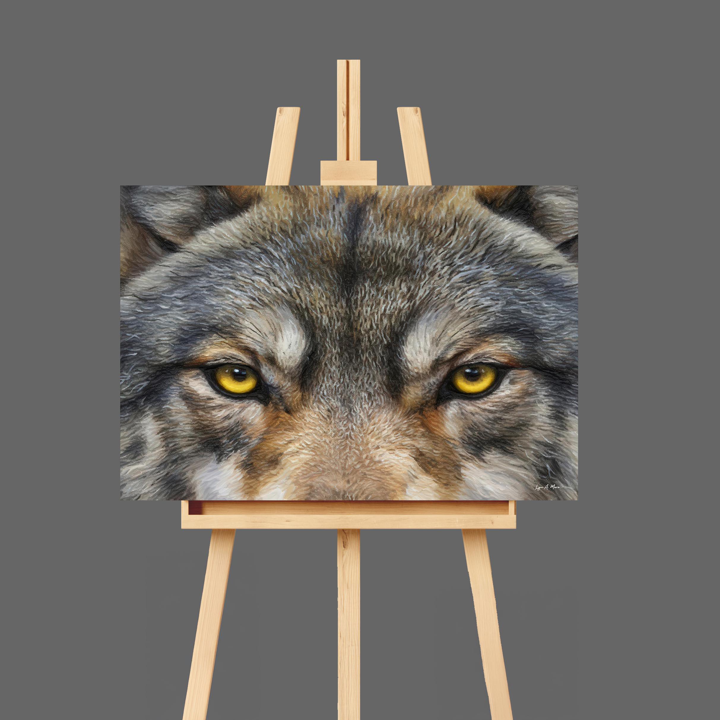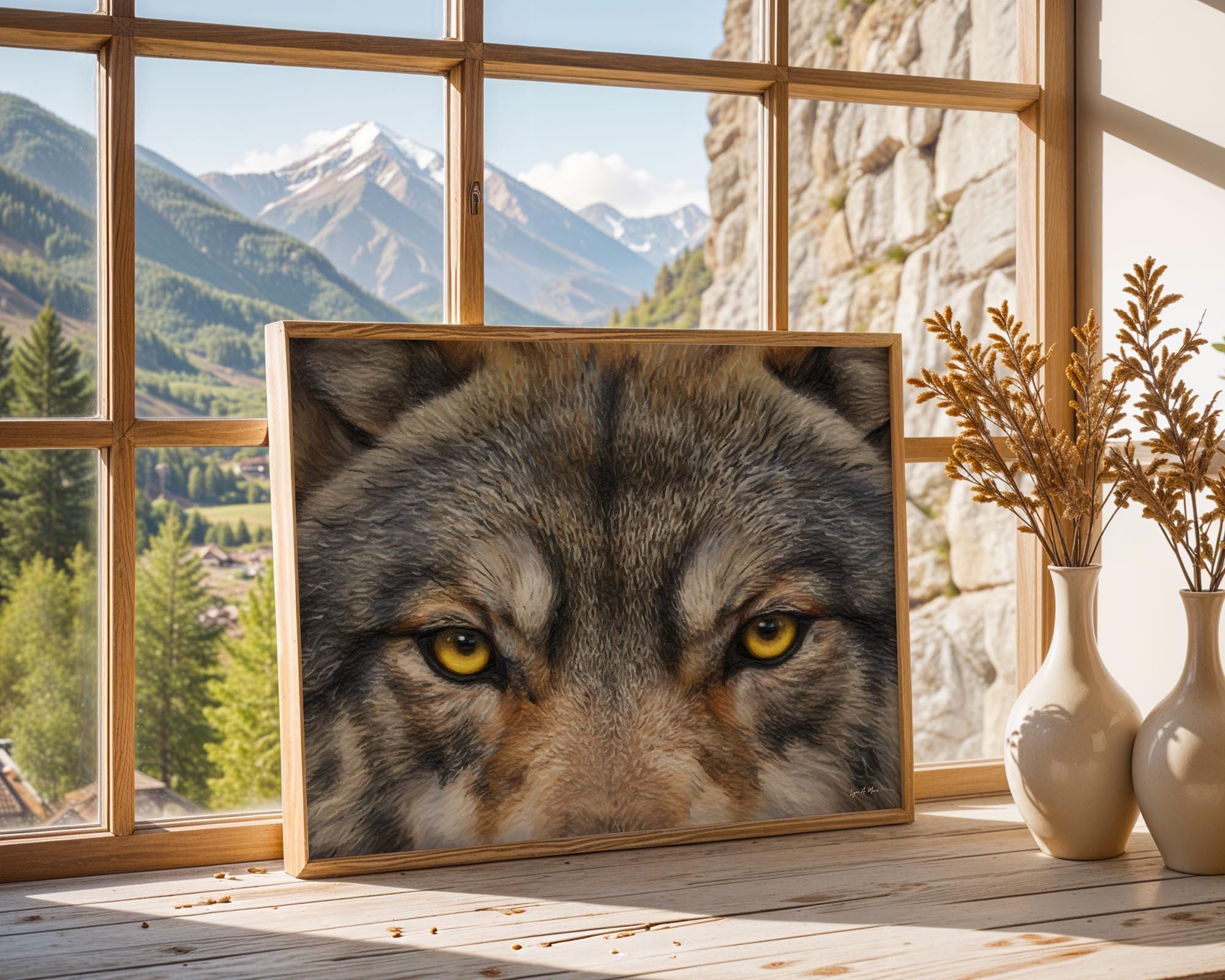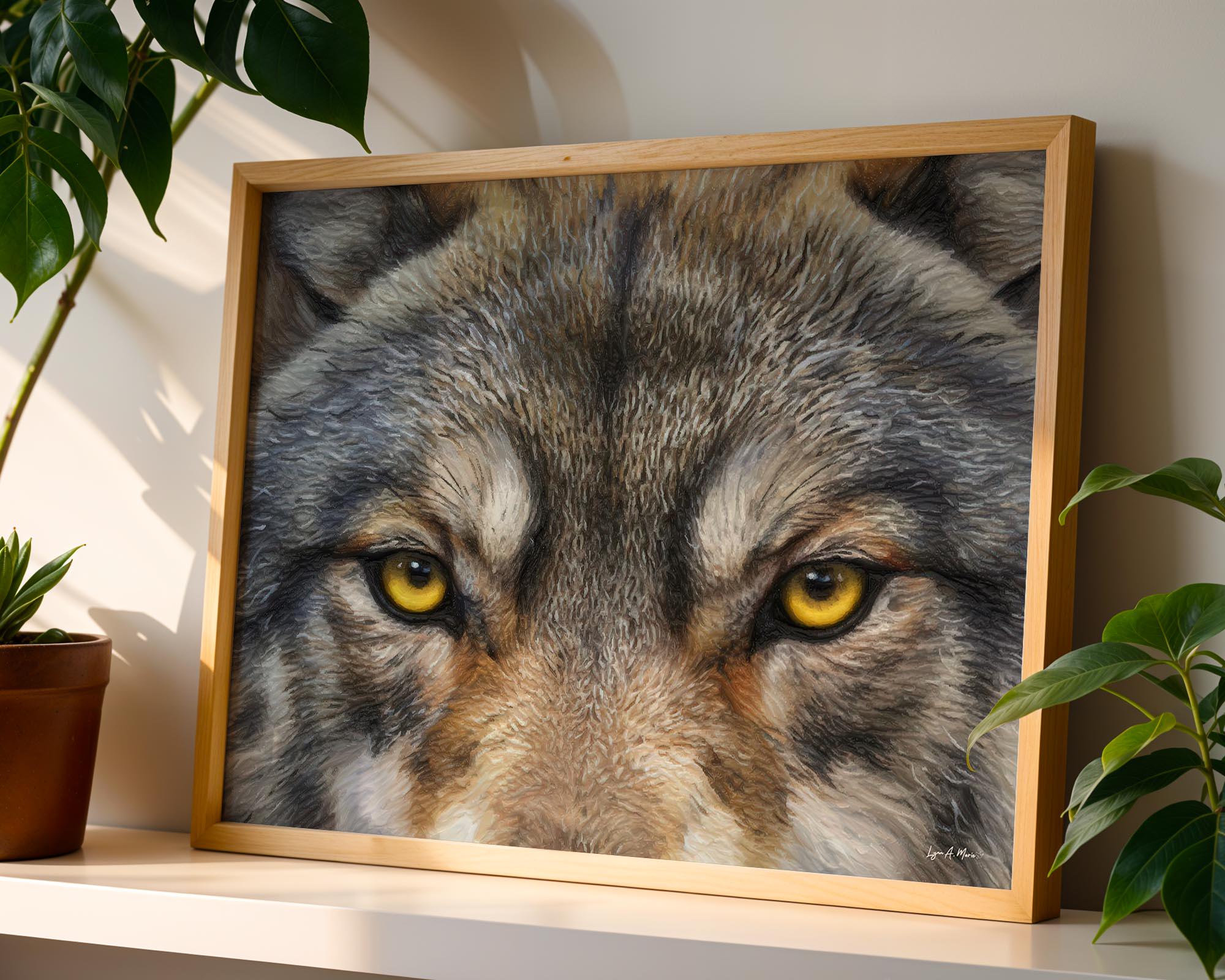 I created this winter wolf artwork to capture the wolf’s unblinking spirit, strength, focus, and quiet intelligence. The close, golden gaze features striking wolf eye art, drawing you into a nature scene full of wild energy. You’ll find elements of rustic wolf print blended with the essence of forest wolf art. With this nature timber wolf print, you meet the wild eye-to-eye and bring a bold touch of nature into your space.