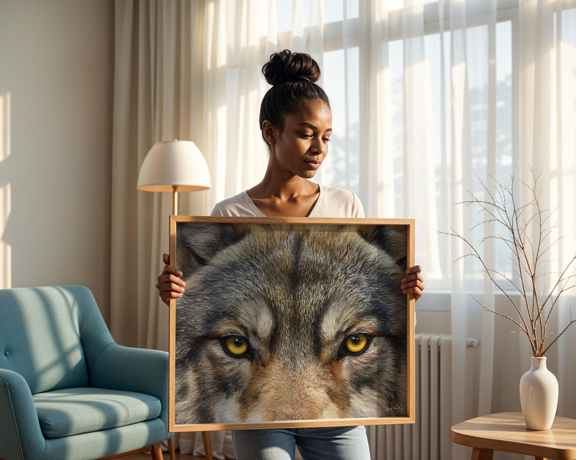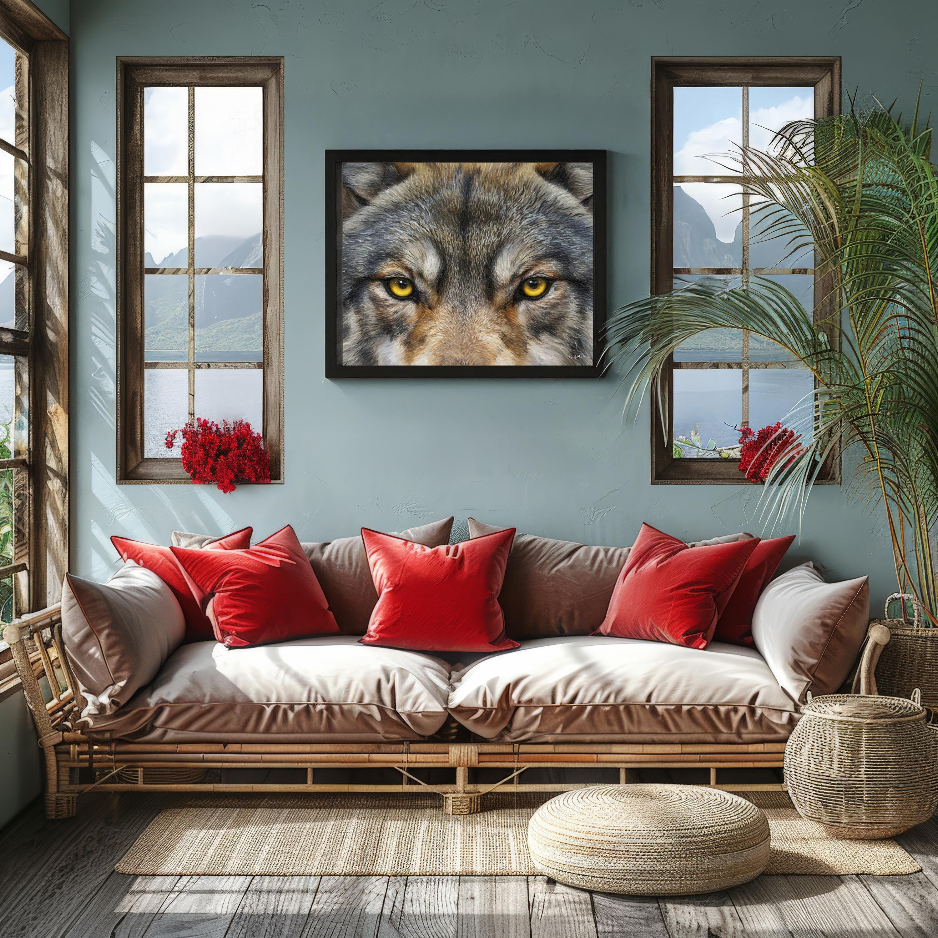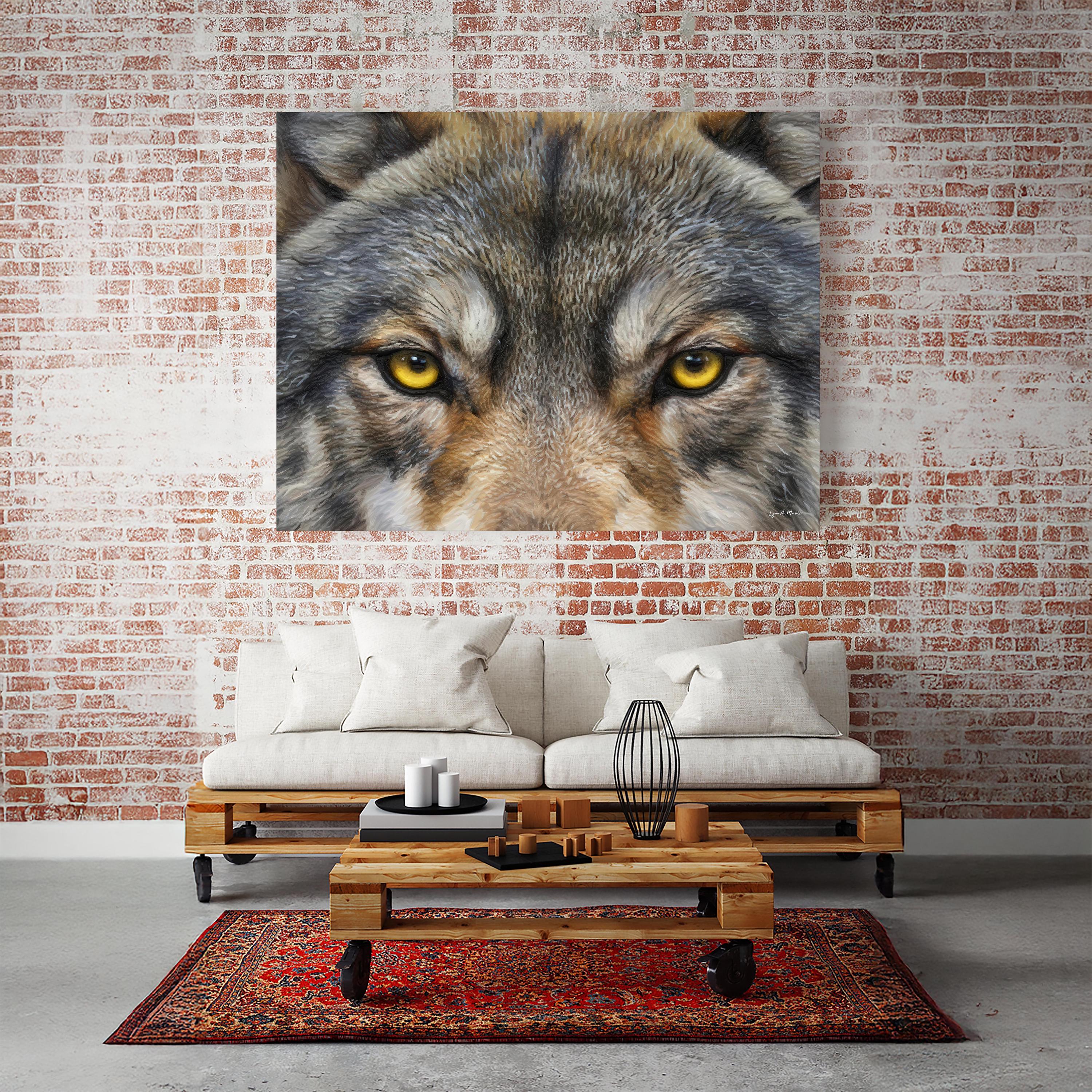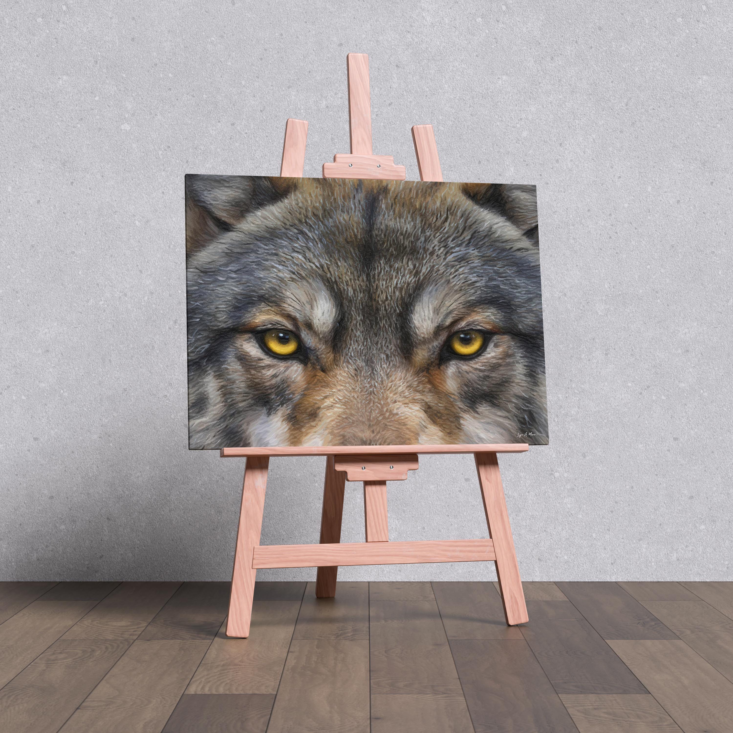 I created this winter wolf artwork to capture the wolf’s unblinking spirit, strength, focus, and quiet intelligence. The close, golden gaze features striking wolf eye art, drawing you into a nature scene full of wild energy. You’ll find elements of rustic wolf print blended with the essence of forest wolf art. With this nature timber wolf print, you meet the wild eye-to-eye and bring a bold touch of nature into your space.