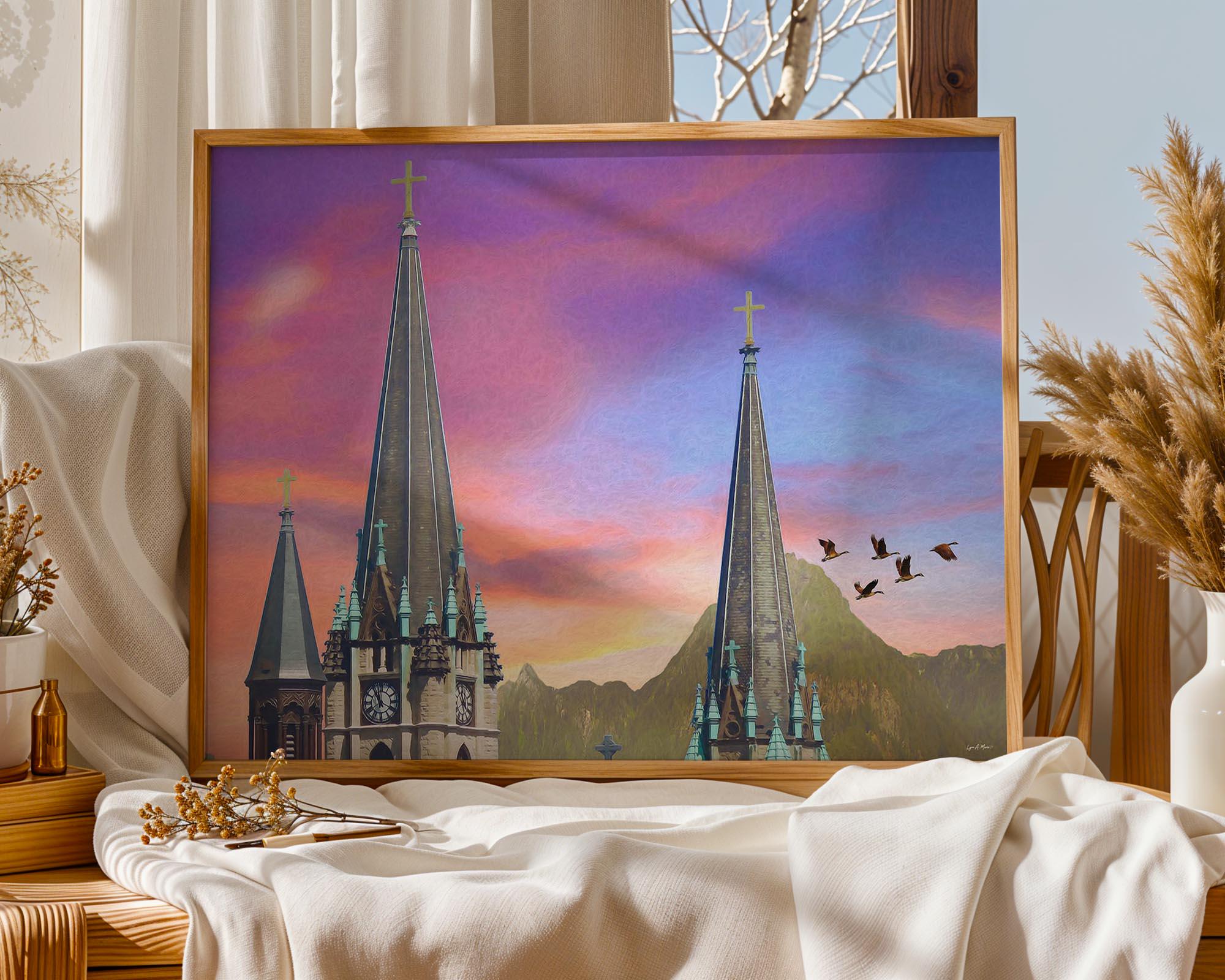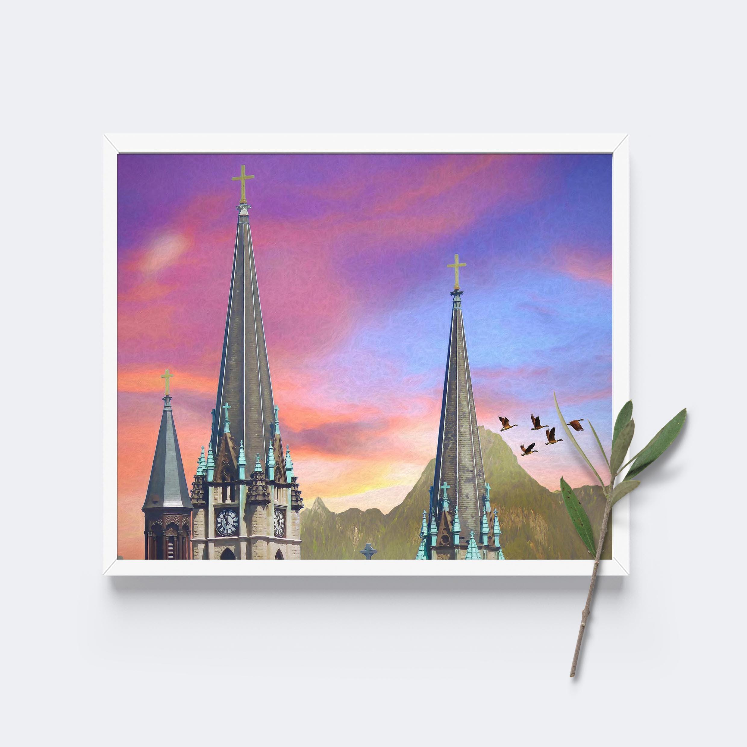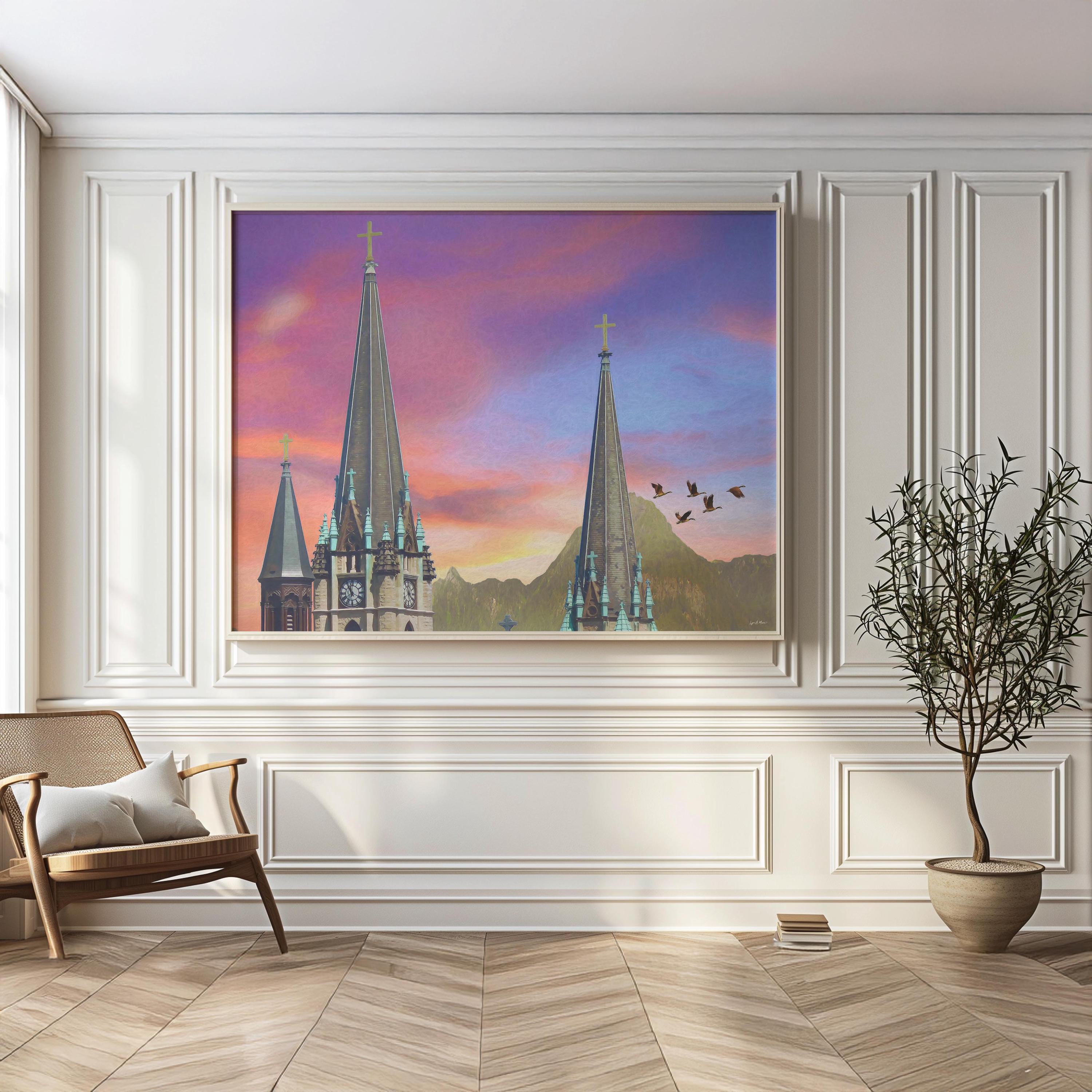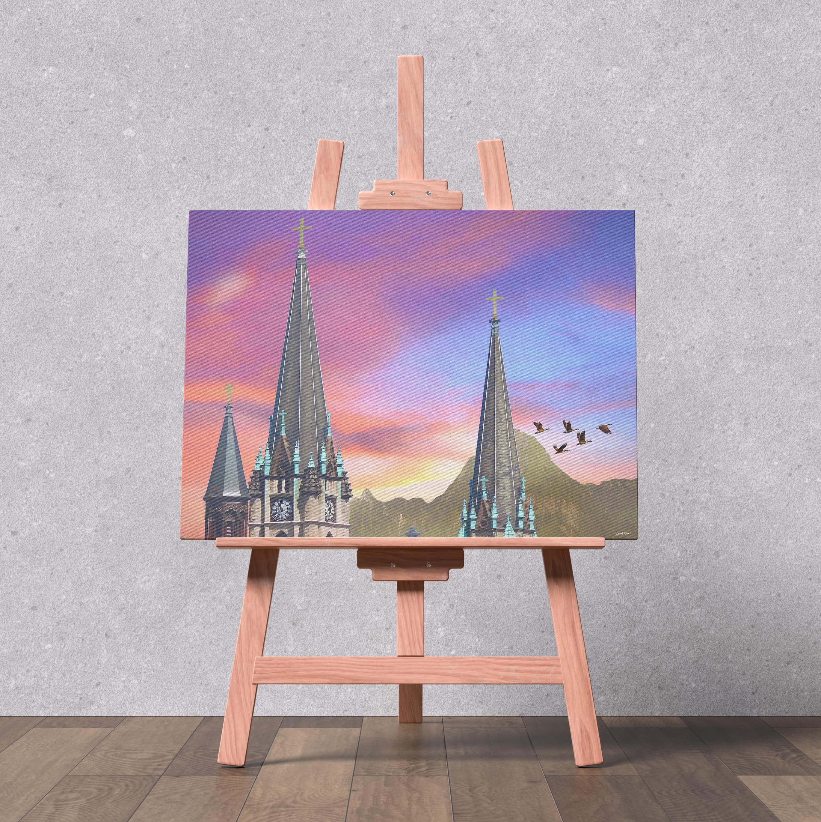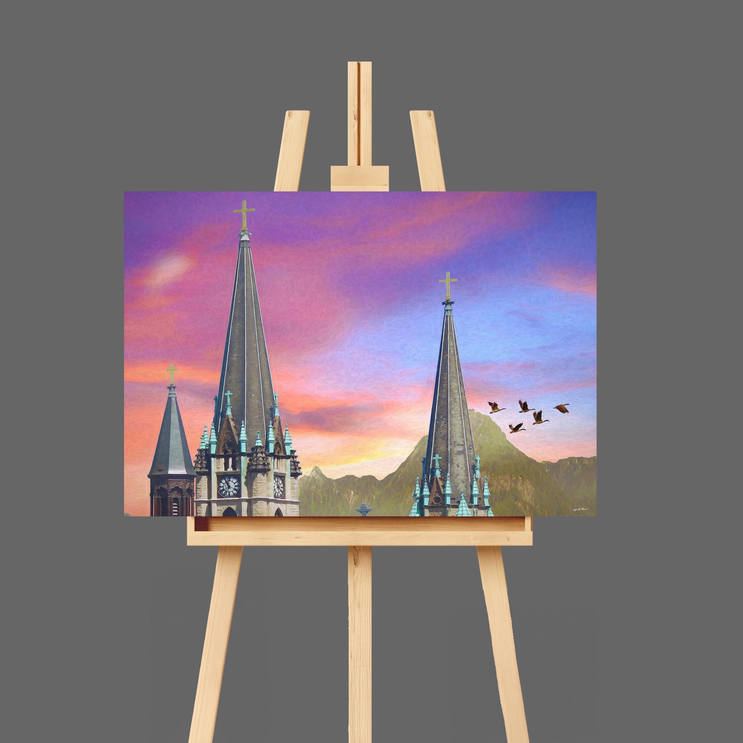 I created this to capture a quiet meeting of faith and nature, steeples reaching up, mountains standing steady, and evening sky guiding a small flock home. This landscape scene reflects a serene, peaceful and spiritual moment. The tranquil scene is meant to feel calming and grounding, making it ideal for an office or any space where you want a quiet sense of calm.