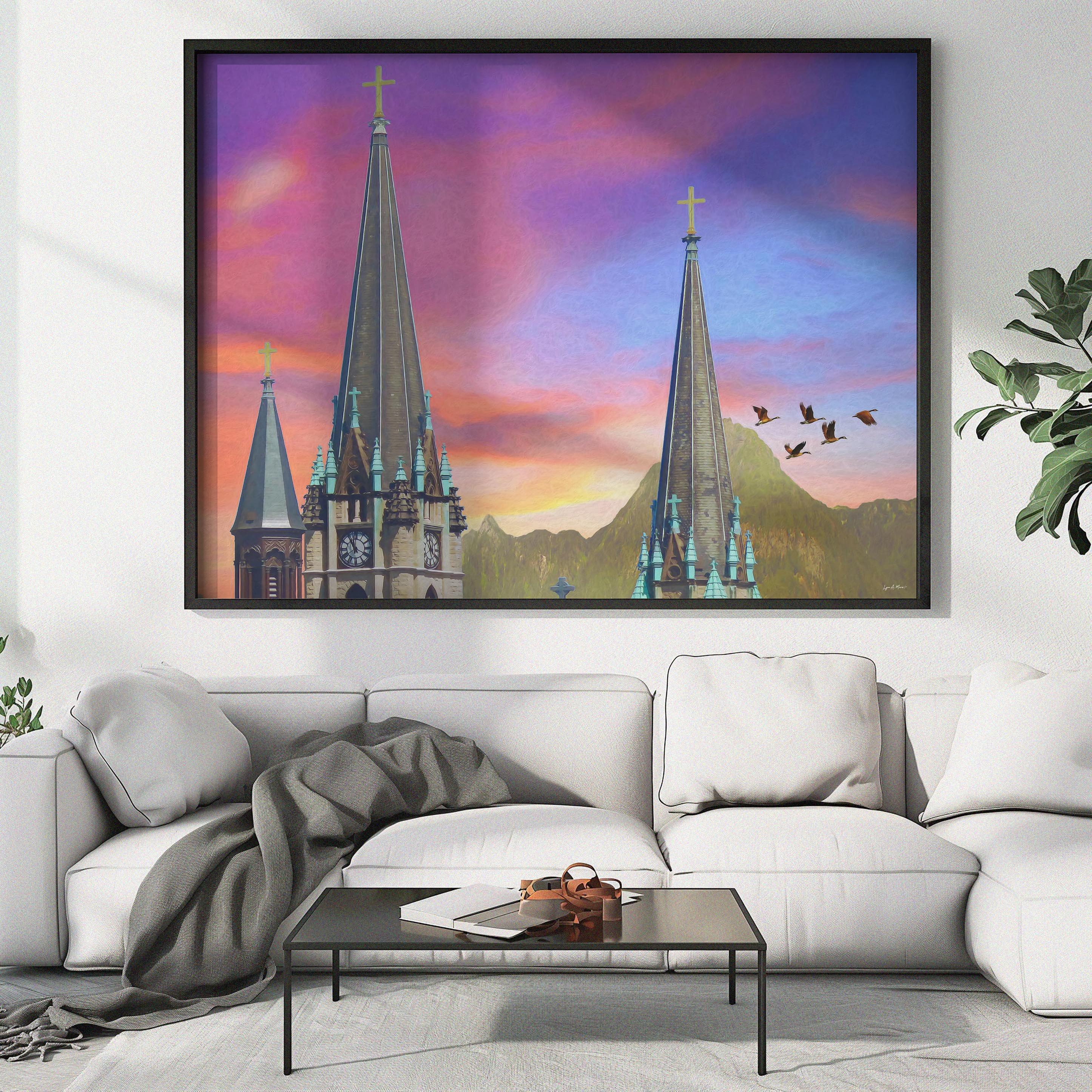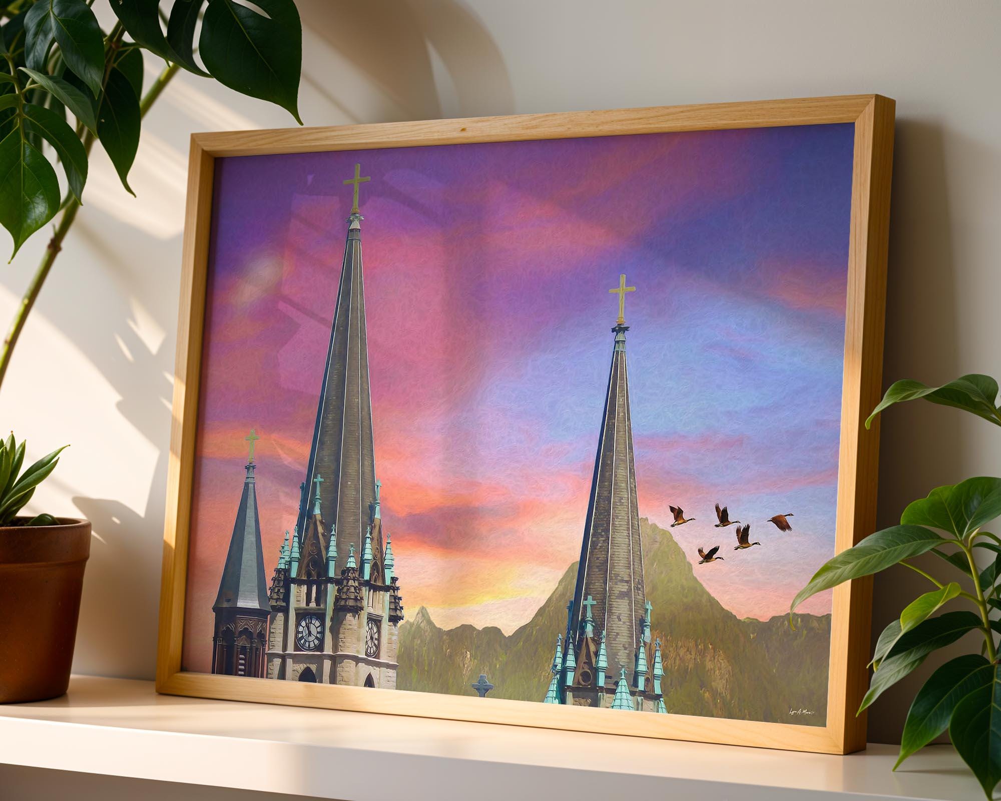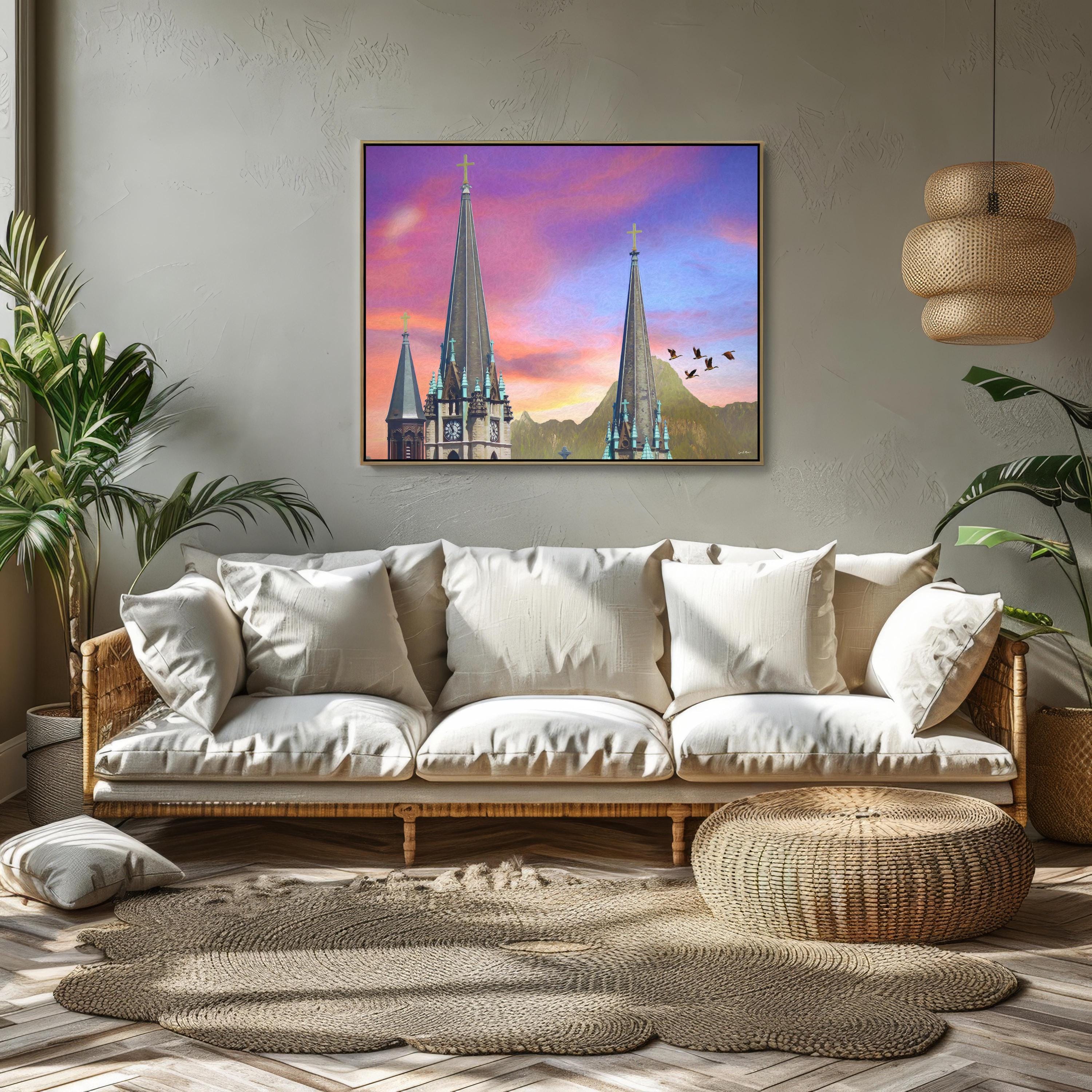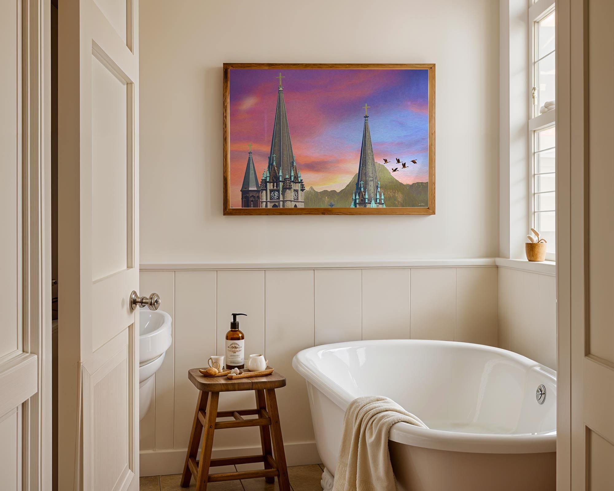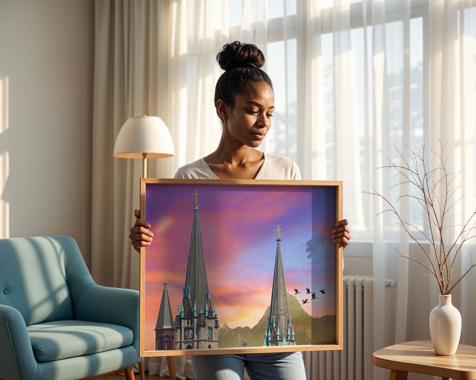 I created this to capture a quiet meeting of faith and nature, steeples reaching up, mountains standing steady, and evening sky guiding a small flock home. This landscape scene reflects a serene, peaceful and spiritual moment. The tranquil scene is meant to feel calming and grounding, making it ideal for an office or any space where you want a quiet sense of calm.