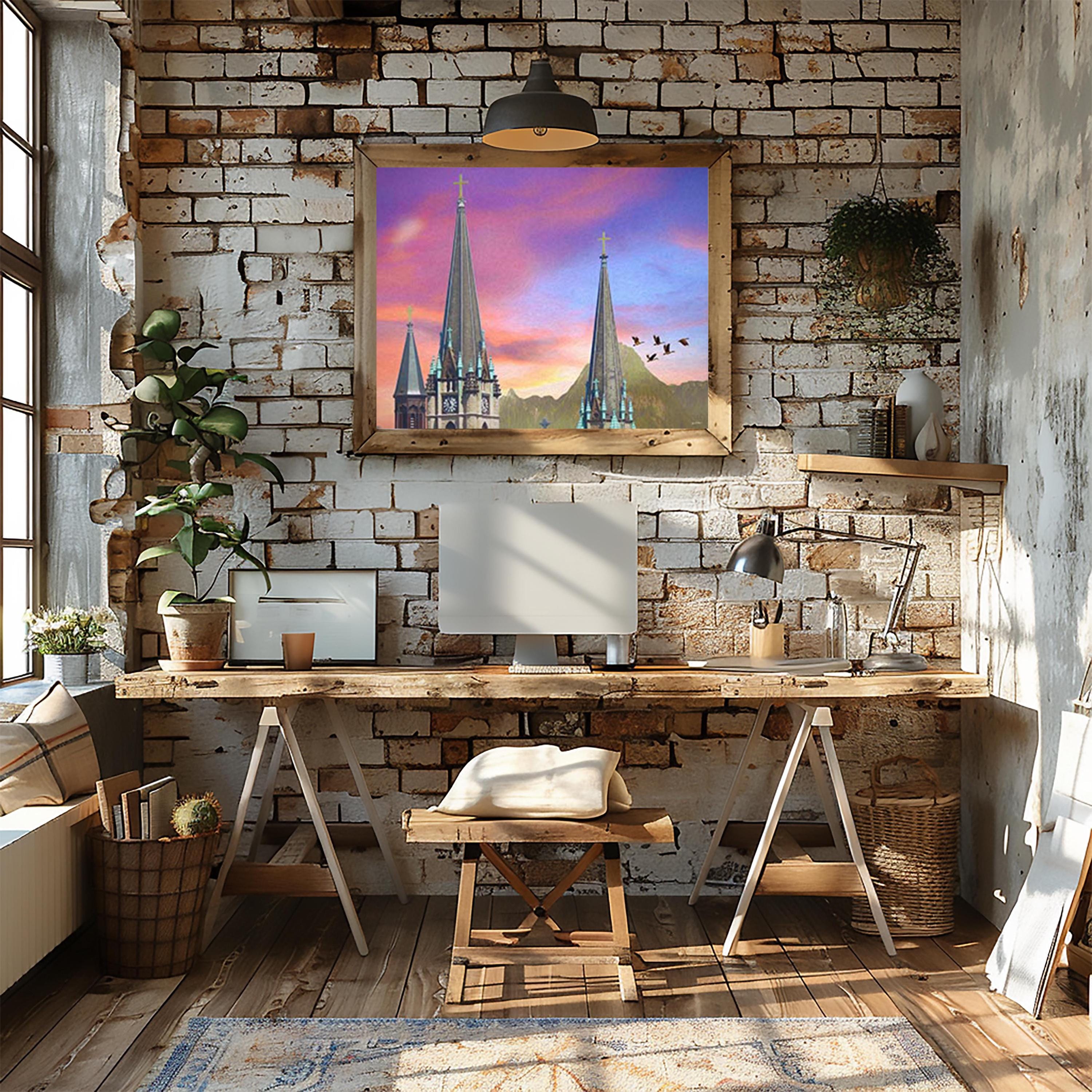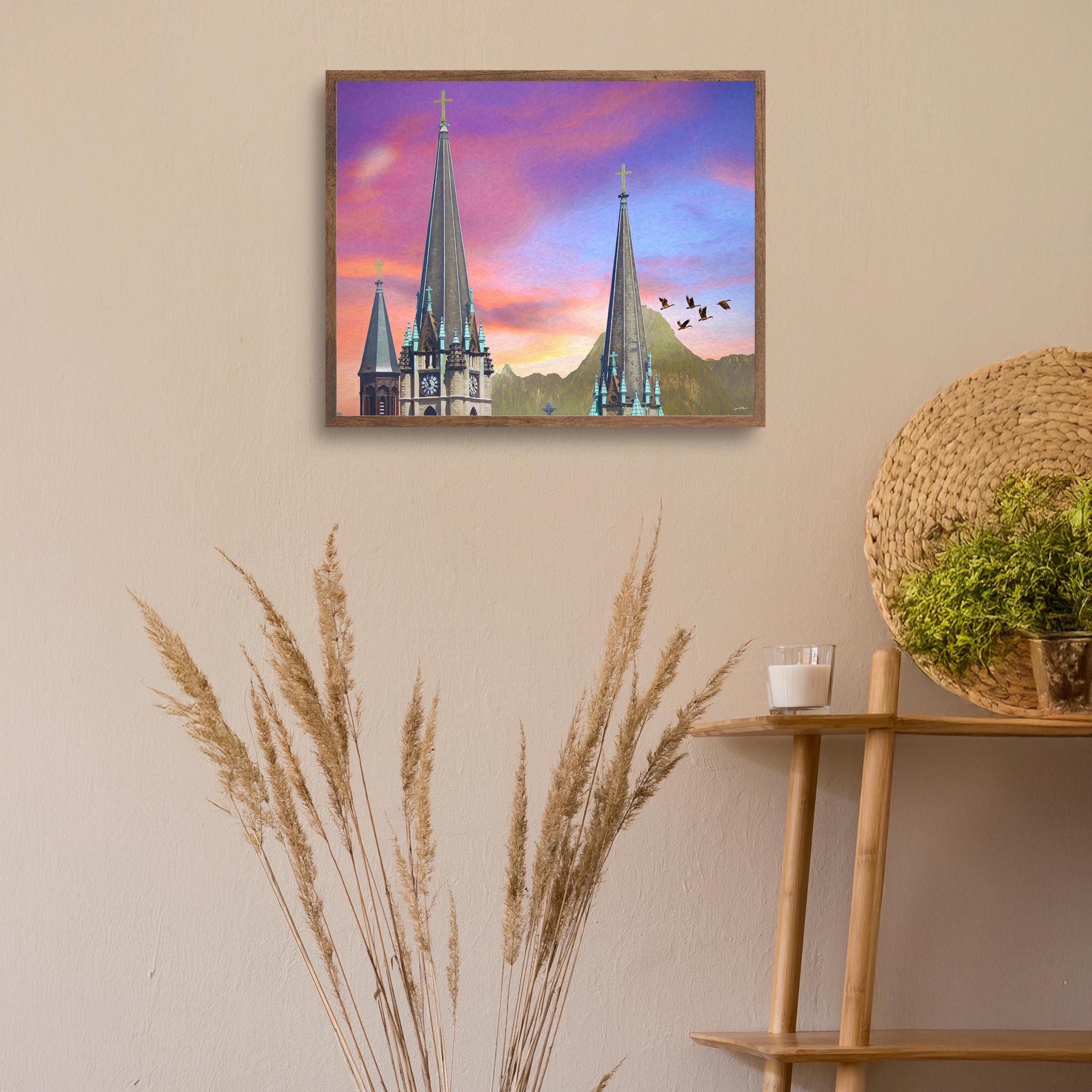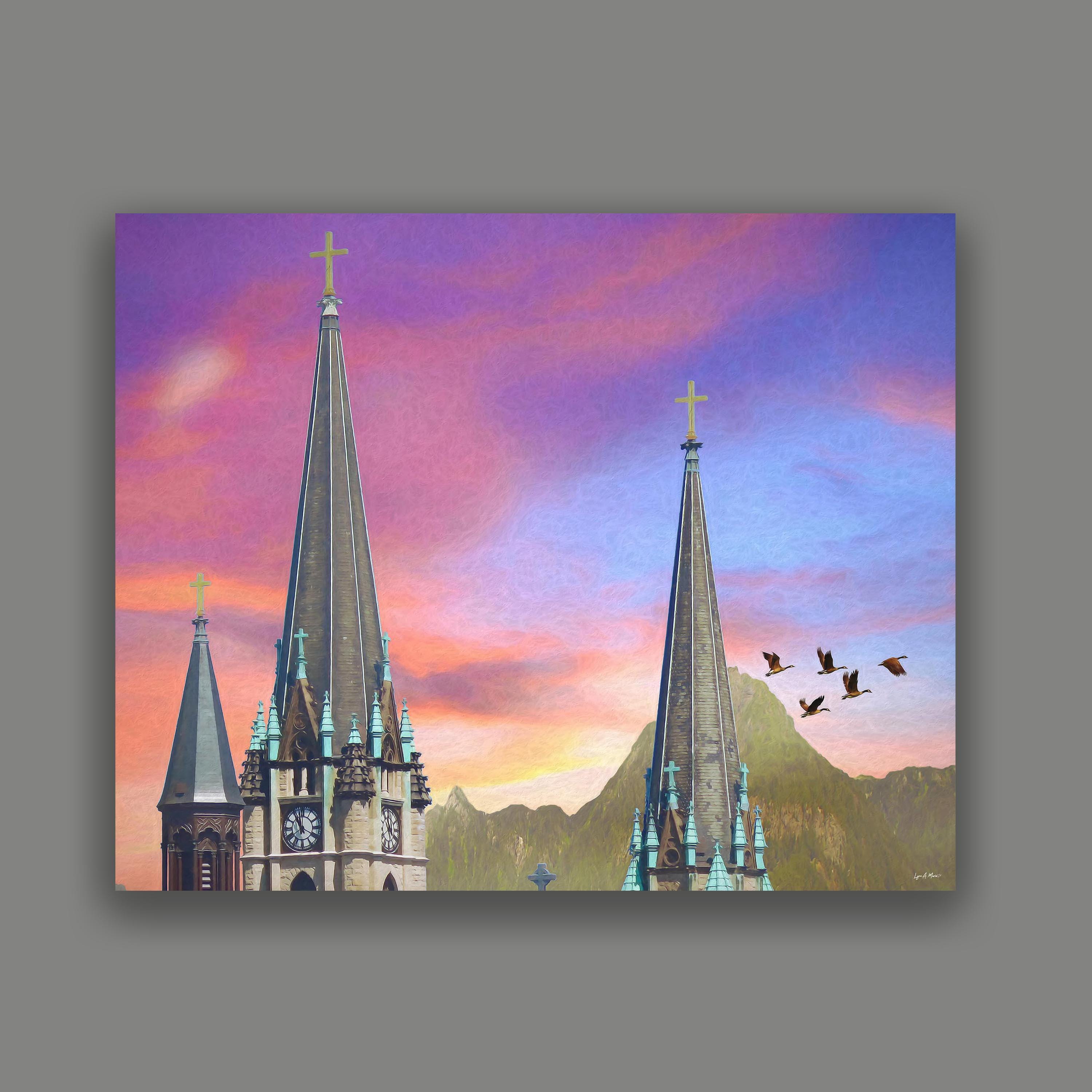 I created this to capture a quiet meeting of faith and nature, steeples reaching up, mountains standing steady, and evening sky guiding a small flock home. It’s about hope, place, and the calm that settles at sunset.